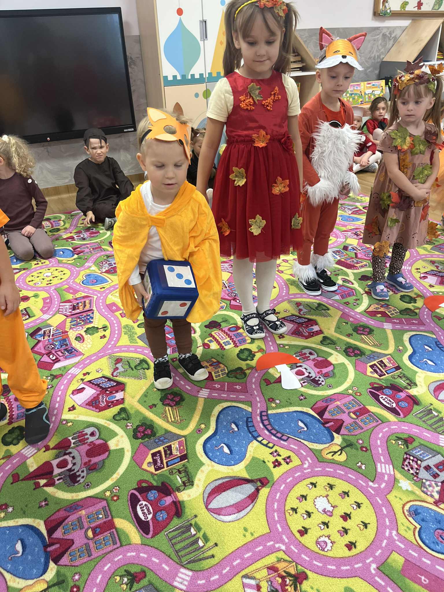 7 października w naszym przedszkolu odbył się wyjątkowy Bal Jesieni – pełen kolorów, radości i twórczej zabawy! Tego dnia każde dziecko przyszło przebrane w piękny, jesienny strój. Na sali pojawiły się urocze liski, jeżyki, wiewiórki, muchomorki, a także dostojne Panie Jesienie i wiele innych postaci inspirowanych tą piękną porą roku. Podczas balu nie zabrakło tańców przy muzyce, kreatywnych zadań do wykonania oraz zabaw integracyjnych, które wywołały wiele uśmiechów. Przedszkolaki z dumą prezentowały swoje stroje, rozwijając przy tym wyobraźnię i poczucie estetyki.