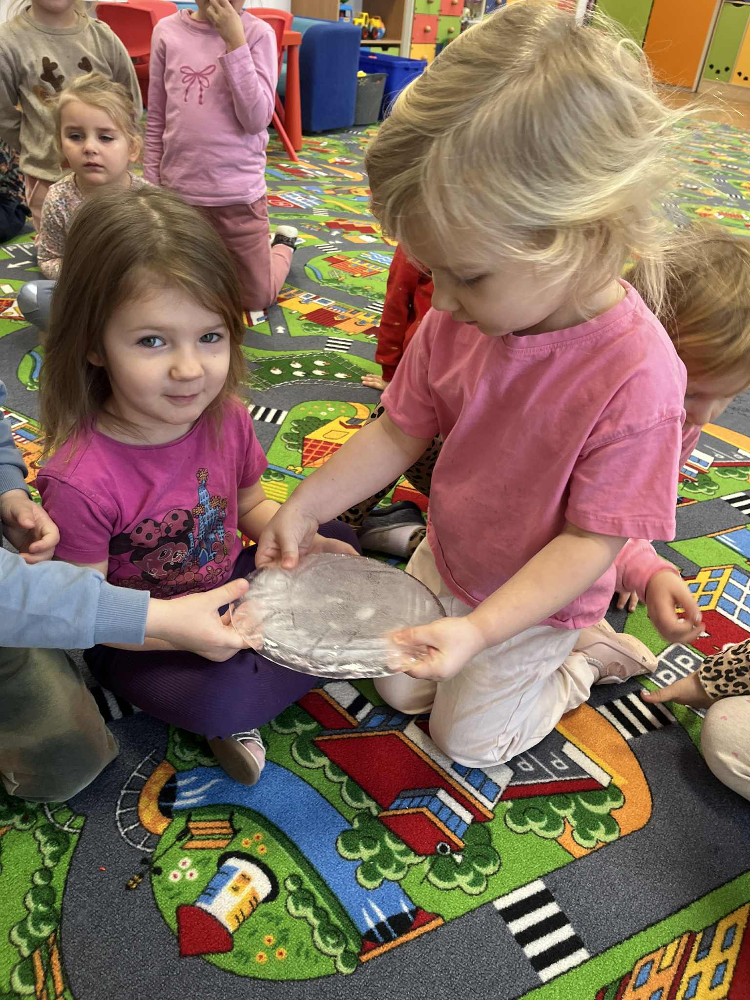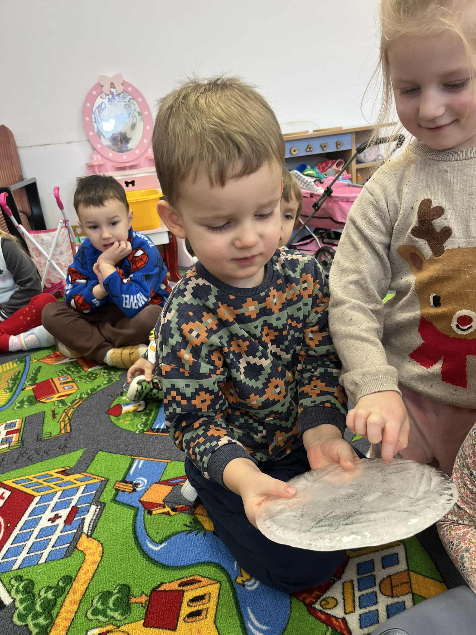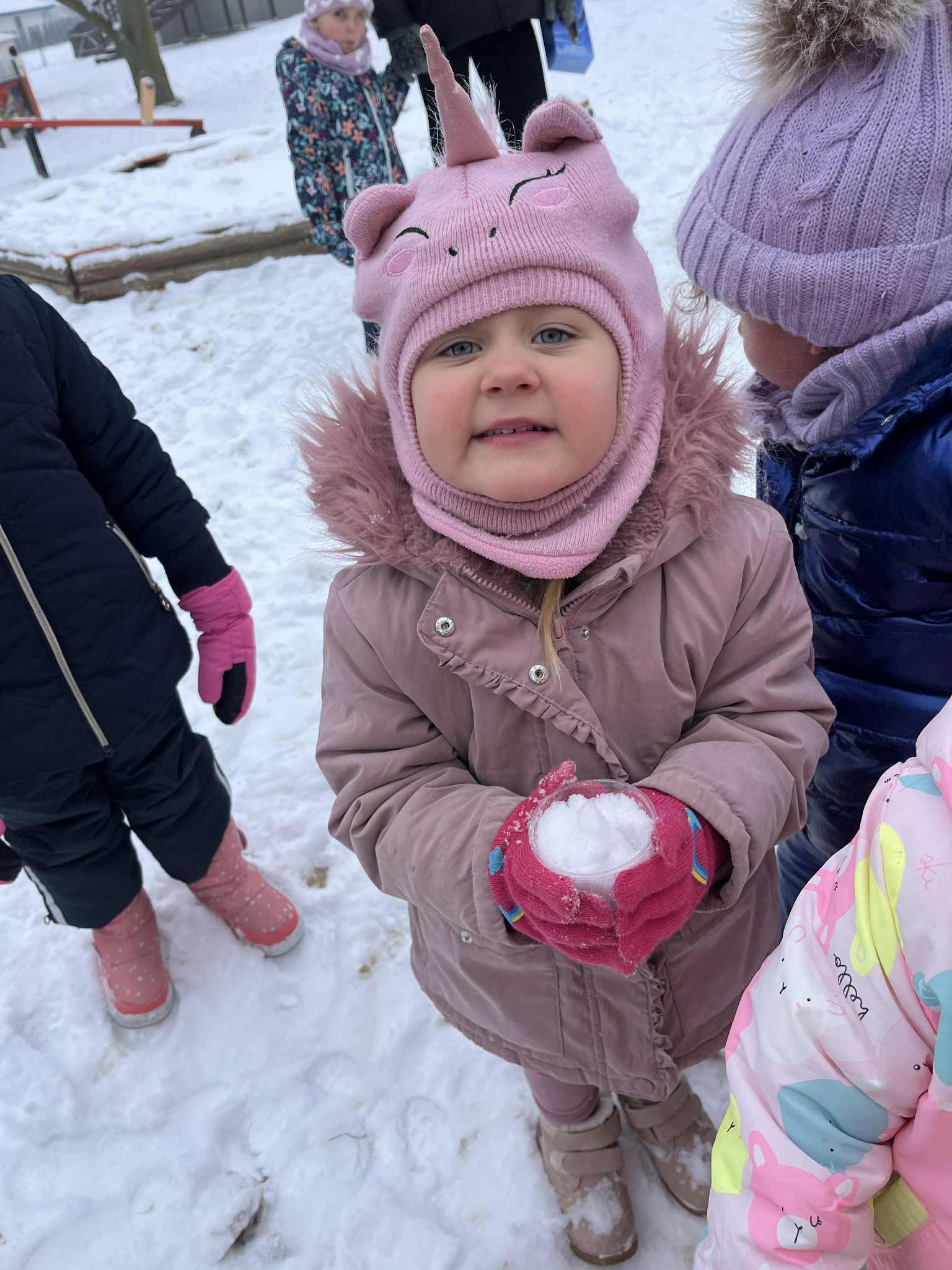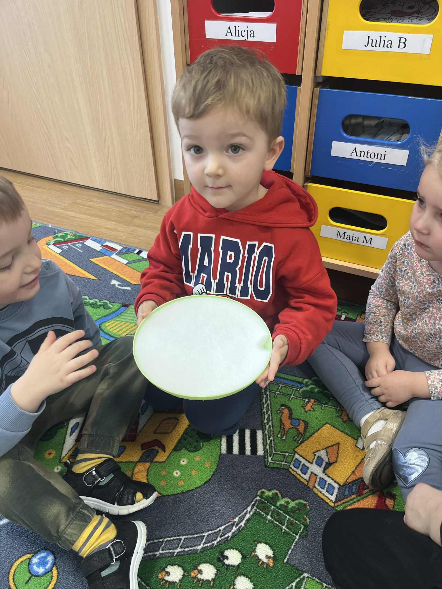 W tym tygodniu poświęciliśmy czas na małe eksperymenty. Pogoda za oknem pozwoliła nam sprawdzić, czy śnieg faktycznie jest czysty. Wyszliśmy na zewnątrz, aby przyjrzeć się śniegowi, a następnie zabraliśmy jego niewielką ilość do przedszkola. Czekaliśmy, aż śnieg zamieni się w wodę. To, co zobaczyliśmy, pozwoliło nam stwierdzić, że śnieg jednak nie jest tak czysty, jak mogłoby się wydawać. Następnie zastanawialiśmy się, jak powstaje lód. Postanowiliśmy wlać wodę do naczynia i zostawić je na całą noc na zewnątrz. Następnego dnia, gdy przyszliśmy do przedszkola, zauważyliśmy, że do naczynia napadało trochę śniegu, a pod nim woda zamieniła się w lód. Sprawdzaliśmy, czy lód jest ciepły czy zimny i dowiedzieliśmy się, że woda pozostawiona na zewnątrz w zimnych warunkach zamarza i zmienia się w lód. Z kolei lód przeniesiony do ciepłego pomieszczenia i ogrzewany w naszych rączkach topnieje i ponownie zamienia się w wodę.