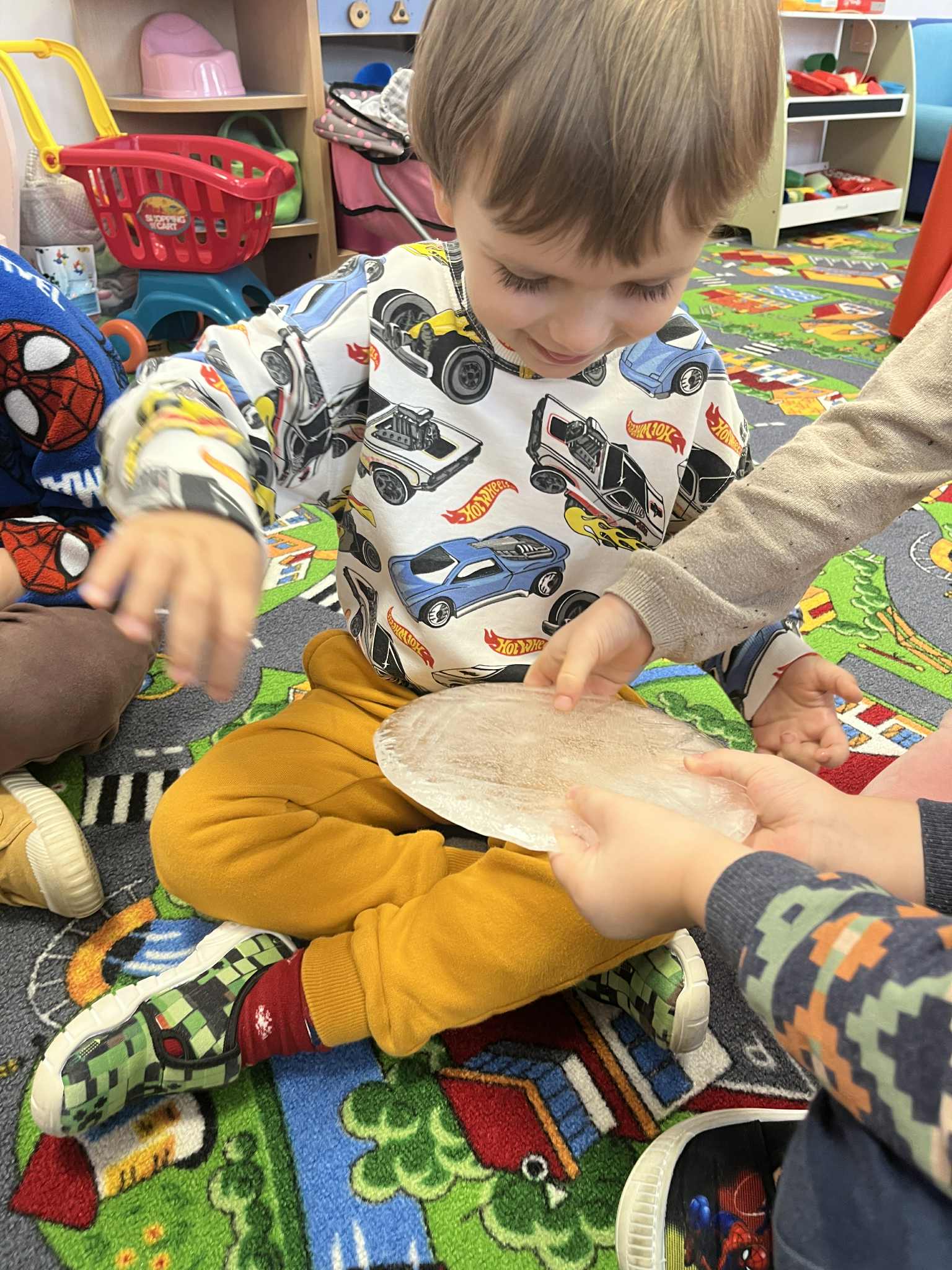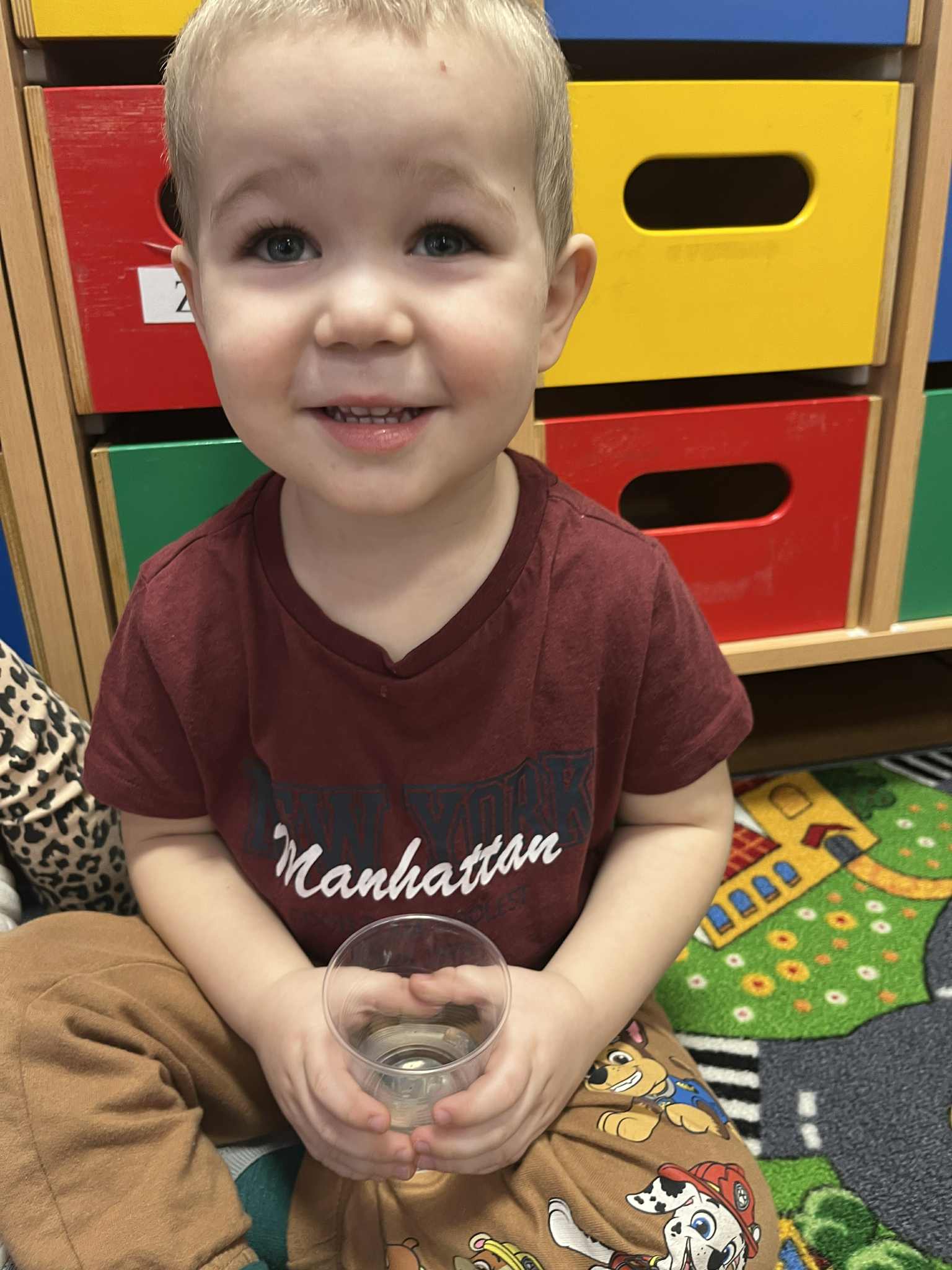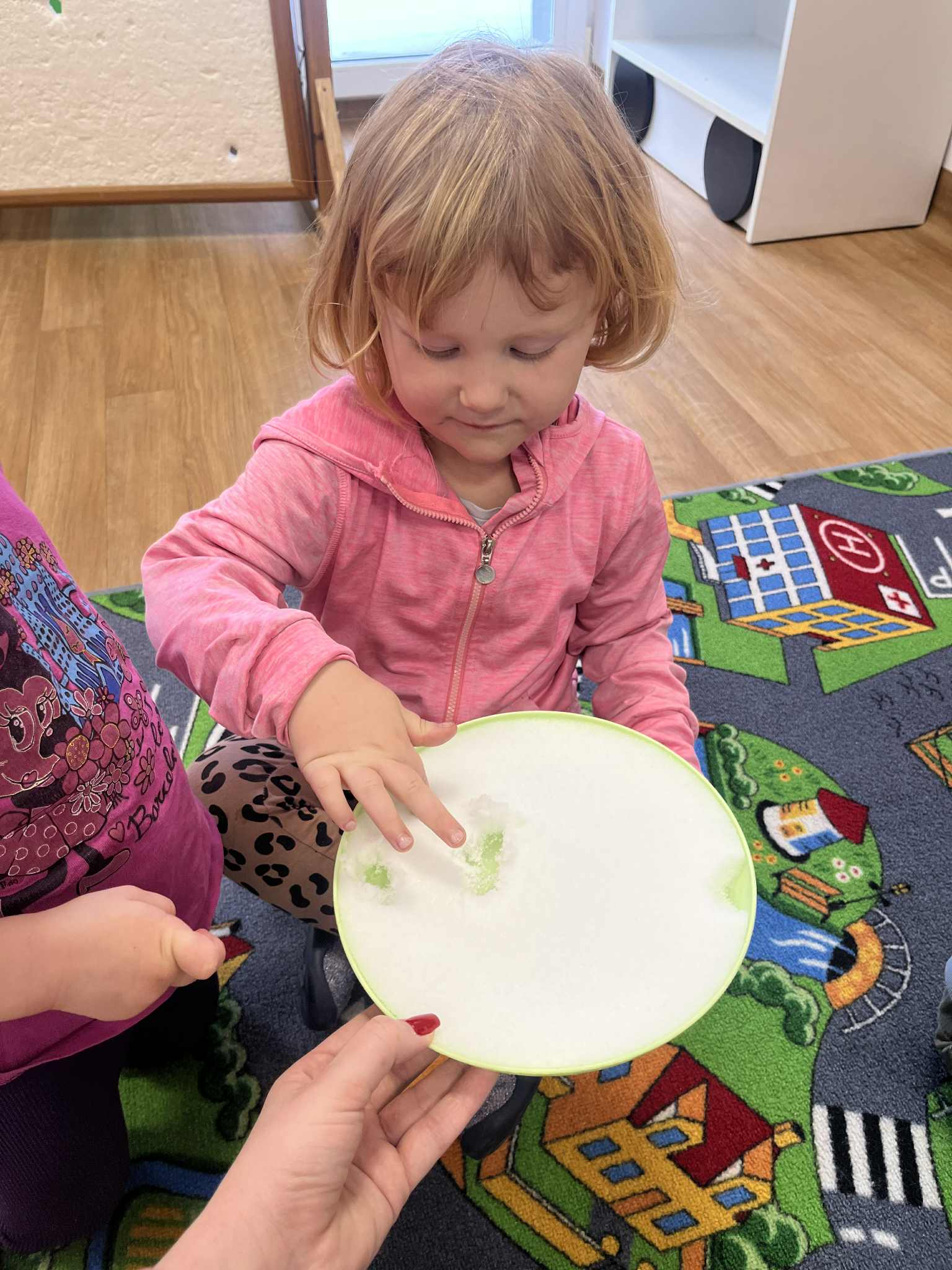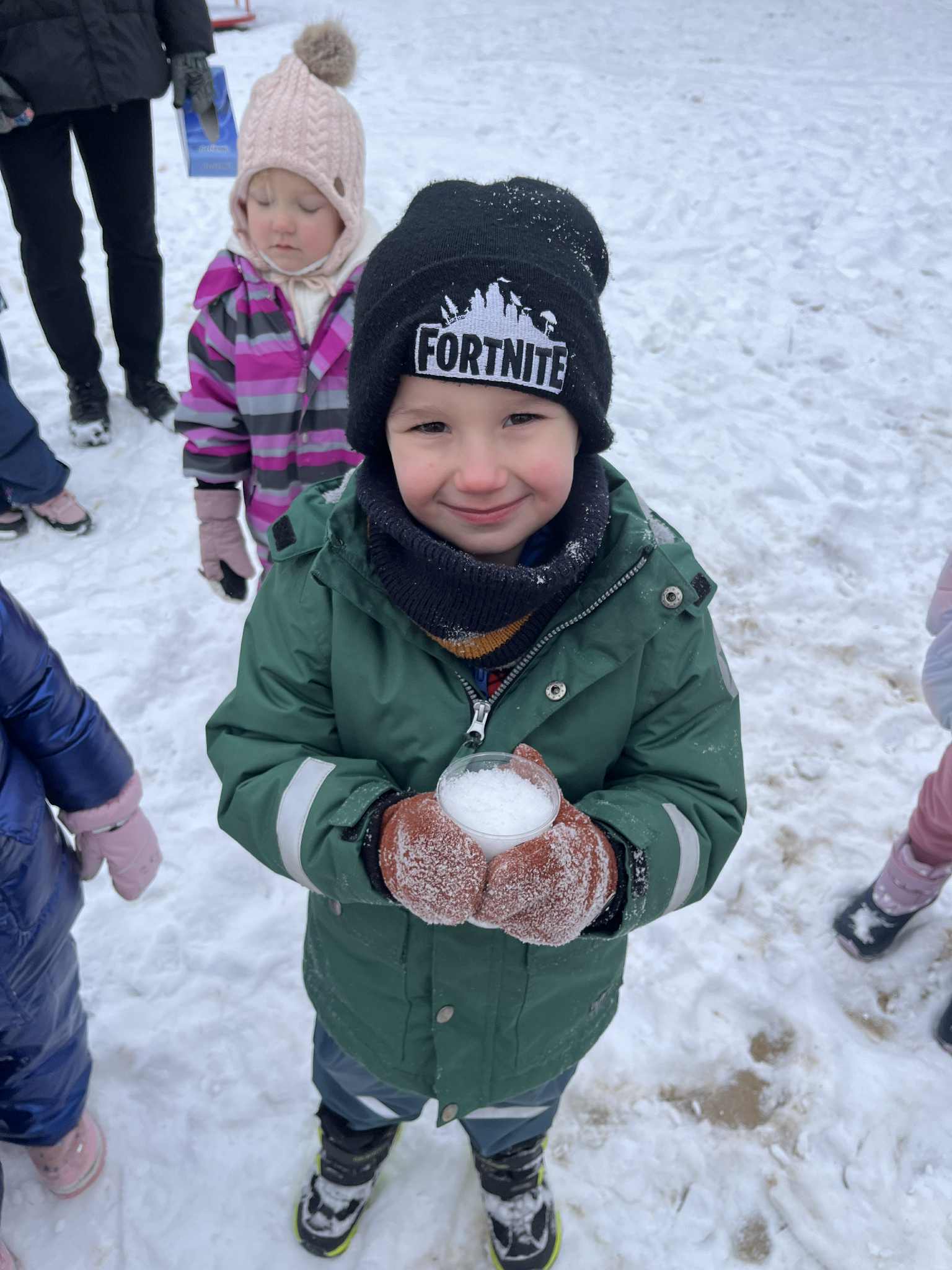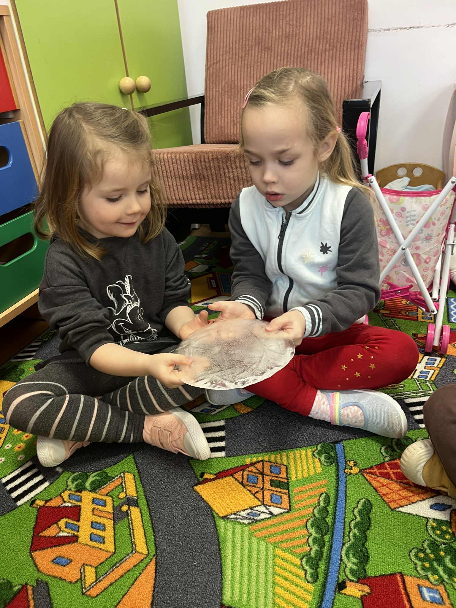 W tym tygodniu poświęciliśmy czas na małe eksperymenty. Pogoda za oknem pozwoliła nam sprawdzić, czy śnieg faktycznie jest czysty. Wyszliśmy na zewnątrz, aby przyjrzeć się śniegowi, a następnie zabraliśmy jego niewielką ilość do przedszkola. Czekaliśmy, aż śnieg zamieni się w wodę. To, co zobaczyliśmy, pozwoliło nam stwierdzić, że śnieg jednak nie jest tak czysty, jak mogłoby się wydawać. Następnie zastanawialiśmy się, jak powstaje lód. Postanowiliśmy wlać wodę do naczynia i zostawić je na całą noc na zewnątrz. Następnego dnia, gdy przyszliśmy do przedszkola, zauważyliśmy, że do naczynia napadało trochę śniegu, a pod nim woda zamieniła się w lód. Sprawdzaliśmy, czy lód jest ciepły czy zimny i dowiedzieliśmy się, że woda pozostawiona na zewnątrz w zimnych warunkach zamarza i zmienia się w lód. Z kolei lód przeniesiony do ciepłego pomieszczenia i ogrzewany w naszych rączkach topnieje i ponownie zamienia się w wodę.