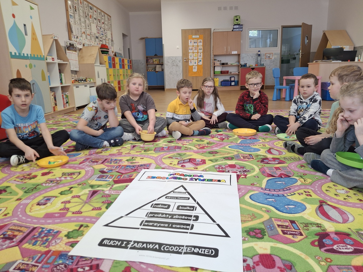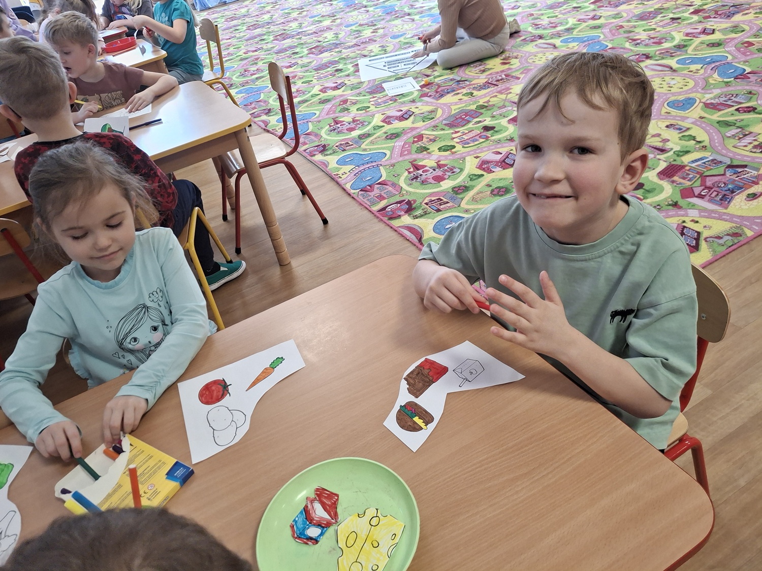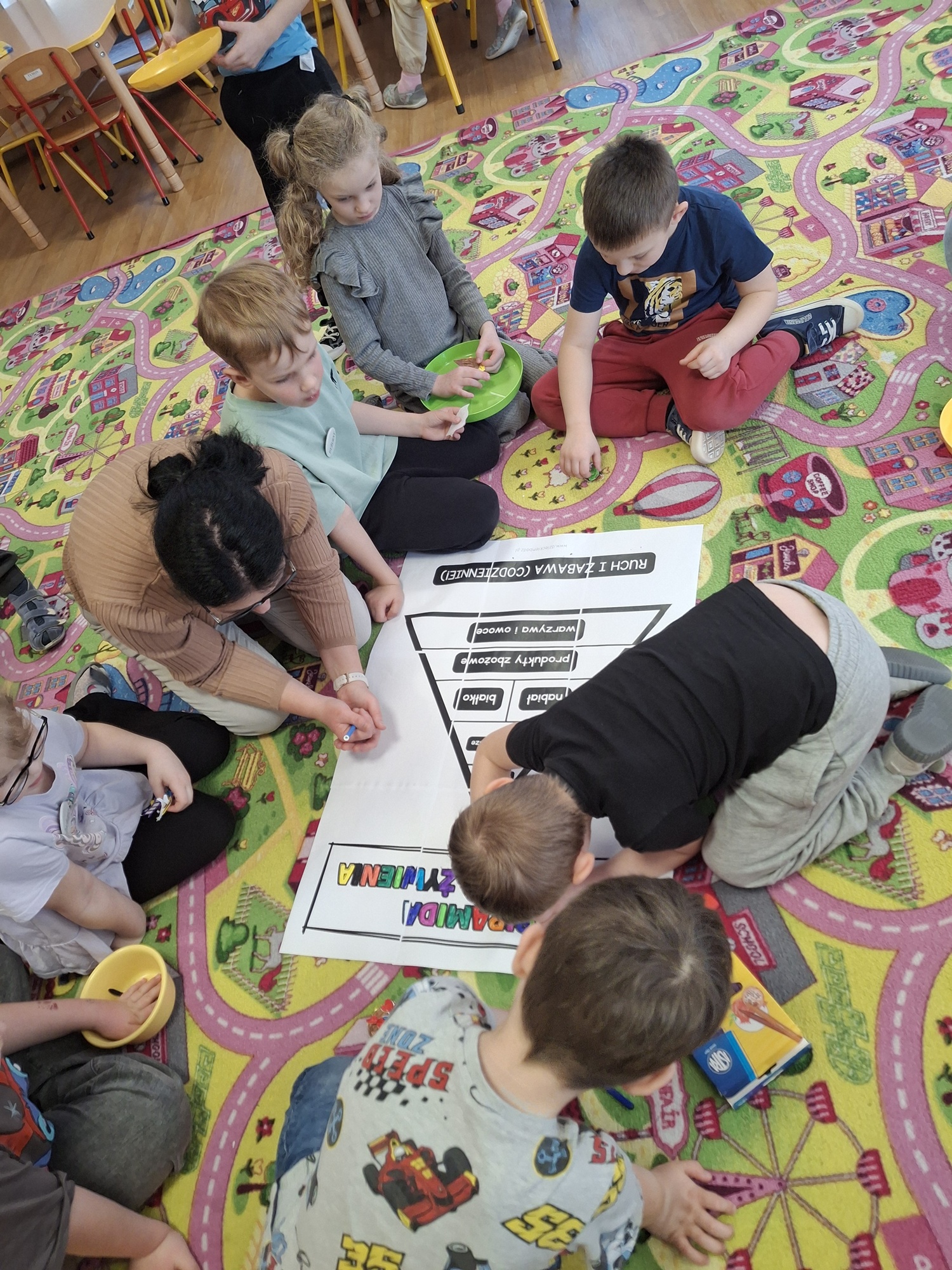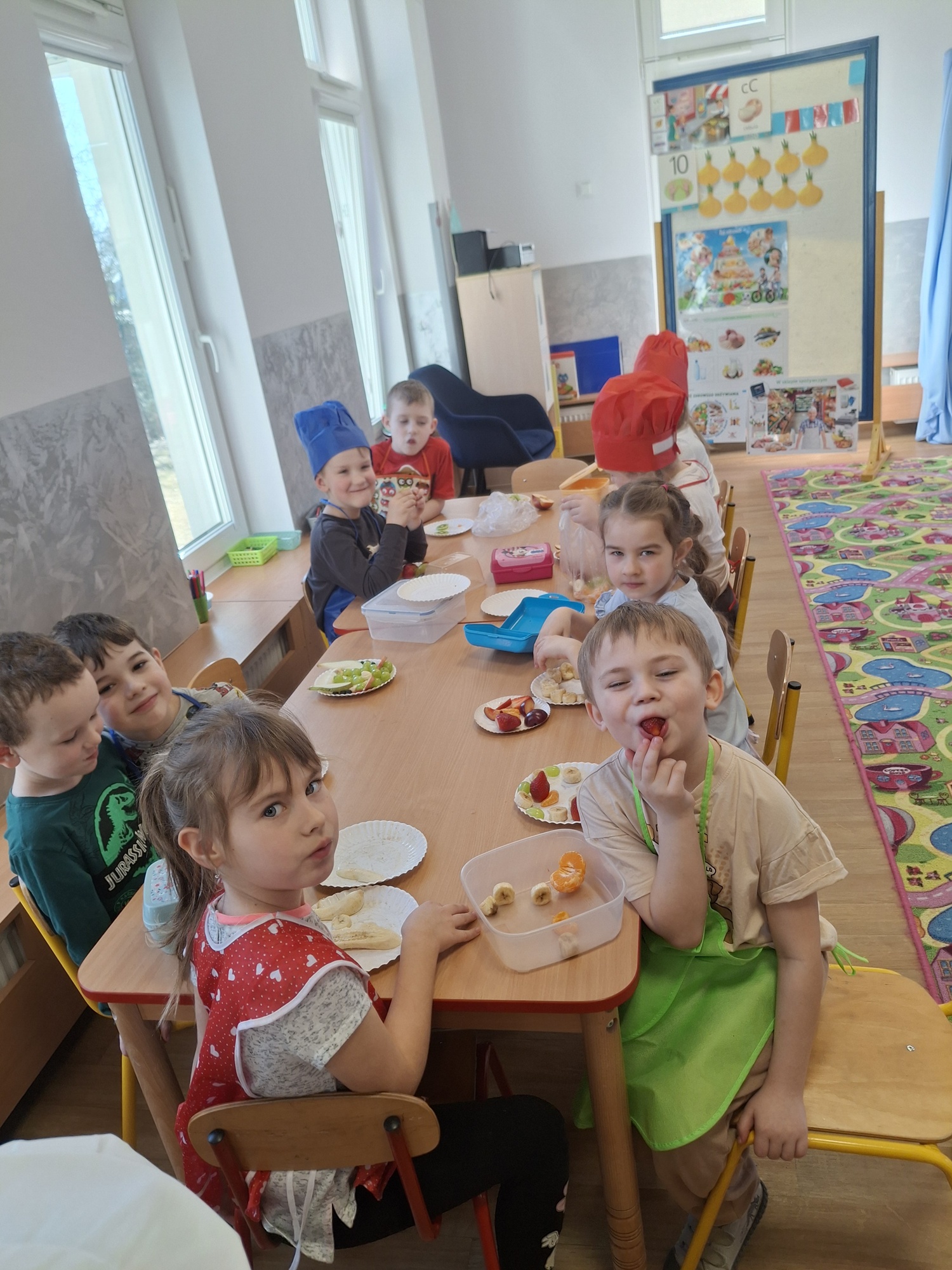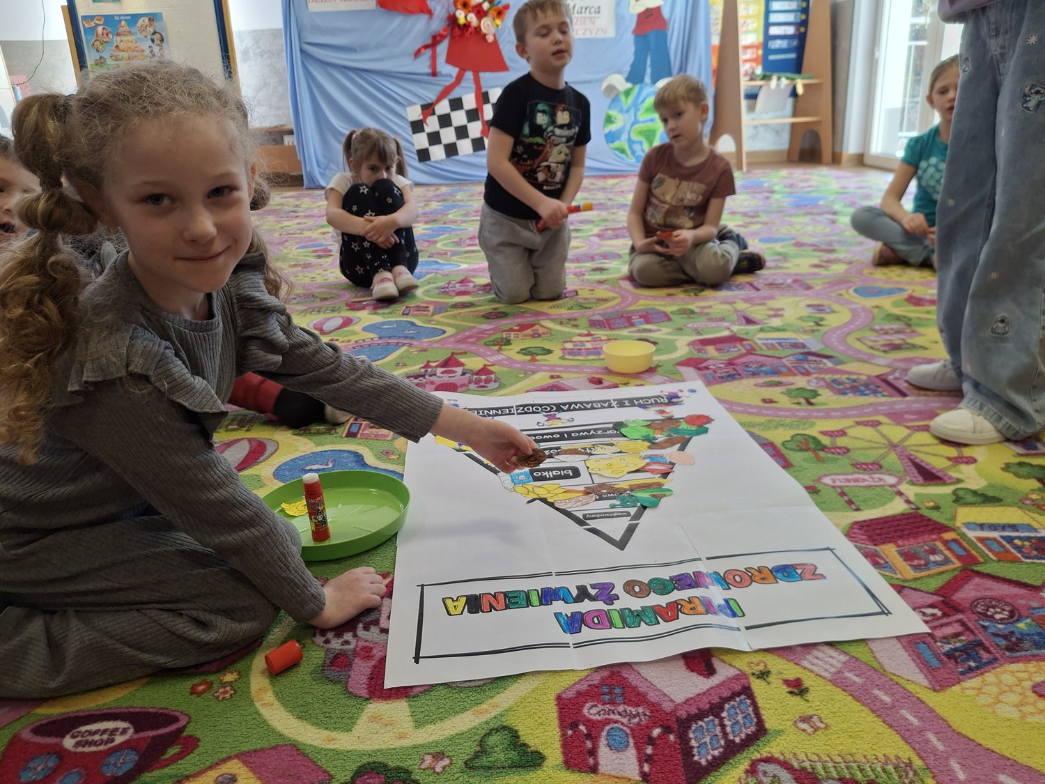 "Dbamy o zdrowie" to temat, który towarzyszył nam w tym tygodniu. Podczas zajęć rozmawialiśmy o tym, jak ważne dla naszego organizmu są codzienny ruch, zdrowe odżywianie, picie wody, odpowiednia ilość snu, a także higiena osobista. Dzieci wykonały piramidę zdrowego żywienia oraz książeczkę o warzywach. Dużo radości sprawiły dzieciom zajęcia kulinarne podczas których, układały obrazki z ulubionych owoców i warzyw. Sówki dbały o sprawność fizyczną podczas ćwiczeń gimnastycznych i zabaw ruchowych na świeżym powietrzu. Podsumowaniem zajęć było obejrzenie filmu edukacyjnego i utrwalenie wiedzy na temat zdrowego stylu życia.