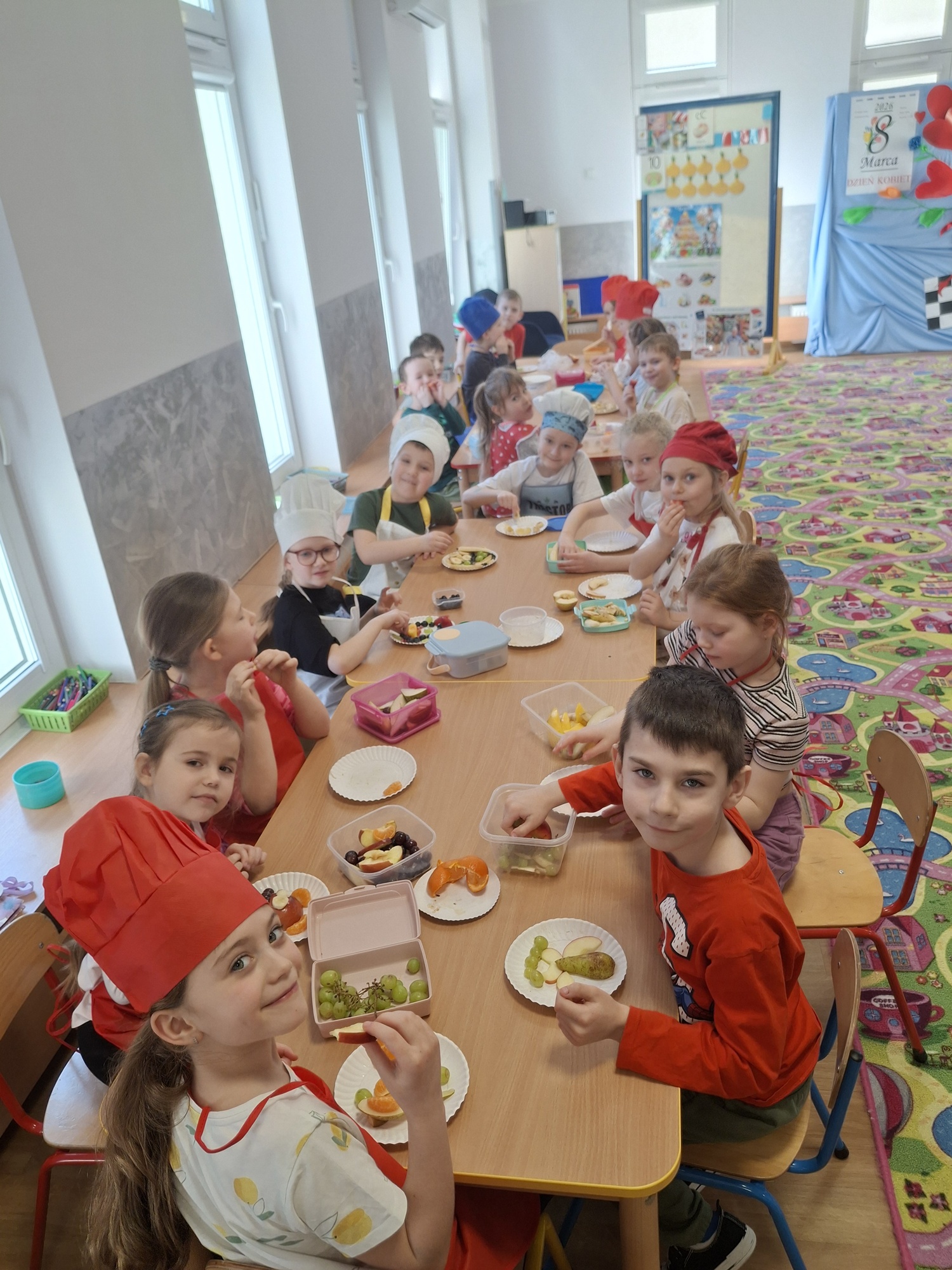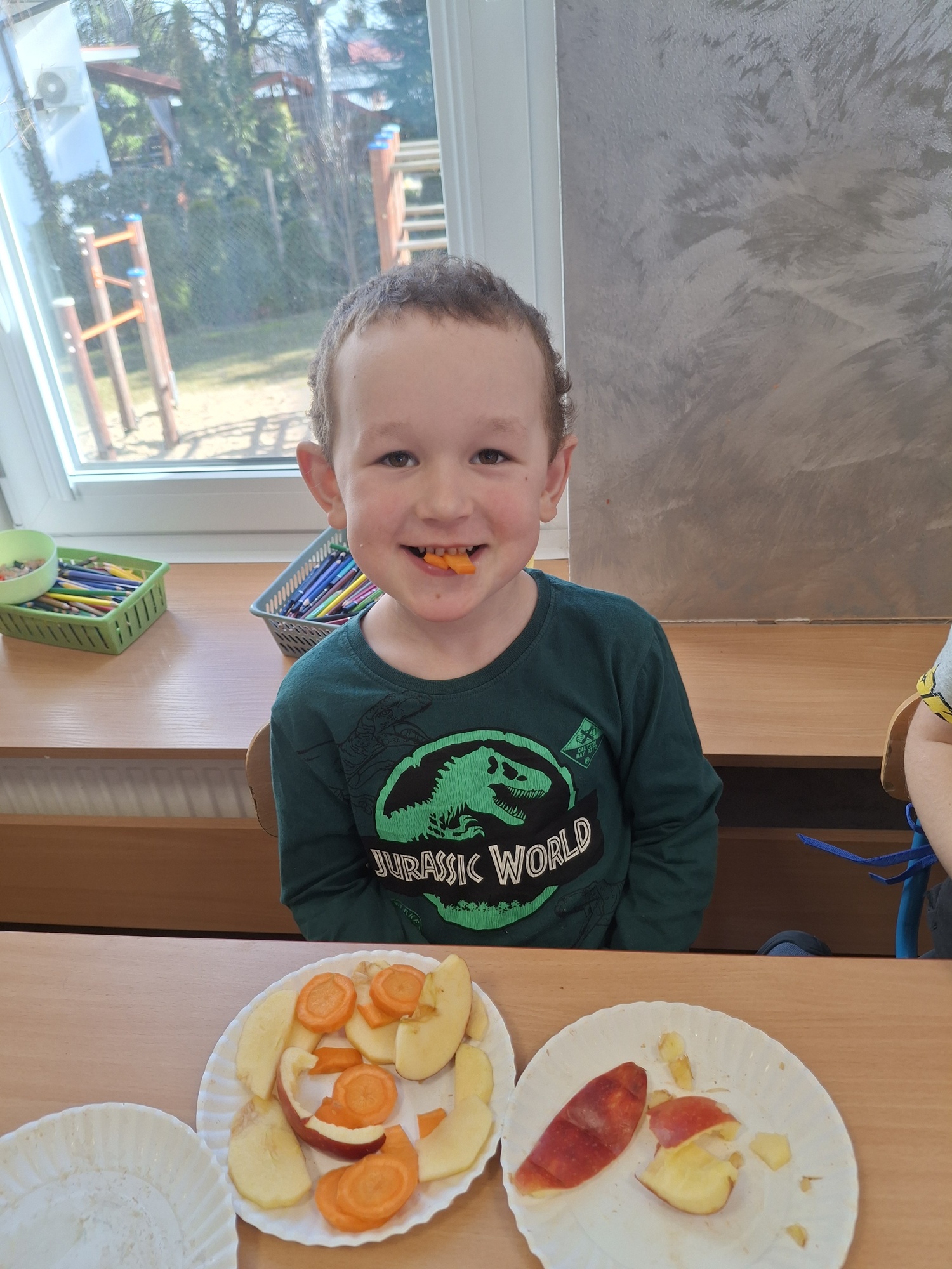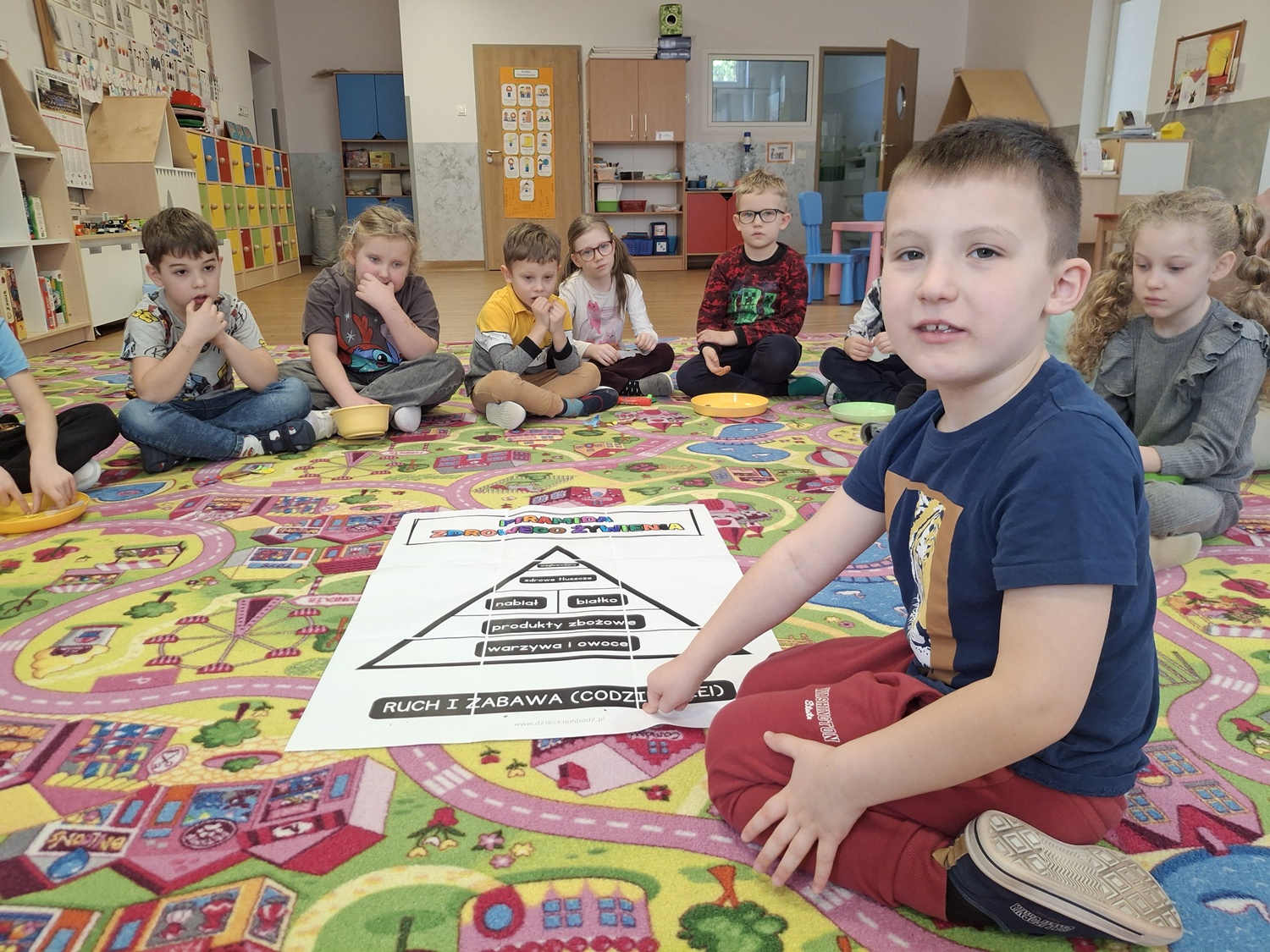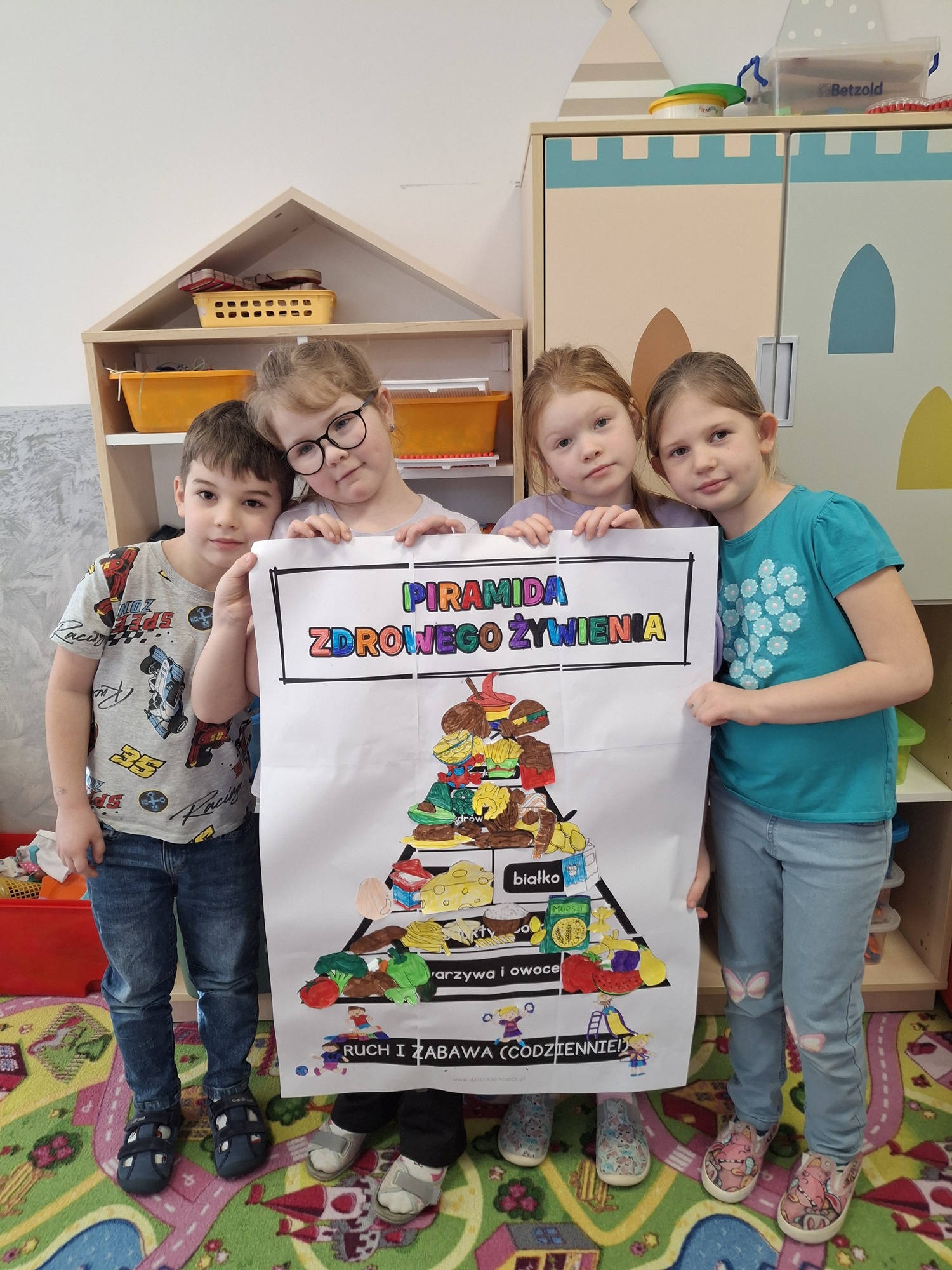 "Dbamy o zdrowie" to temat, który towarzyszył nam w tym tygodniu. Podczas zajęć rozmawialiśmy o tym, jak ważne dla naszego organizmu są codzienny ruch, zdrowe odżywianie, picie wody, odpowiednia ilość snu, a także higiena osobista. Dzieci wykonały piramidę zdrowego żywienia oraz książeczkę o warzywach. Dużo radości sprawiły dzieciom zajęcia kulinarne podczas których, układały obrazki z ulubionych owoców i warzyw. Sówki dbały o sprawność fizyczną podczas ćwiczeń gimnastycznych i zabaw ruchowych na świeżym powietrzu. Podsumowaniem zajęć było obejrzenie filmu edukacyjnego i utrwalenie wiedzy na temat zdrowego stylu życia.