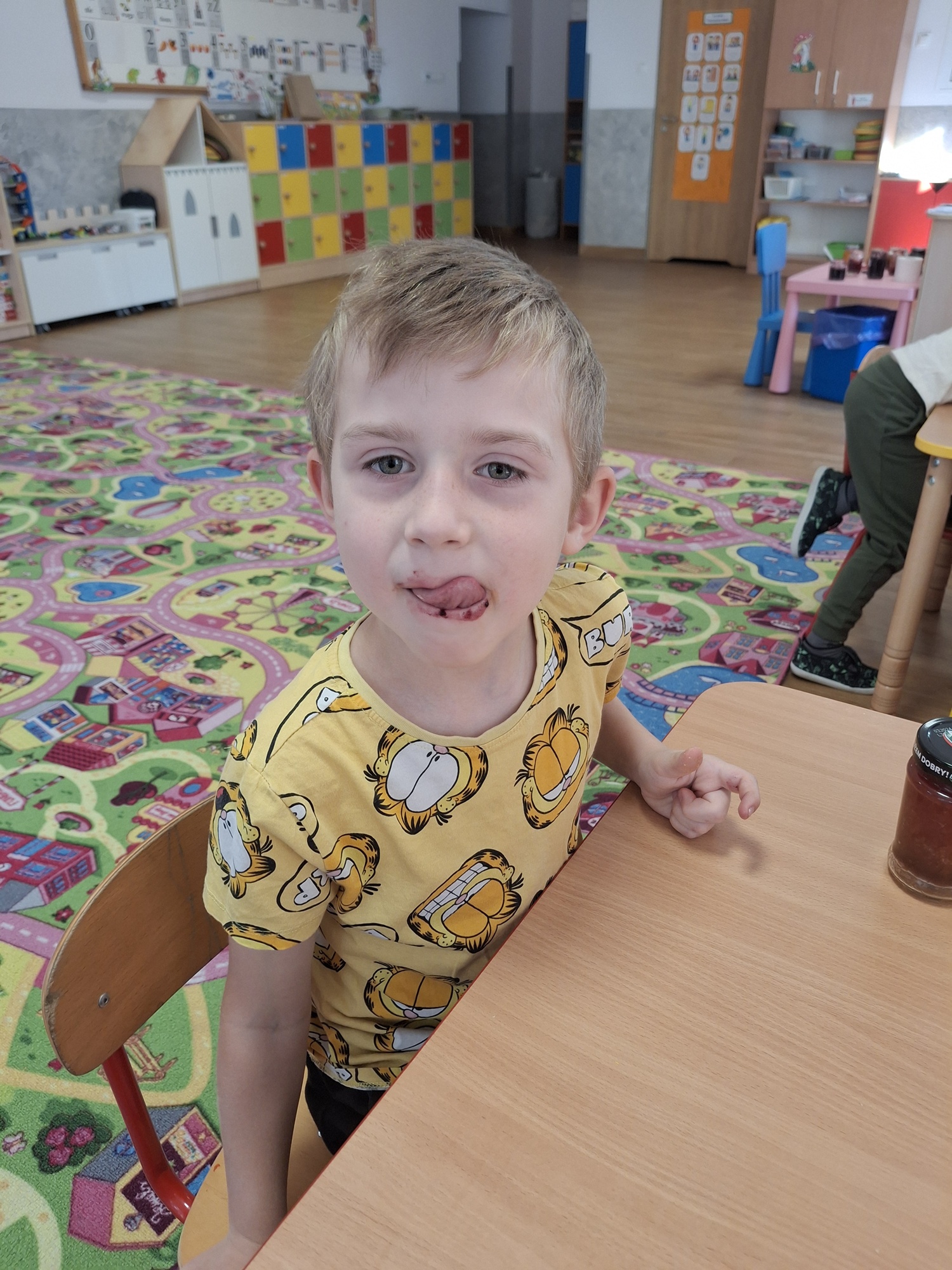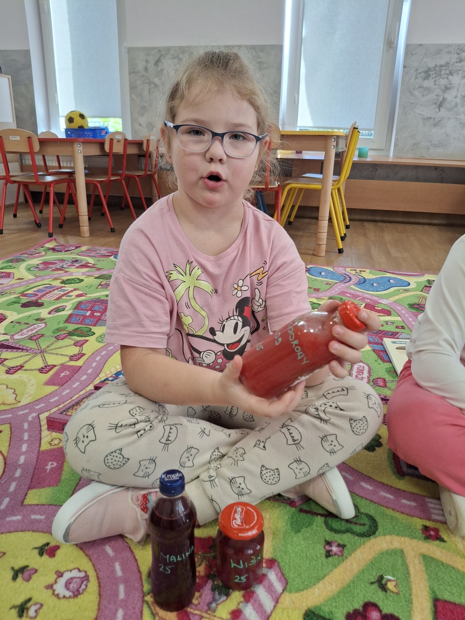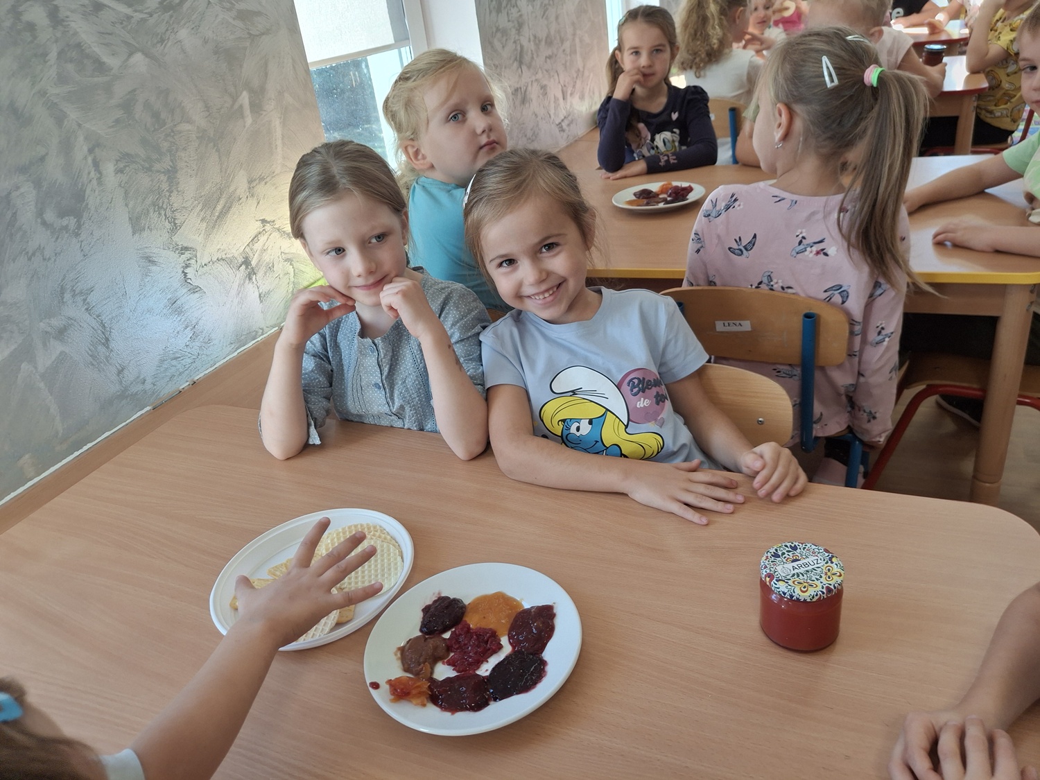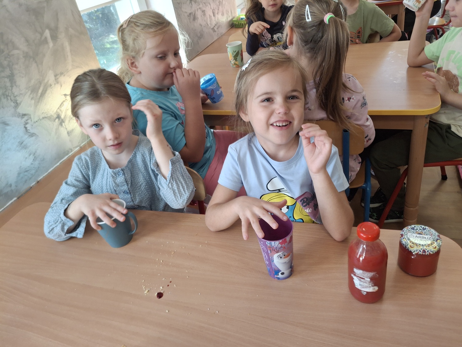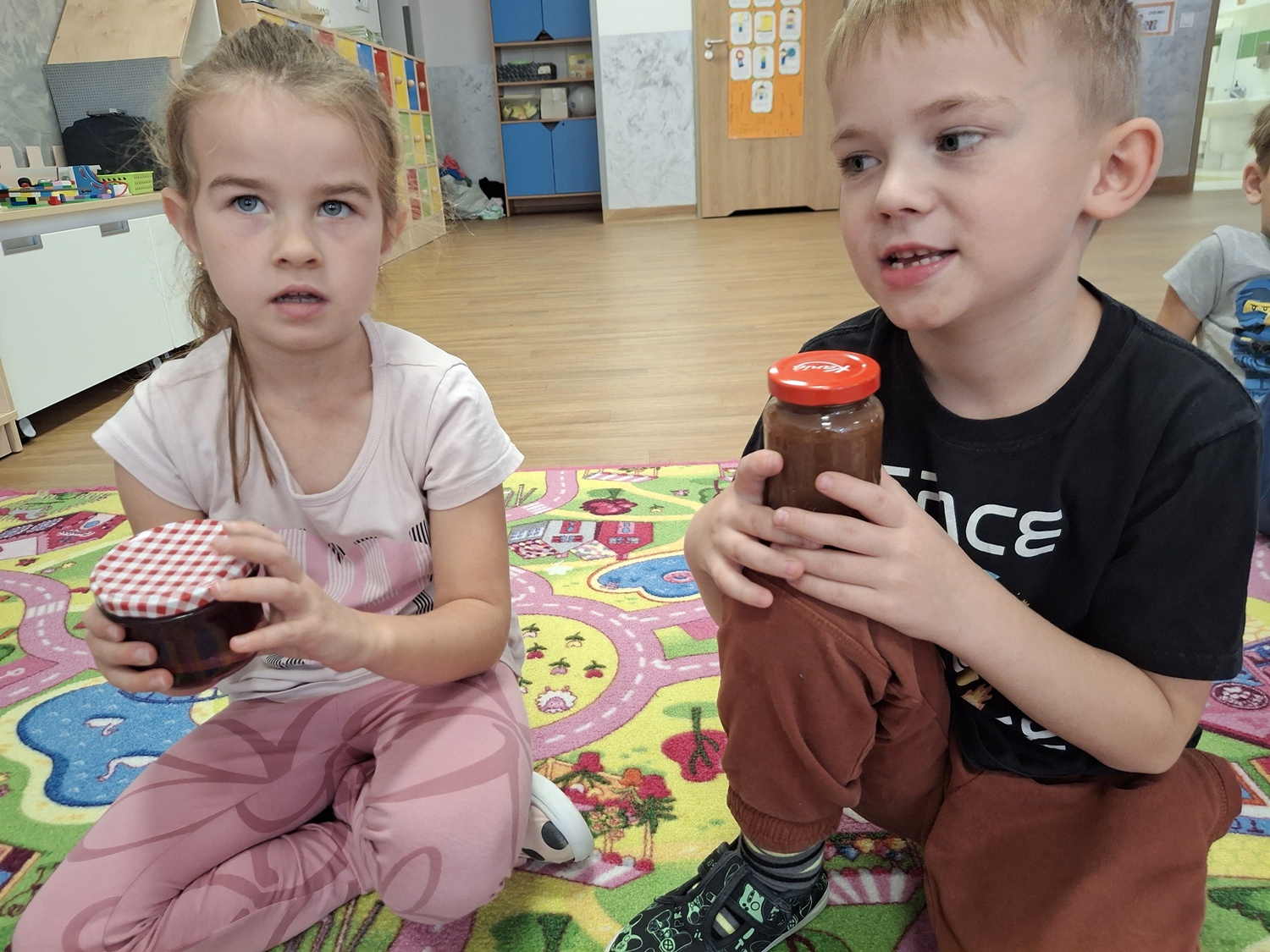 W jaki sposób zatrzymać lato w słoikach? - rozprawiały Sówki podczas zajęć. Rozmawialiśmy, o tym jak to nasze babcie i mamy robią kompoty, dżemy, soki i rożne inne przetwory, które chowamy do naszych domowych spiżarni. Wspólnie wpadliśmy na pomysł o przyniesieniu swojego ulubionego przetworu. I tak dzięki pomocy rodziców udało się zorganizować prawdziwą przedszkolną spiżarnię i przygotować prawdziwą ucztę smaków. Próbowaliśmy między innymi soków owocowych dżemów ze śliwek, truskawek, brzoskwiń, borówek itp. Zrobiliśmy sok malinowy, który smakował nam wyśmienicie. Była to prawdziwa uczta dla naszych zmysłów (węchu, smaku i wzroku), poczęstowaliśmy też nasze ciocie. Przy okazji przetwory wykorzystaliśmy do słodkich zabaw logopedycznych.