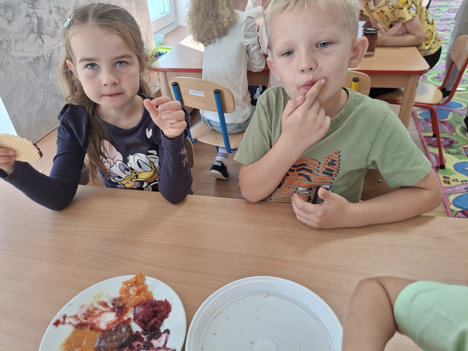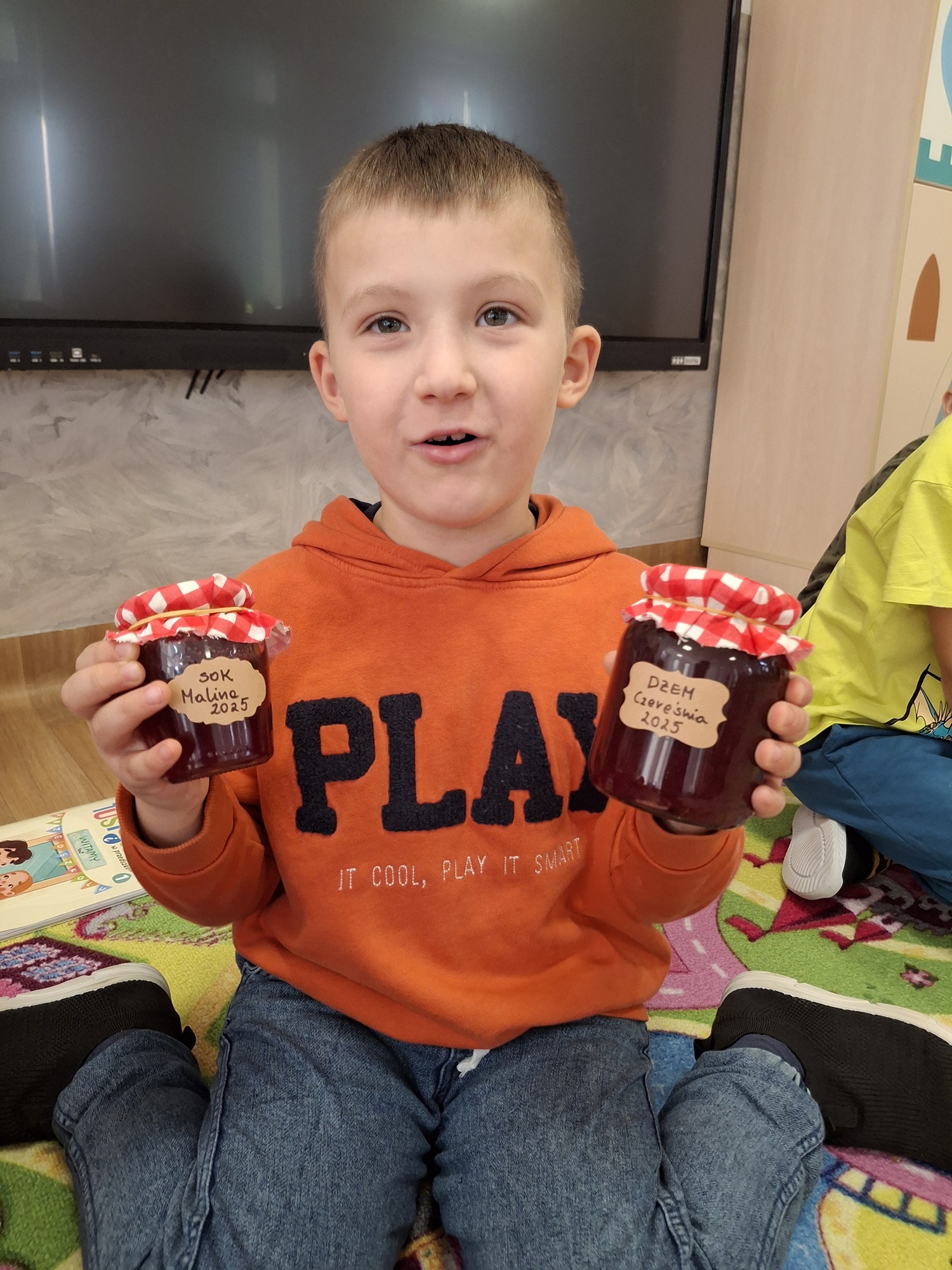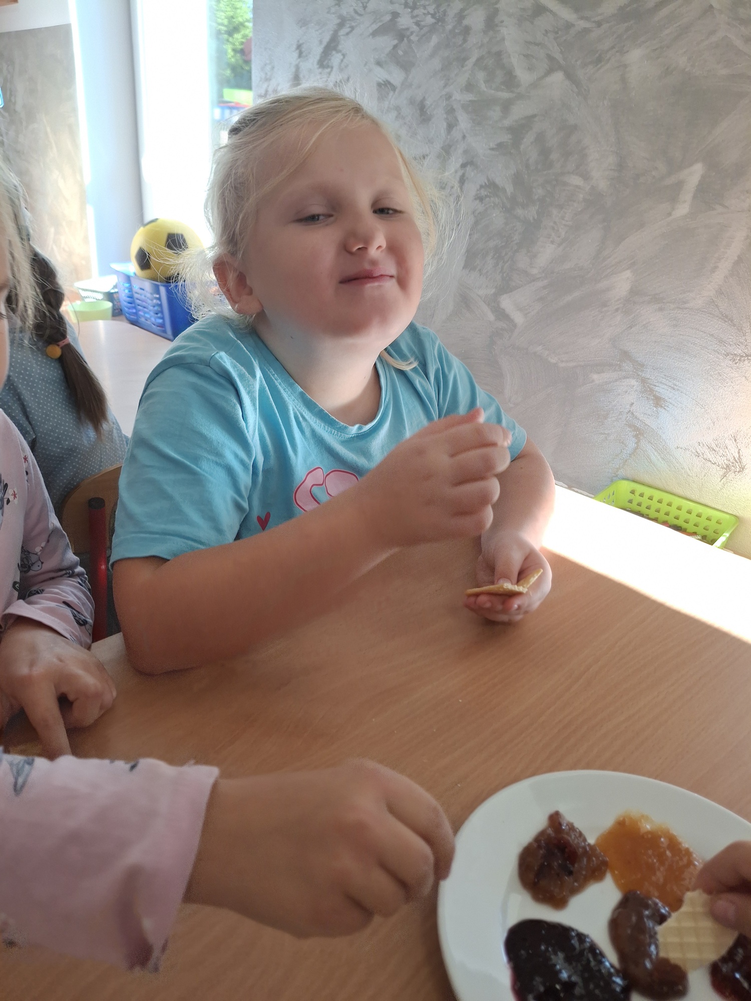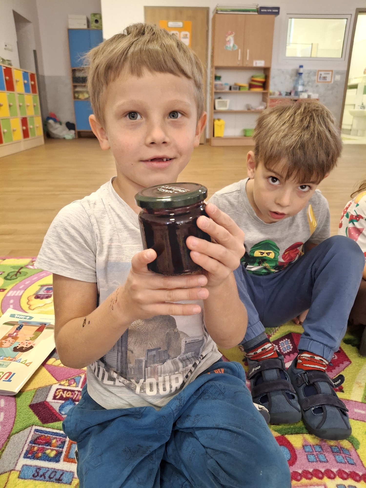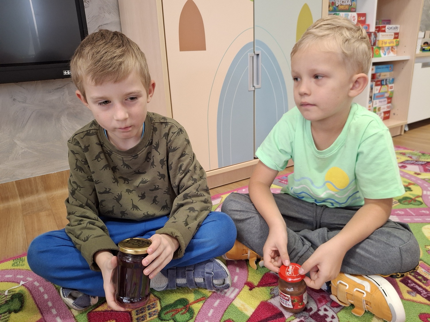 W jaki sposób zatrzymać lato w słoikach? - rozprawiały Sówki podczas zajęć. Rozmawialiśmy, o tym jak to nasze babcie i mamy robią kompoty, dżemy, soki i rożne inne przetwory, które chowamy do naszych domowych spiżarni. Wspólnie wpadliśmy na pomysł o przyniesieniu swojego ulubionego przetworu. I tak dzięki pomocy rodziców udało się zorganizować prawdziwą przedszkolną spiżarnię i przygotować prawdziwą ucztę smaków. Próbowaliśmy między innymi soków owocowych dżemów ze śliwek, truskawek, brzoskwiń, borówek itp. Zrobiliśmy sok malinowy, który smakował nam wyśmienicie. Była to prawdziwa uczta dla naszych zmysłów (węchu, smaku i wzroku), poczęstowaliśmy też nasze ciocie. Przy okazji przetwory wykorzystaliśmy do słodkich zabaw logopedycznych.
