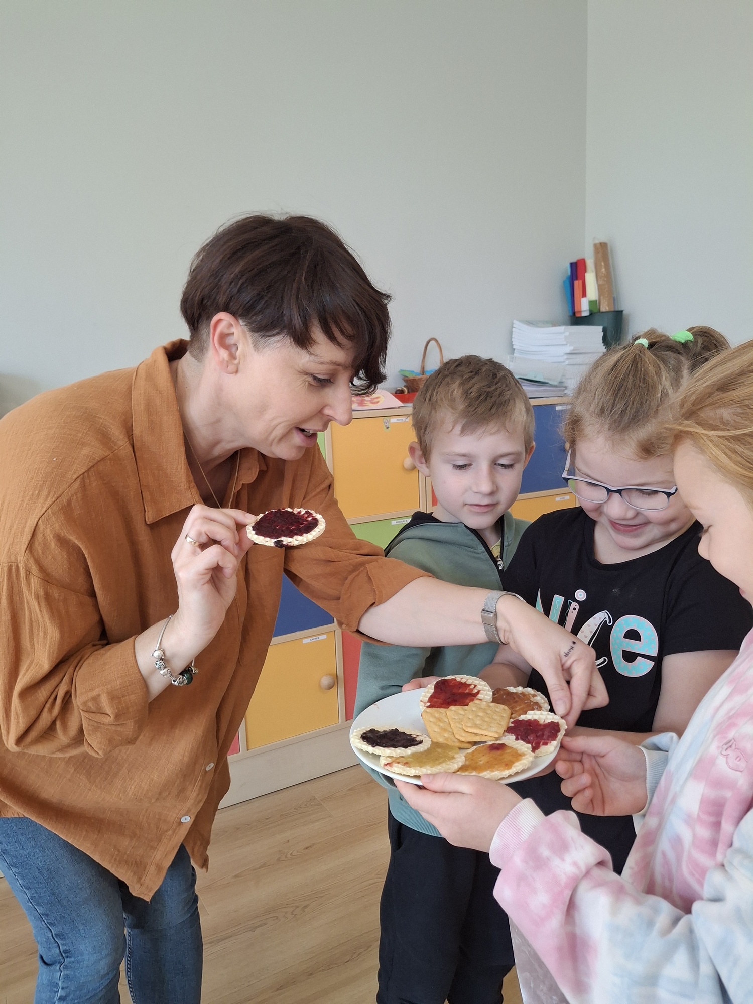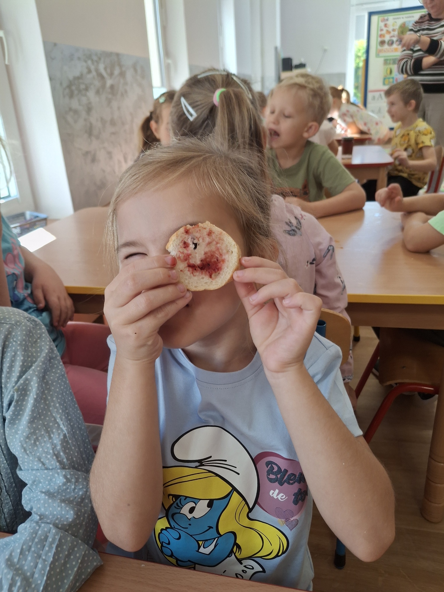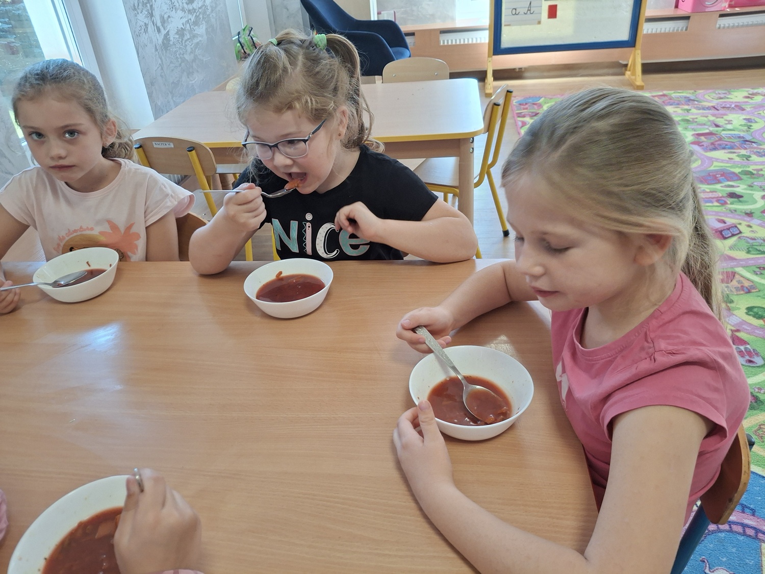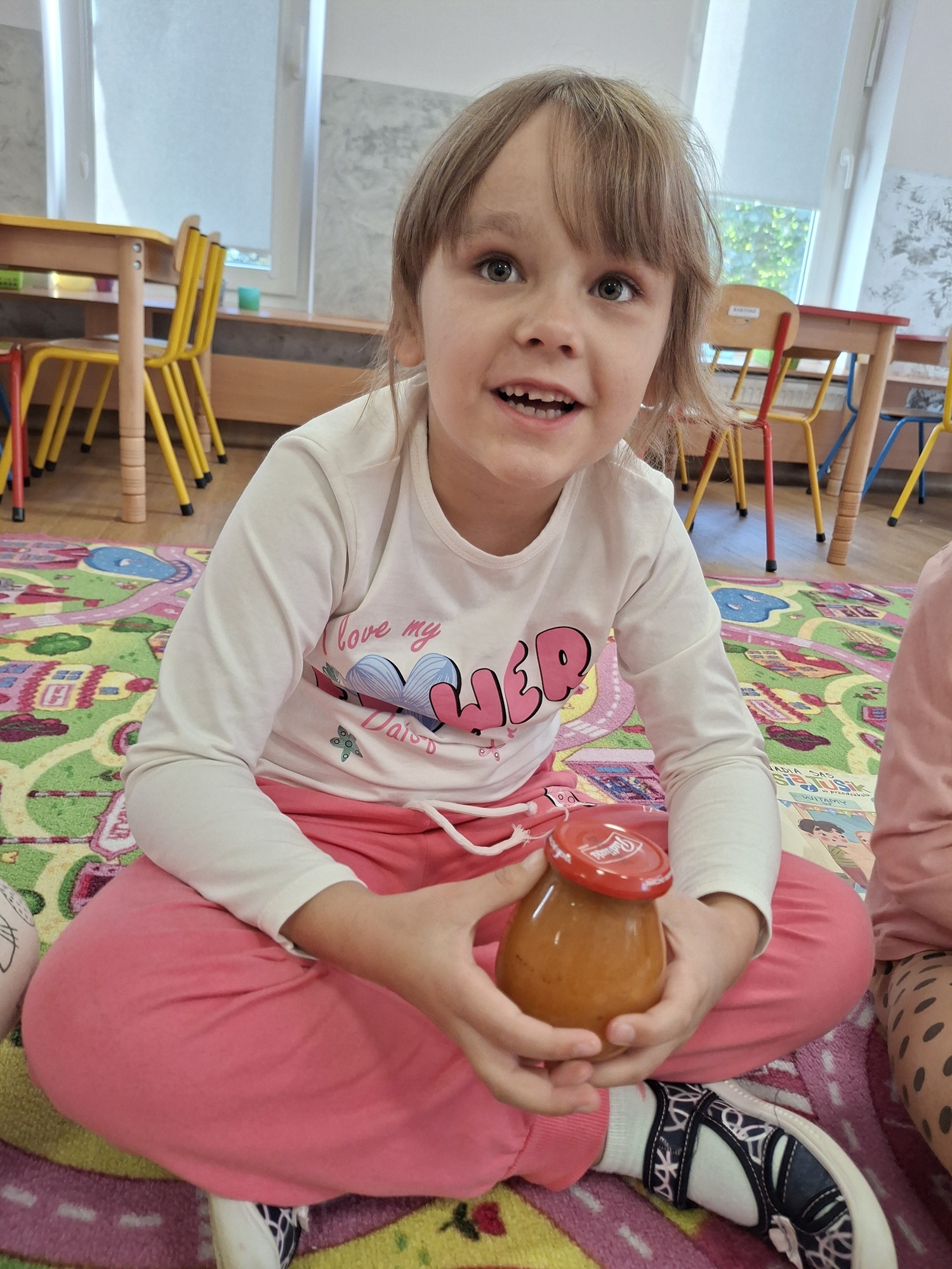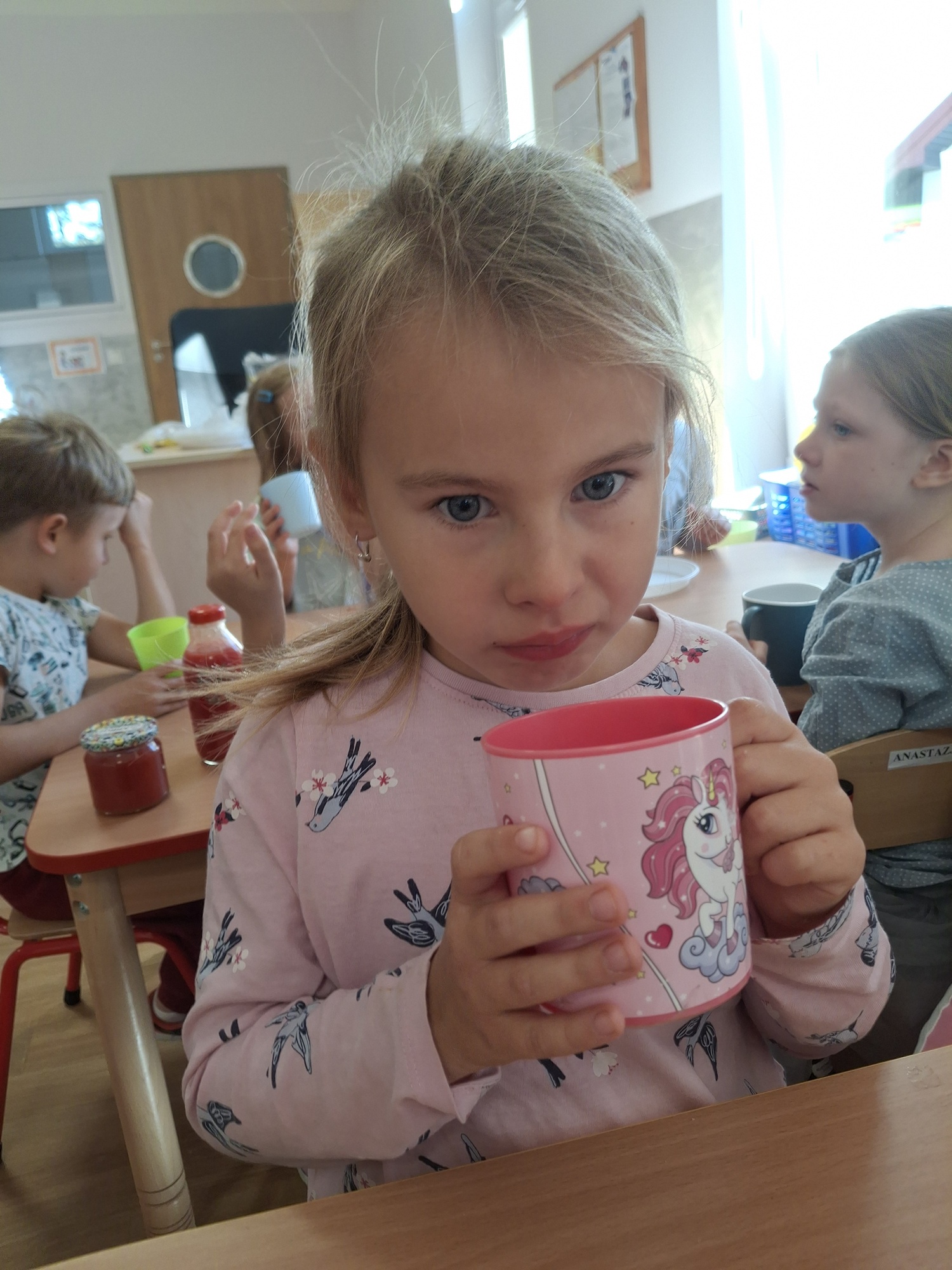 W jaki sposób zatrzymać lato w słoikach? - rozprawiały Sówki podczas zajęć. Rozmawialiśmy, o tym jak to nasze babcie i mamy robią kompoty, dżemy, soki i rożne inne przetwory, które chowamy do naszych domowych spiżarni. Wspólnie wpadliśmy na pomysł o przyniesieniu swojego ulubionego przetworu. I tak dzięki pomocy rodziców udało się zorganizować prawdziwą przedszkolną spiżarnię i przygotować prawdziwą ucztę smaków. Próbowaliśmy między innymi soków owocowych dżemów ze śliwek, truskawek, brzoskwiń, borówek itp. Zrobiliśmy sok malinowy, który smakował nam wyśmienicie. Była to prawdziwa uczta dla naszych zmysłów (węchu, smaku i wzroku), poczęstowaliśmy też nasze ciocie. Przy okazji przetwory wykorzystaliśmy do słodkich zabaw logopedycznych.