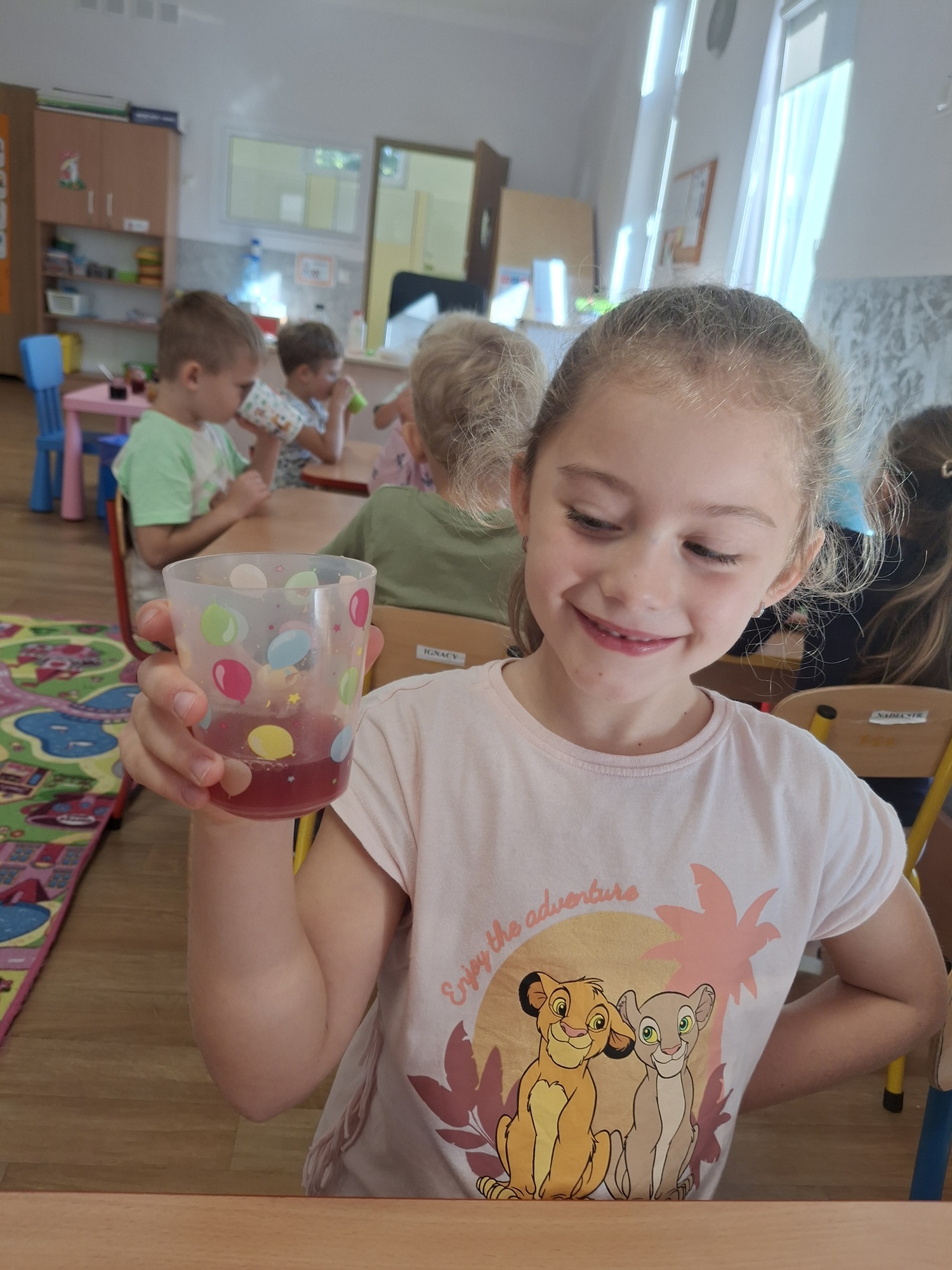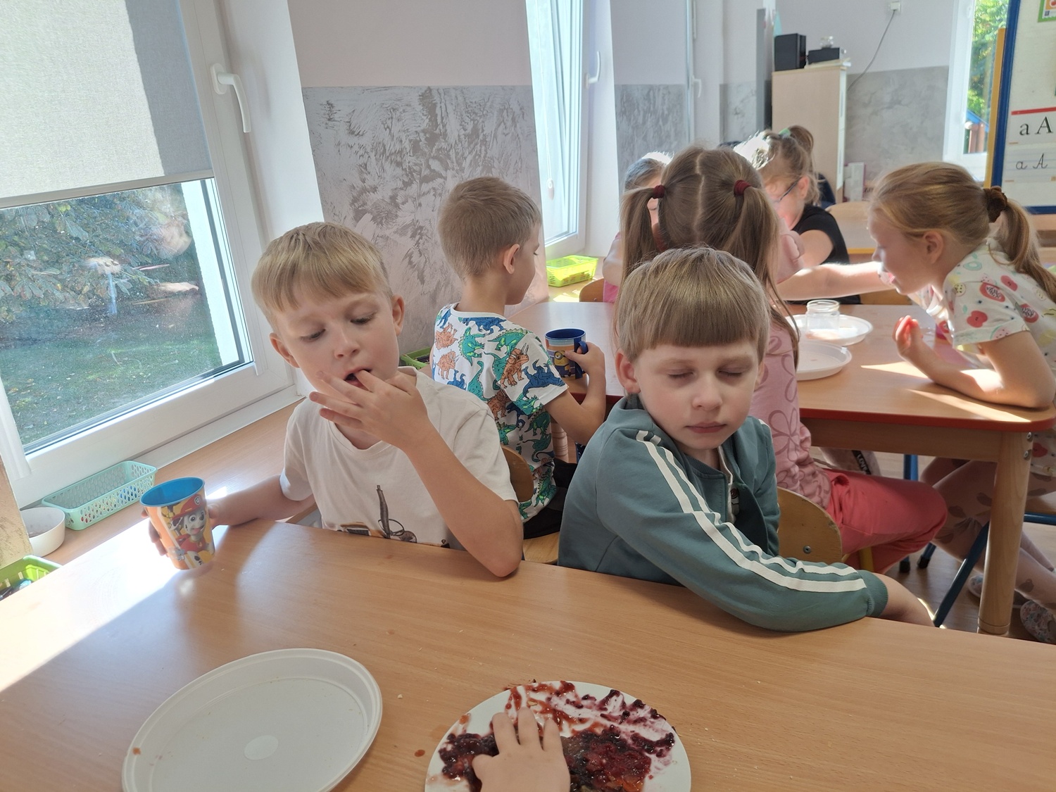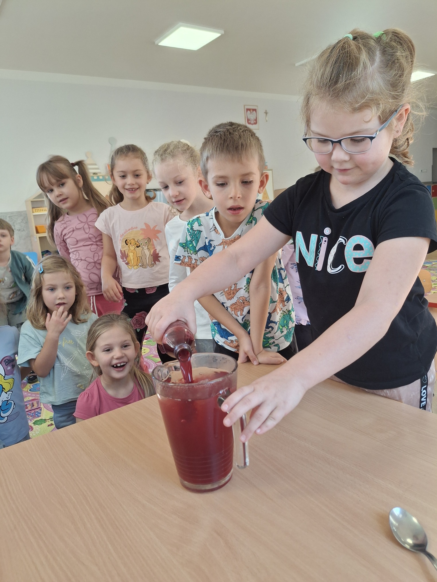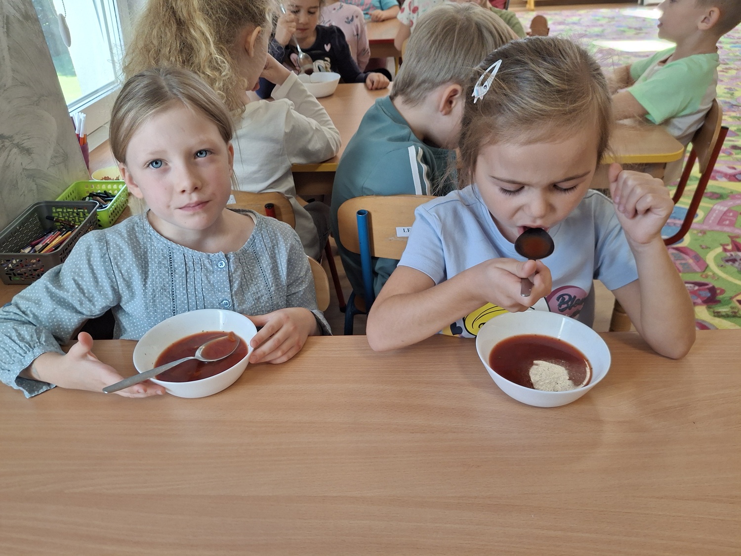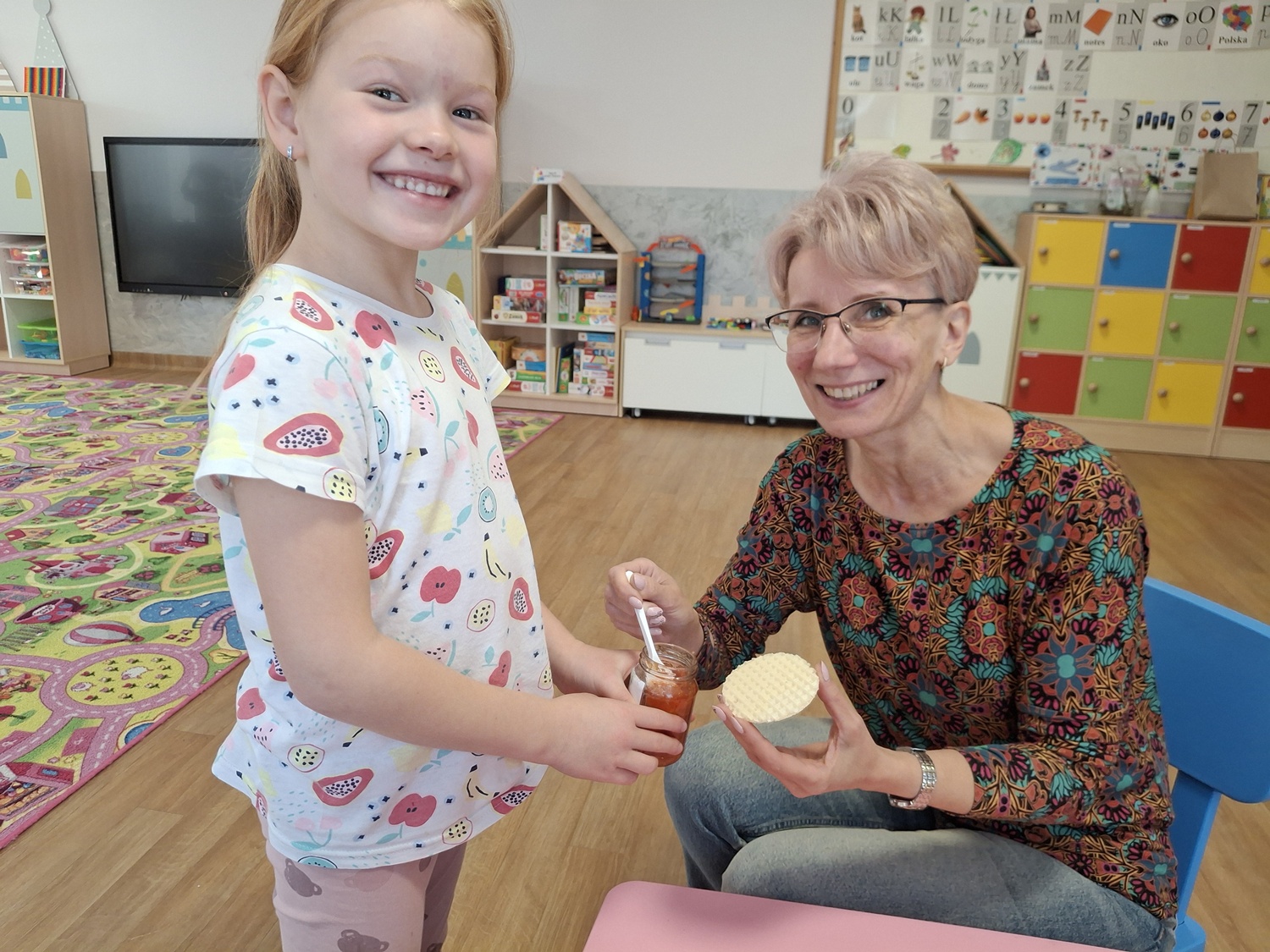W jaki sposób zatrzymać lato w słoikach? - rozprawiały Sówki podczas zajęć. Rozmawialiśmy, o tym jak to nasze babcie i mamy robią kompoty, dżemy, soki i rożne inne przetwory, które chowamy do naszych domowych spiżarni. Wspólnie wpadliśmy na pomysł o przyniesieniu swojego ulubionego przetworu. I tak dzięki pomocy rodziców udało się zorganizować prawdziwą przedszkolną spiżarnię i przygotować prawdziwą ucztę smaków. Próbowaliśmy między innymi soków owocowych dżemów ze śliwek, truskawek, brzoskwiń, borówek itp. Zrobiliśmy sok malinowy, który smakował nam wyśmienicie. Była to prawdziwa uczta dla naszych zmysłów (węchu, smaku i wzroku), poczęstowaliśmy też nasze ciocie. Przy okazji przetwory wykorzystaliśmy do słodkich zabaw logopedycznych.