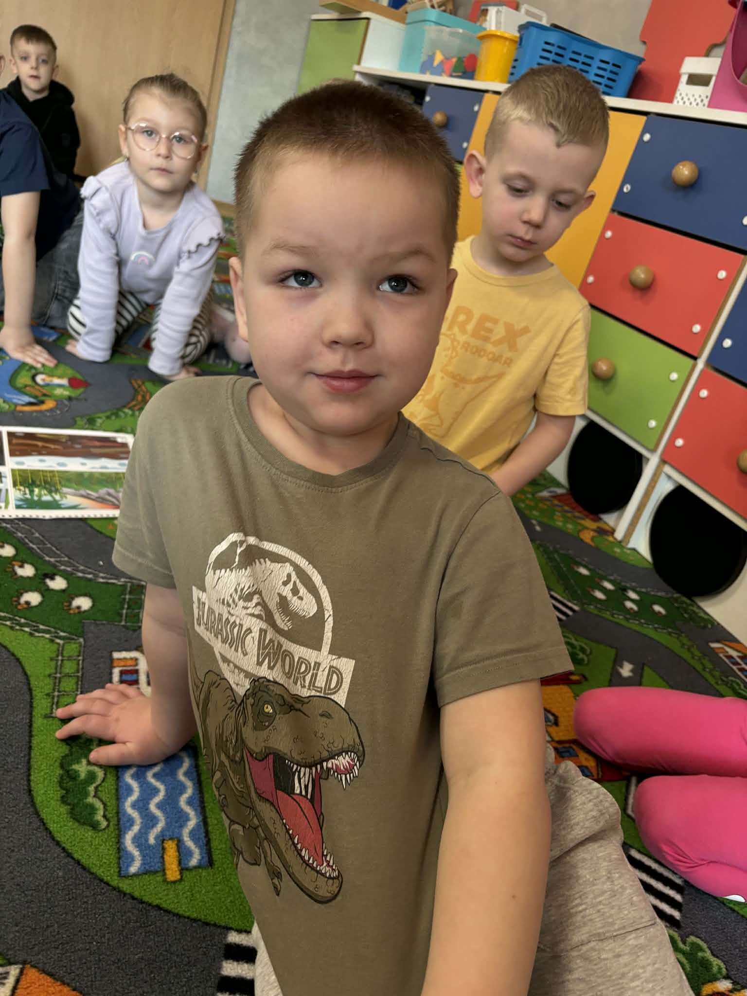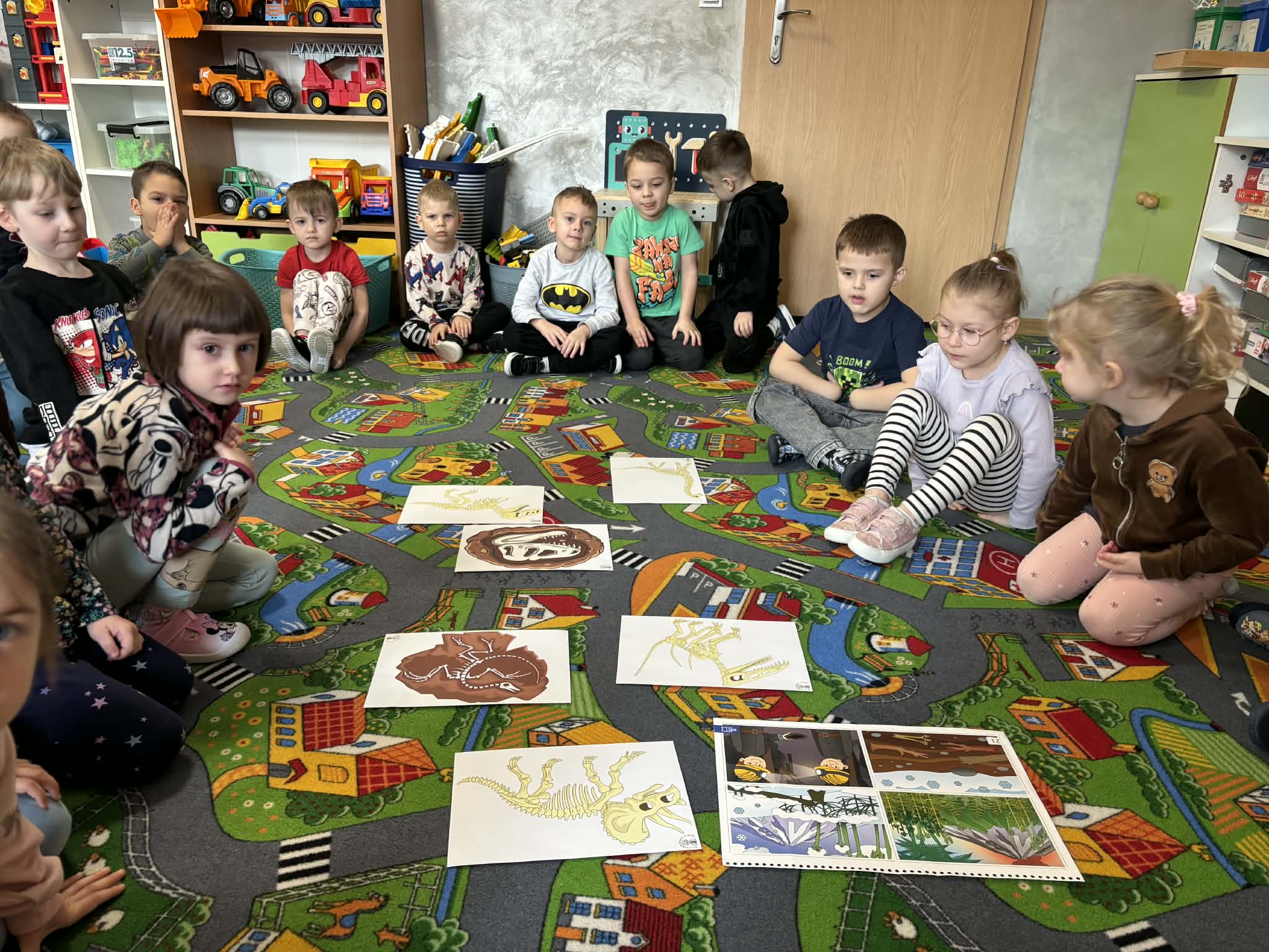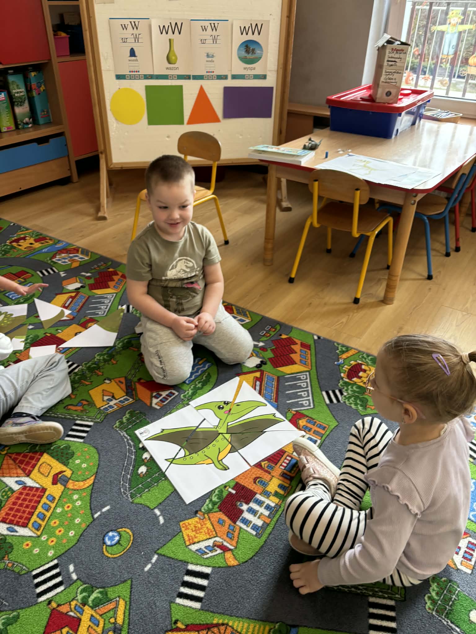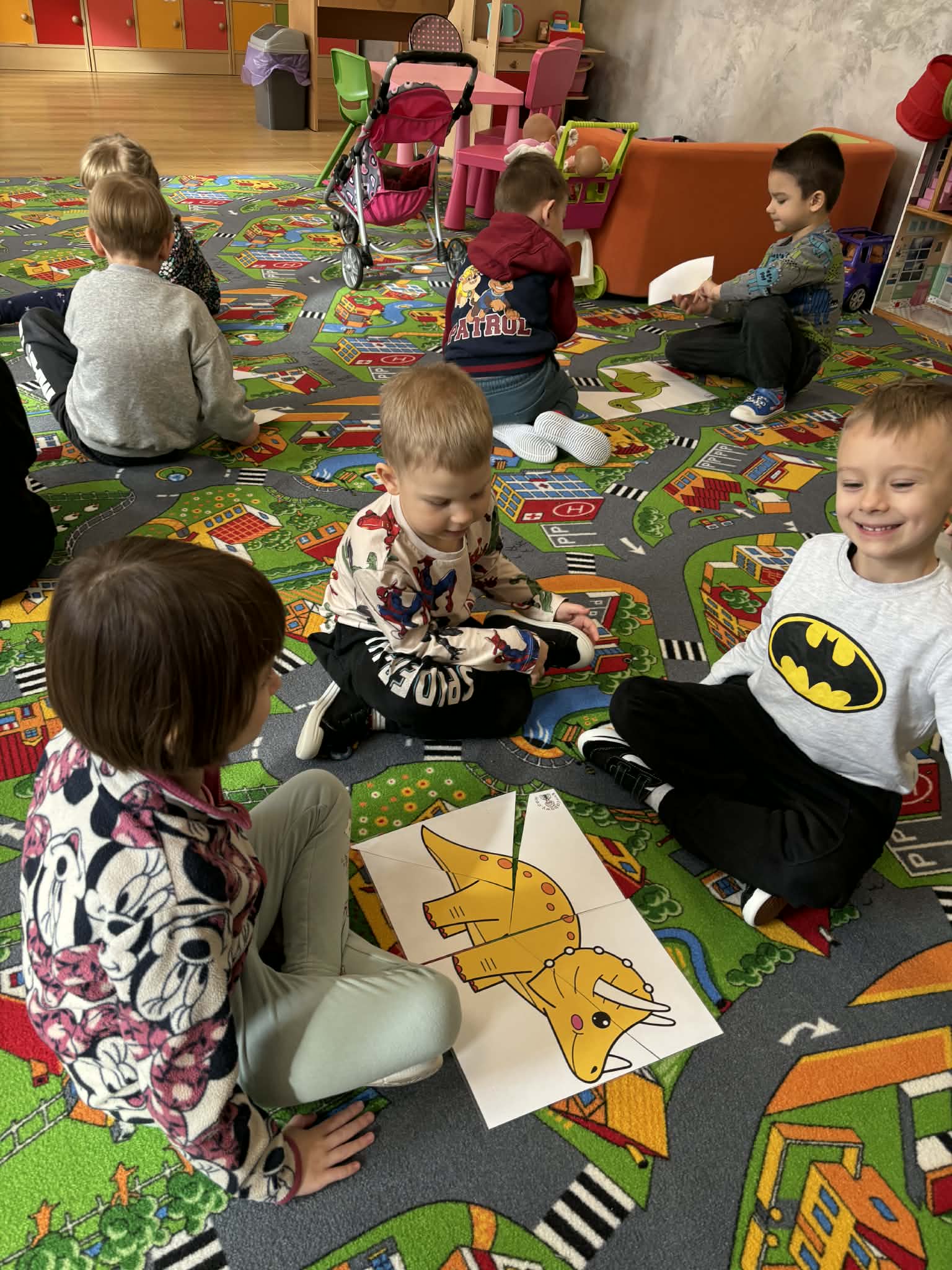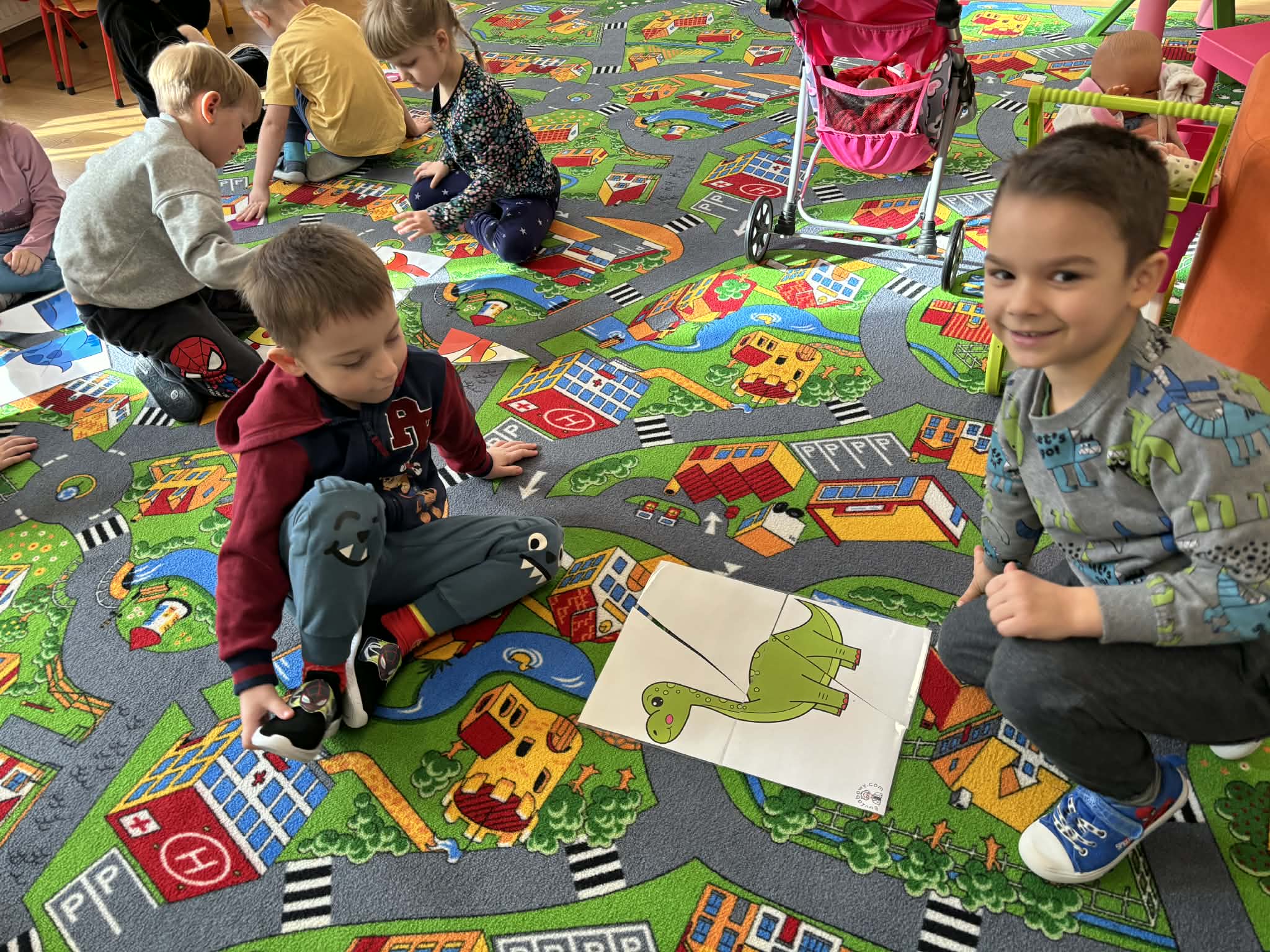 Puchatki podczas zajęć utrwalały poznane figury geometryczne wykorzystując tajemniczy świat dinozaurów. Każdy przyniósł z domu swojego dinozaura, książkę, a nawet na koszulce czy spodenkach znalazł się dinozaur. Dzieci dzieliły się swoimi spostrzeżeniami i wiedzą na temat życia dinozaurów. Podczas zabaw ruchowych z wykorzystaniem szczudeł, zamieniły się na chwilkę w diplodoki. Podczas zabaw matematycznych przeliczały i klasyfikowały figury i zwierzęta. Na koniec każdy narysował swojego dinozaura. Piękne prace można podziwiać w przedszkolnej szatni.