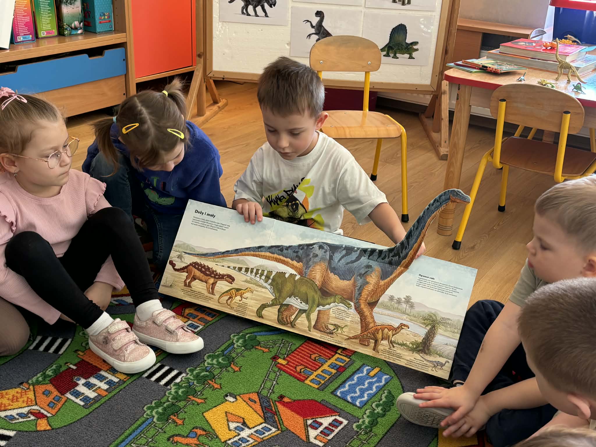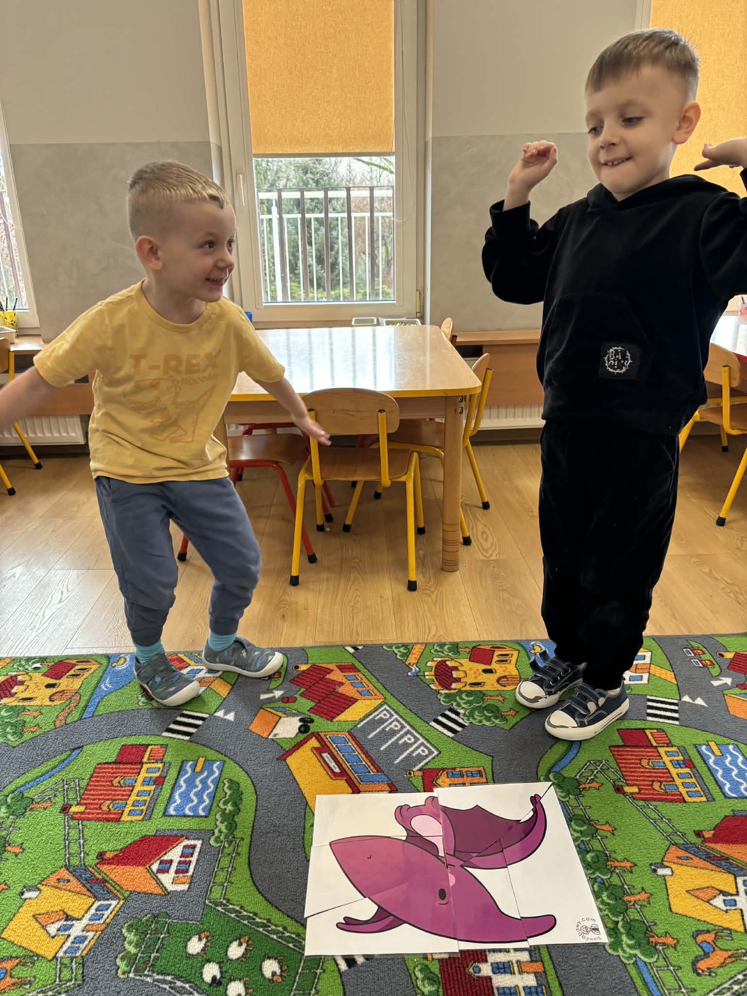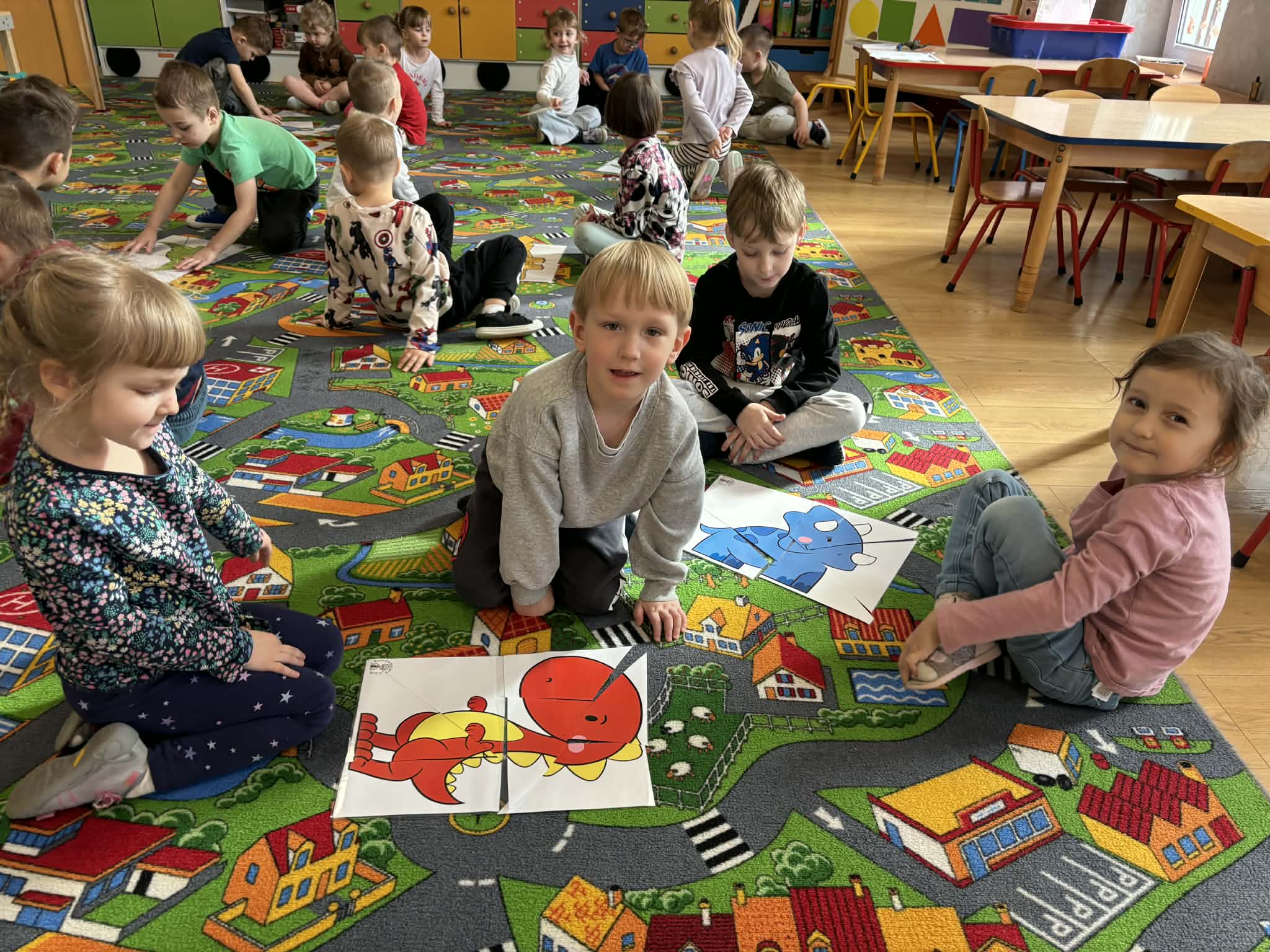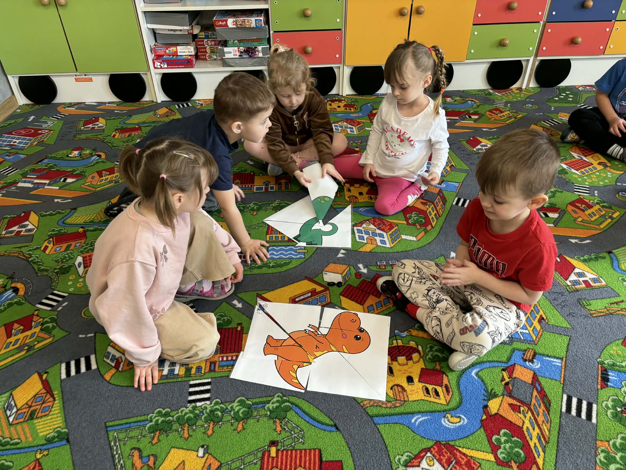 Puchatki podczas zajęć utrwalały poznane figury geometryczne wykorzystując tajemniczy świat dinozaurów. Każdy przyniósł z domu swojego dinozaura, książkę, a nawet na koszulce czy spodenkach znalazł się dinozaur. Dzieci dzieliły się swoimi spostrzeżeniami i wiedzą na temat życia dinozaurów. Podczas zabaw ruchowych z wykorzystaniem szczudeł, zamieniły się na chwilkę w diplodoki. Podczas zabaw matematycznych przeliczały i klasyfikowały figury i zwierzęta. Na koniec każdy narysował swojego dinozaura. Piękne prace można podziwiać w przedszkolnej szatni.