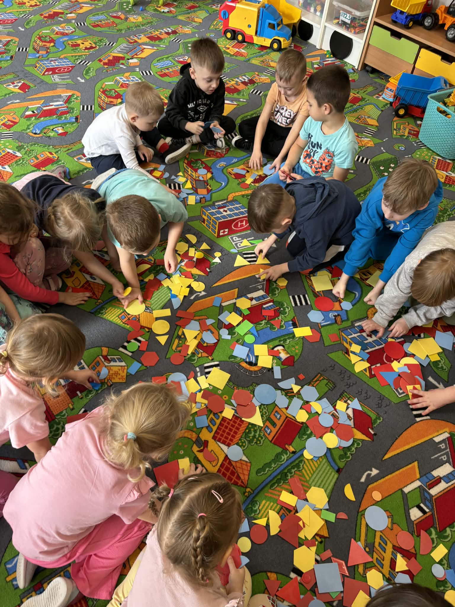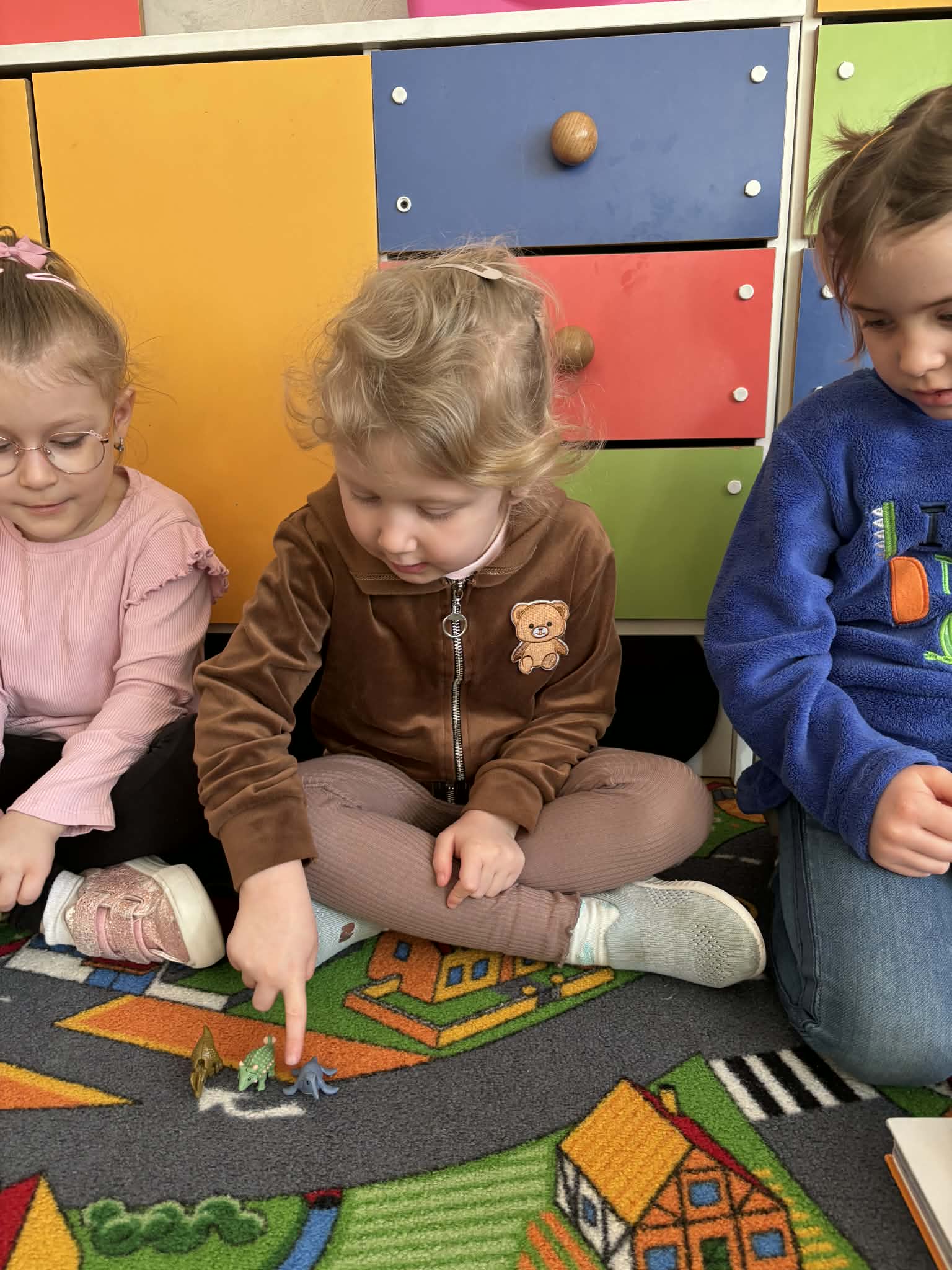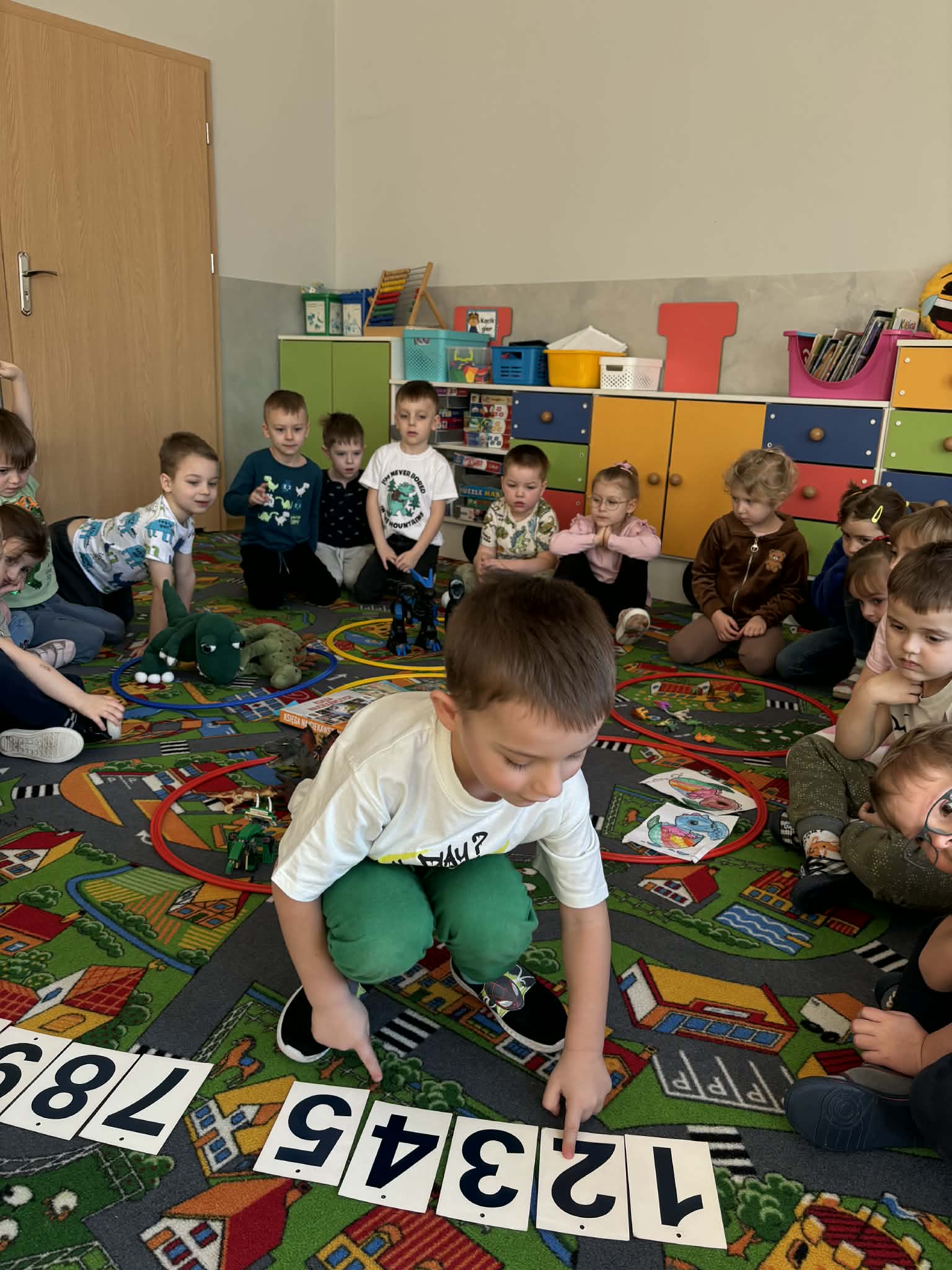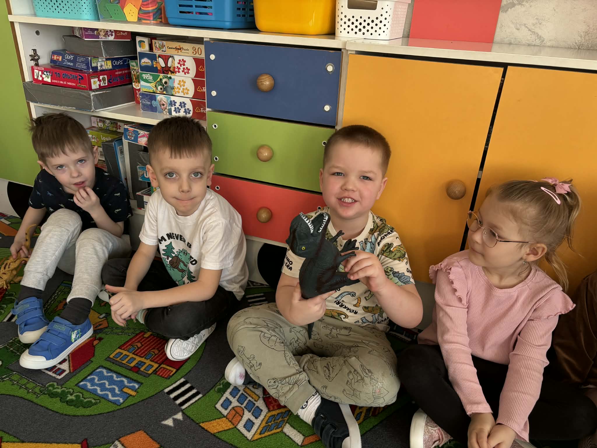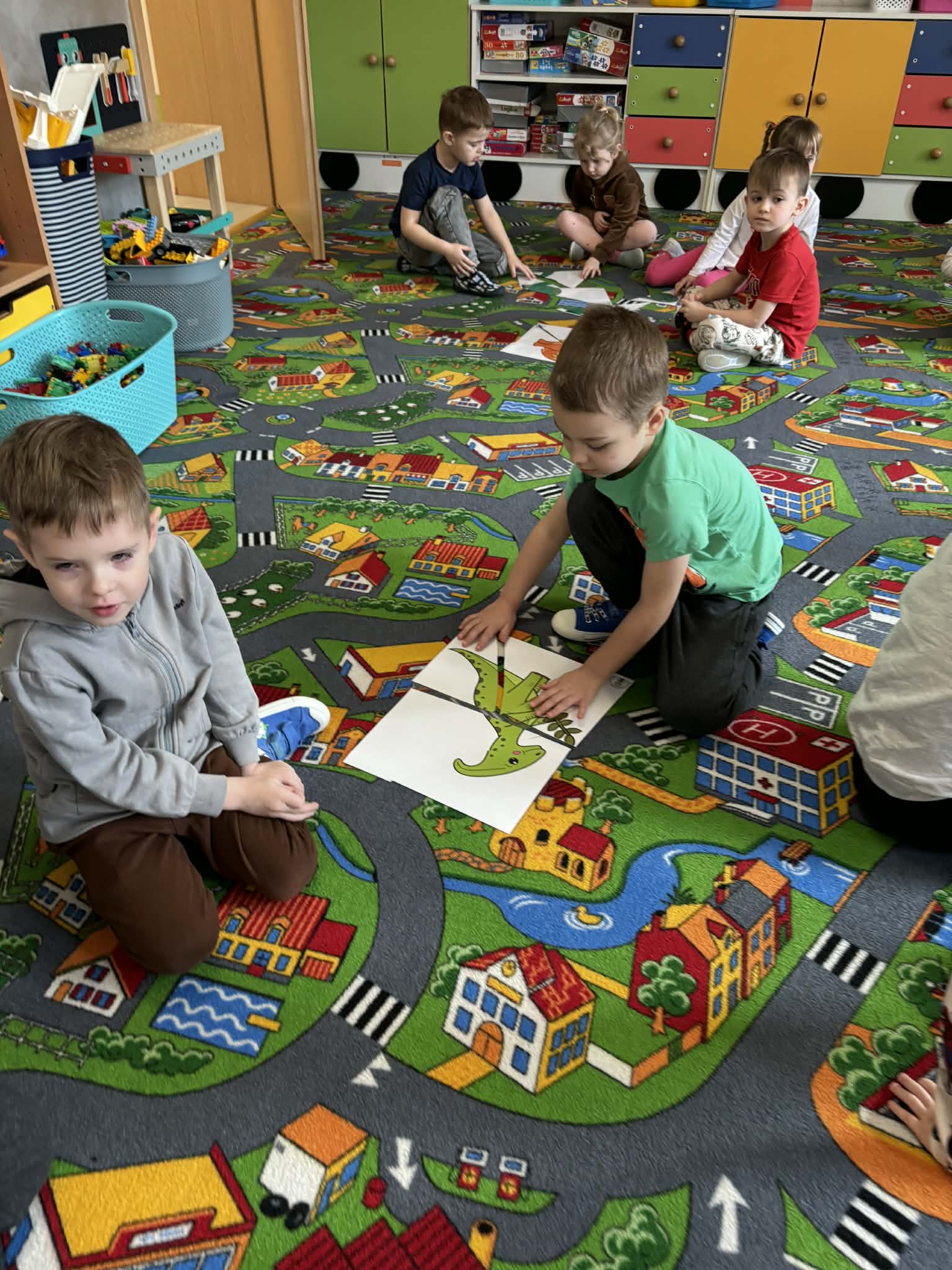 Puchatki podczas zajęć utrwalały poznane figury geometryczne wykorzystując tajemniczy świat dinozaurów. Każdy przyniósł z domu swojego dinozaura, książkę, a nawet na koszulce czy spodenkach znalazł się dinozaur. Dzieci dzieliły się swoimi spostrzeżeniami i wiedzą na temat życia dinozaurów. Podczas zabaw ruchowych z wykorzystaniem szczudeł, zamieniły się na chwilkę w diplodoki. Podczas zabaw matematycznych przeliczały i klasyfikowały figury i zwierzęta. Na koniec każdy narysował swojego dinozaura. Piękne prace można podziwiać w przedszkolnej szatni.