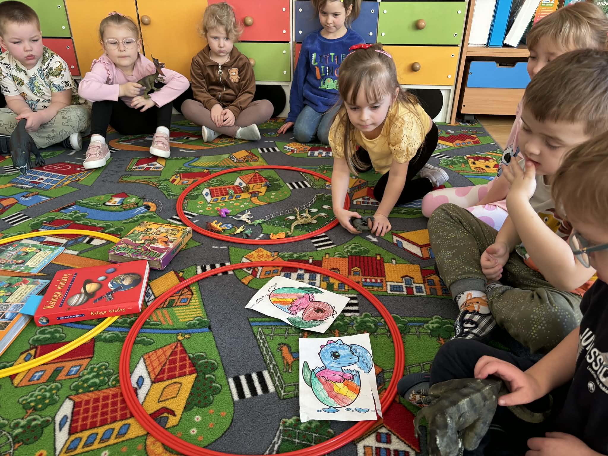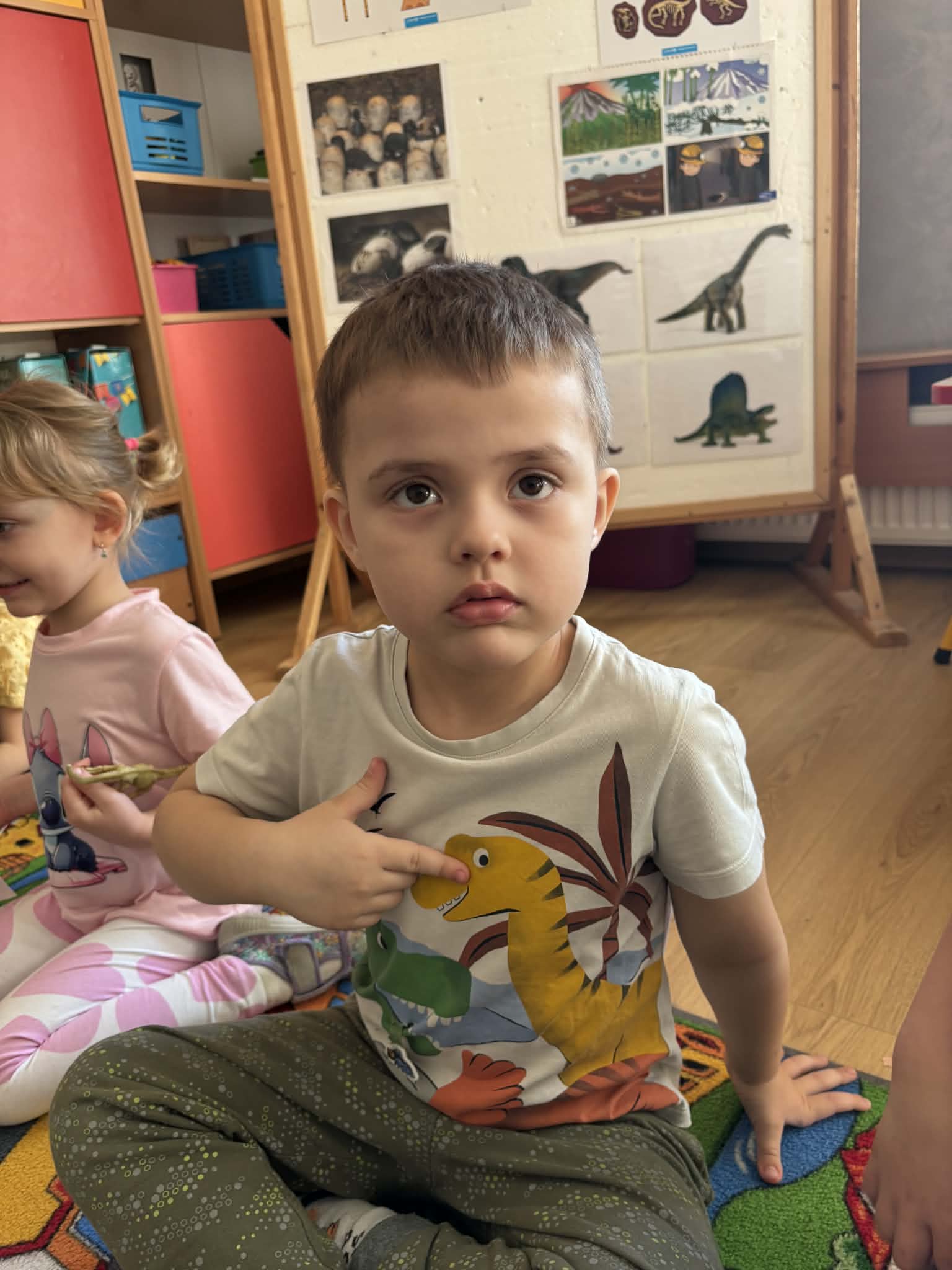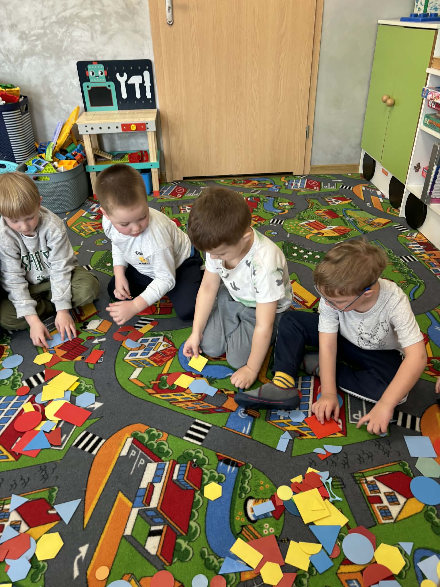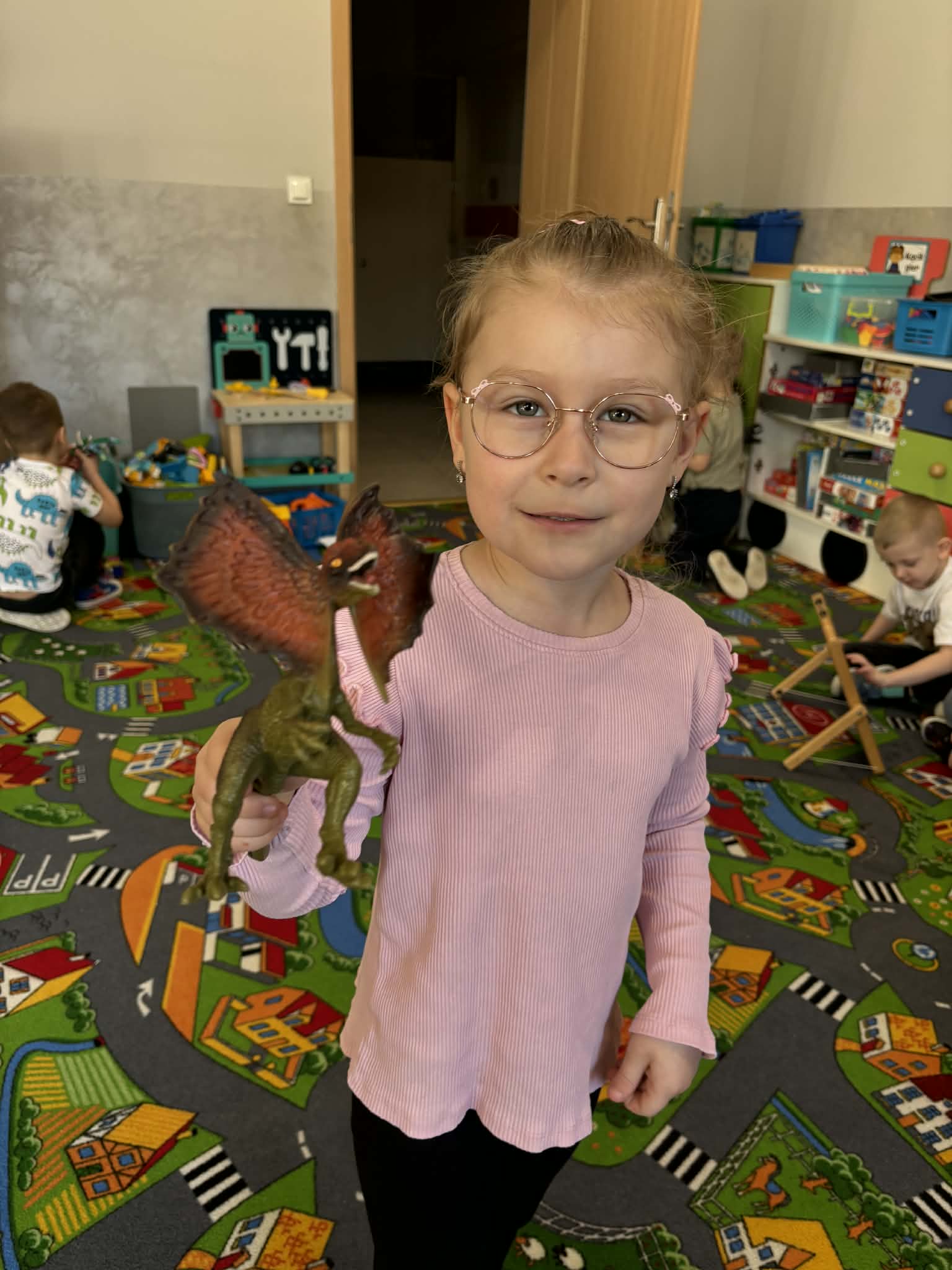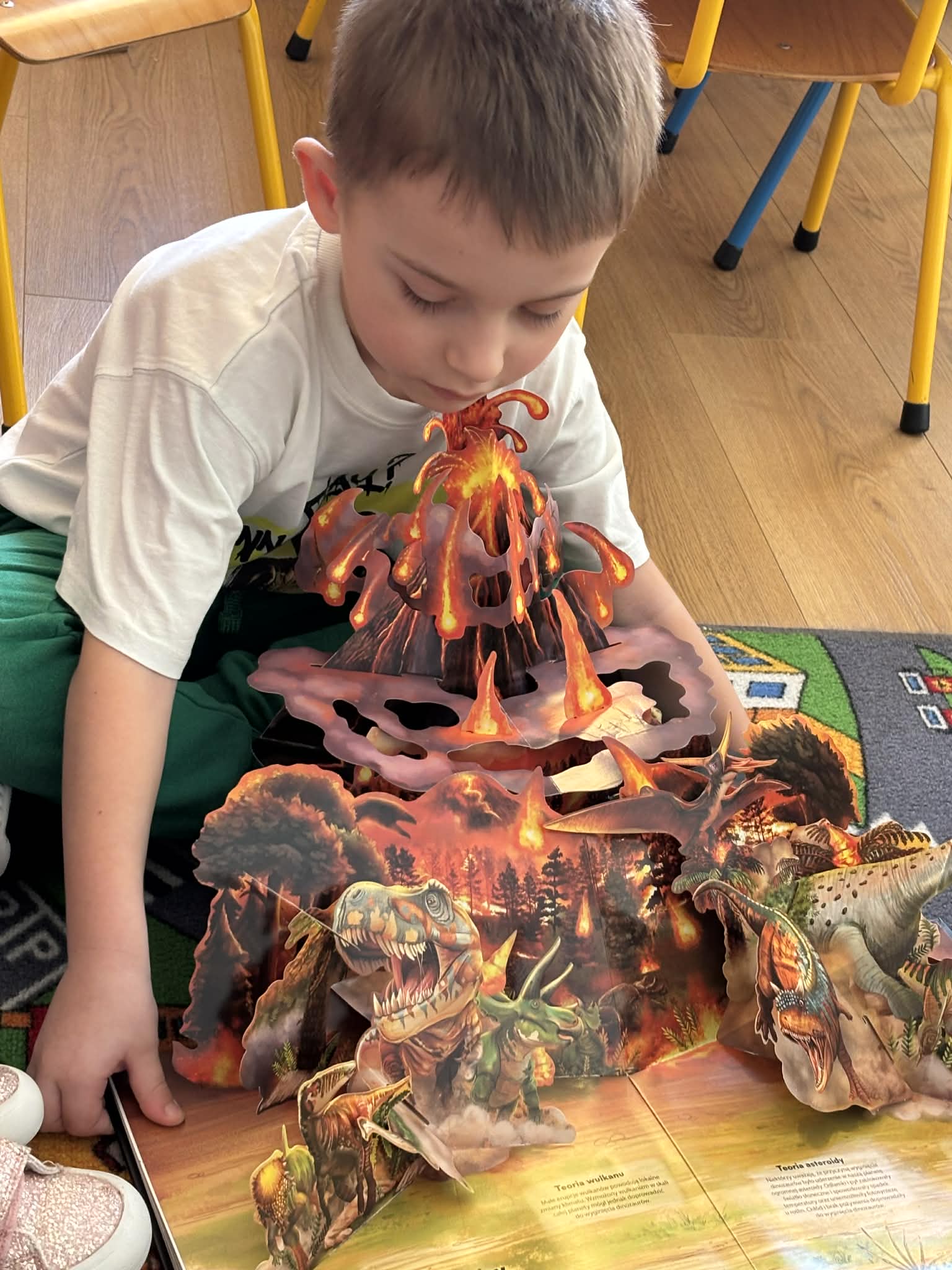 Puchatki podczas zajęć utrwalały poznane figury geometryczne wykorzystując tajemniczy świat dinozaurów. Każdy przyniósł z domu swojego dinozaura, książkę, a nawet na koszulce czy spodenkach znalazł się dinozaur. Dzieci dzieliły się swoimi spostrzeżeniami i wiedzą na temat życia dinozaurów. Podczas zabaw ruchowych z wykorzystaniem szczudeł, zamieniły się na chwilkę w diplodoki. Podczas zabaw matematycznych przeliczały i klasyfikowały figury i zwierzęta. Na koniec każdy narysował swojego dinozaura. Piękne prace można podziwiać w przedszkolnej szatni.