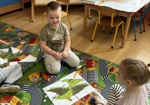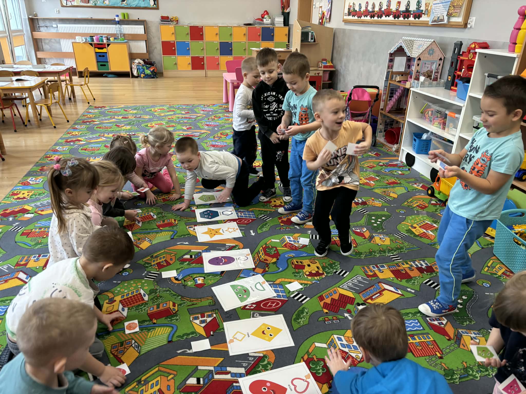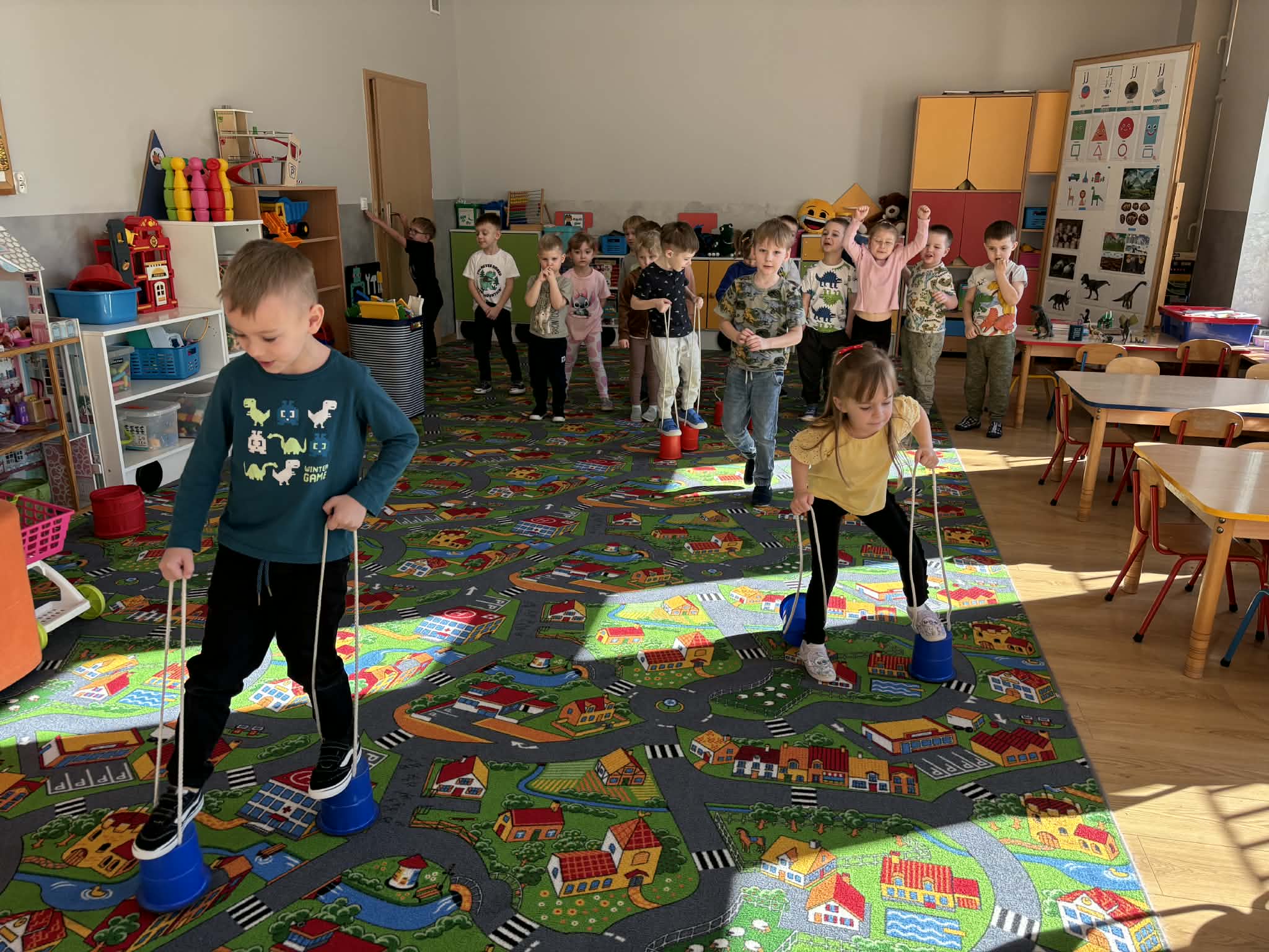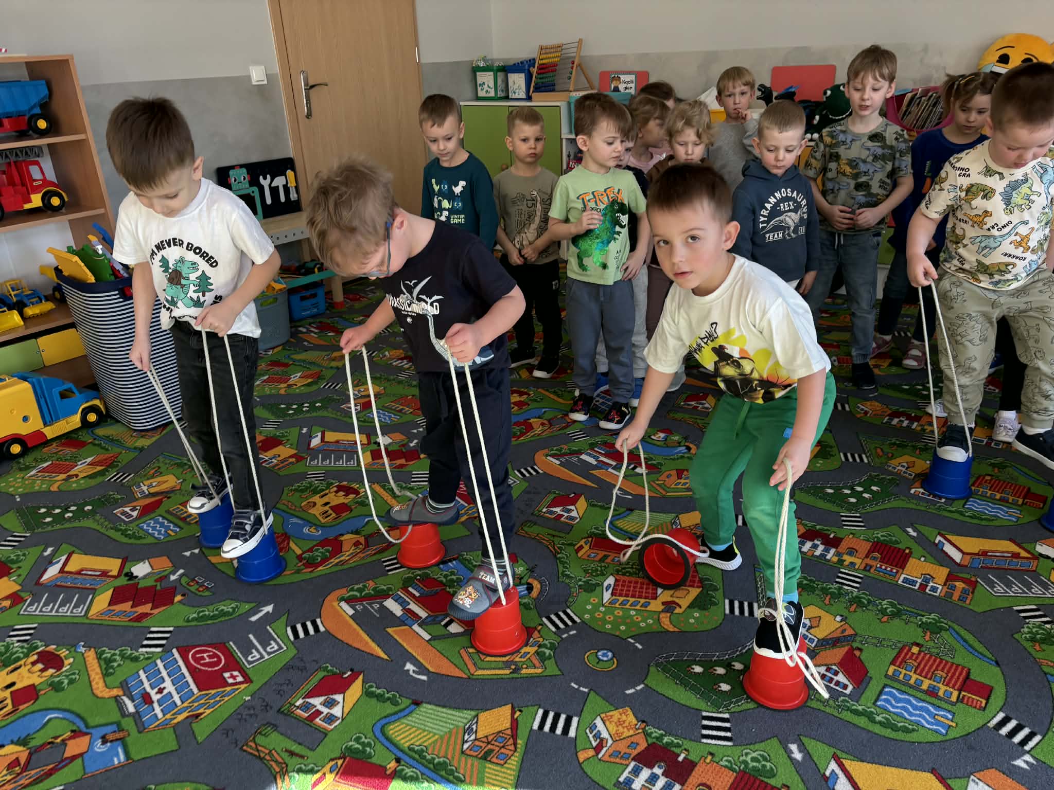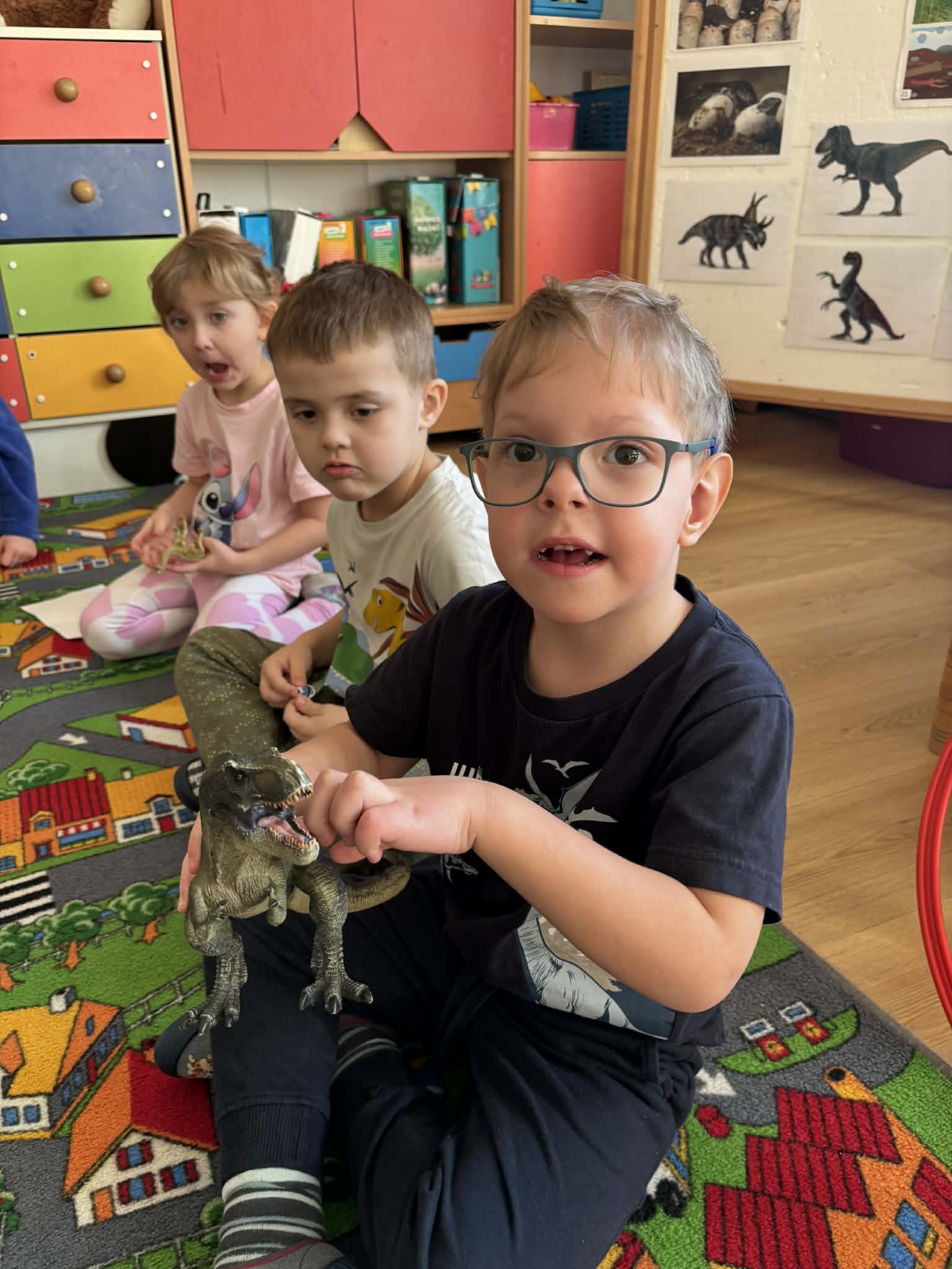 Puchatki podczas zajęć utrwalały poznane figury geometryczne wykorzystując tajemniczy świat dinozaurów. Każdy przyniósł z domu swojego dinozaura, książkę, a nawet na koszulce czy spodenkach znalazł się dinozaur. Dzieci dzieliły się swoimi spostrzeżeniami i wiedzą na temat życia dinozaurów. Podczas zabaw ruchowych z wykorzystaniem szczudeł, zamieniły się na chwilkę w diplodoki. Podczas zabaw matematycznych przeliczały i klasyfikowały figury i zwierzęta. Na koniec każdy narysował swojego dinozaura. Piękne prace można podziwiać w przedszkolnej szatni.