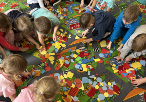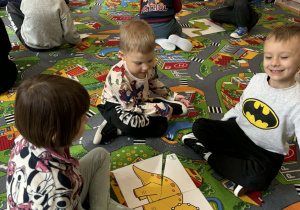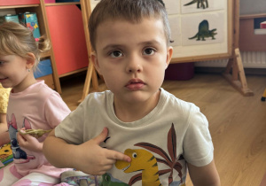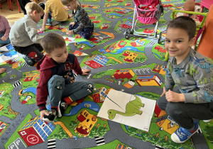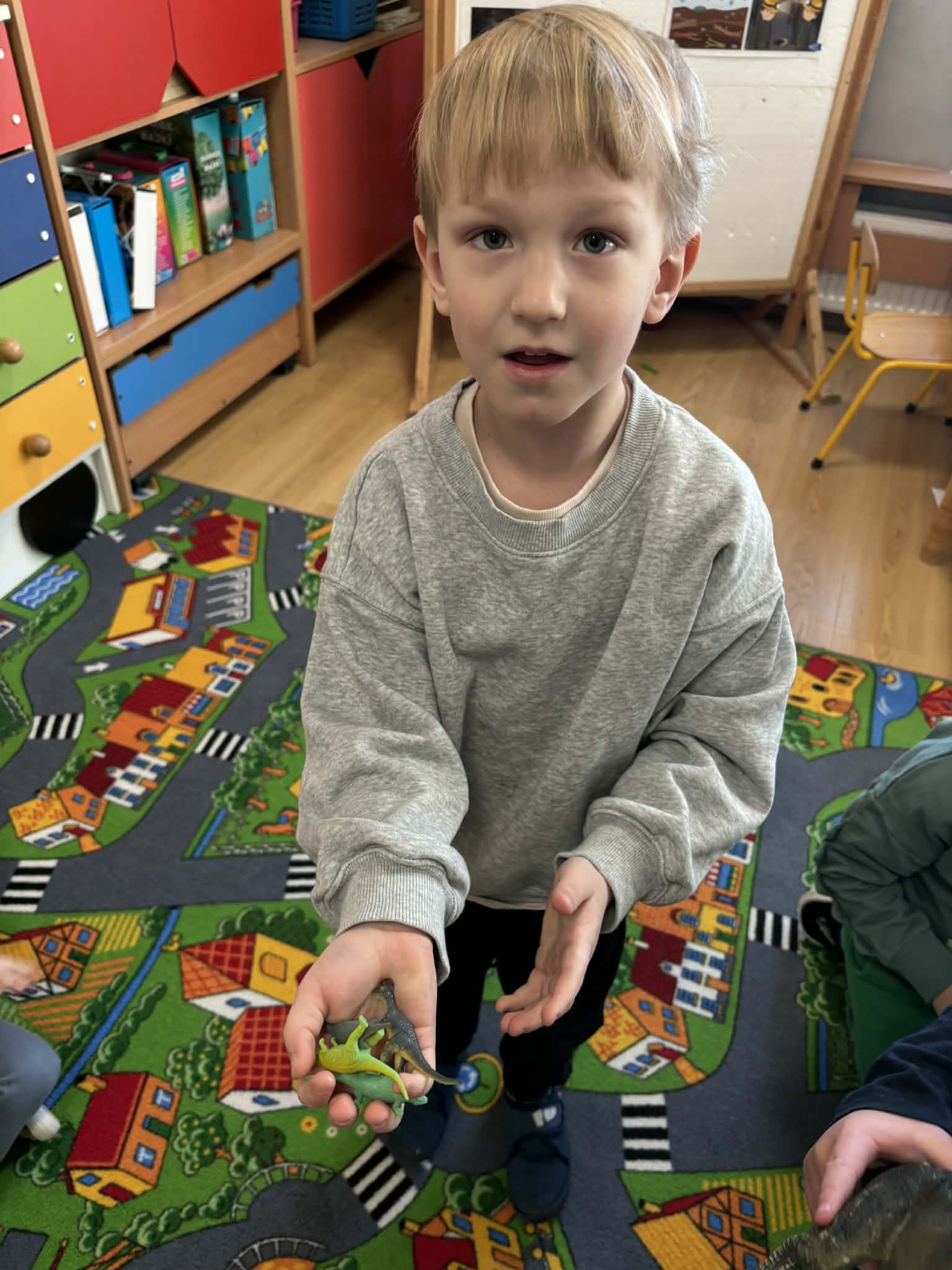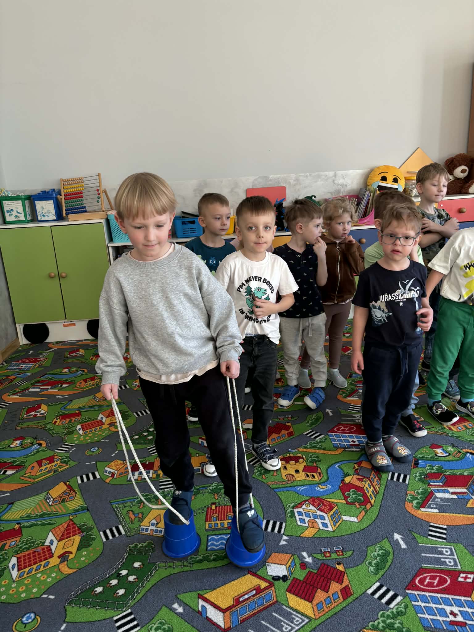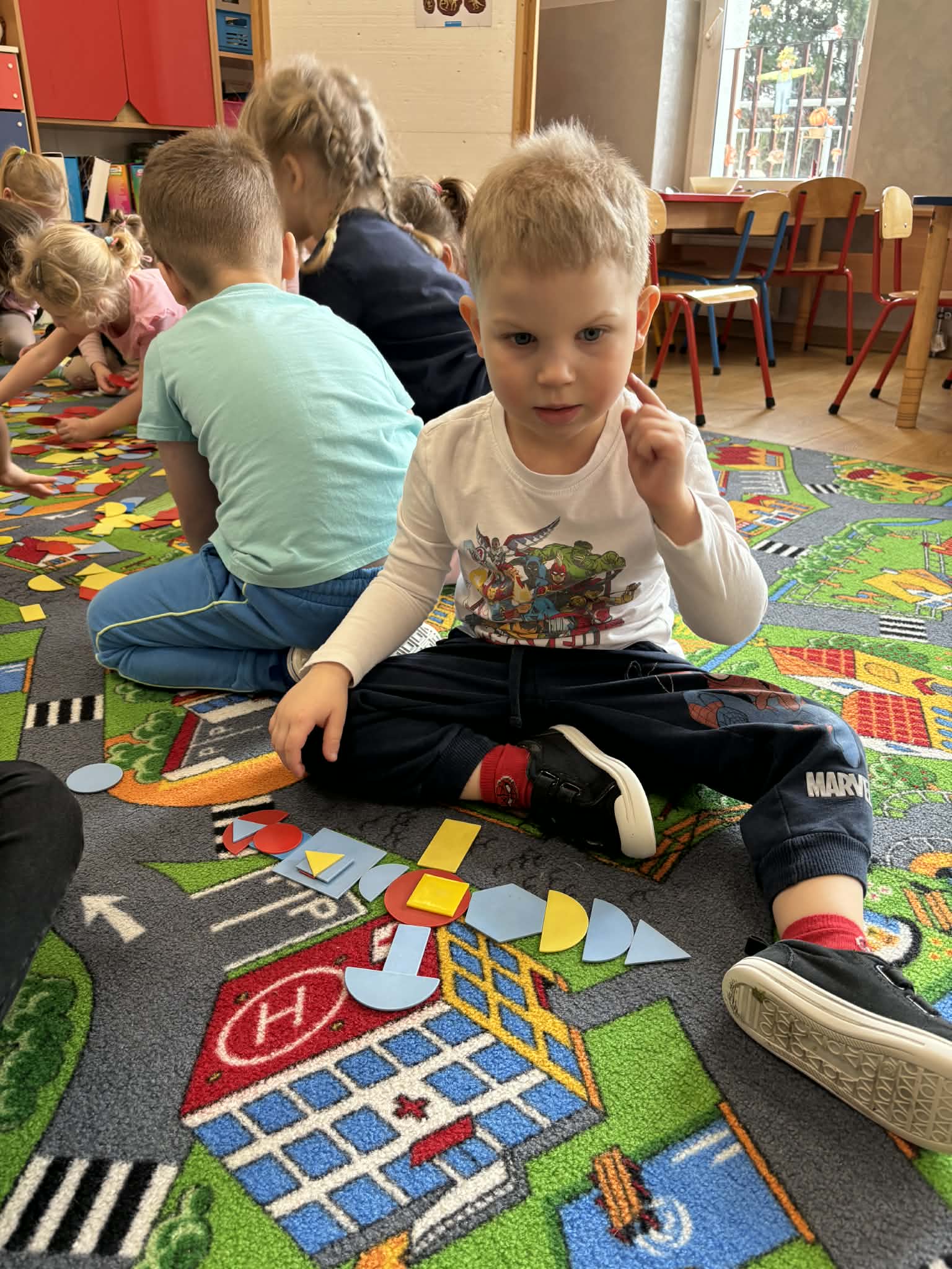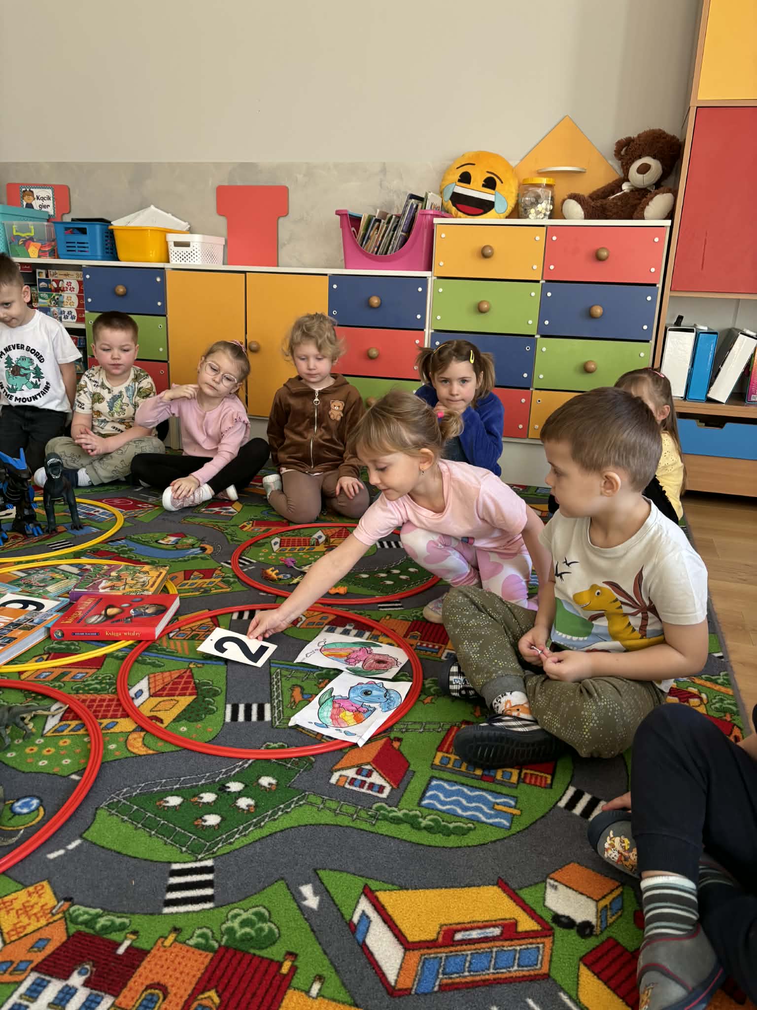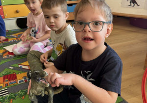 Puchatki podczas zajęć utrwalały poznane figury geometryczne wykorzystując tajemniczy świat dinozaurów. Każdy przyniósł z domu swojego dinozaura, książkę, a nawet na koszulce czy spodenkach znalazł się dinozaur. Dzieci dzieliły się swoimi spostrzeżeniami i wiedzą na temat życia dinozaurów. Podczas zabaw ruchowych z wykorzystaniem szczudeł, zamieniły się na chwilkę w diplodoki. Podczas zabaw matematycznych przeliczały i klasyfikowały figury i zwierzęta. Na koniec każdy narysował swojego dinozaura. Piękne prace można podziwiać w przedszkolnej szatni.