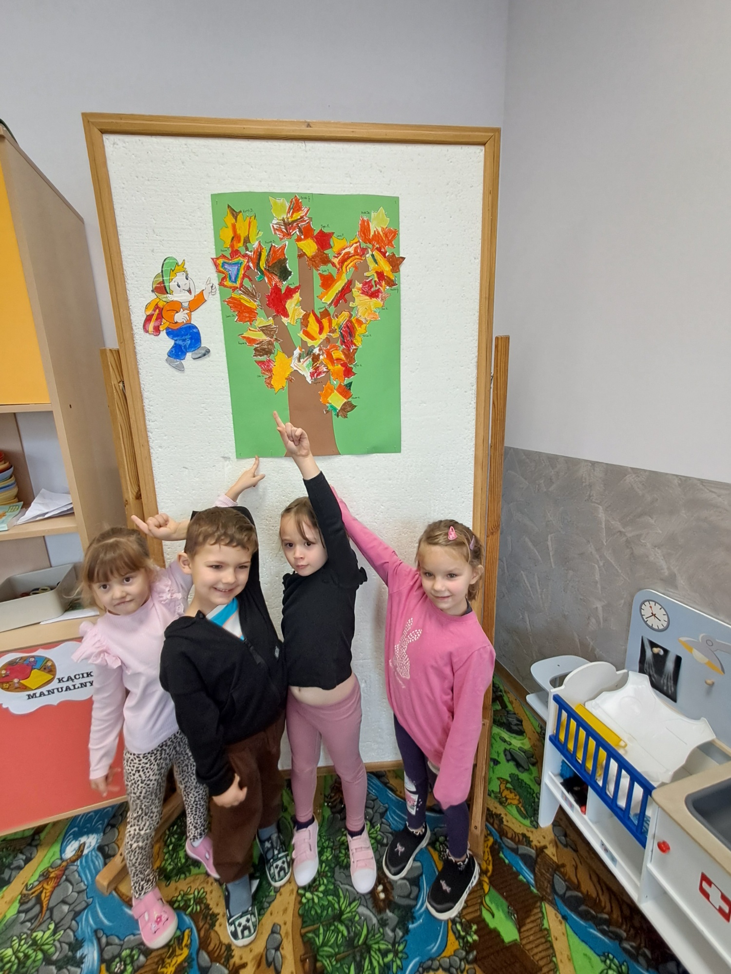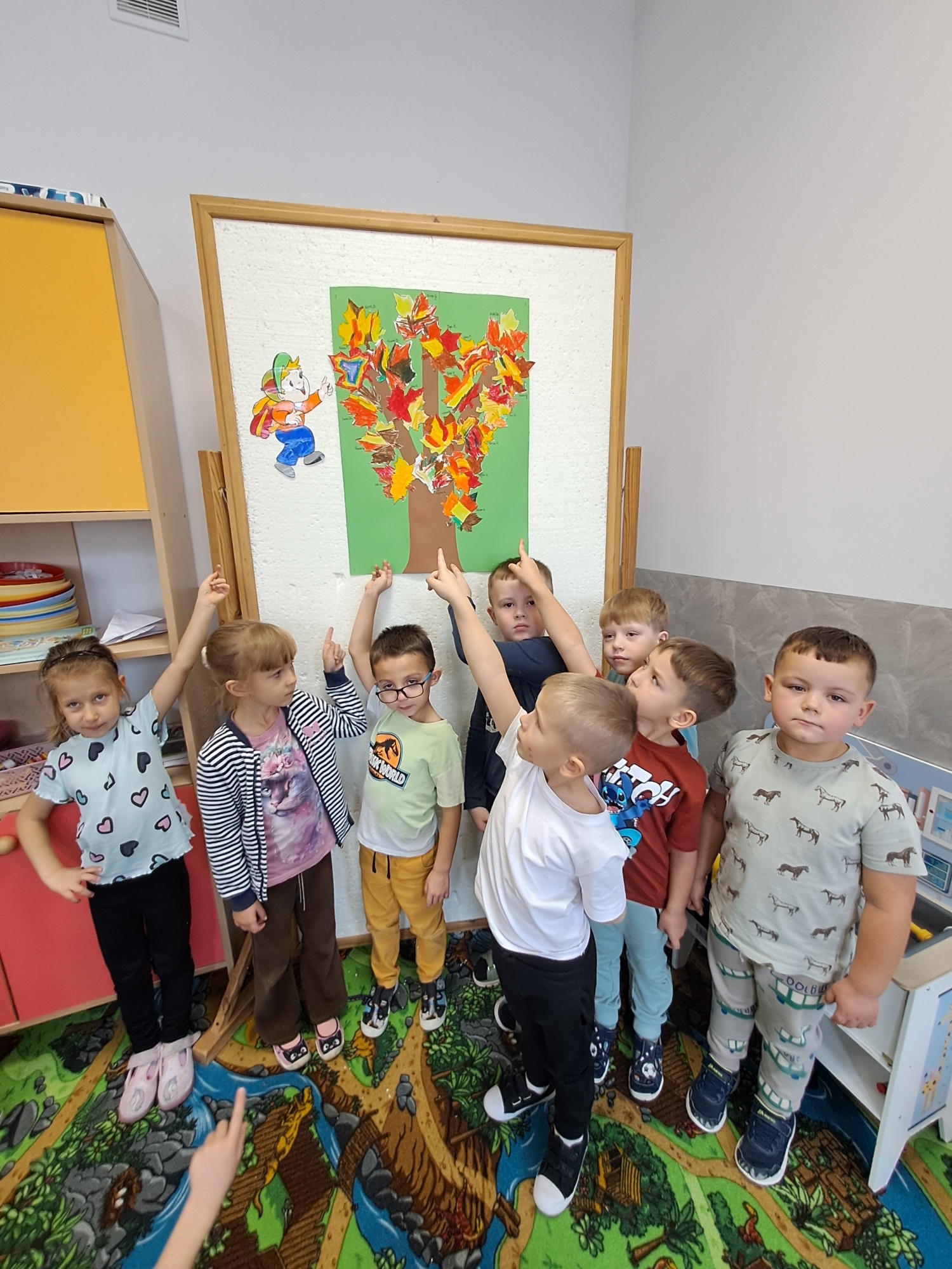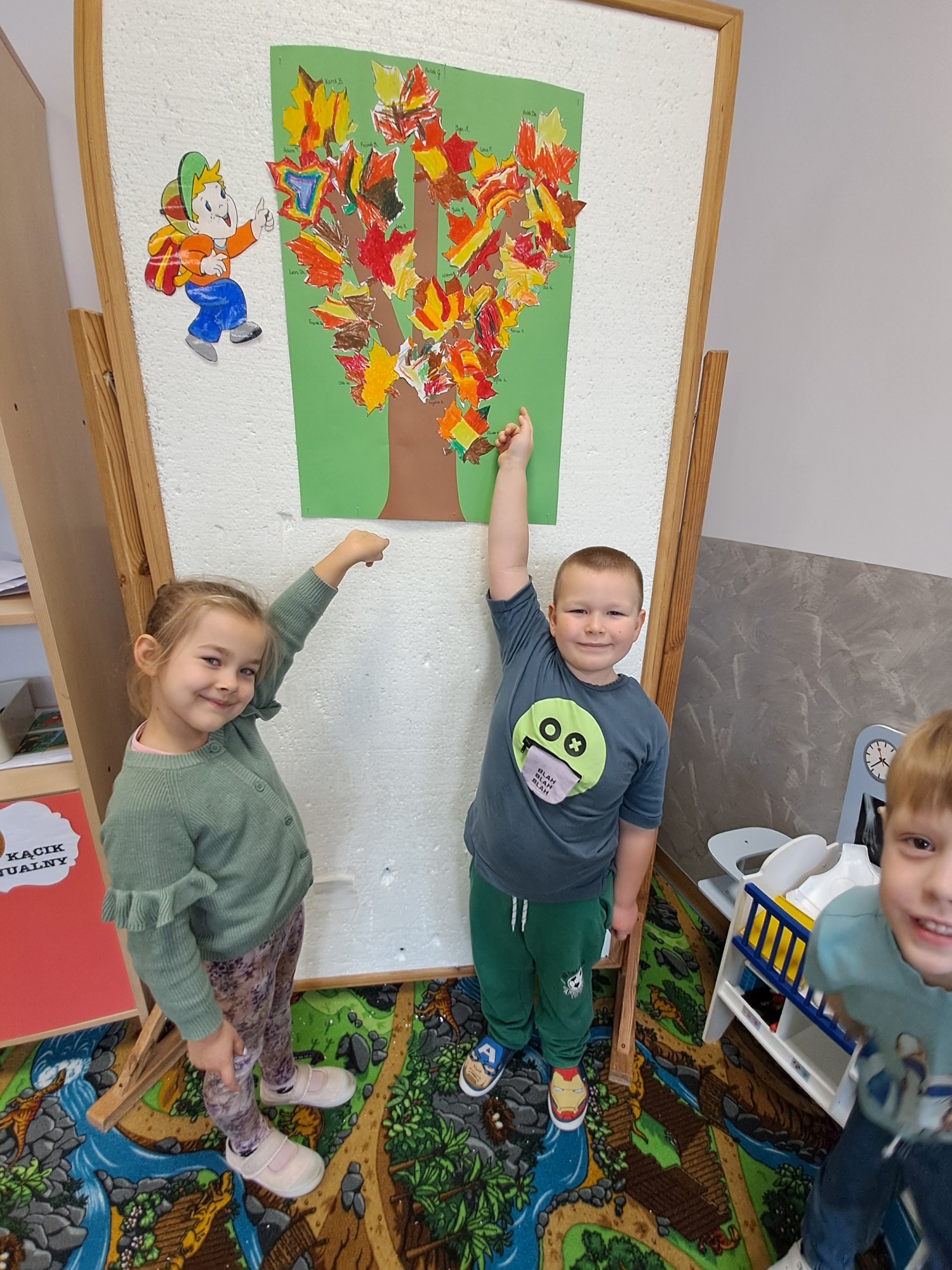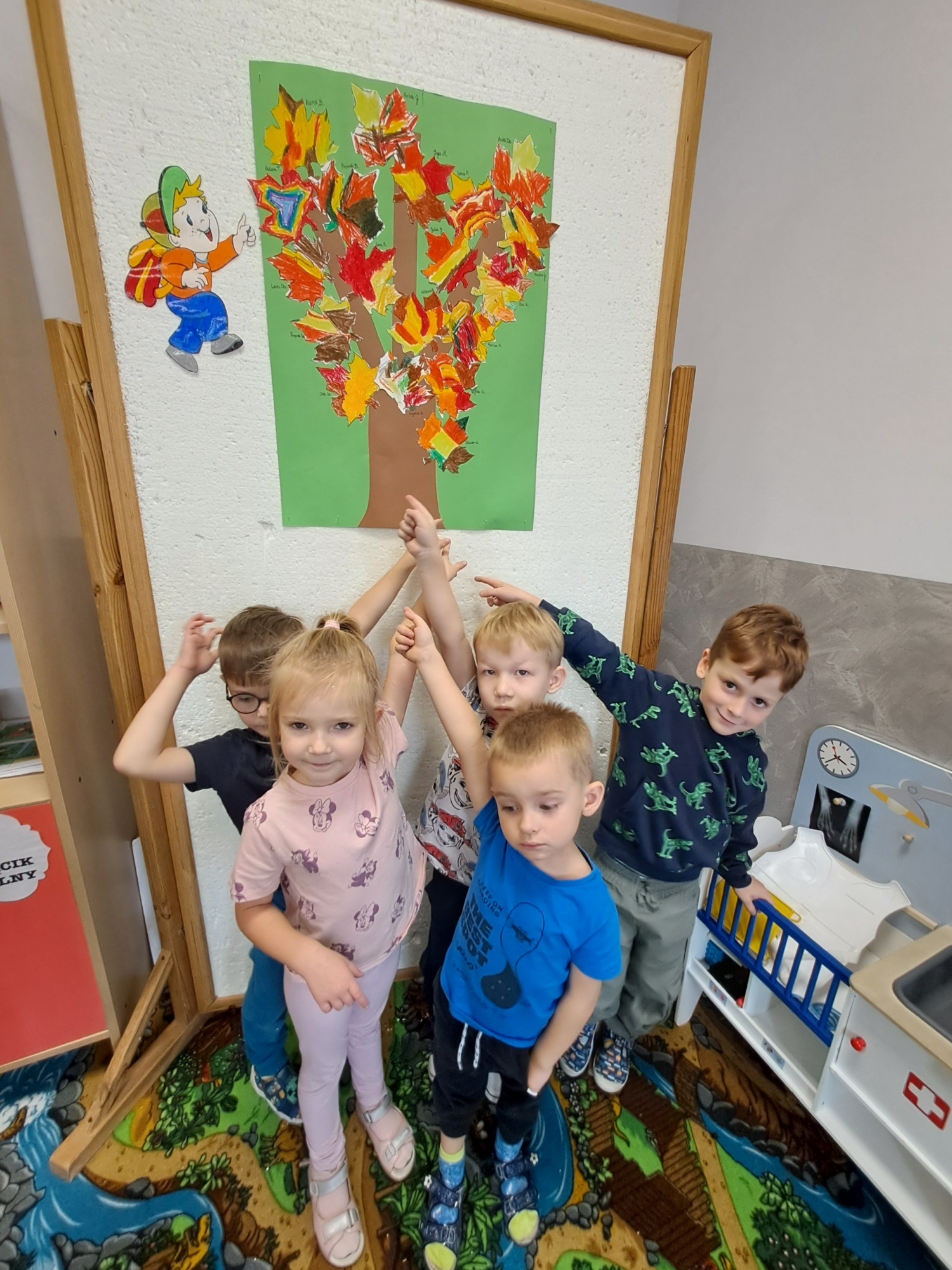 10 października grupa Pszczółki obchodziła Dzień Drzewa. Z tej okazji dzieci wybrały się na spacer do pobliskiego parku, gdzie obserwowały jesienną przyrodę. Podczas spaceru przedszkolaki rozpoznawały gatunki po kształcie i kolorze liści, nazywały je oraz zbierały najpiękniejsze okazy do swoich kolekcji. Nie zabrakło również radosnych zabaw z liśćmi- podrzucania ich w powietrze, tworzenie barwnych bukietów i liściowych koron. Po powrocie do sali dzieci wzięły udział w zajęciach plastycznych. każde z nich kolorowało liście klonu według własnego pomysłu, używając ulubionych kredek. Na zakończenie przedszkolaki wspólnie wykonały pracę zbiorową - Klon. Gotowe, pięknie ozdobione liście przyklejały na przygotowanym drzewie, tworząc wspólnie jesienną kompozycję. Dzień upłynął w miłej, twórczej atmosferze, a dzieci pogłębiły swoją wiedzę o drzewach i znaczeniu ich dla środowiska.
