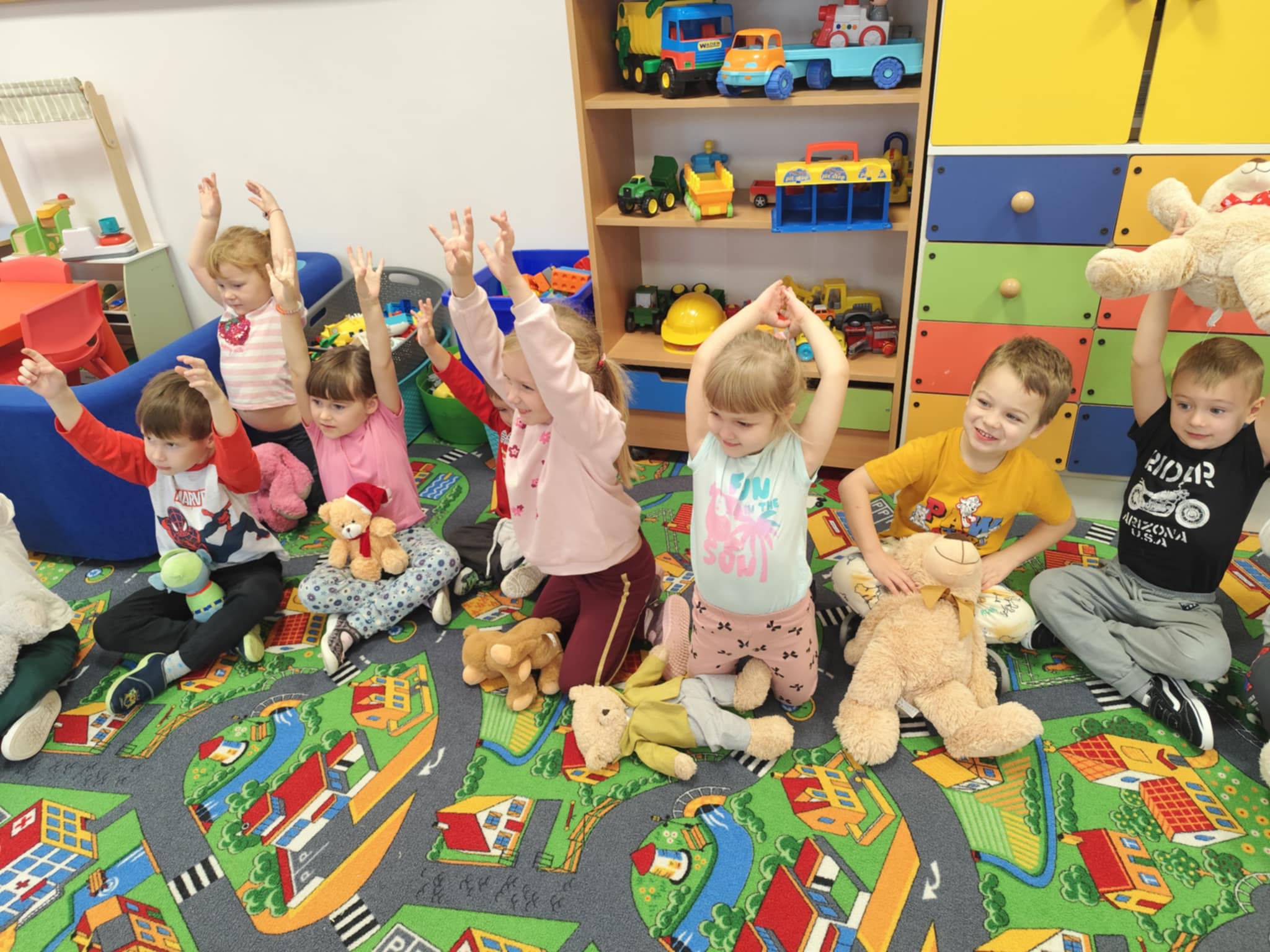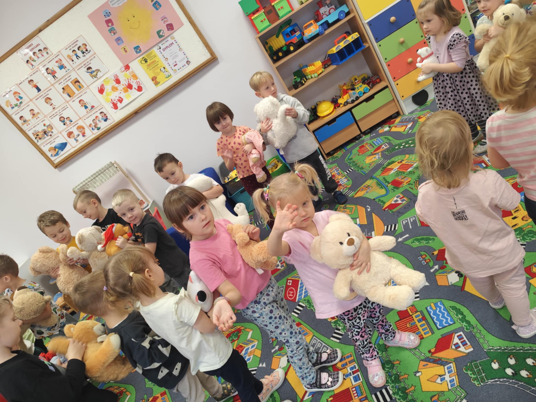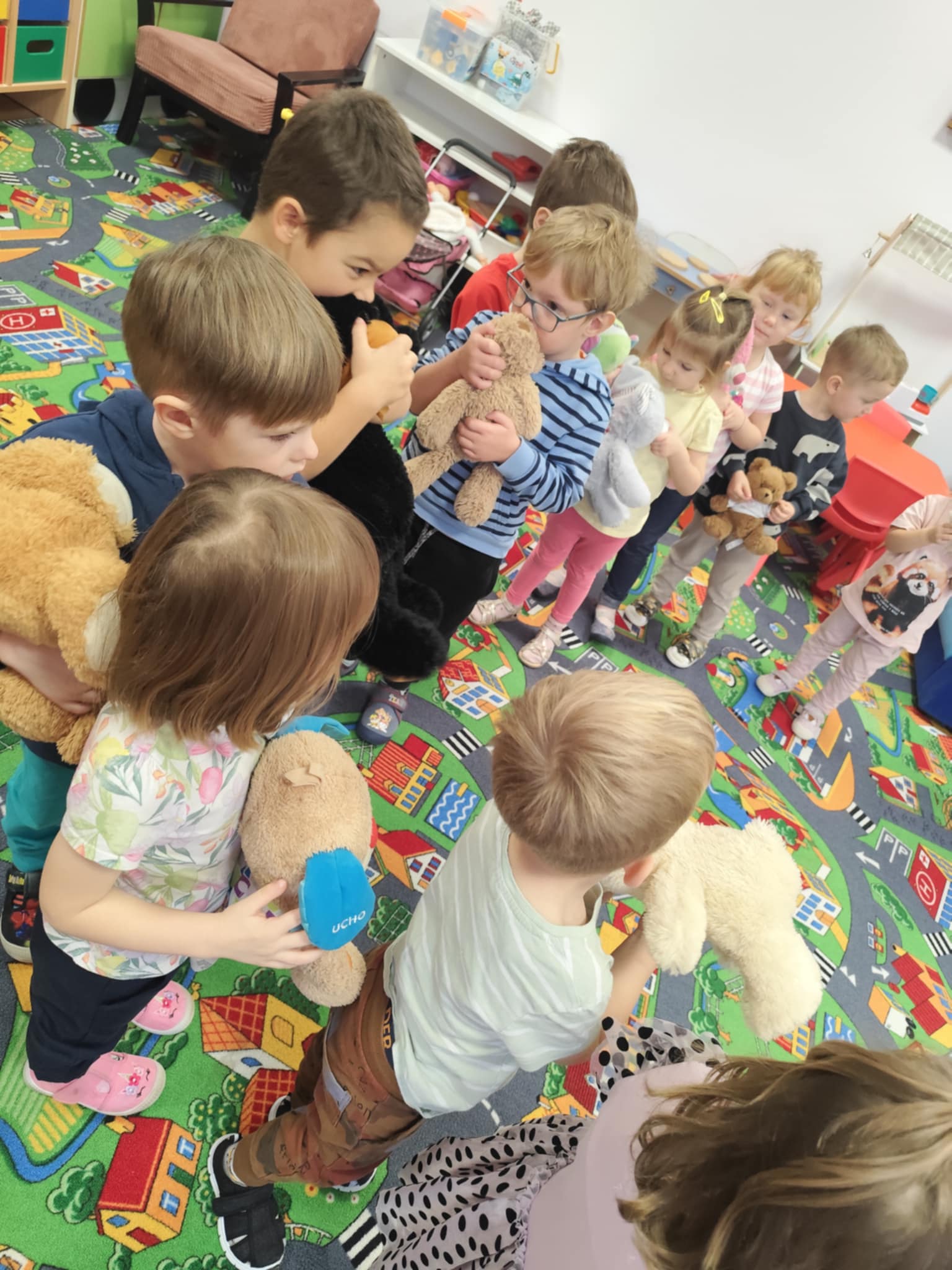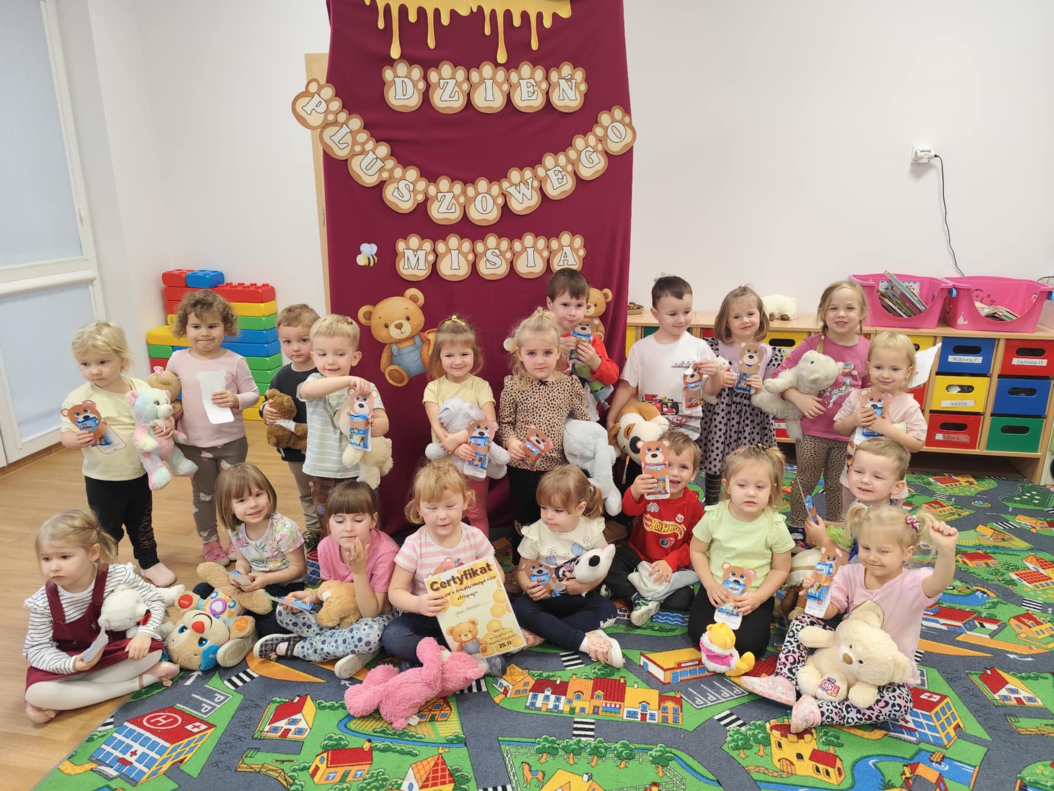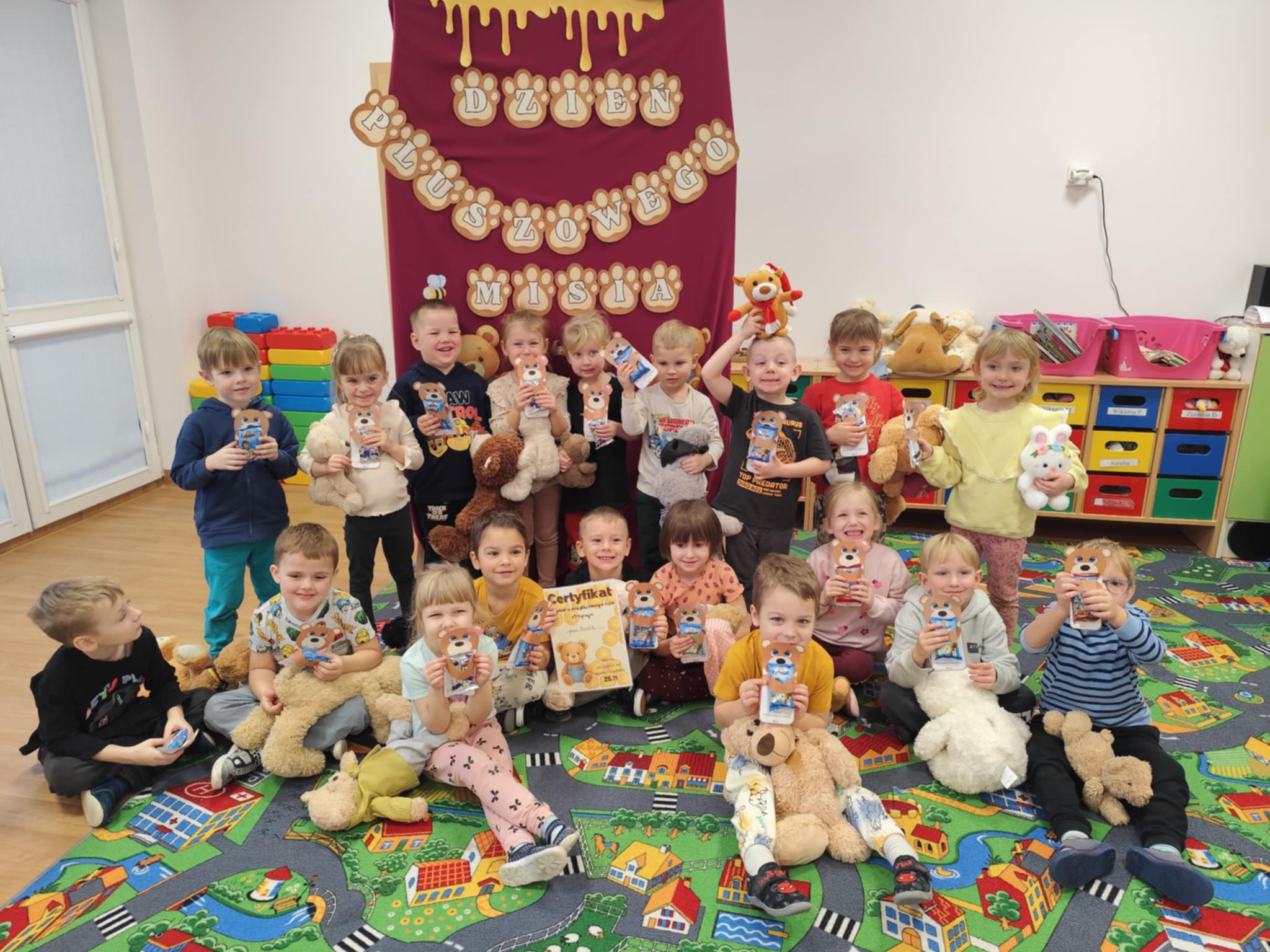 W naszym przedszkolu świętowaliśmy Dzień Pluszowego Misia. Dzieci przyniosły swoje ukochane pluszaki i wspólnie bawiły się przy misiowych piosenkach. Tańczyliśmy do utworu „Tańcz misiu, tańcz!”, zaglądaliśmy latarkami „co ma w brzuszku miś”, a także bawiliśmy się chustą animacyjną, pilnując, by żaden miś nie spadł podczas piosenki „Jadą jadą misie”. Nie zabrakło opowieści ruchowej, dopasowywania misiów do miodów oraz zabawy muzycznej z zadaniami: przytulaniem, machaniem łapką, podrzucaniem misia czy wykonywaniem podskoków. Na zakończenie dzieci otrzymały słodkie upominki, dyplomy oraz wykonały pamiątkowe zdjęcia w fotobudce. To był pełen radości, ciepła i uśmiechów dzień!