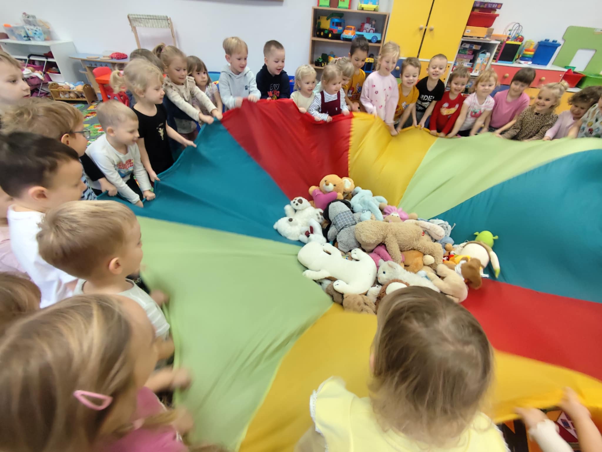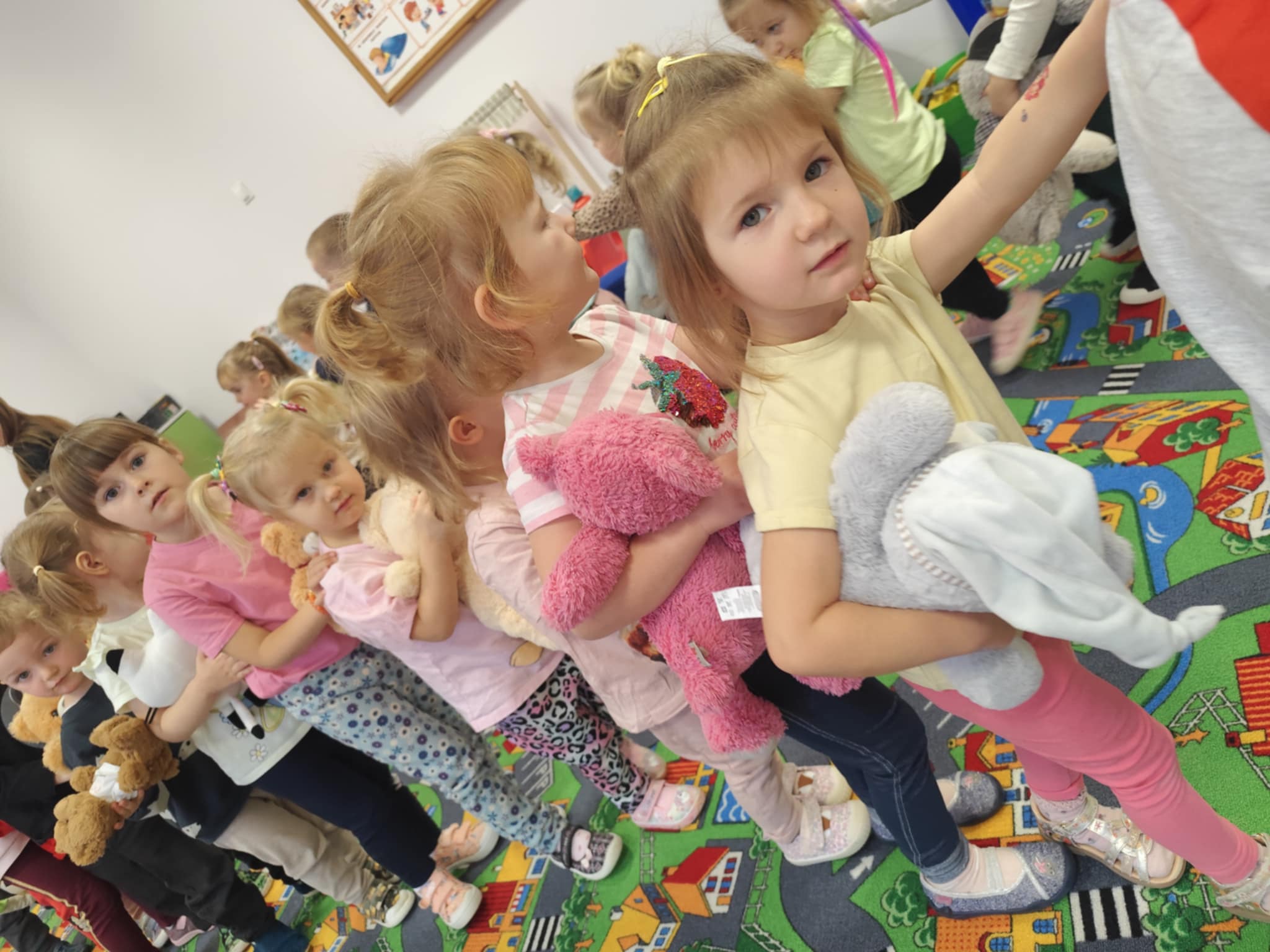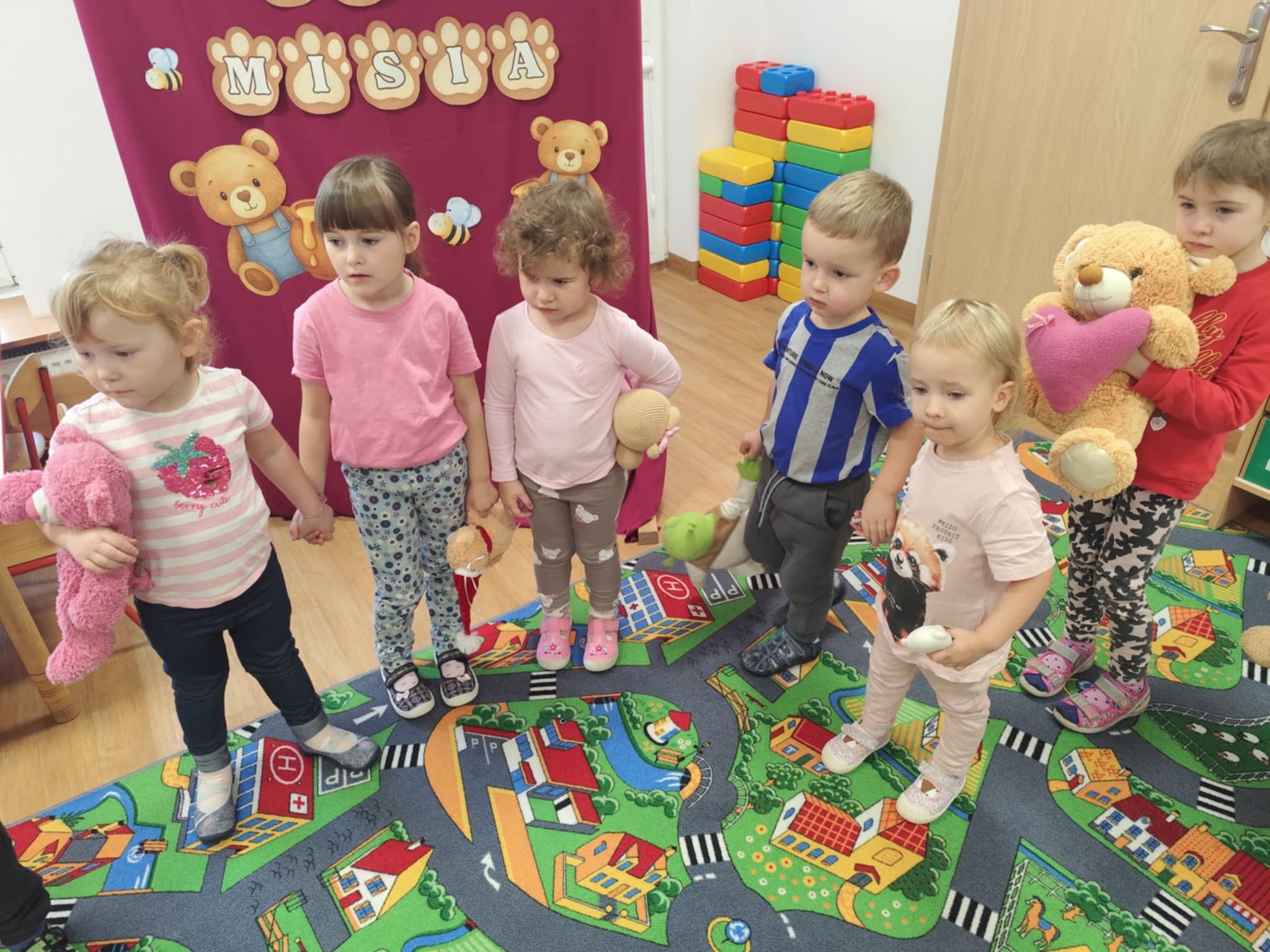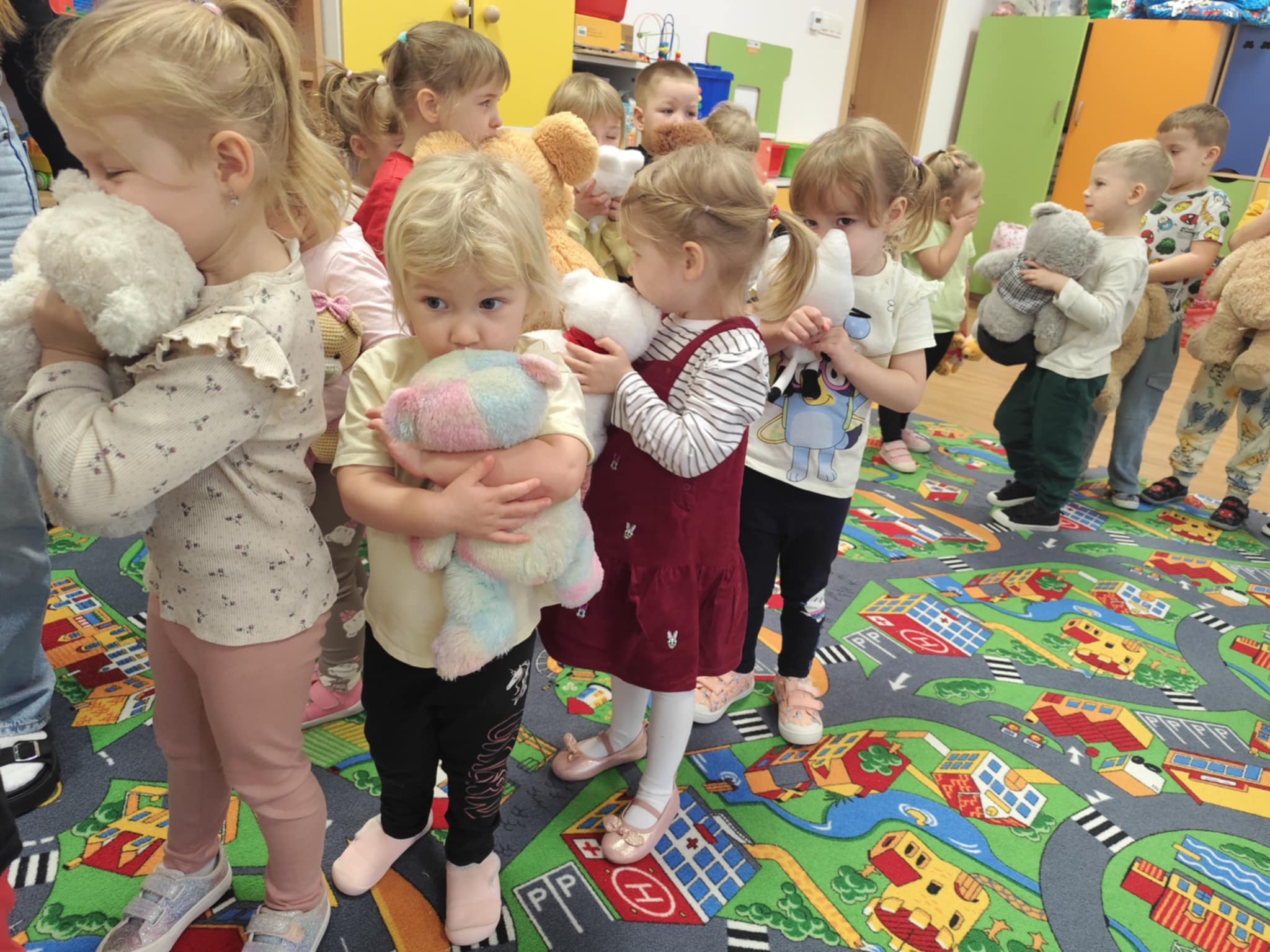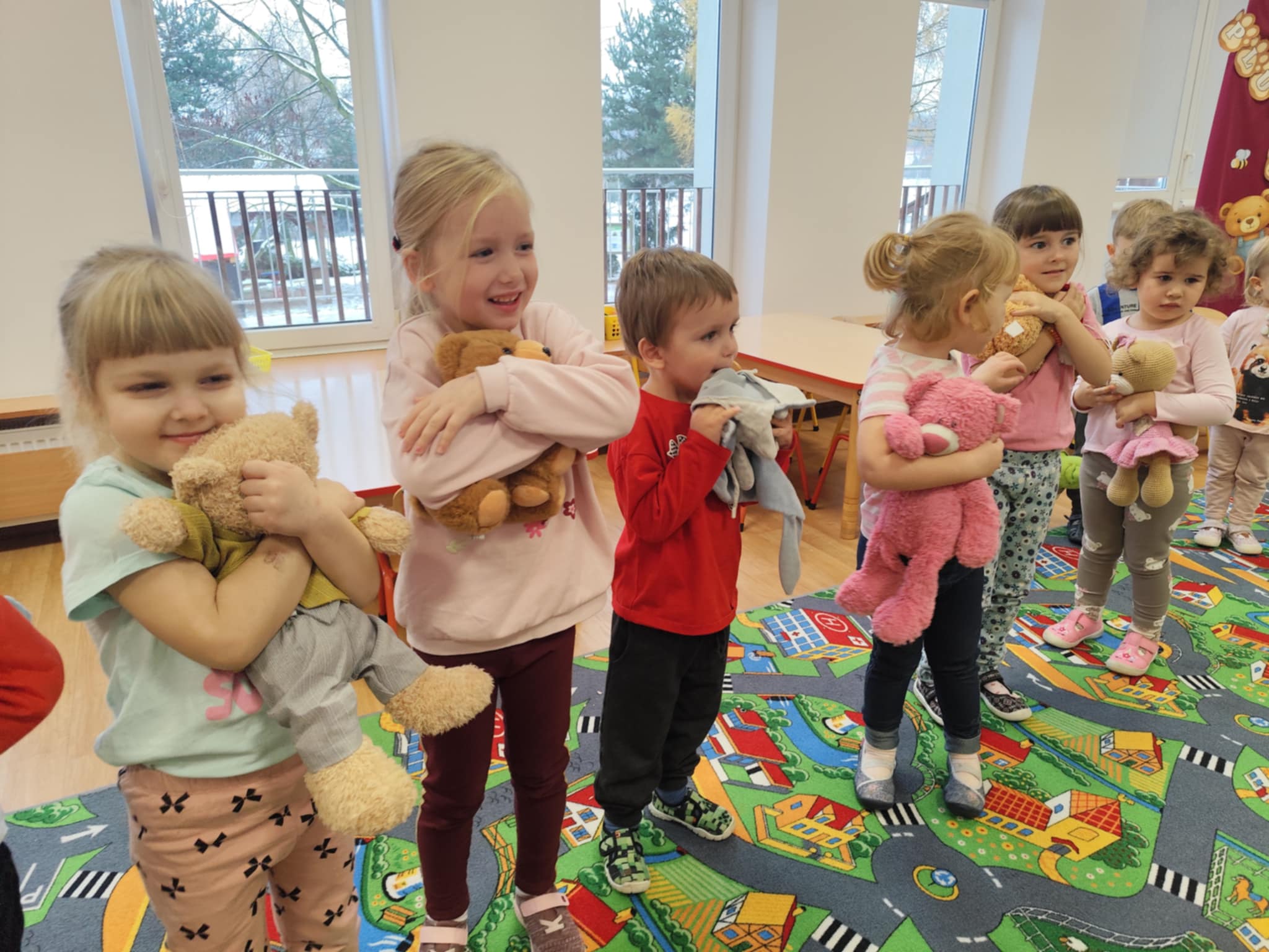 W naszym przedszkolu świętowaliśmy Dzień Pluszowego Misia. Dzieci przyniosły swoje ukochane pluszaki i wspólnie bawiły się przy misiowych piosenkach. Tańczyliśmy do utworu „Tańcz misiu, tańcz!”, zaglądaliśmy latarkami „co ma w brzuszku miś”, a także bawiliśmy się chustą animacyjną, pilnując, by żaden miś nie spadł podczas piosenki „Jadą jadą misie”. Nie zabrakło opowieści ruchowej, dopasowywania misiów do miodów oraz zabawy muzycznej z zadaniami: przytulaniem, machaniem łapką, podrzucaniem misia czy wykonywaniem podskoków. Na zakończenie dzieci otrzymały słodkie upominki, dyplomy oraz wykonały pamiątkowe zdjęcia w fotobudce. To był pełen radości, ciepła i uśmiechów dzień!