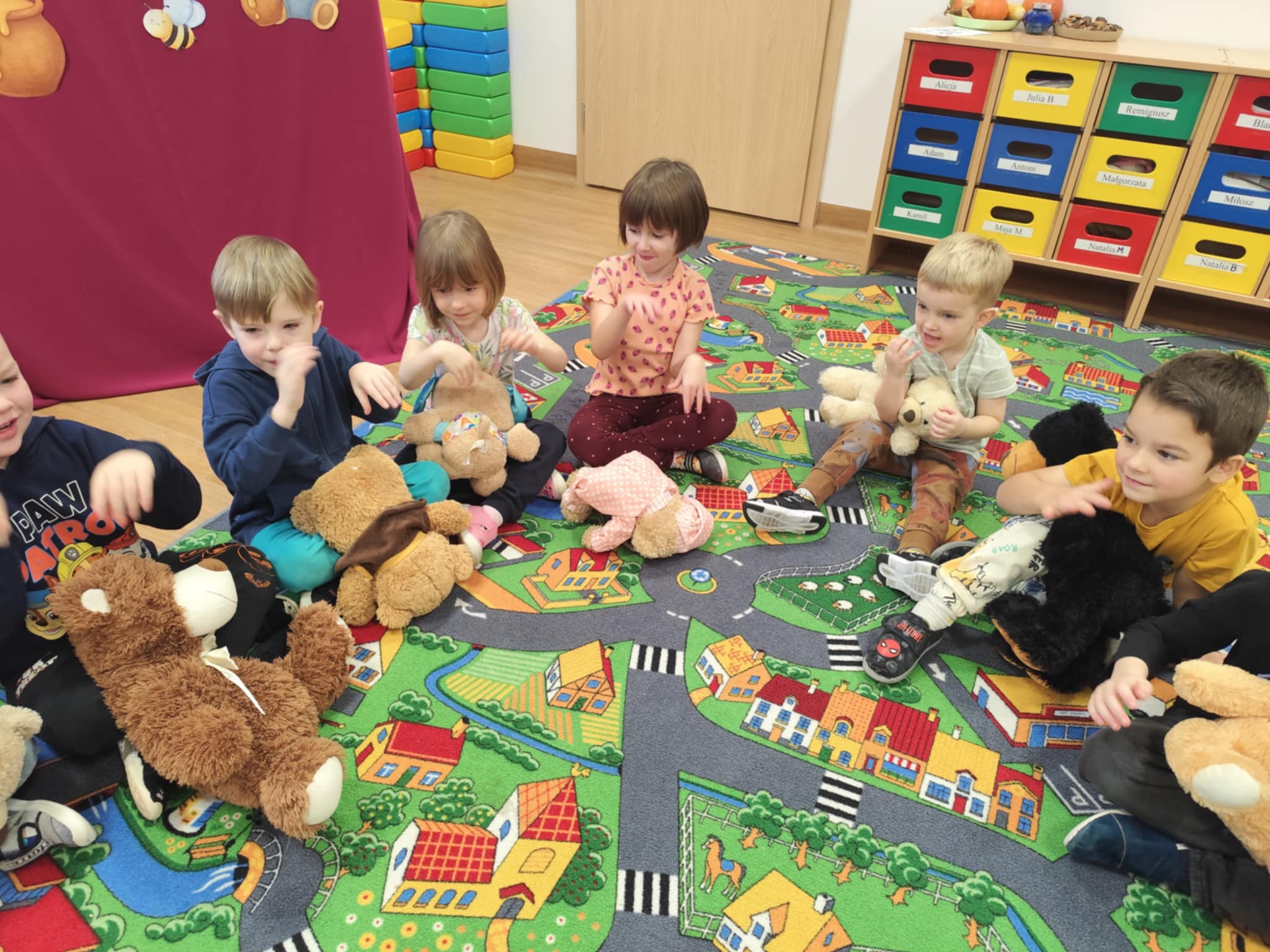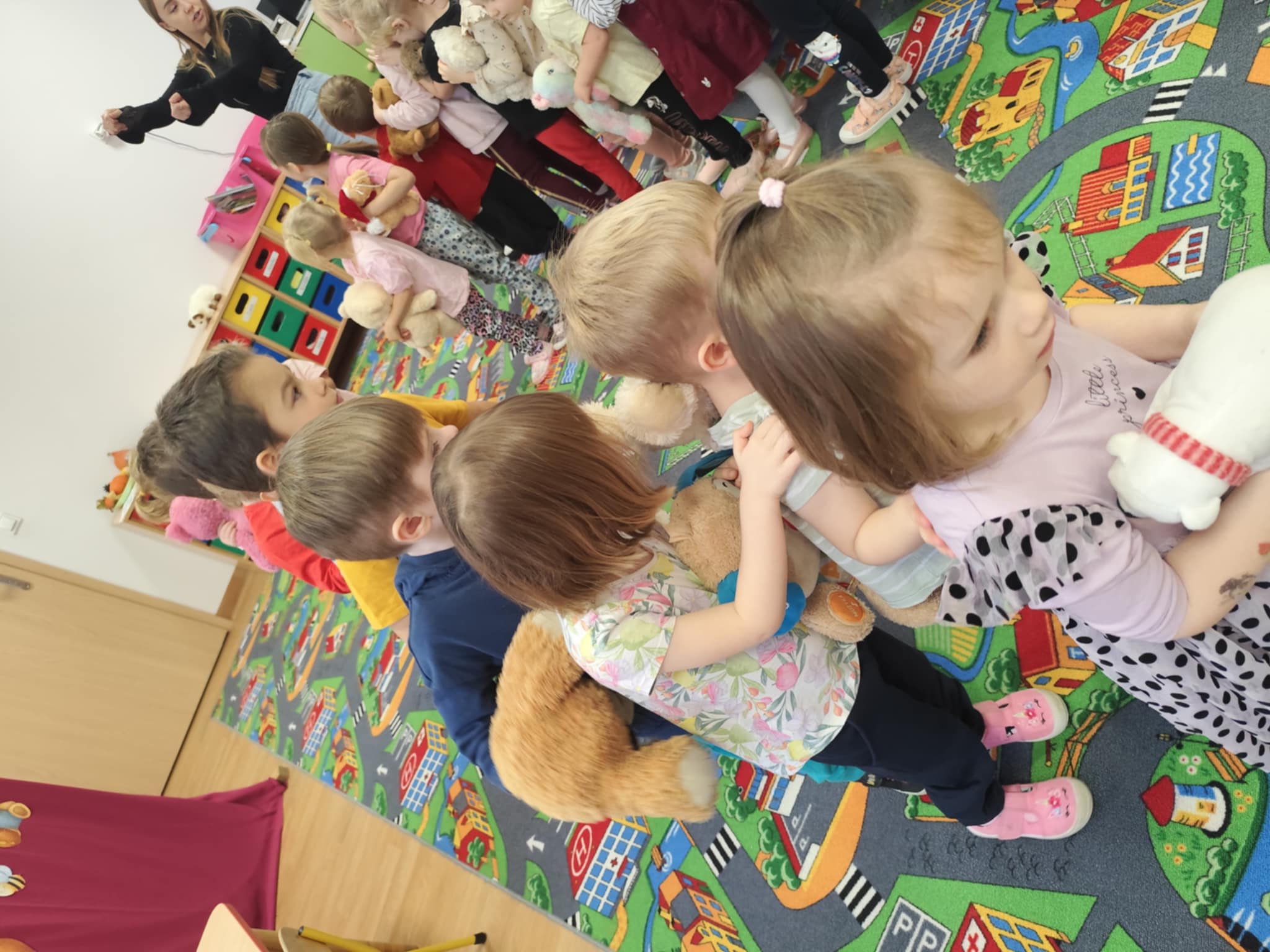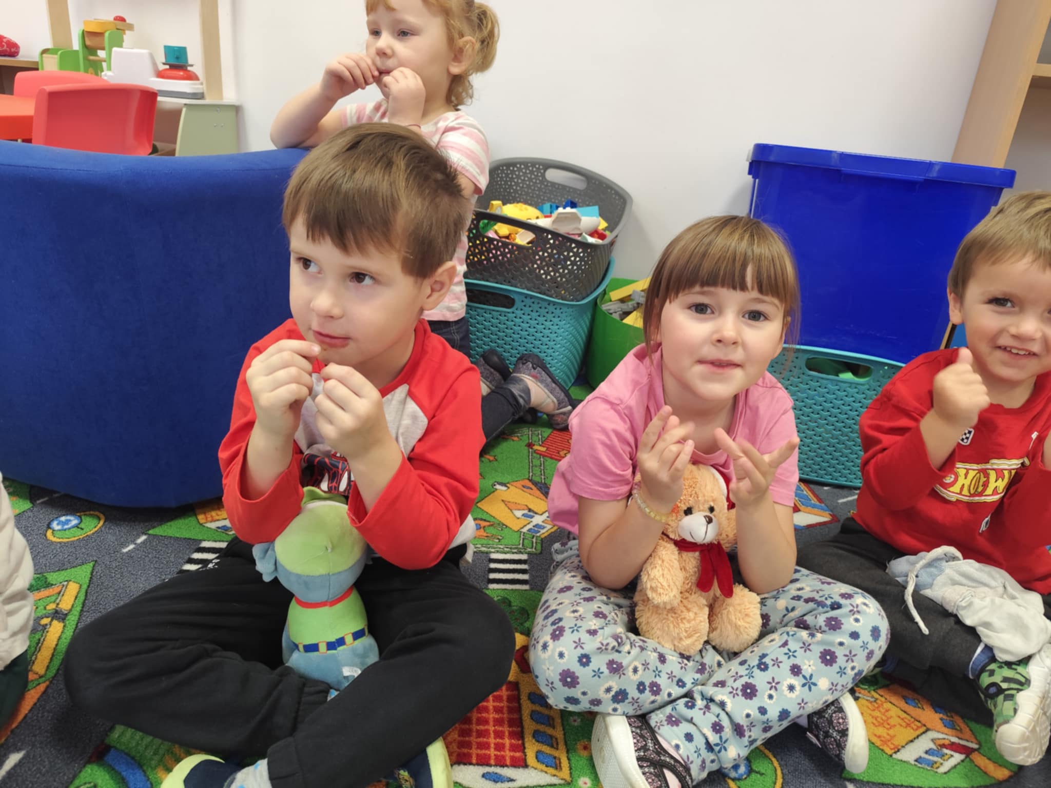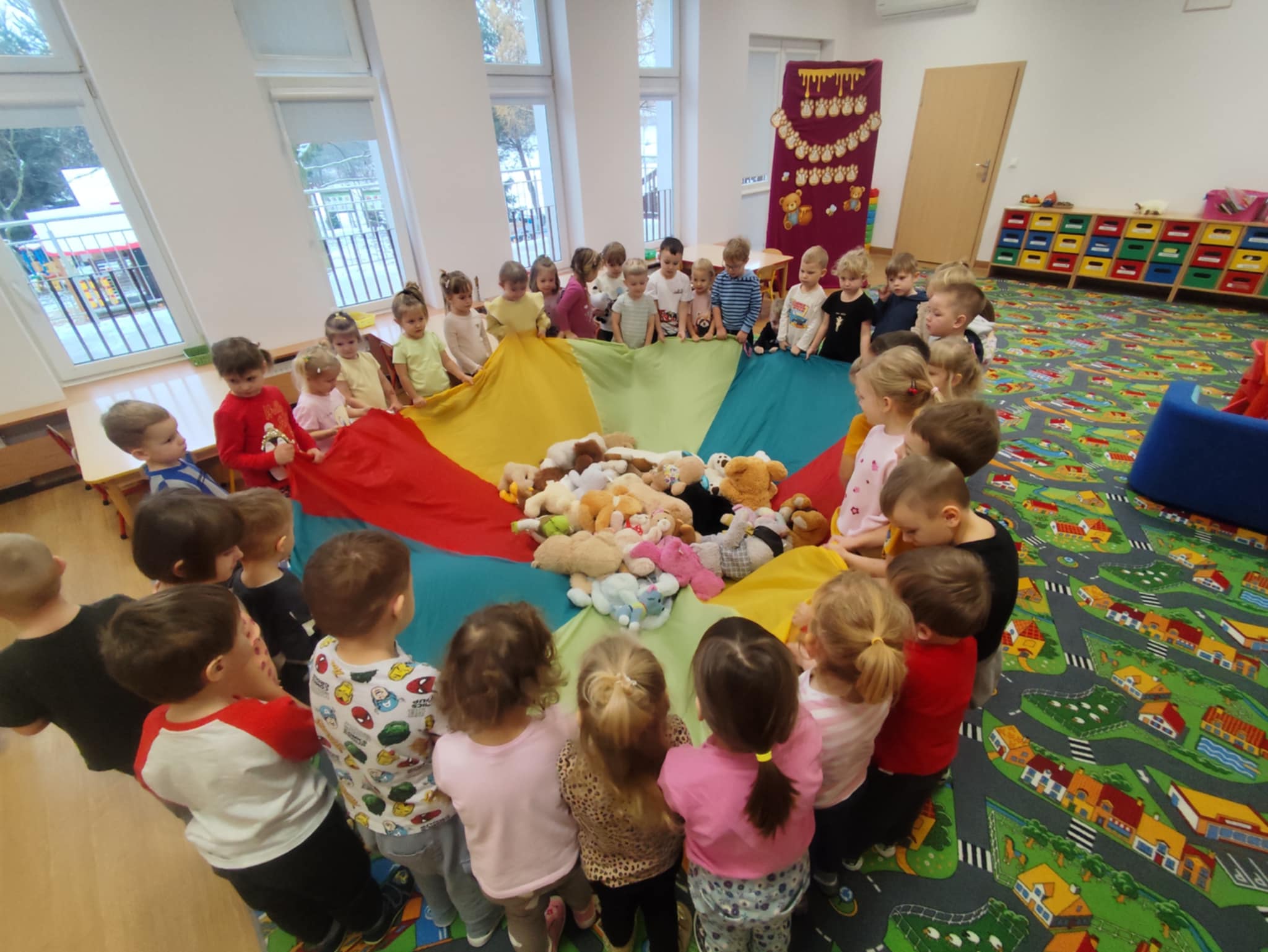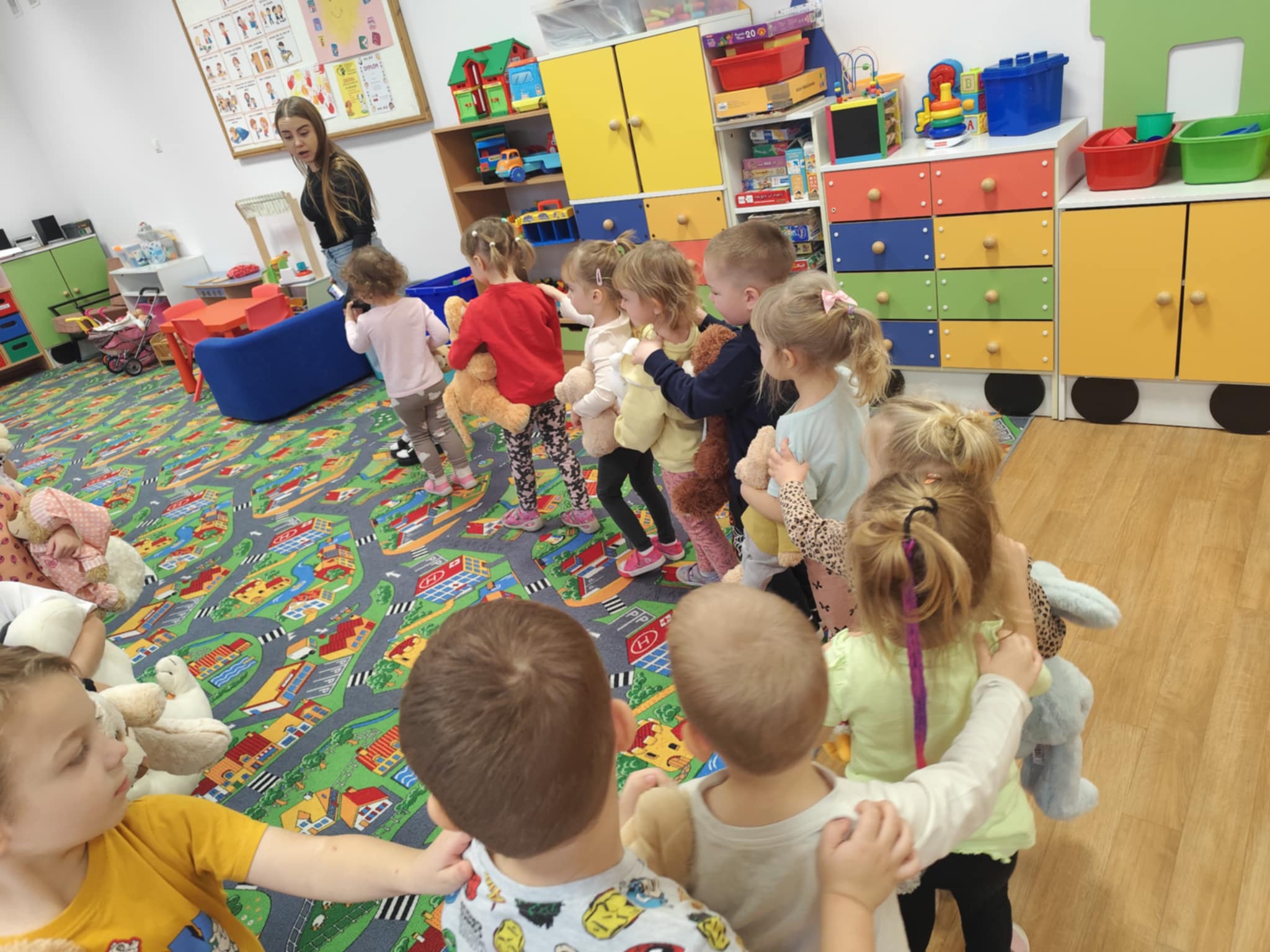W naszym przedszkolu świętowaliśmy Dzień Pluszowego Misia. Dzieci przyniosły swoje ukochane pluszaki i wspólnie bawiły się przy misiowych piosenkach. Tańczyliśmy do utworu „Tańcz misiu, tańcz!”, zaglądaliśmy latarkami „co ma w brzuszku miś”, a także bawiliśmy się chustą animacyjną, pilnując, by żaden miś nie spadł podczas piosenki „Jadą jadą misie”. Nie zabrakło opowieści ruchowej, dopasowywania misiów do miodów oraz zabawy muzycznej z zadaniami: przytulaniem, machaniem łapką, podrzucaniem misia czy wykonywaniem podskoków. Na zakończenie dzieci otrzymały słodkie upominki, dyplomy oraz wykonały pamiątkowe zdjęcia w fotobudce. To był pełen radości, ciepła i uśmiechów dzień!