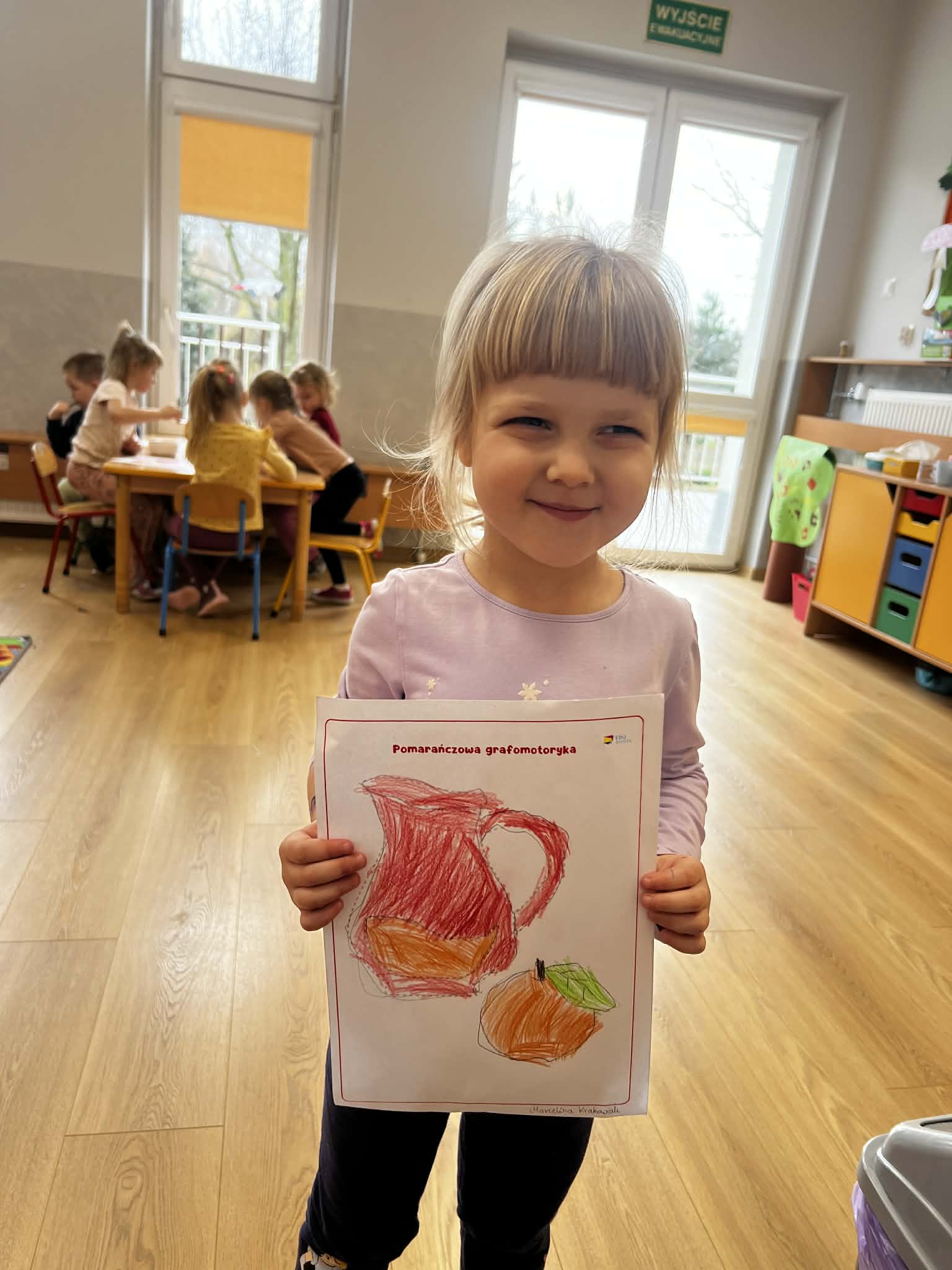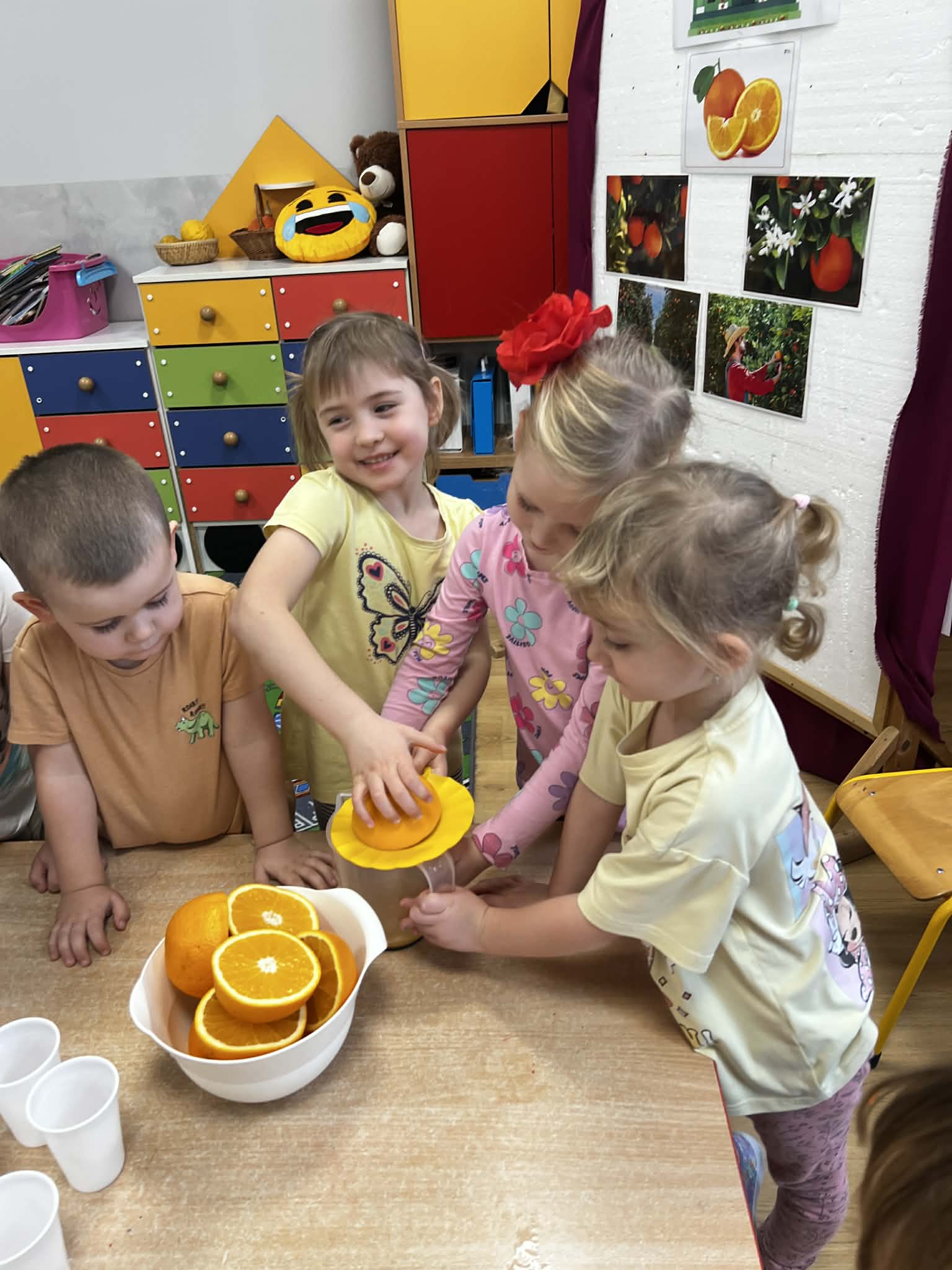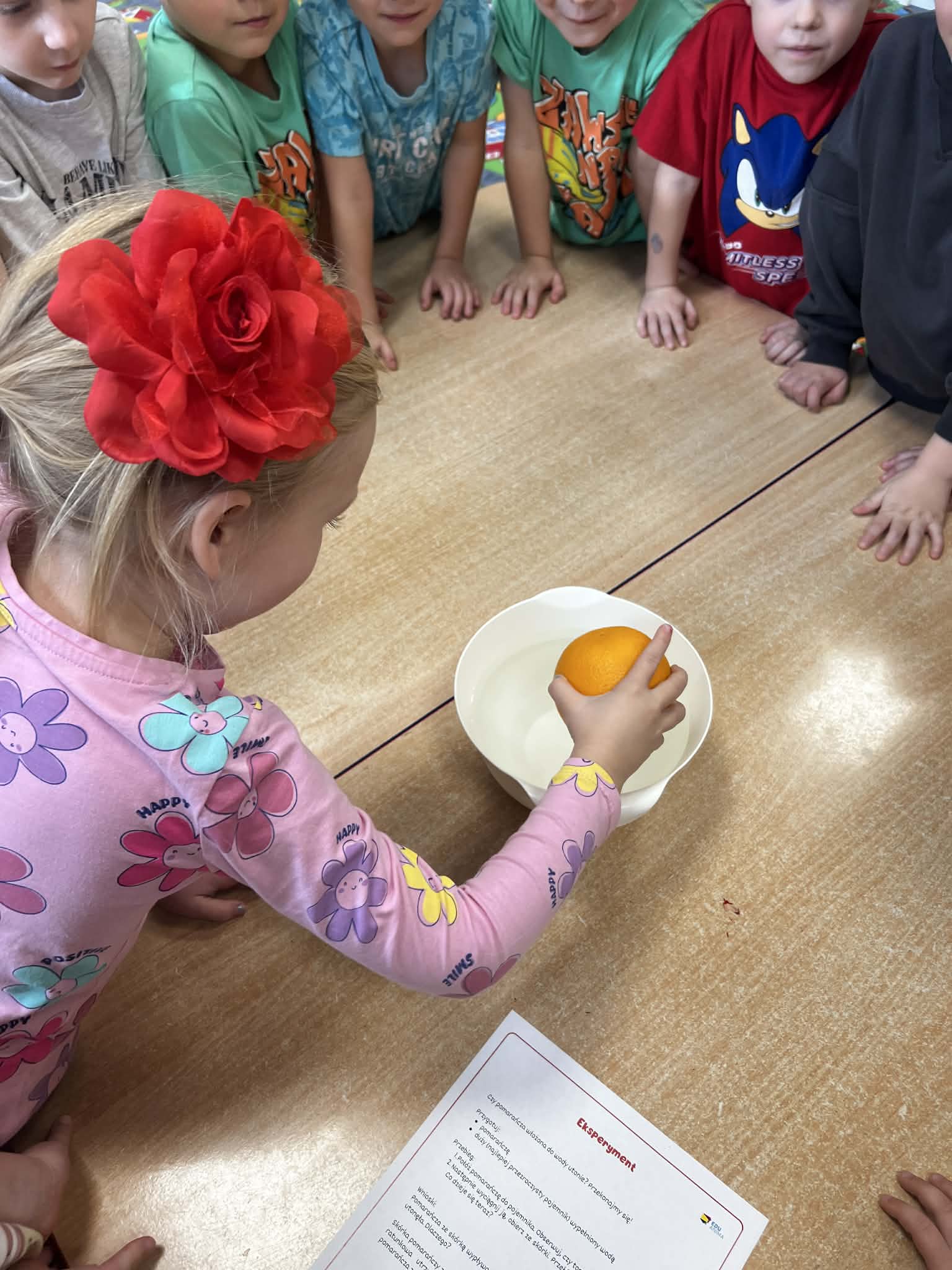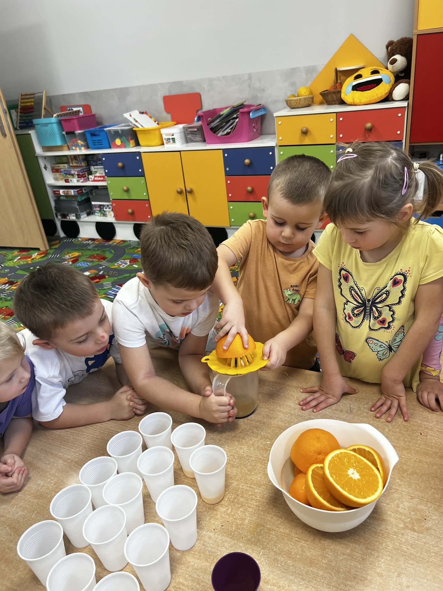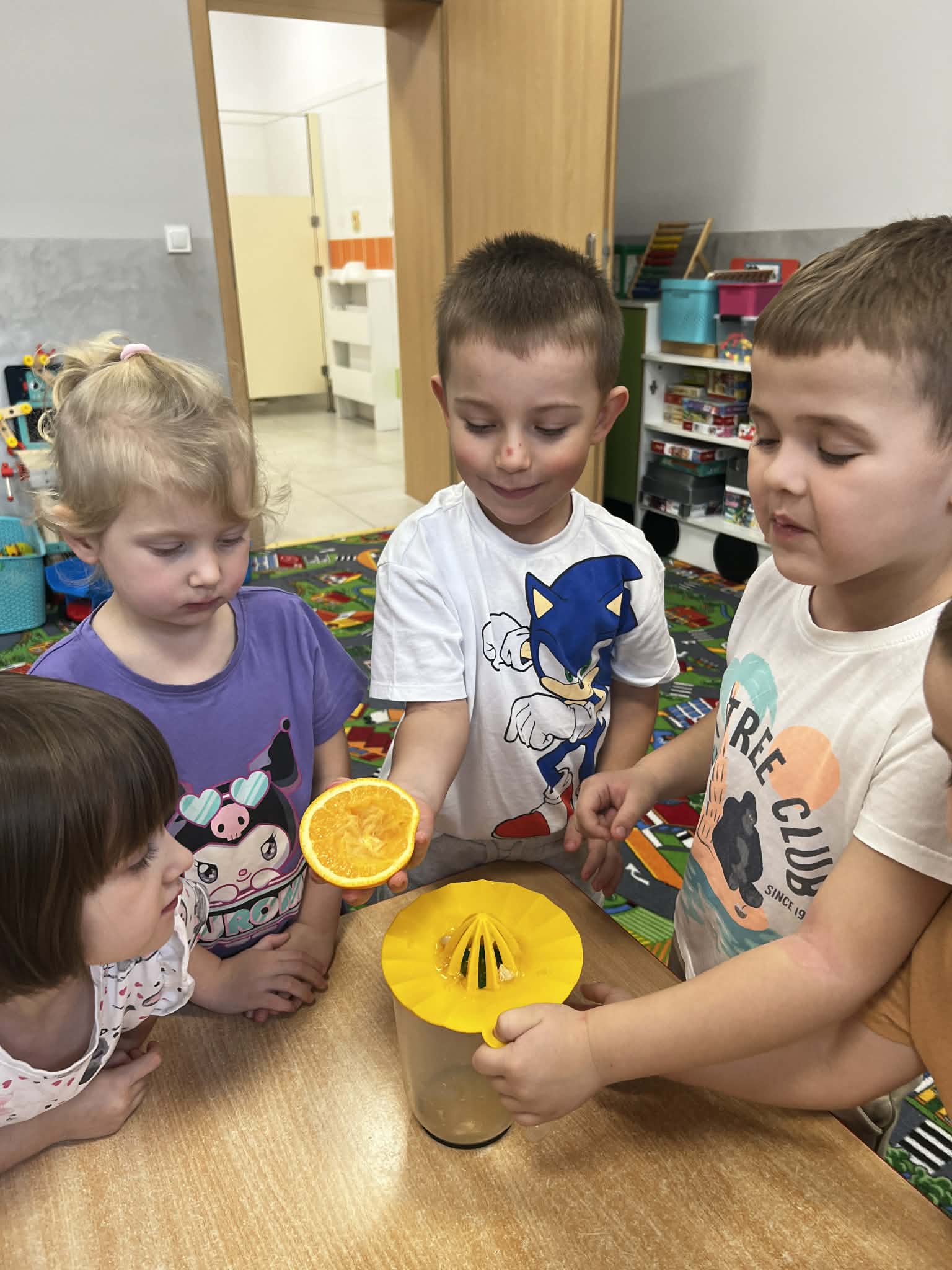 Podczas kolejnych zajęć w ramach projektu „Na tropie zdrowego odżywiania 2” dzieci wyruszyły na pomarańczowy trop. Poznały wygląd i sposób uprawy pomarańczy, a także mogły sprawdzić jej zapach, smak oraz strukturę skórki. Wysłuchały opowiadania „Energetyczna pomarańcza” Karoliny Machoń, po którym odbyła się wspólna rozmowa pełna dziecięcych spostrzeżeń. Przedszkolaki wykonały również pracę plastyczno-grafomotoryczną „Pomarańczowa grafomotoryka”, ćwicząc rysowanie po śladzie. Nie zabrakło też ruchu – dzieci tańczyły do piosenki „Pomarańcza” z pomarańczowymi balonami, co wywołało wiele radości. Dużym zainteresowaniem cieszył się eksperyment „Czy pomarańcza włożona do wody tonie?”, dzięki któremu dzieci mogły obserwować, jak zachowuje się owoc w zależności od tego, czy ma skórkę. Na zakończenie zajęć przedszkolaki wspólnie wyciskały sok pomarańczowy i próbowały jego świeżego, naturalnego smaku. To był dzień pełen zapachu, kolorów i zdrowych odkryć!