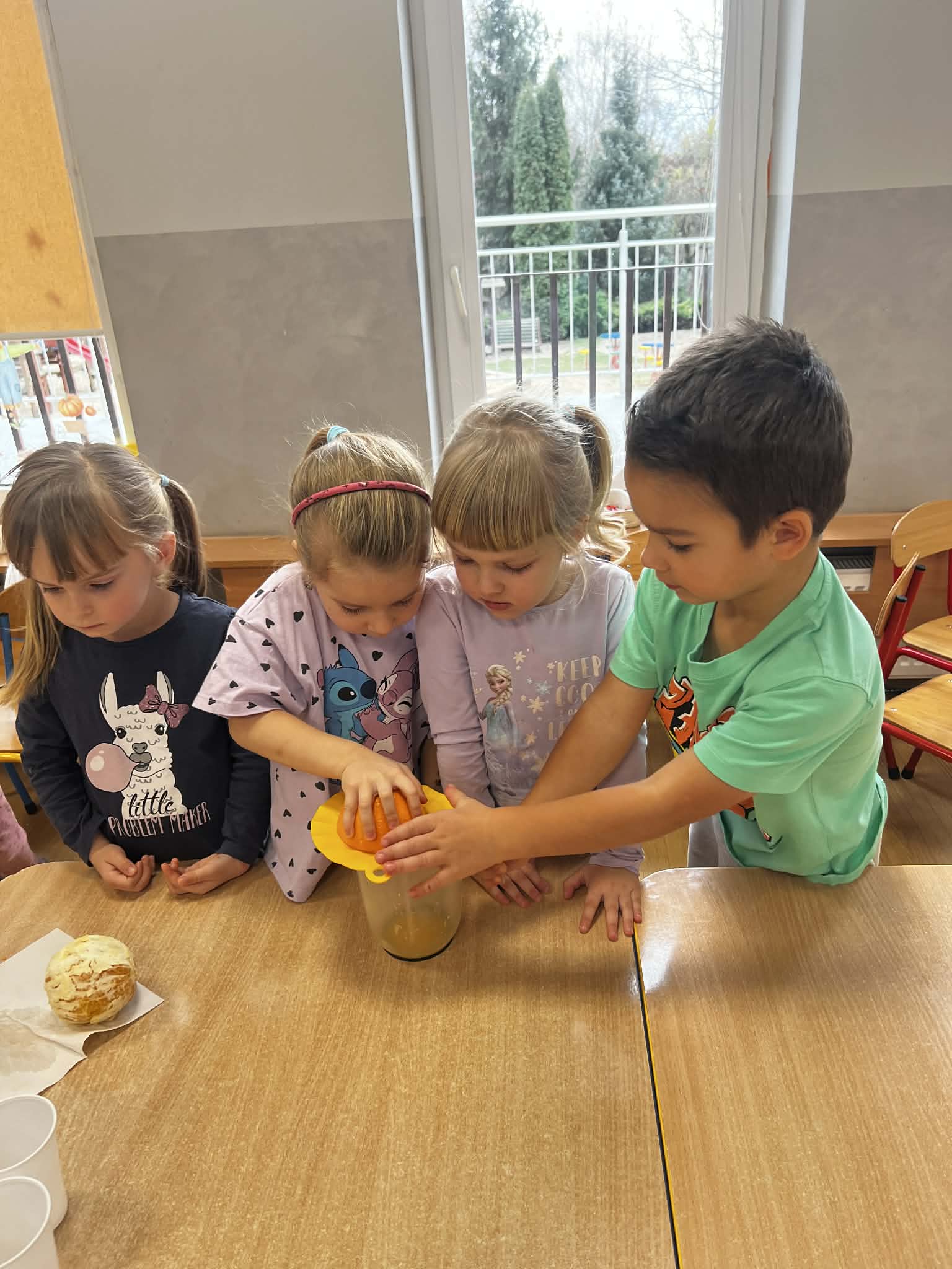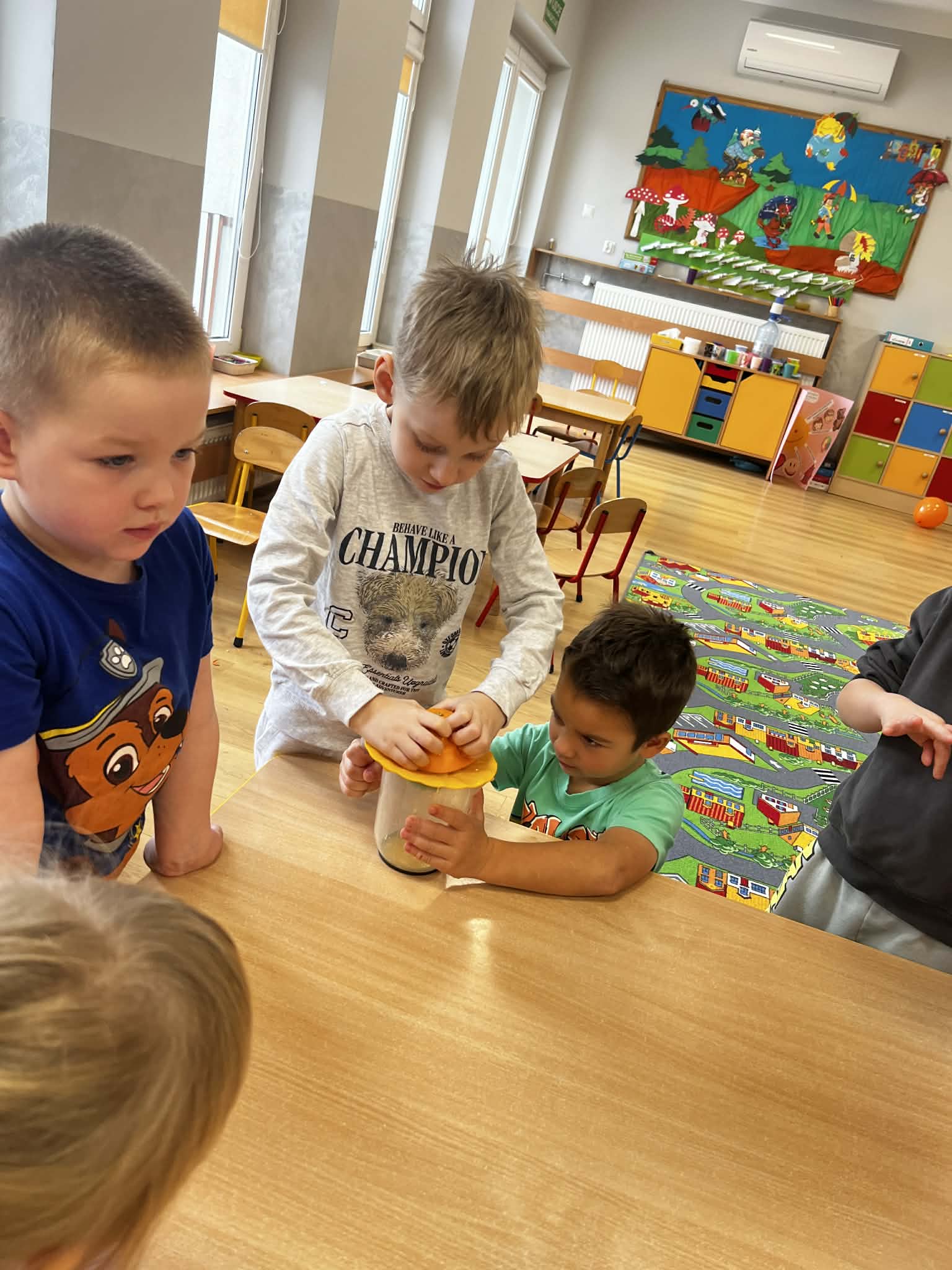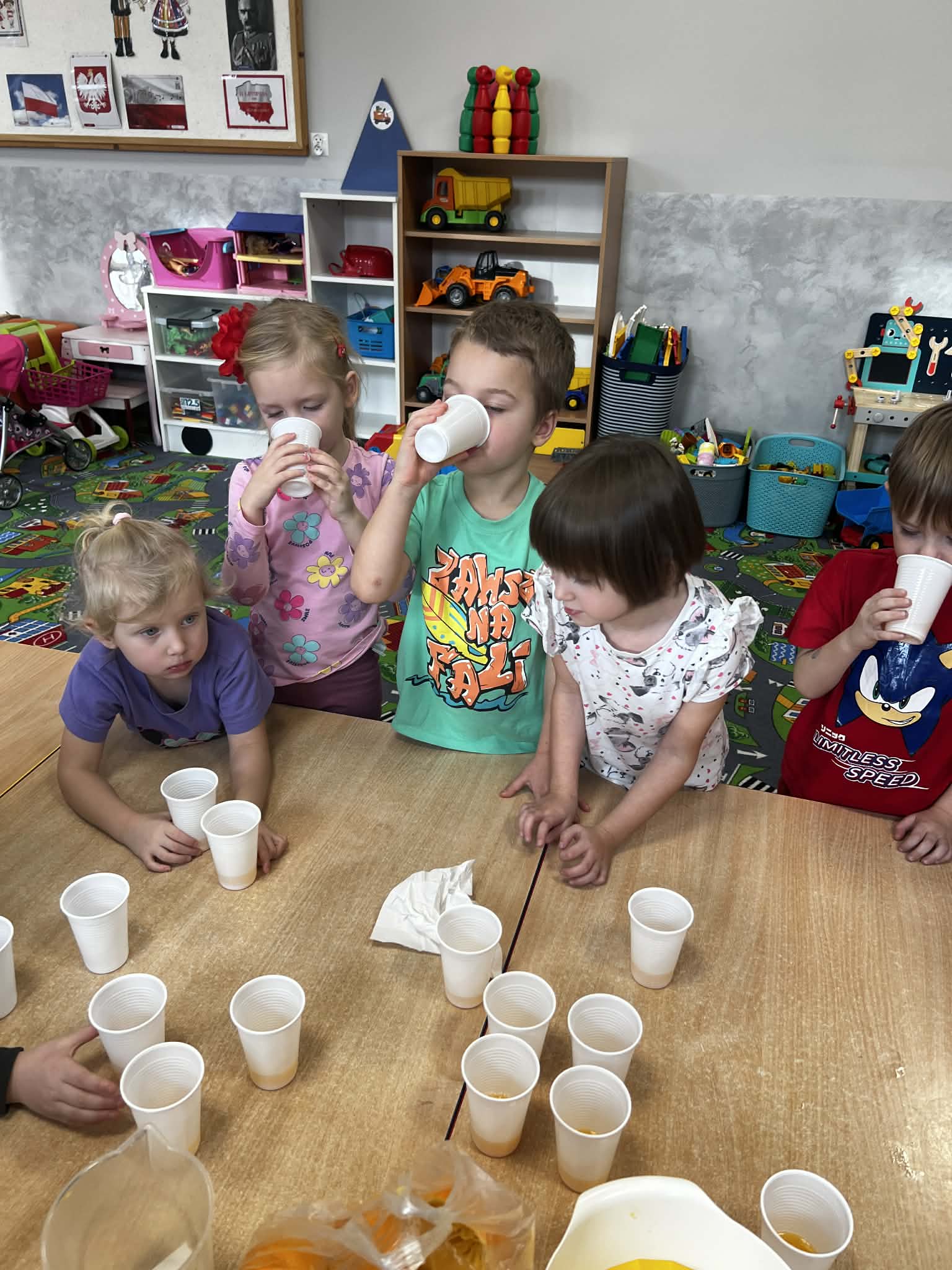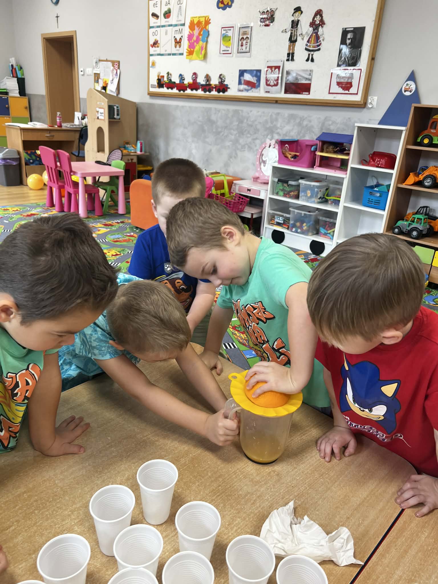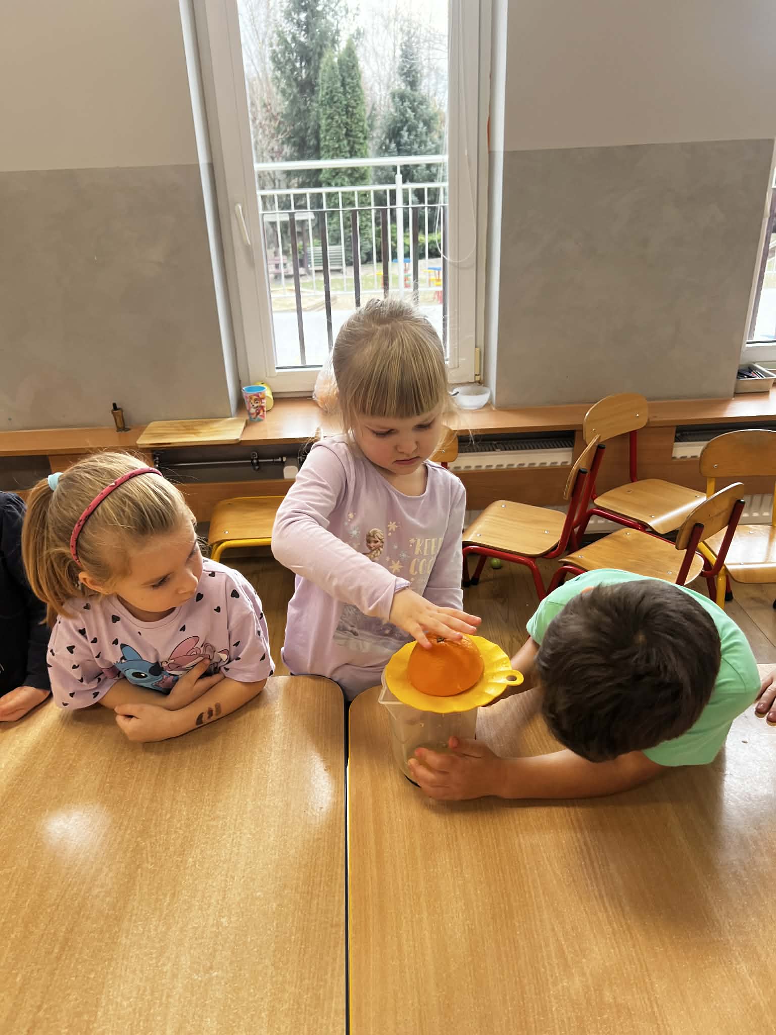 Podczas kolejnych zajęć w ramach projektu „Na tropie zdrowego odżywiania 2” dzieci wyruszyły na pomarańczowy trop. Poznały wygląd i sposób uprawy pomarańczy, a także mogły sprawdzić jej zapach, smak oraz strukturę skórki. Wysłuchały opowiadania „Energetyczna pomarańcza” Karoliny Machoń, po którym odbyła się wspólna rozmowa pełna dziecięcych spostrzeżeń. Przedszkolaki wykonały również pracę plastyczno-grafomotoryczną „Pomarańczowa grafomotoryka”, ćwicząc rysowanie po śladzie. Nie zabrakło też ruchu – dzieci tańczyły do piosenki „Pomarańcza” z pomarańczowymi balonami, co wywołało wiele radości. Dużym zainteresowaniem cieszył się eksperyment „Czy pomarańcza włożona do wody tonie?”, dzięki któremu dzieci mogły obserwować, jak zachowuje się owoc w zależności od tego, czy ma skórkę. Na zakończenie zajęć przedszkolaki wspólnie wyciskały sok pomarańczowy i próbowały jego świeżego, naturalnego smaku. To był dzień pełen zapachu, kolorów i zdrowych odkryć!