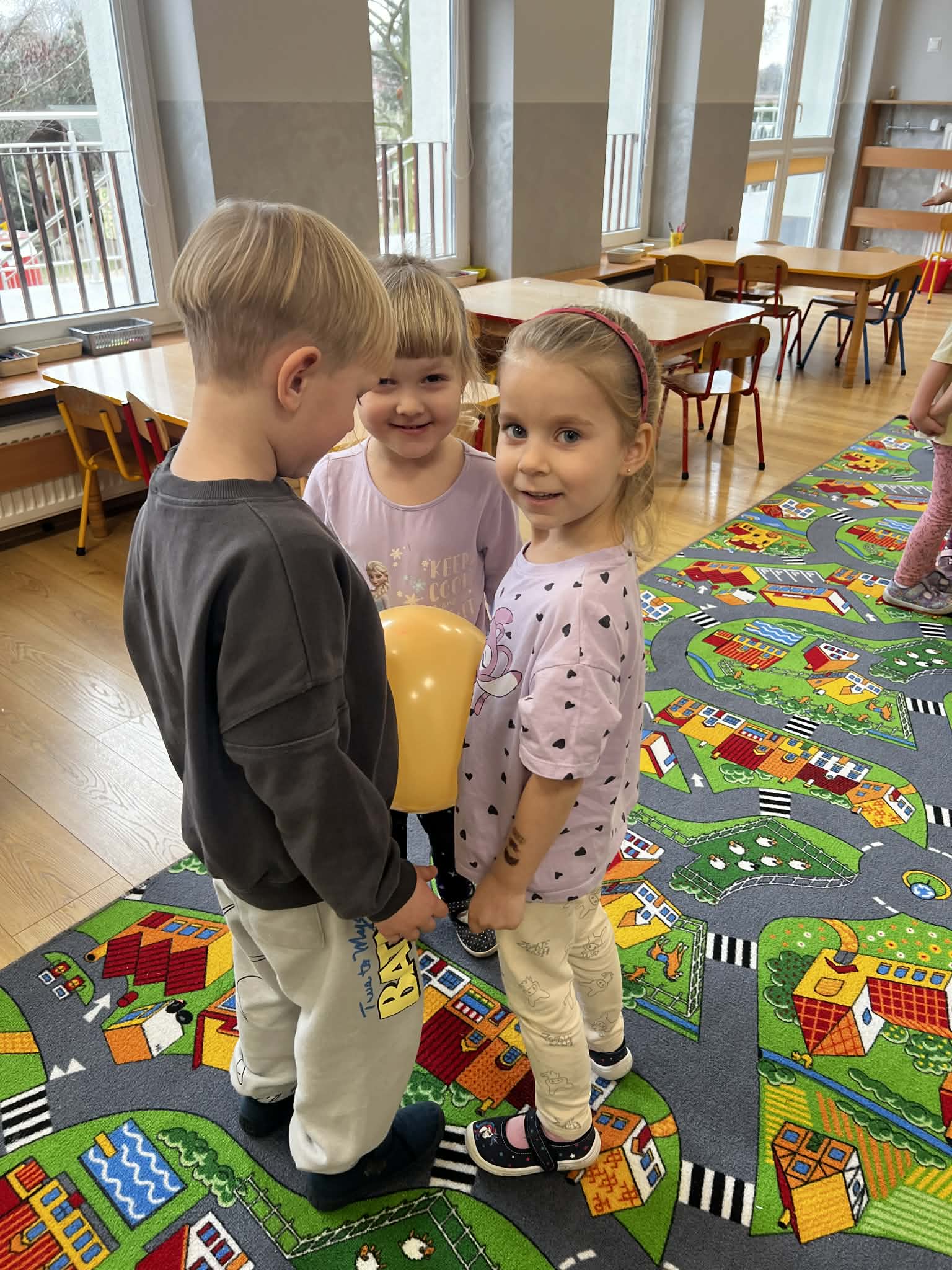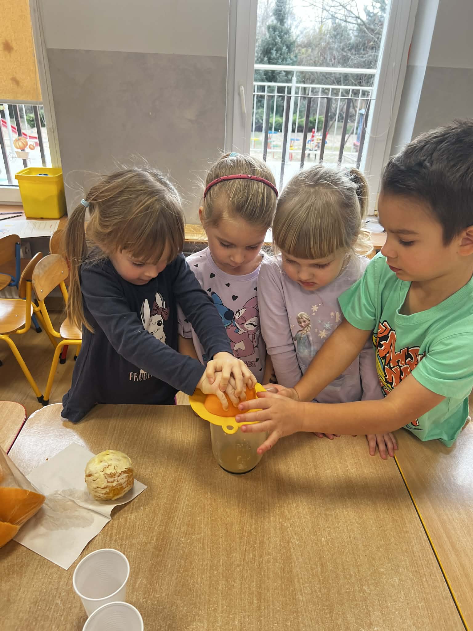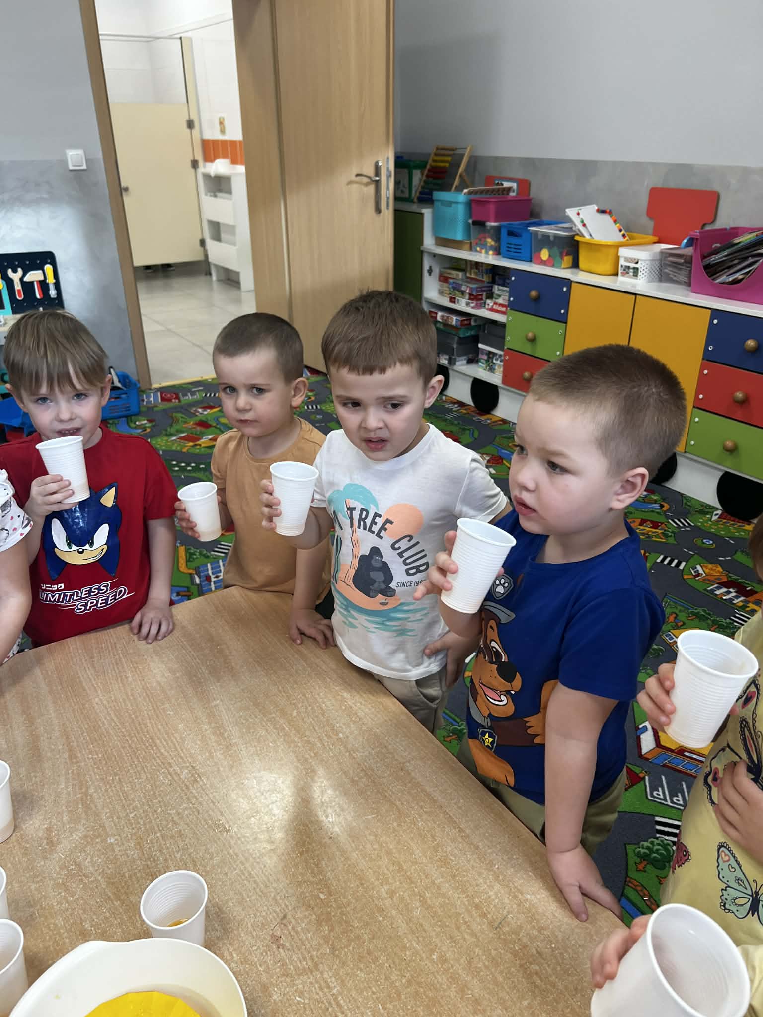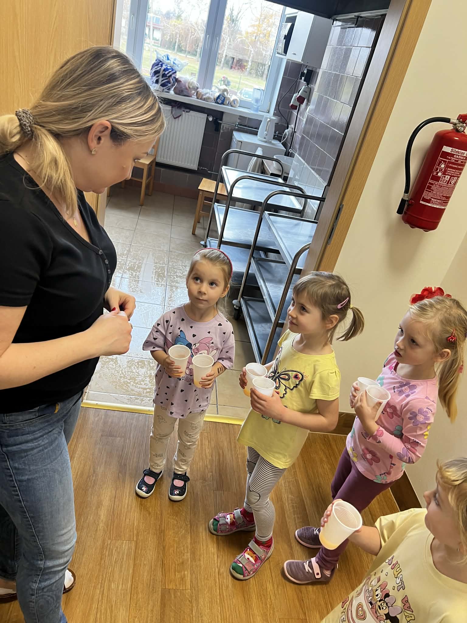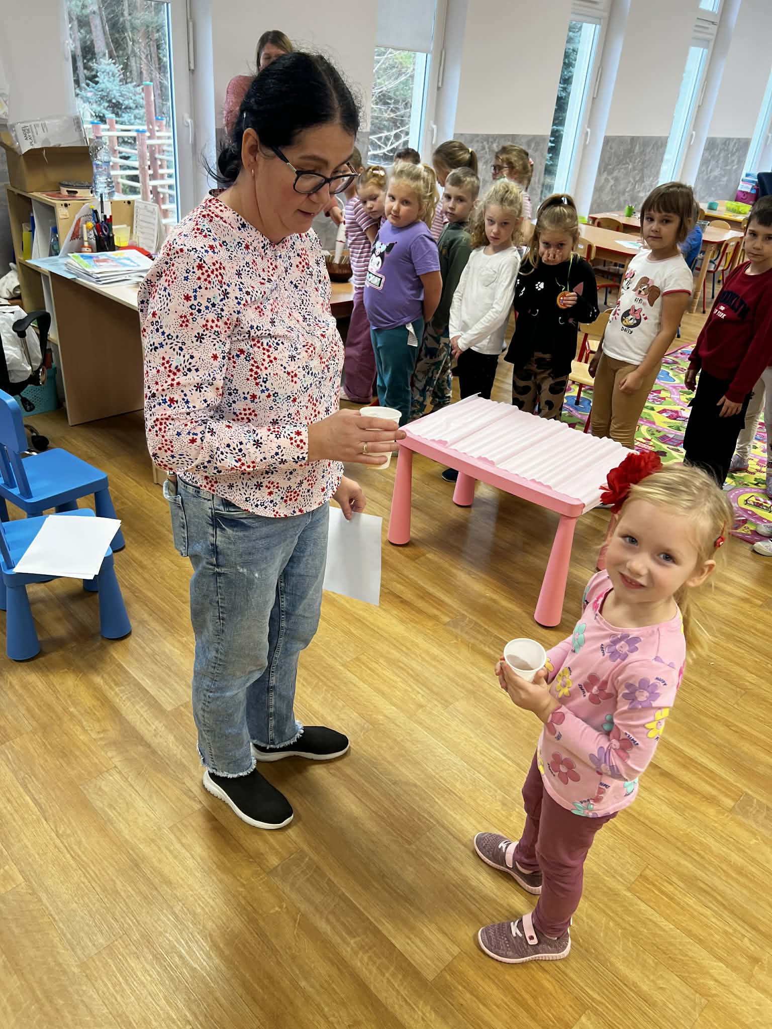 Podczas kolejnych zajęć w ramach projektu „Na tropie zdrowego odżywiania 2” dzieci wyruszyły na pomarańczowy trop. Poznały wygląd i sposób uprawy pomarańczy, a także mogły sprawdzić jej zapach, smak oraz strukturę skórki. Wysłuchały opowiadania „Energetyczna pomarańcza” Karoliny Machoń, po którym odbyła się wspólna rozmowa pełna dziecięcych spostrzeżeń. Przedszkolaki wykonały również pracę plastyczno-grafomotoryczną „Pomarańczowa grafomotoryka”, ćwicząc rysowanie po śladzie. Nie zabrakło też ruchu – dzieci tańczyły do piosenki „Pomarańcza” z pomarańczowymi balonami, co wywołało wiele radości. Dużym zainteresowaniem cieszył się eksperyment „Czy pomarańcza włożona do wody tonie?”, dzięki któremu dzieci mogły obserwować, jak zachowuje się owoc w zależności od tego, czy ma skórkę. Na zakończenie zajęć przedszkolaki wspólnie wyciskały sok pomarańczowy i próbowały jego świeżego, naturalnego smaku. To był dzień pełen zapachu, kolorów i zdrowych odkryć!