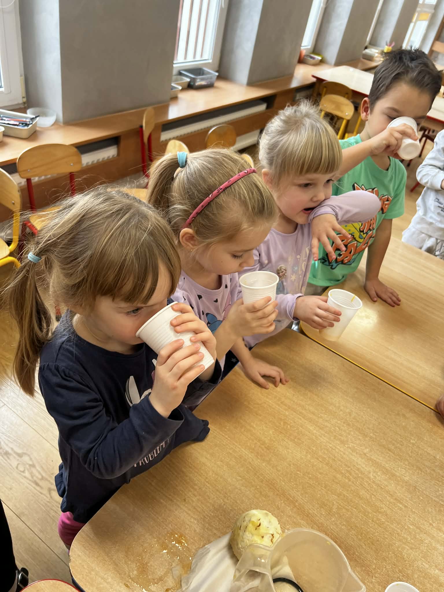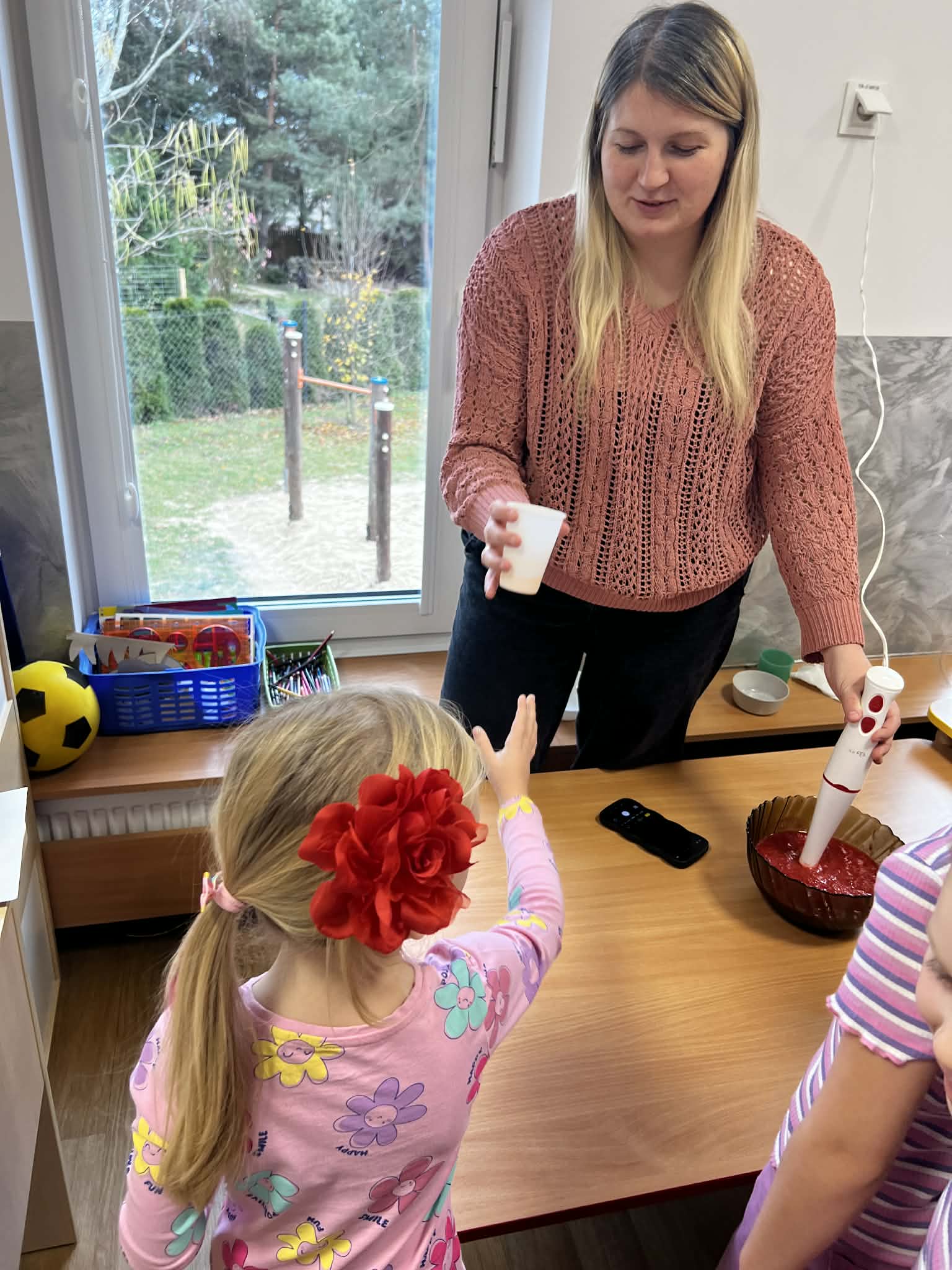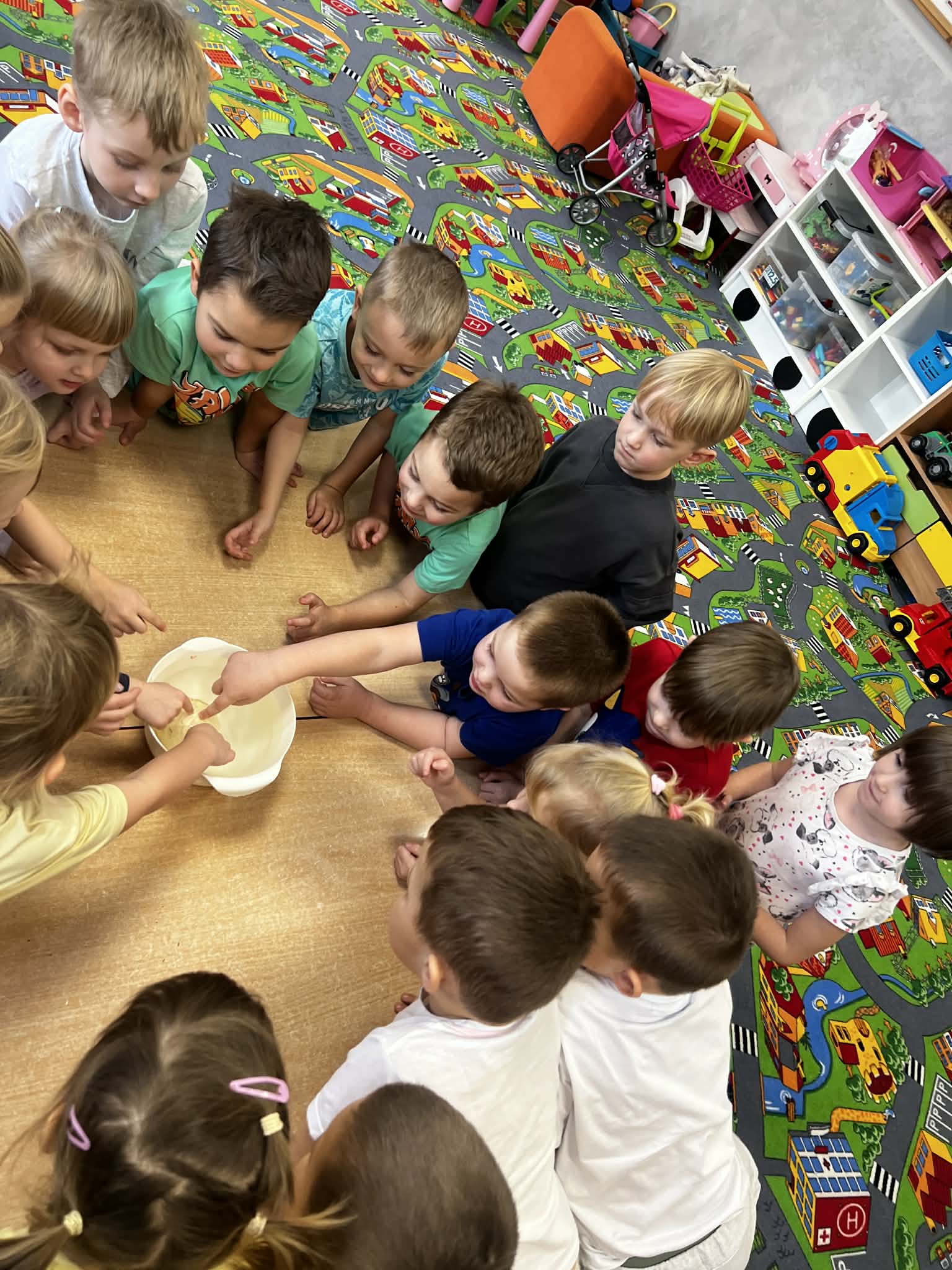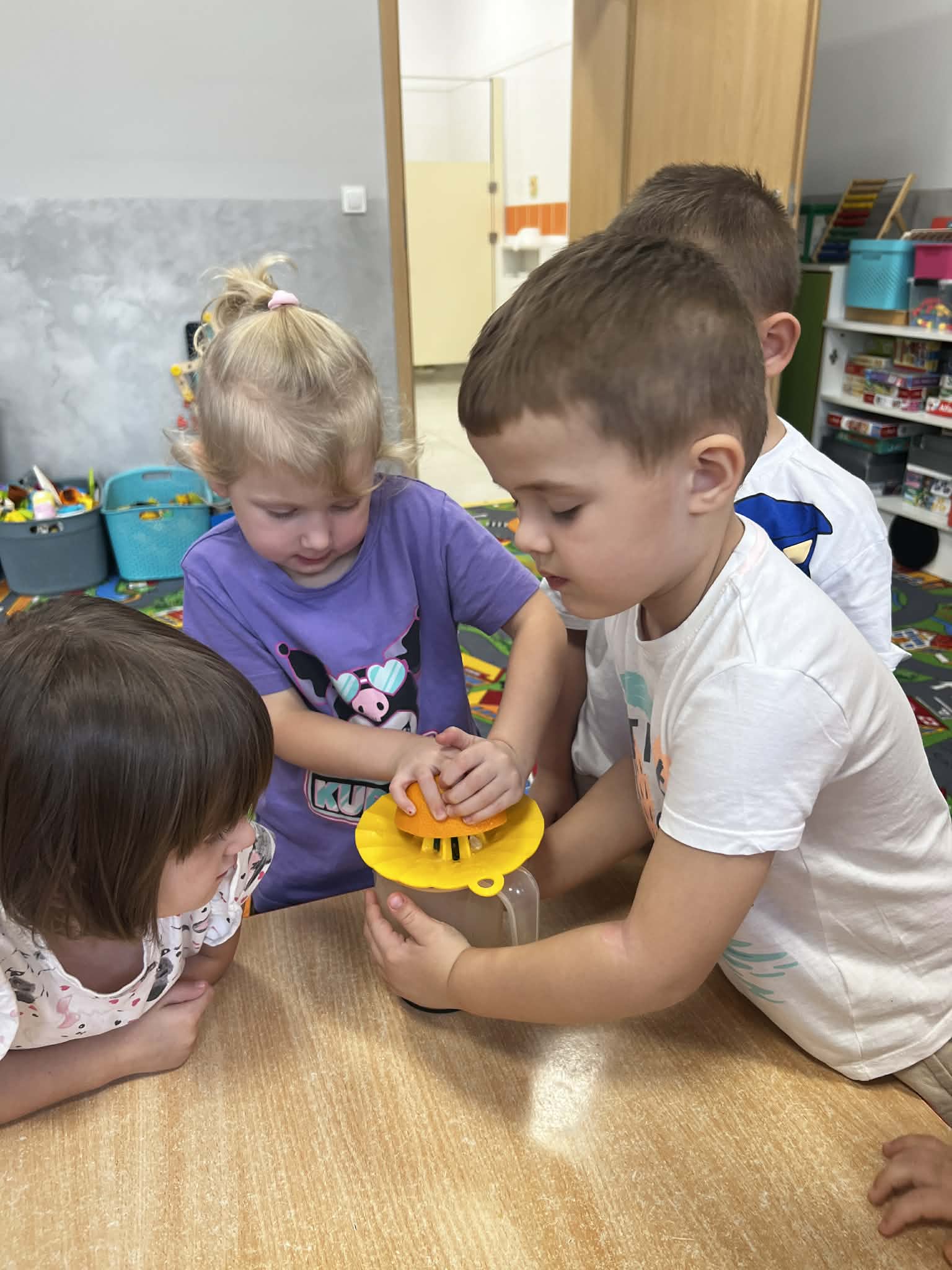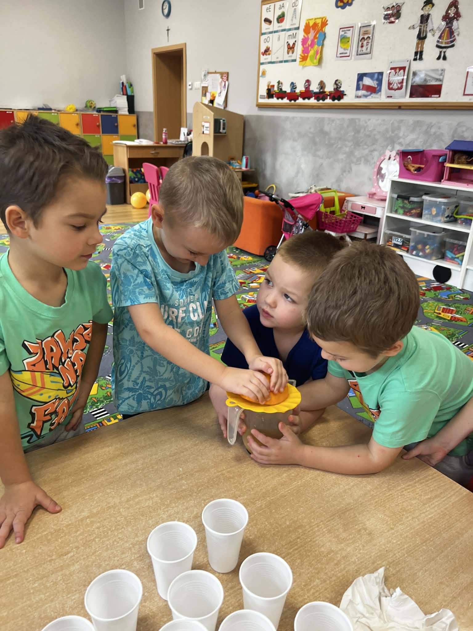 Podczas kolejnych zajęć w ramach projektu „Na tropie zdrowego odżywiania 2” dzieci wyruszyły na pomarańczowy trop. Poznały wygląd i sposób uprawy pomarańczy, a także mogły sprawdzić jej zapach, smak oraz strukturę skórki. Wysłuchały opowiadania „Energetyczna pomarańcza” Karoliny Machoń, po którym odbyła się wspólna rozmowa pełna dziecięcych spostrzeżeń. Przedszkolaki wykonały również pracę plastyczno-grafomotoryczną „Pomarańczowa grafomotoryka”, ćwicząc rysowanie po śladzie. Nie zabrakło też ruchu – dzieci tańczyły do piosenki „Pomarańcza” z pomarańczowymi balonami, co wywołało wiele radości. Dużym zainteresowaniem cieszył się eksperyment „Czy pomarańcza włożona do wody tonie?”, dzięki któremu dzieci mogły obserwować, jak zachowuje się owoc w zależności od tego, czy ma skórkę. Na zakończenie zajęć przedszkolaki wspólnie wyciskały sok pomarańczowy i próbowały jego świeżego, naturalnego smaku. To był dzień pełen zapachu, kolorów i zdrowych odkryć!