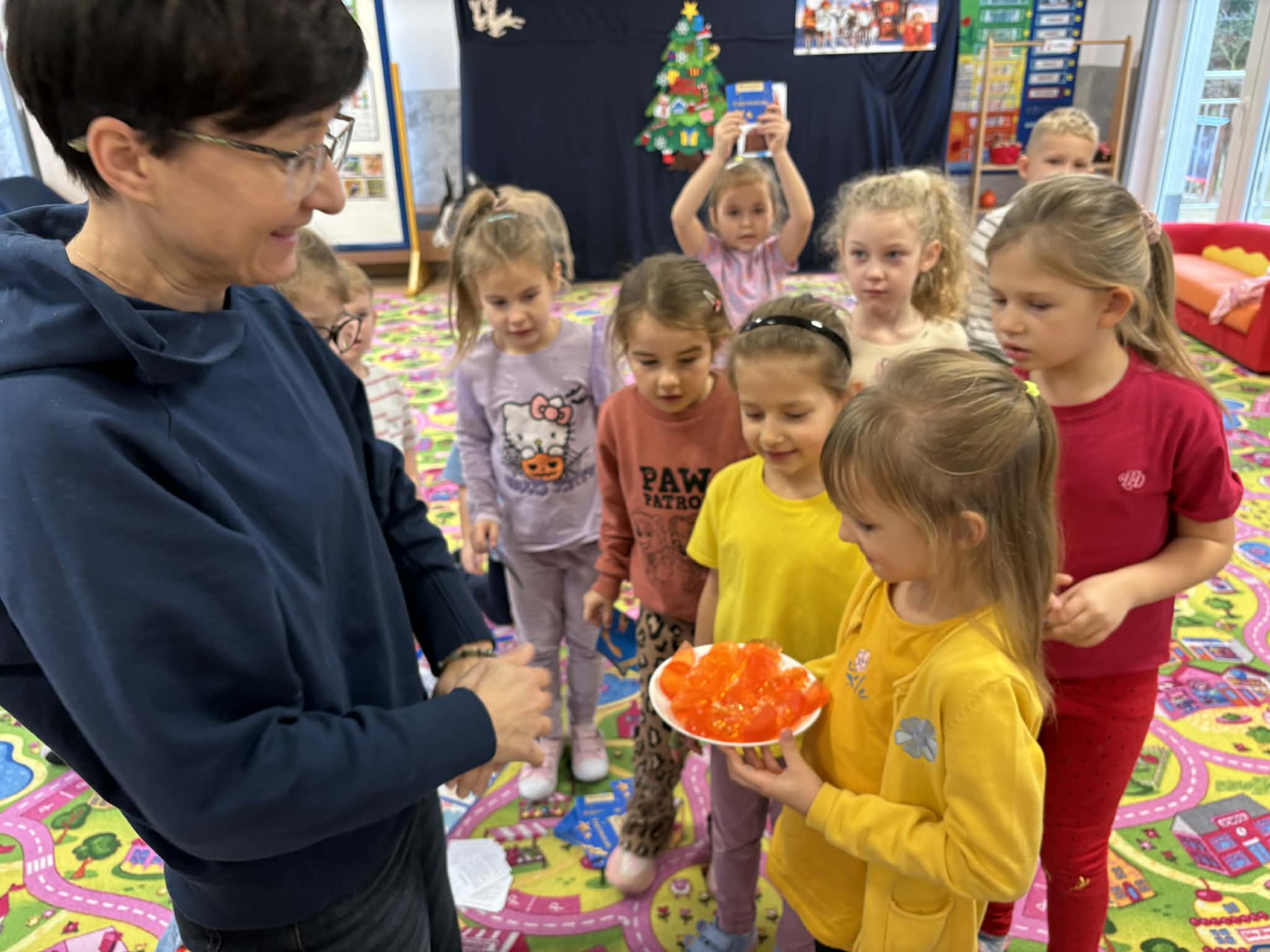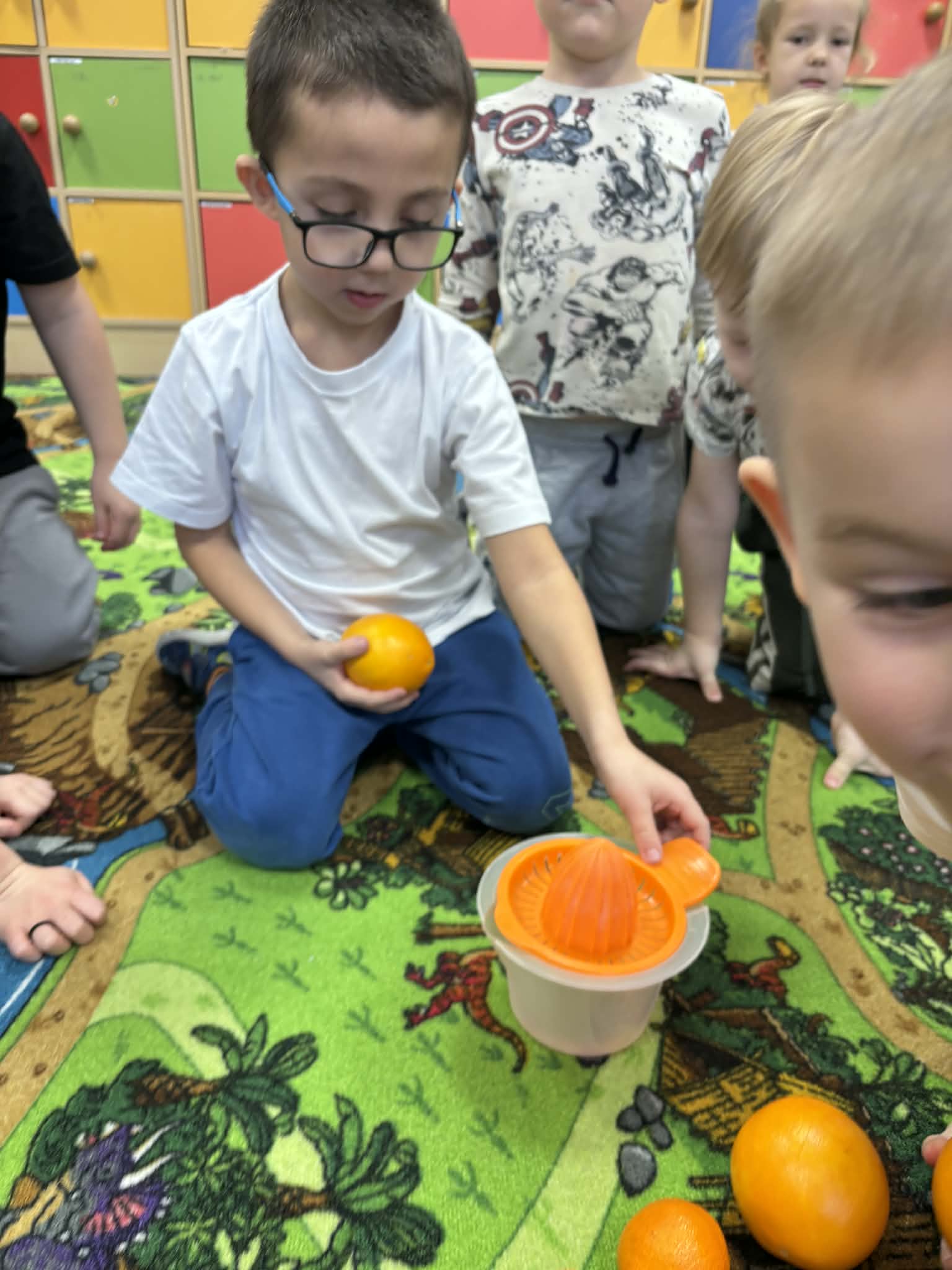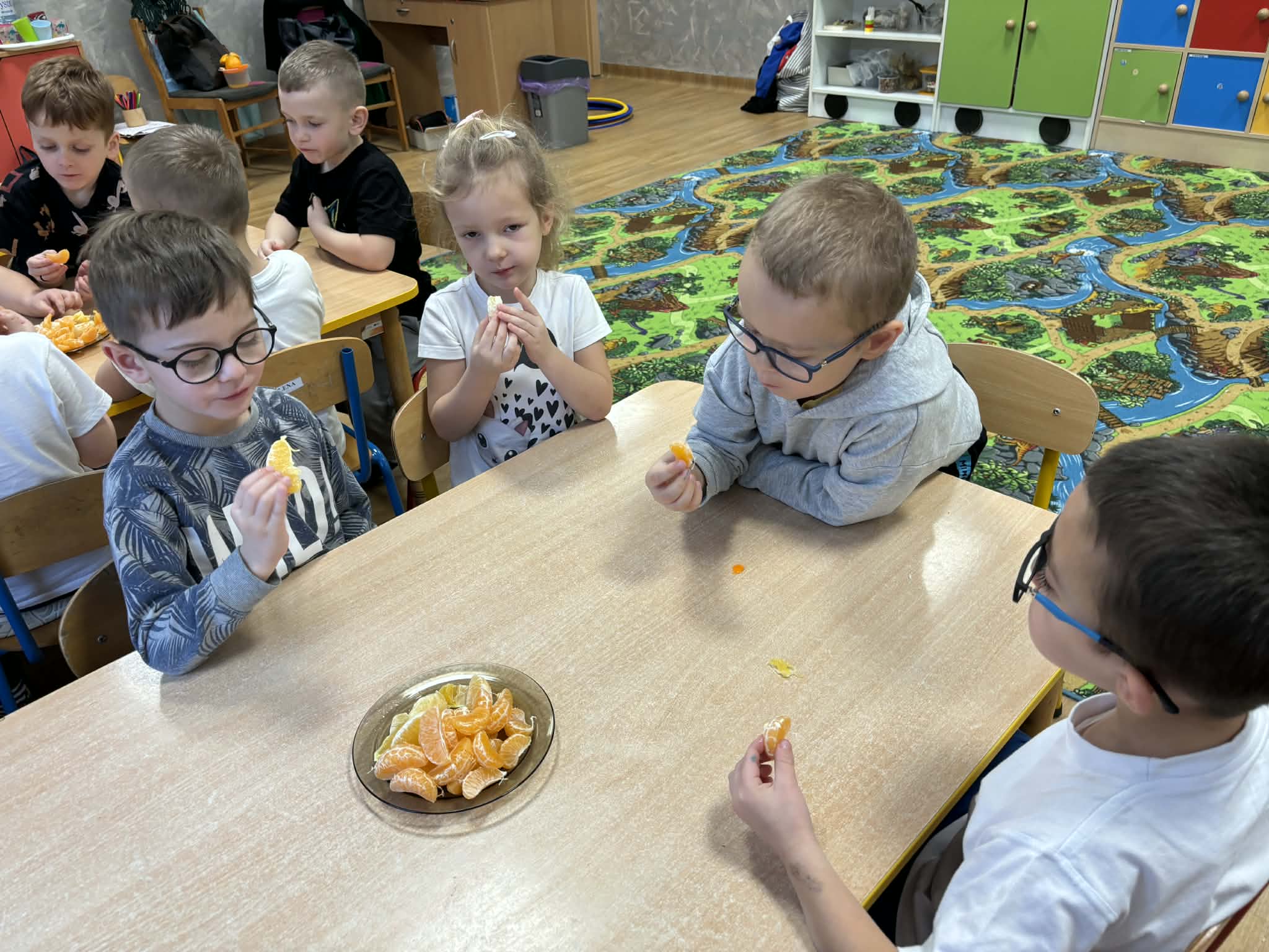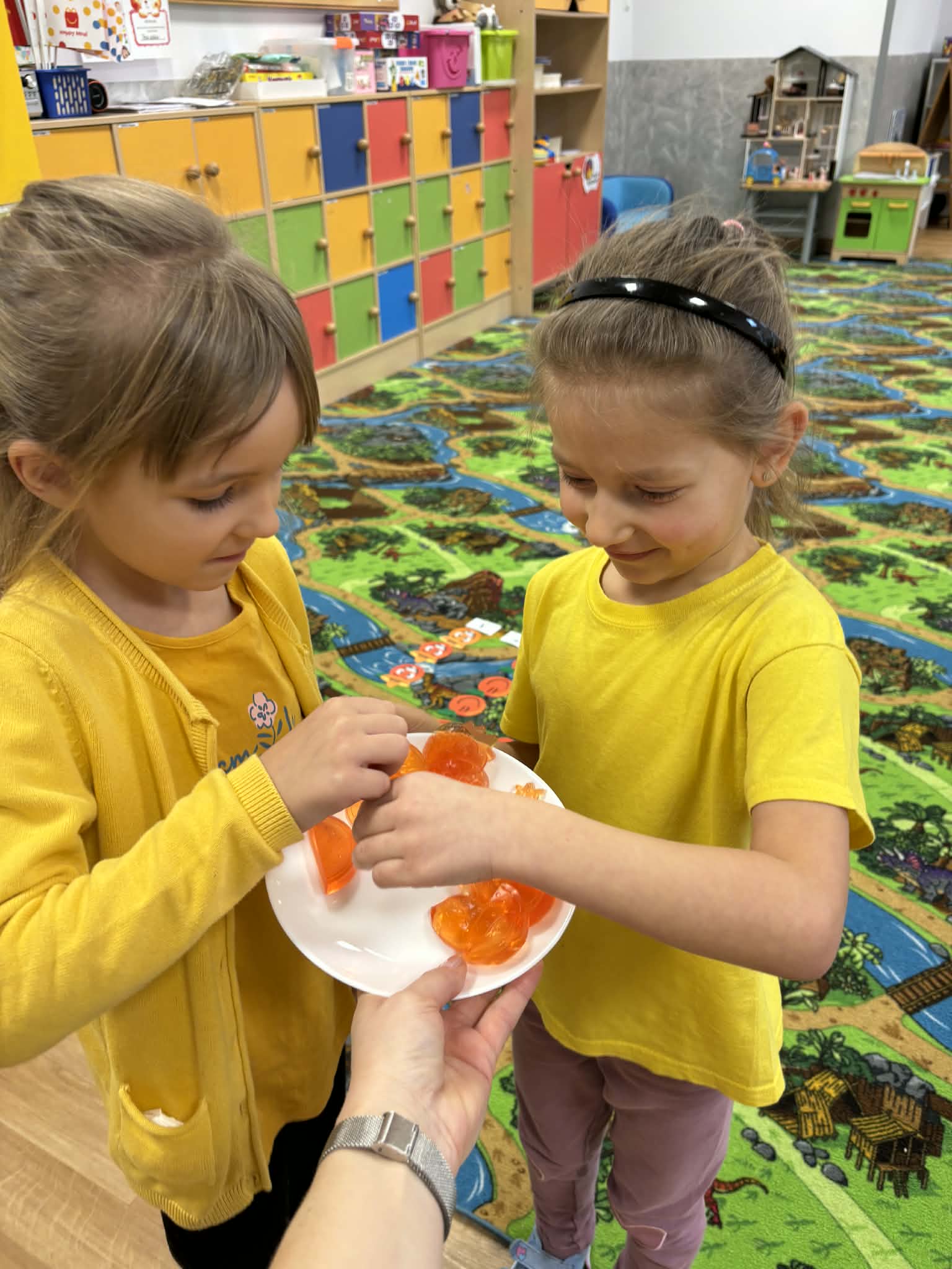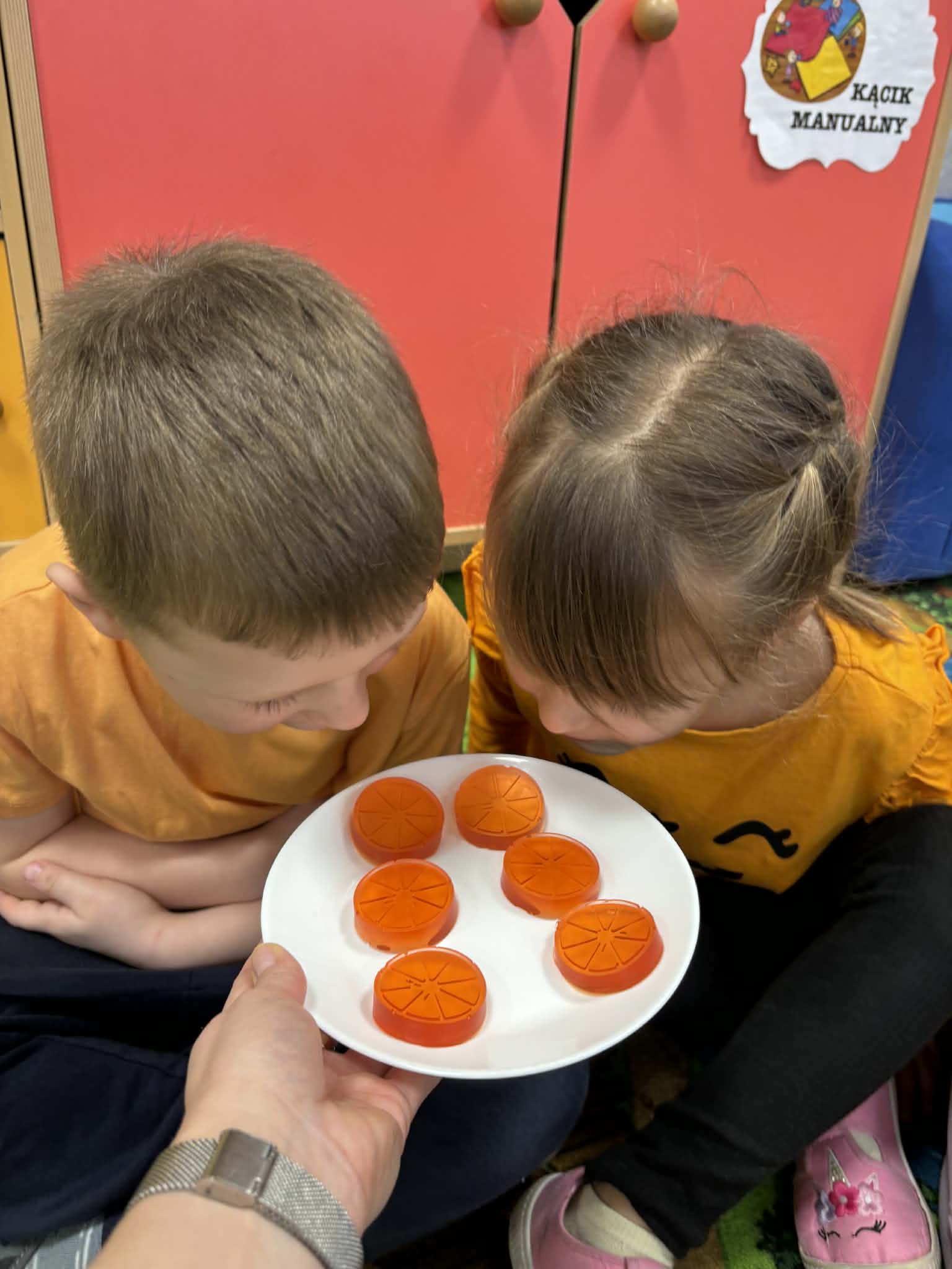 Pszczółki poznały niezwykle energetyczny owoc, jakim jest pomarańcza. Wysłuchały opowiadania i na podstawie własnych doświadczeń próbowały pokazać zmęczenie i brak energii jaki często nam towarzyszy. Dzieci segregowały sylwety pomarańczy, przeliczały mandarynki i pomarańcze, rysowały ,,pomarańczową grafomotorykę". Najwięcej radości sprawiło dzieciom samodzielnie przeprowadzone doświadczenie- czy pomarańcza tonie? Kolor pomarańczowy towarzyszył nam podczas kosztowania pomarańczowych smakołyków. Zdziwienie u dzieci wywołało jak łatwo można przygotować zdrowe i przepyszne żelki pomarańczowe. Kolejna witaminka trafiła do skarbca Pszczółek.