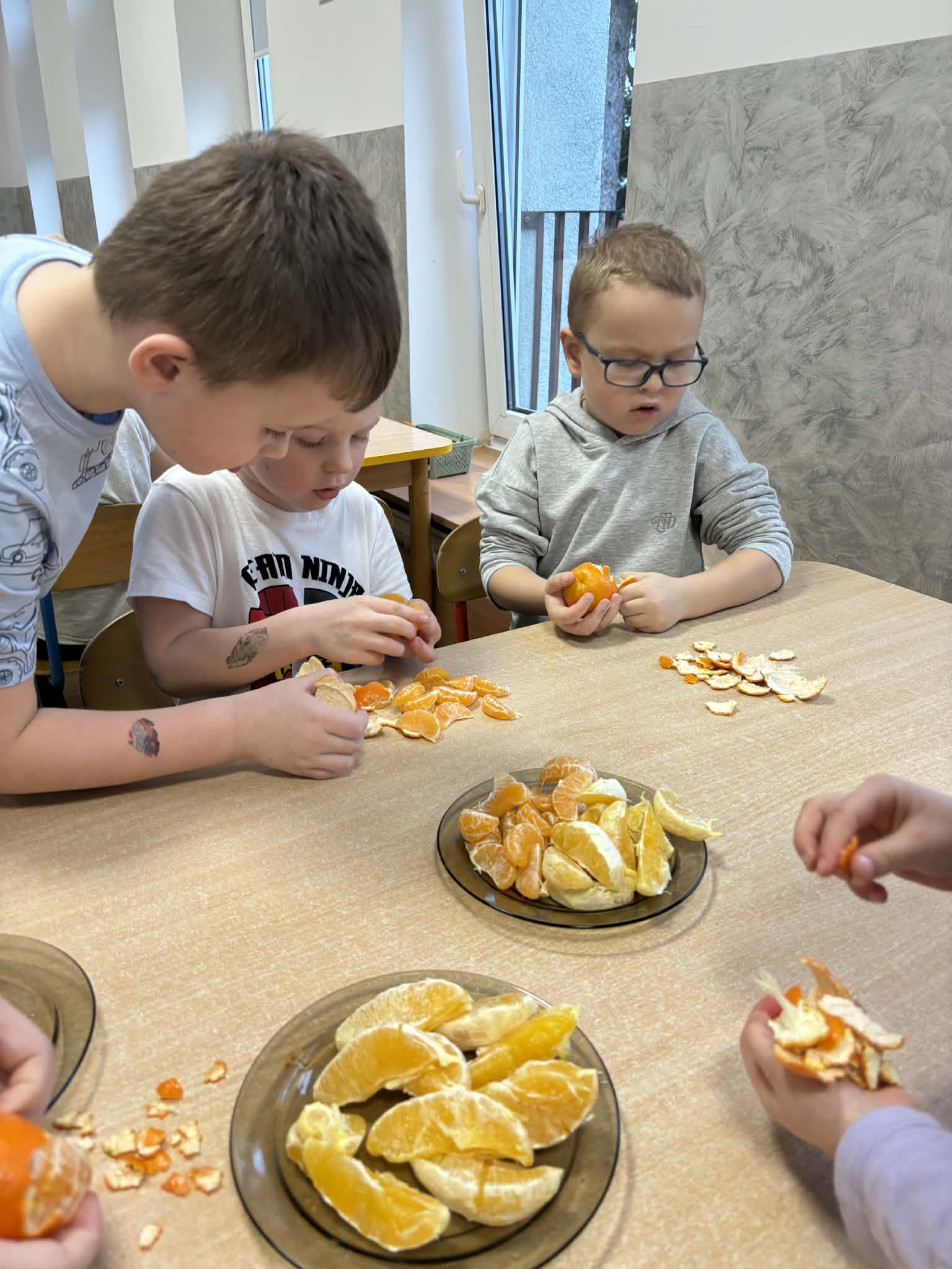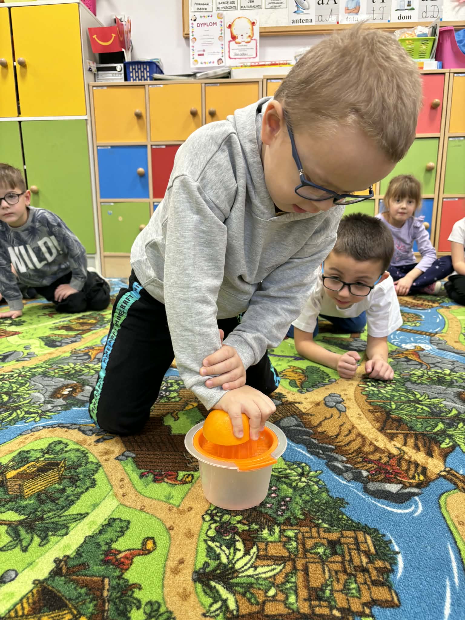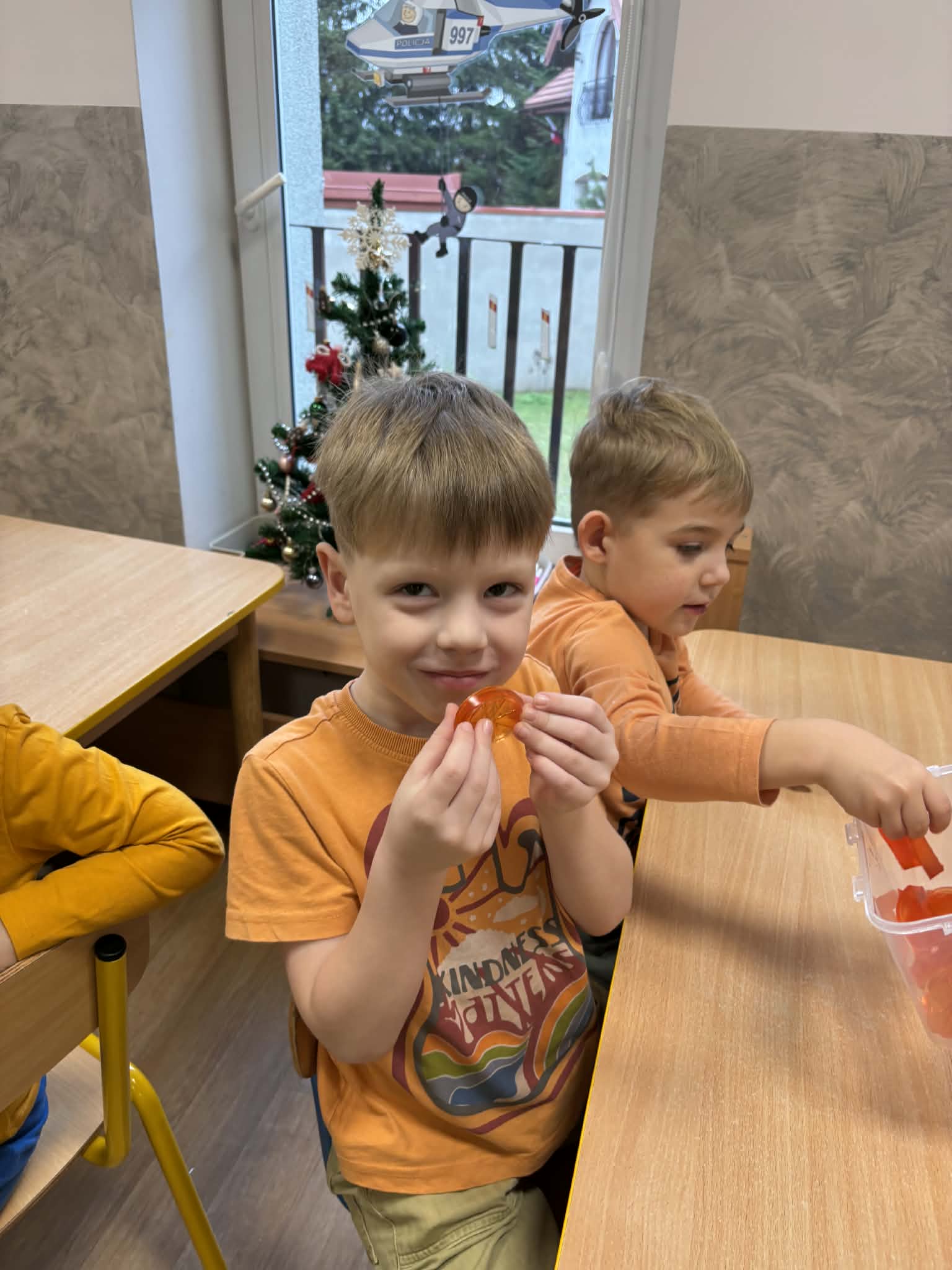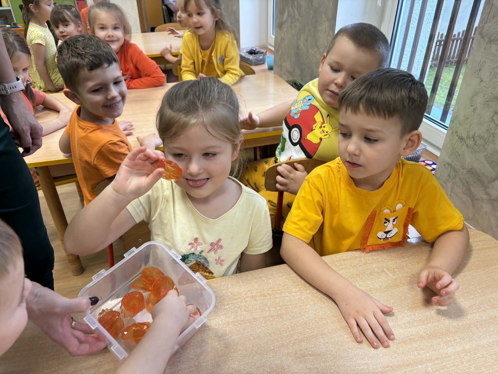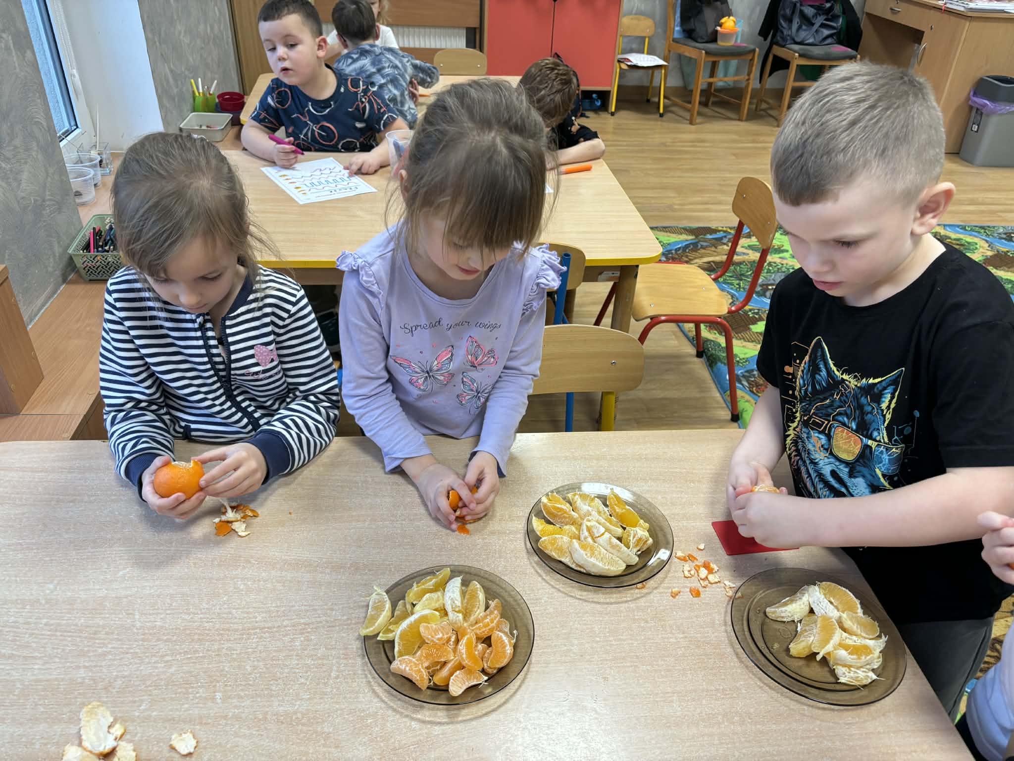 Pszczółki poznały niezwykle energetyczny owoc, jakim jest pomarańcza. Wysłuchały opowiadania i na podstawie własnych doświadczeń próbowały pokazać zmęczenie i brak energii jaki często nam towarzyszy. Dzieci segregowały sylwety pomarańczy, przeliczały mandarynki i pomarańcze, rysowały ,,pomarańczową grafomotorykę". Najwięcej radości sprawiło dzieciom samodzielnie przeprowadzone doświadczenie- czy pomarańcza tonie? Kolor pomarańczowy towarzyszył nam podczas kosztowania pomarańczowych smakołyków. Zdziwienie u dzieci wywołało jak łatwo można przygotować zdrowe i przepyszne żelki pomarańczowe. Kolejna witaminka trafiła do skarbca Pszczółek.