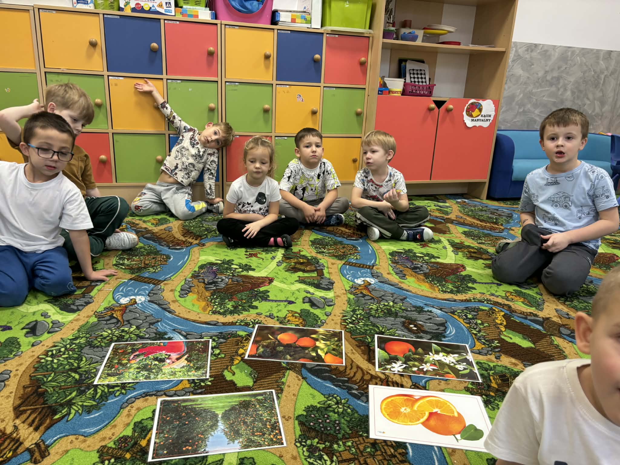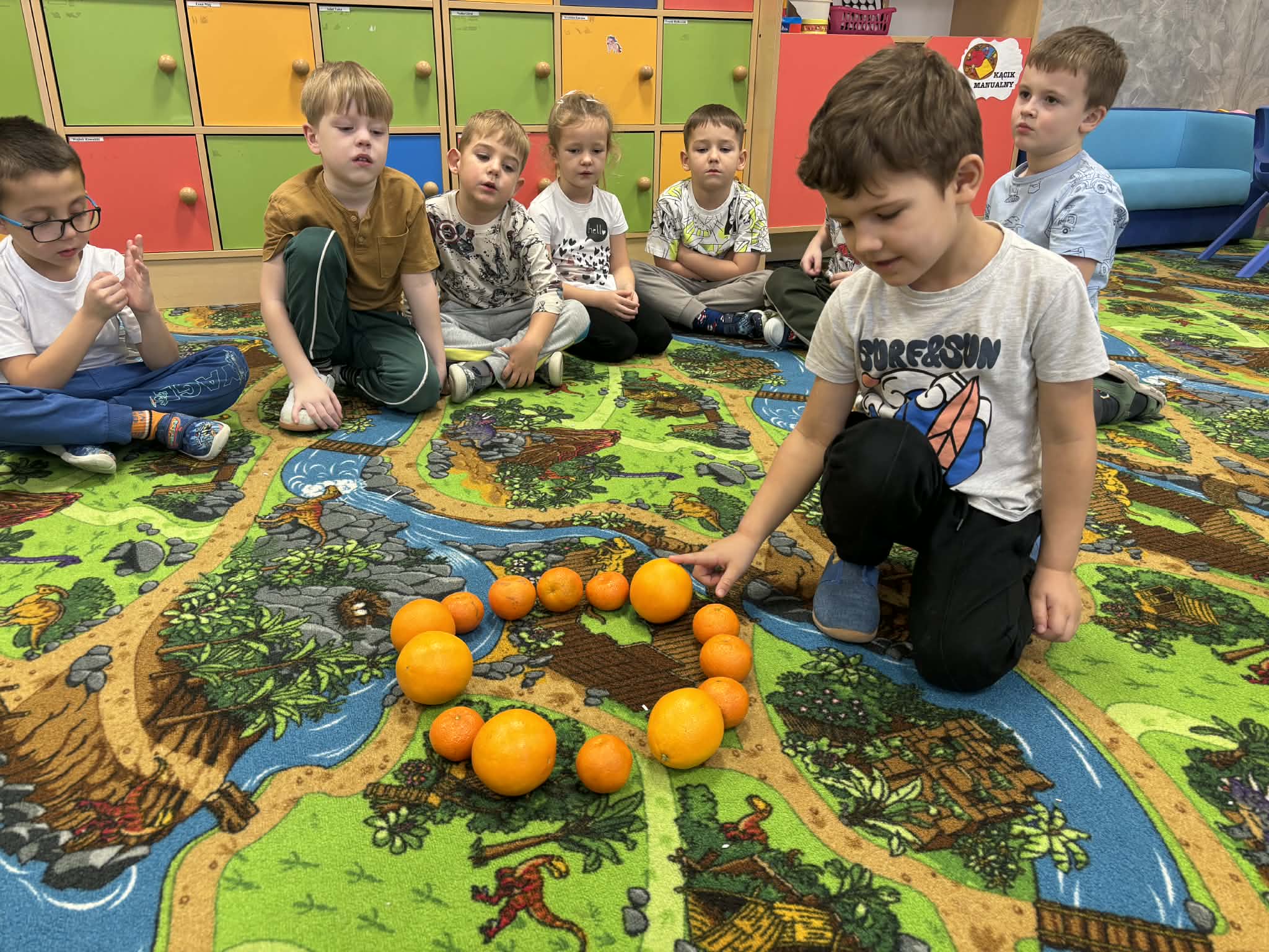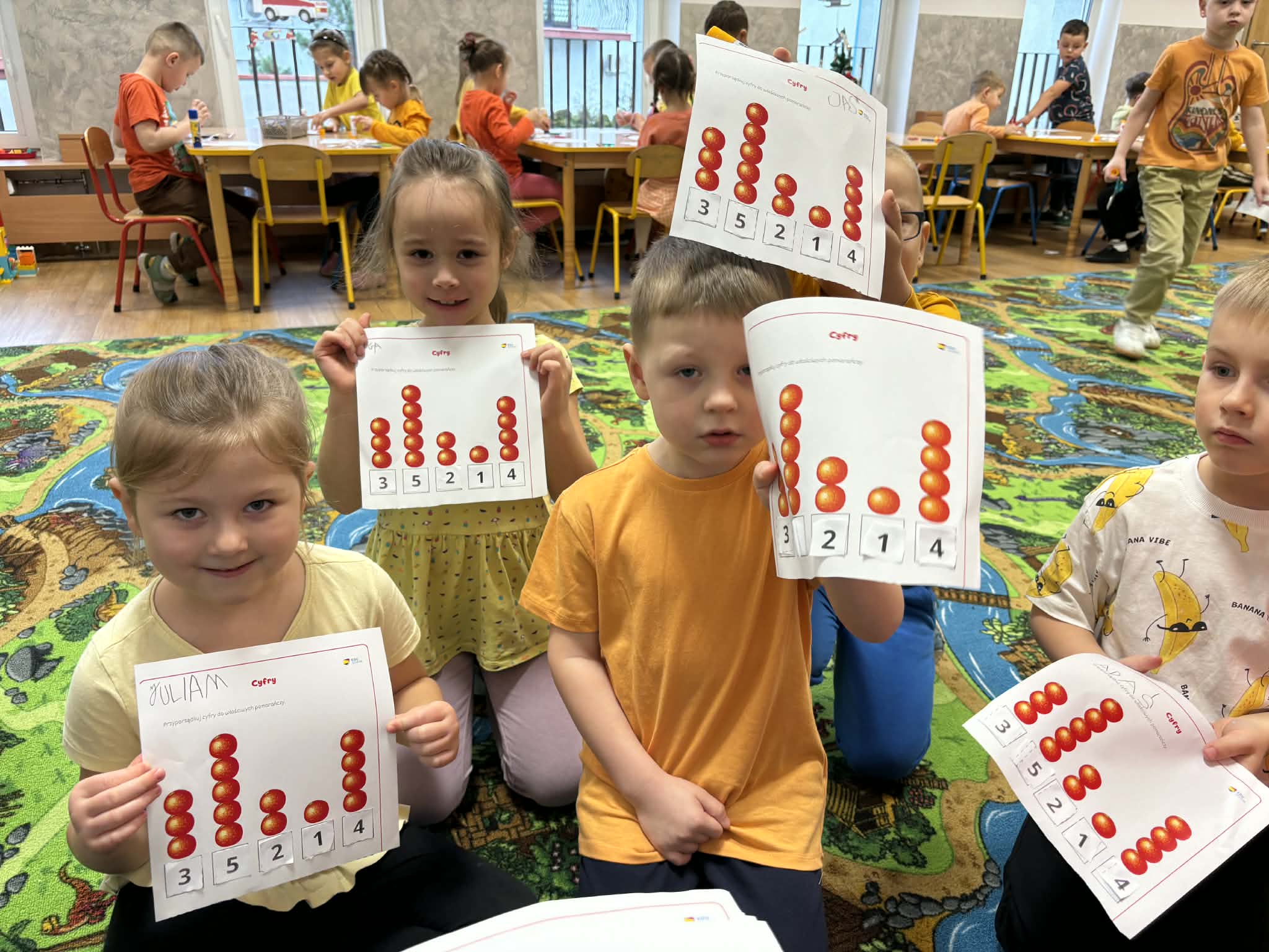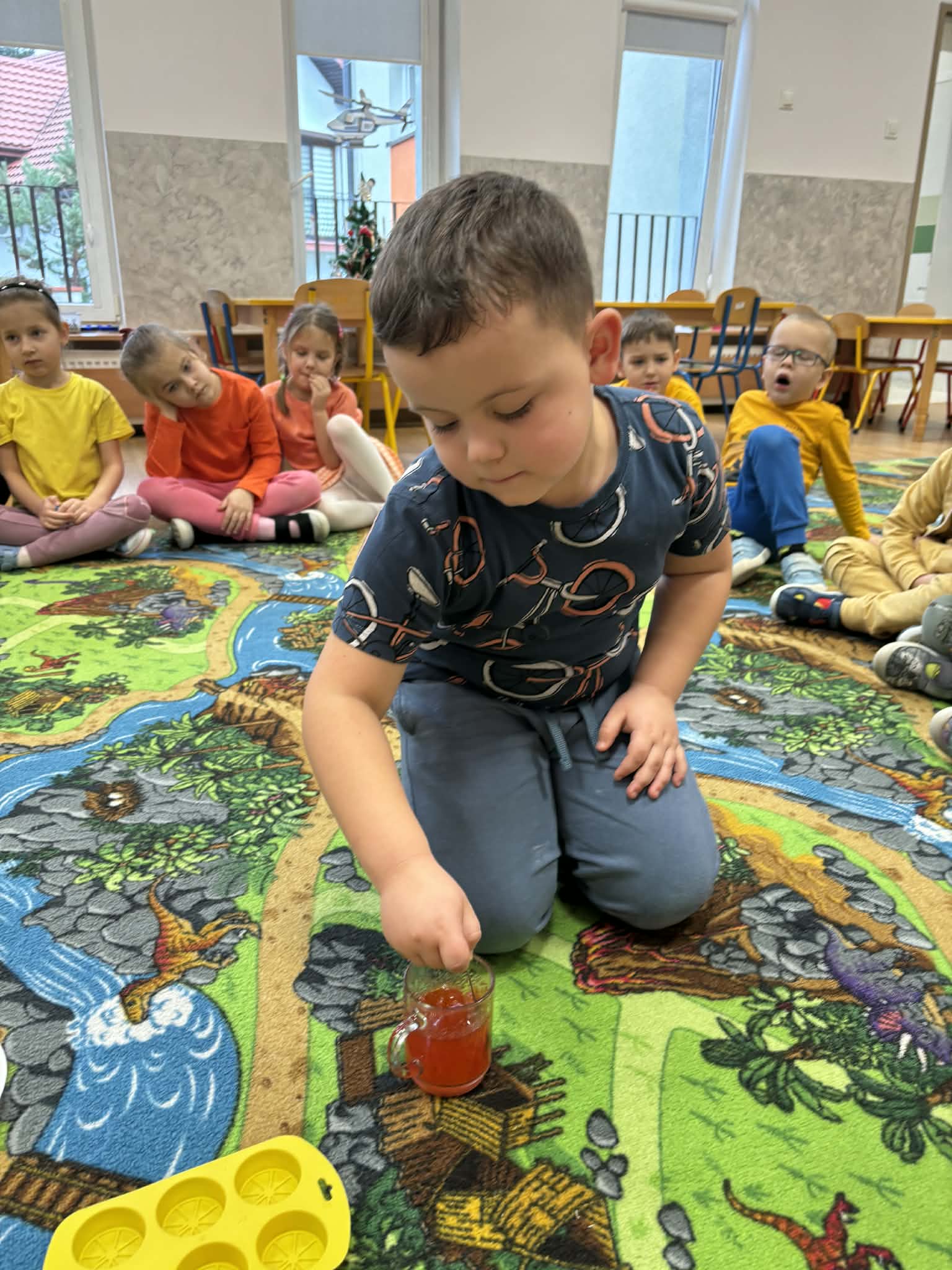 Pszczółki poznały niezwykle energetyczny owoc, jakim jest pomarańcza. Wysłuchały opowiadania i na podstawie własnych doświadczeń próbowały pokazać zmęczenie i brak energii jaki często nam towarzyszy. Dzieci segregowały sylwety pomarańczy, przeliczały mandarynki i pomarańcze, rysowały ,,pomarańczową grafomotorykę". Najwięcej radości sprawiło dzieciom samodzielnie przeprowadzone doświadczenie- czy pomarańcza tonie? Kolor pomarańczowy towarzyszył nam podczas kosztowania pomarańczowych smakołyków. Zdziwienie u dzieci wywołało jak łatwo można przygotować zdrowe i przepyszne żelki pomarańczowe. Kolejna witaminka trafiła do skarbca Pszczółek.