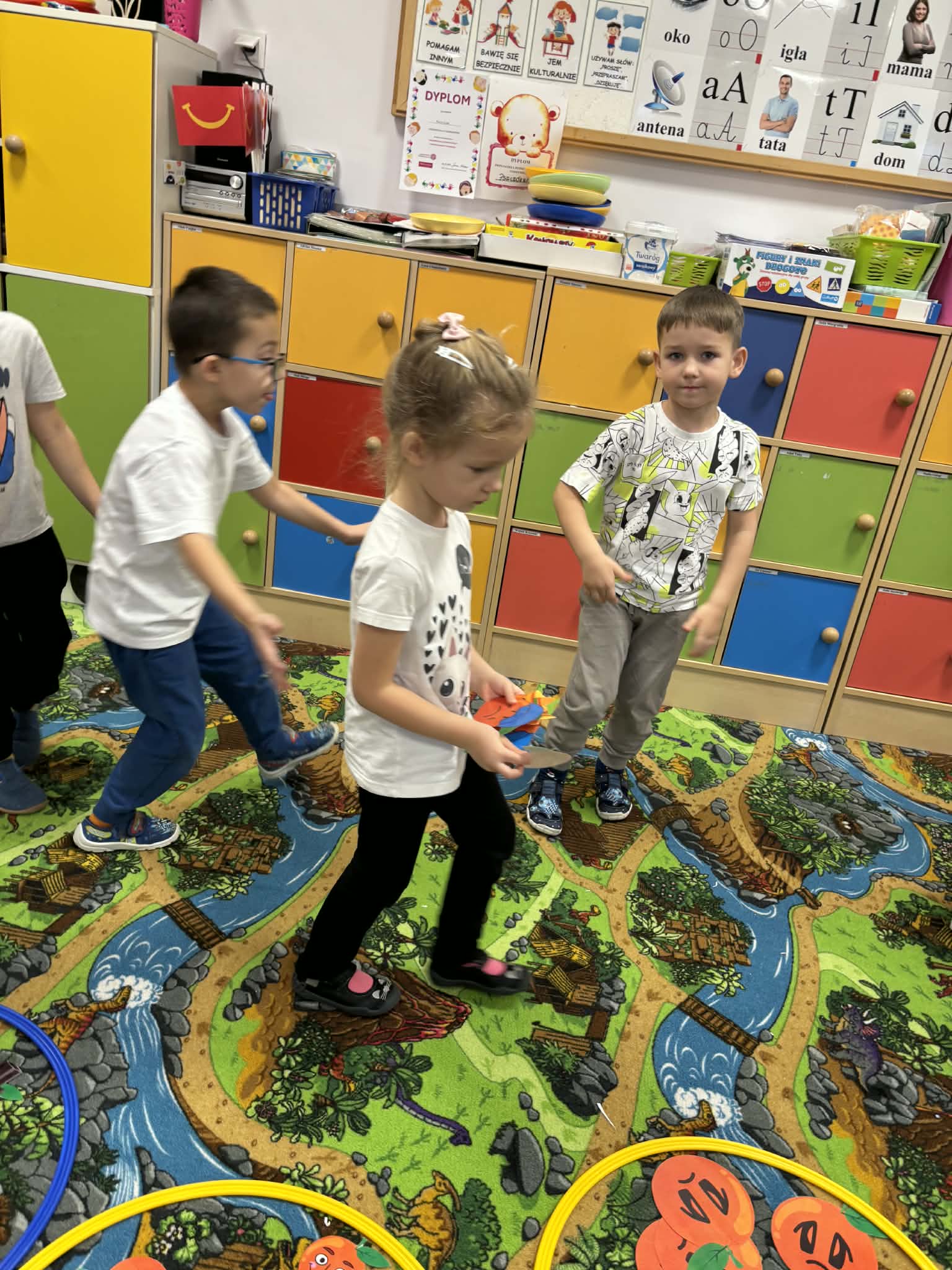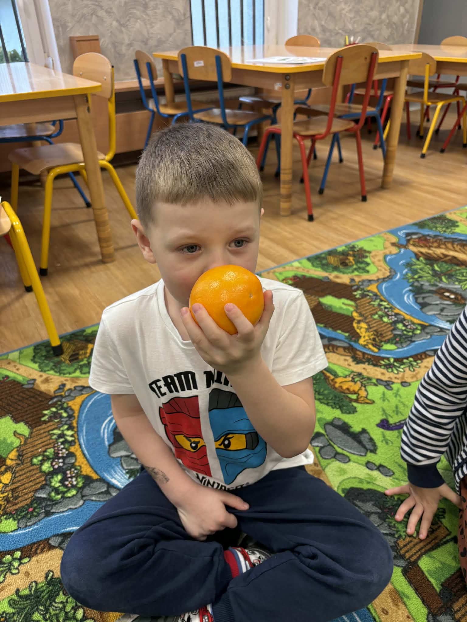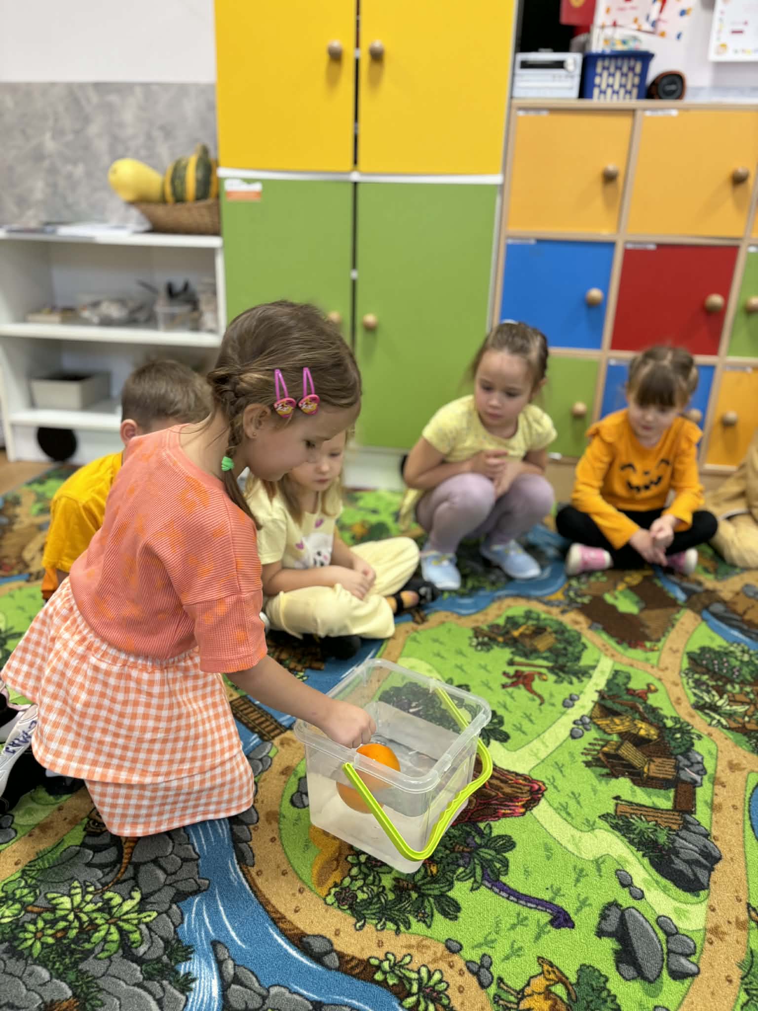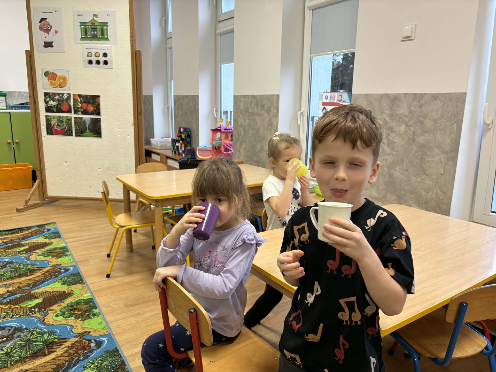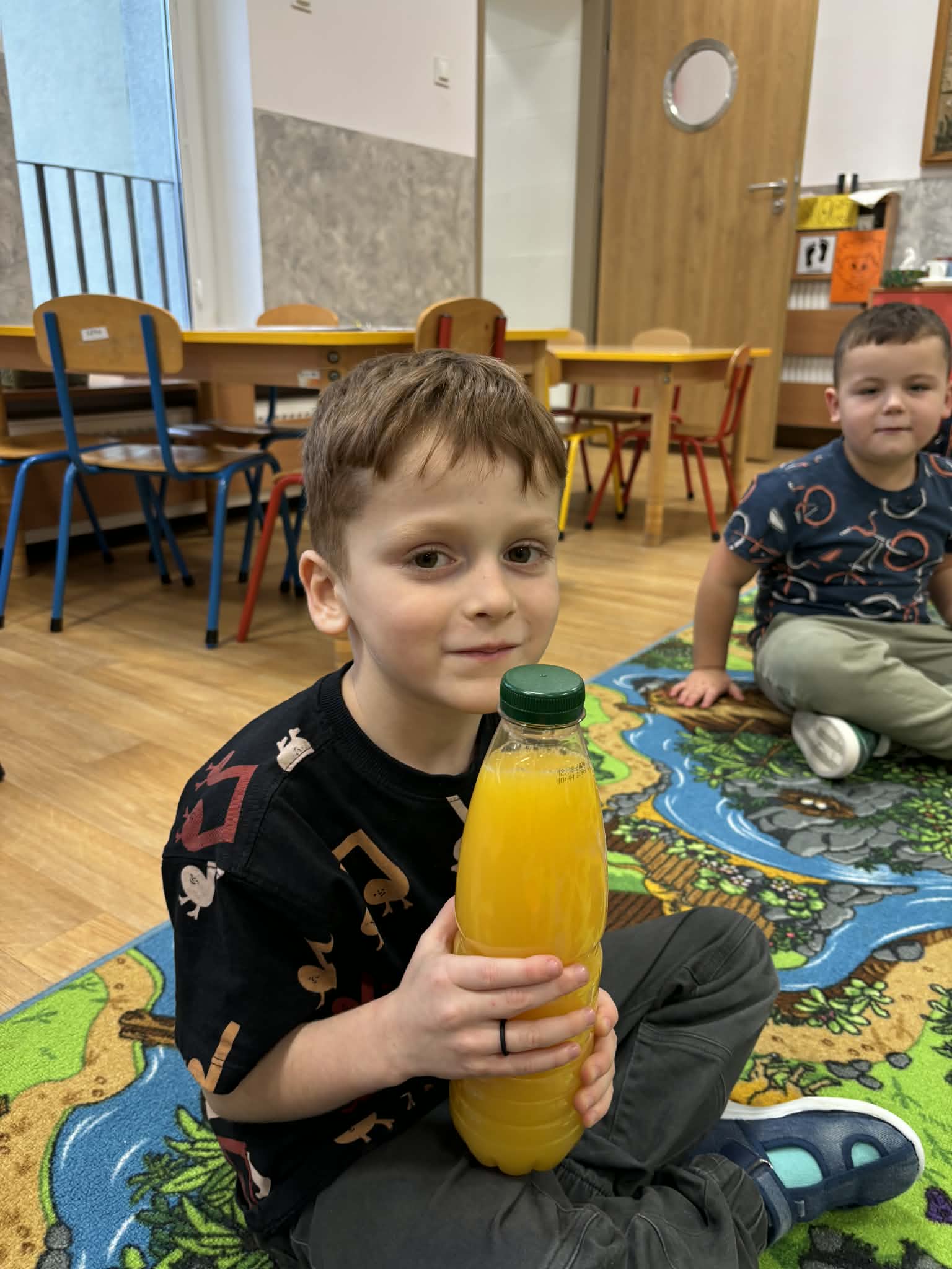 Pszczółki poznały niezwykle energetyczny owoc, jakim jest pomarańcza. Wysłuchały opowiadania i na podstawie własnych doświadczeń próbowały pokazać zmęczenie i brak energii jaki często nam towarzyszy. Dzieci segregowały sylwety pomarańczy, przeliczały mandarynki i pomarańcze, rysowały ,,pomarańczową grafomotorykę". Najwięcej radości sprawiło dzieciom samodzielnie przeprowadzone doświadczenie- czy pomarańcza tonie? Kolor pomarańczowy towarzyszył nam podczas kosztowania pomarańczowych smakołyków. Zdziwienie u dzieci wywołało jak łatwo można przygotować zdrowe i przepyszne żelki pomarańczowe. Kolejna witaminka trafiła do skarbca Pszczółek.
