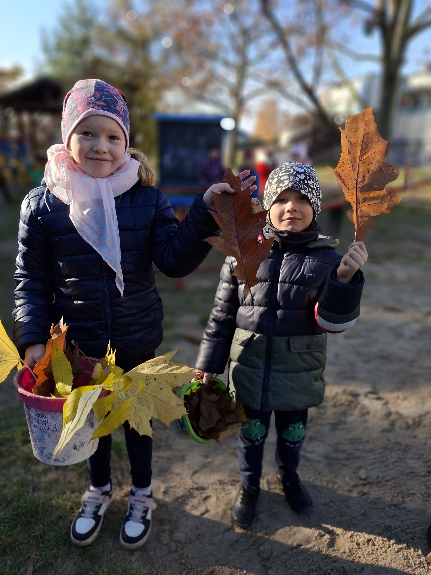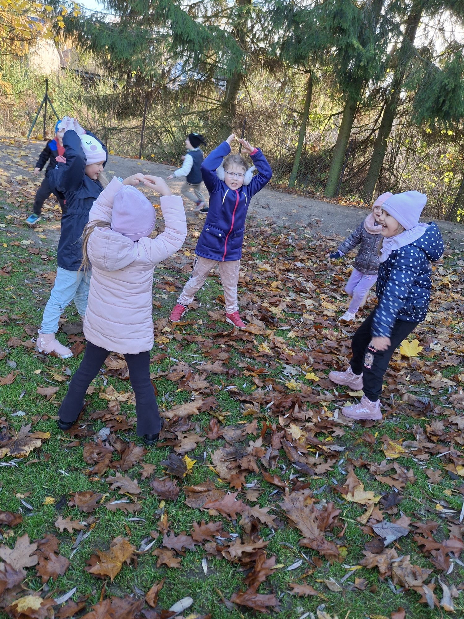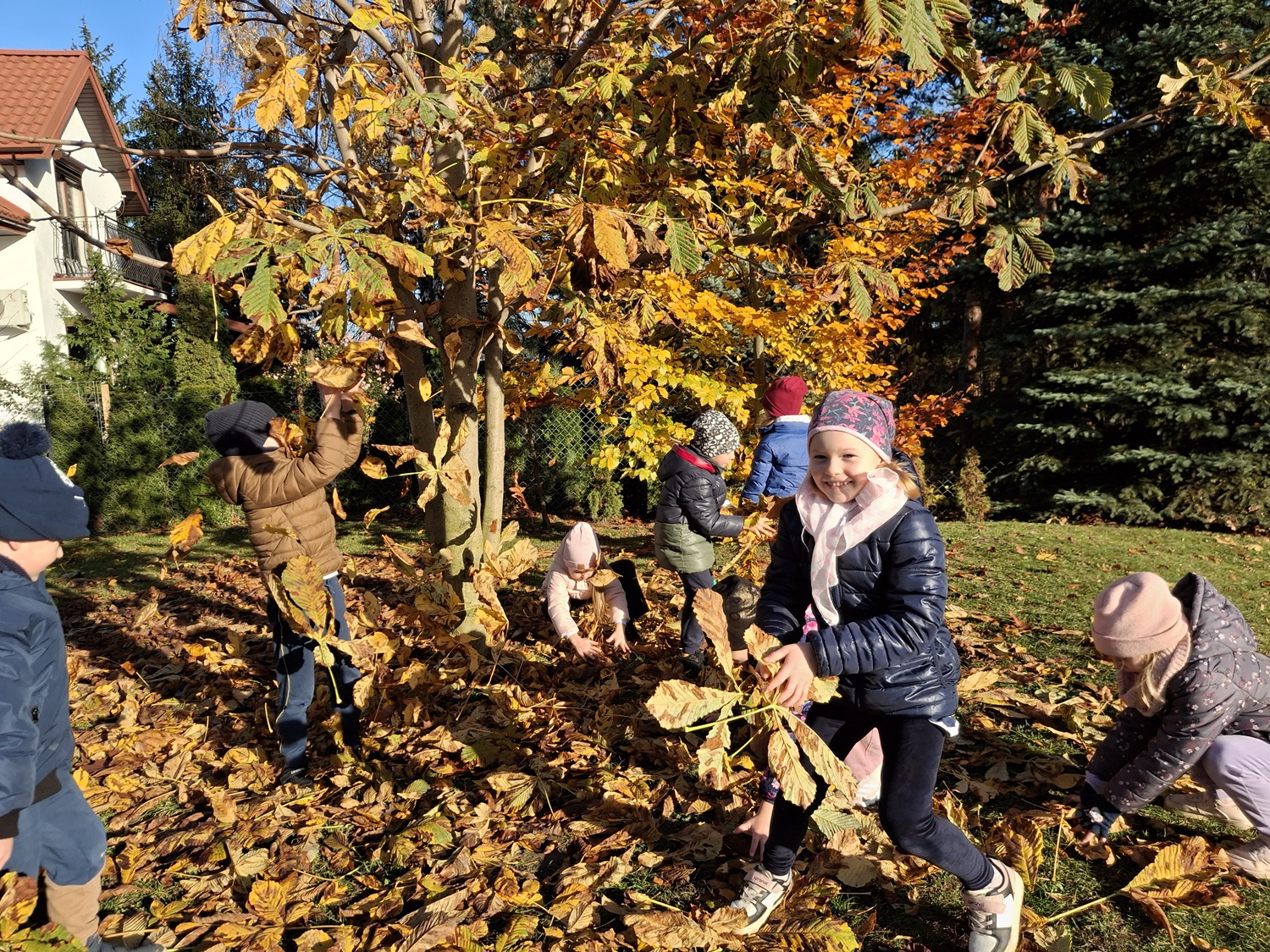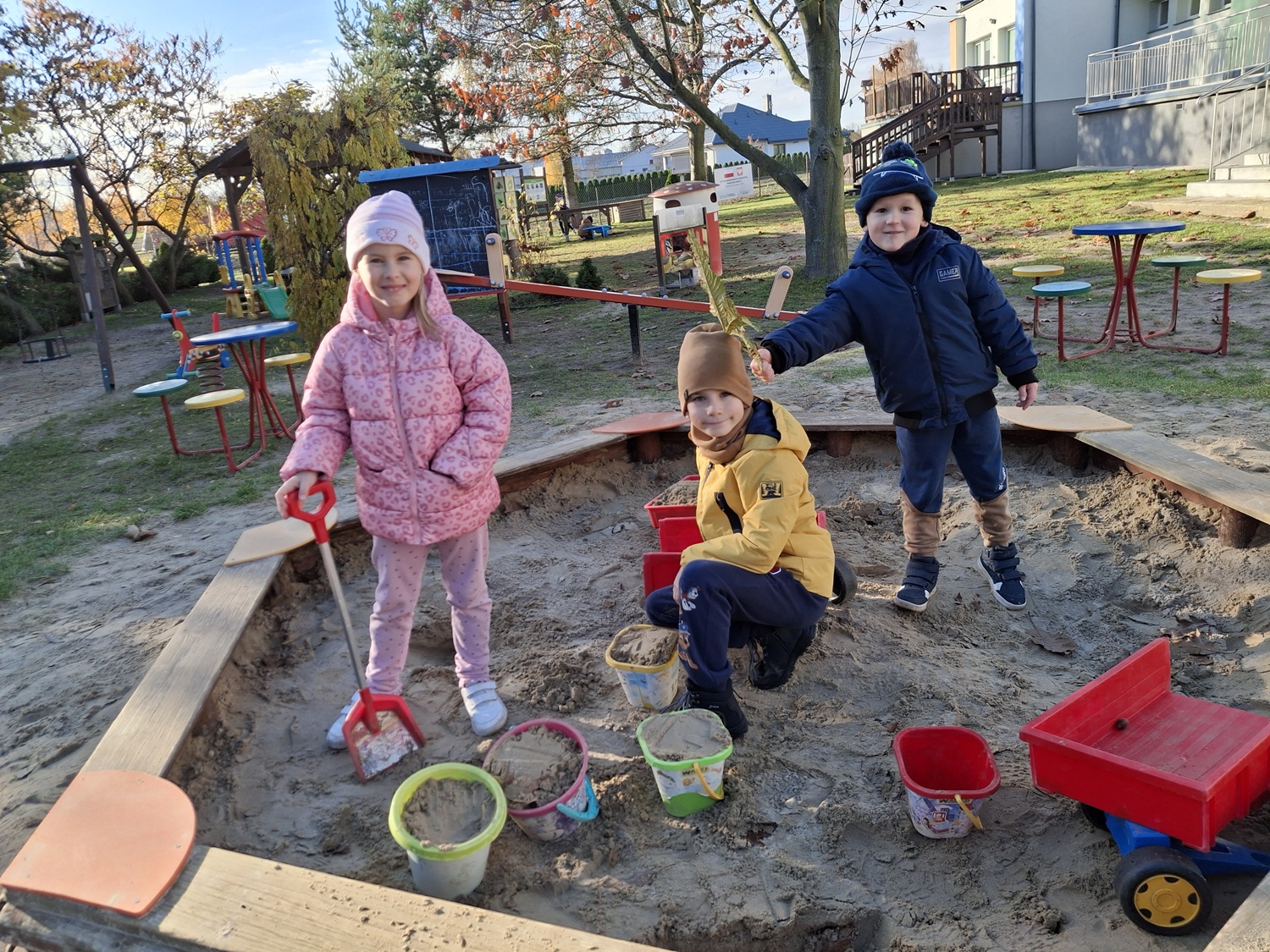 Piękna pogoda sprzyja aktywności na świeżym powietrzu! Przedszkolaki wykorzystując każdy promyczek jesiennego słańca z radością spędzają czas organizując sobie różnorodne zabawy. Podczas zabaw w piaskownicy wznosiły budowle z piasku, grabiły liście i przygotowywały legowisko dla jeża, zbierały liście i robiły z nich kolorowe bukiety. Jak wiadomo nie od dziś ruch to zdrowie, a wspólna zabawa na świeżym powietrzu to doskonała okazja do rozwijania sprawności i współpracy.