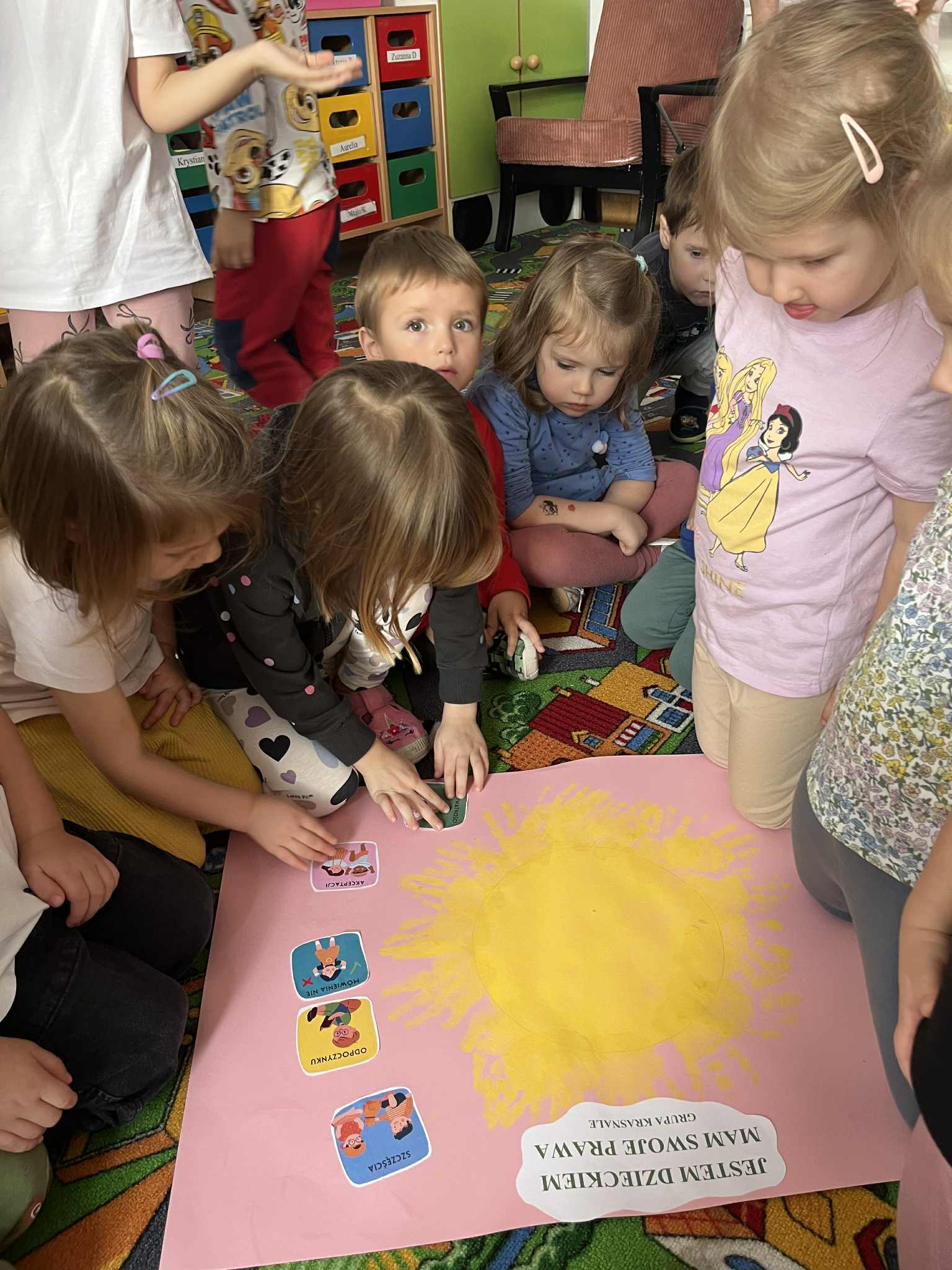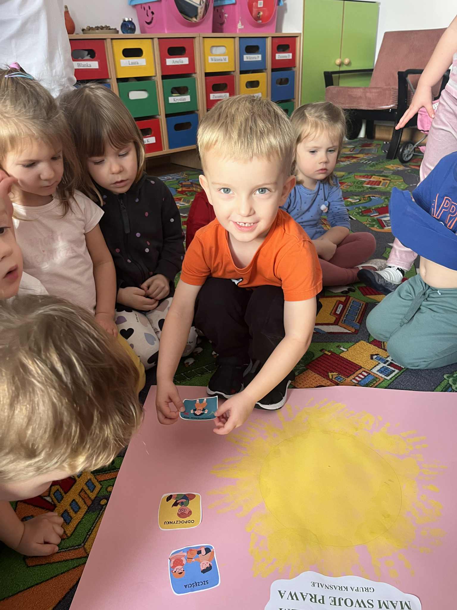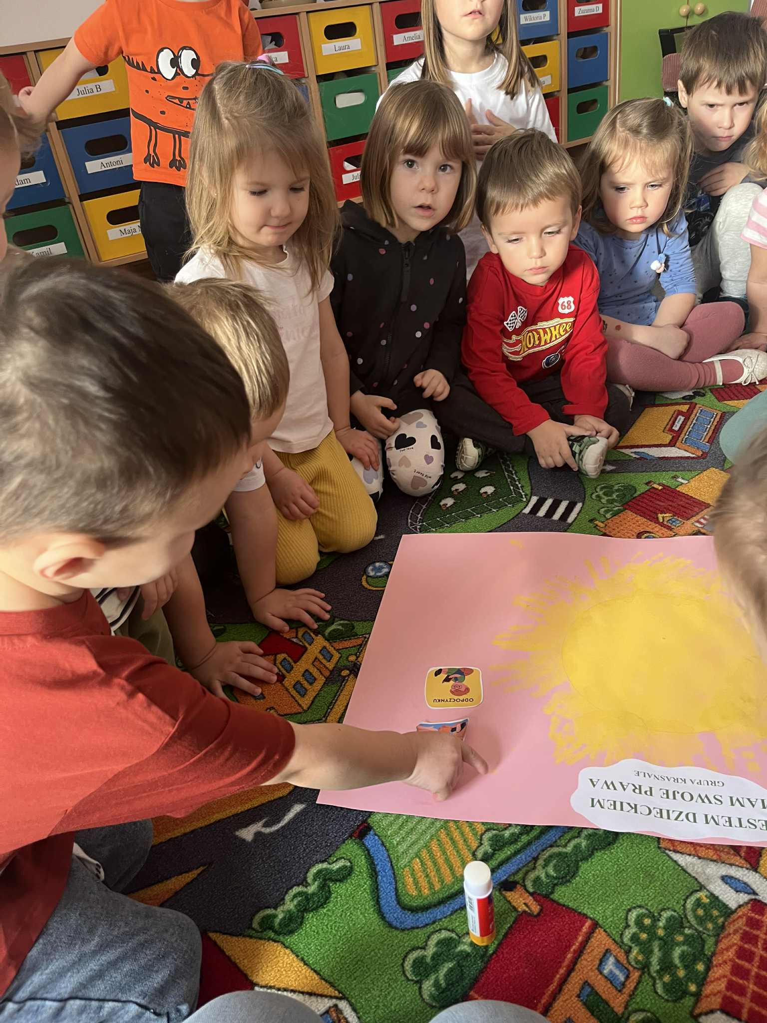 20 listopada dzieci z grup, Krasnale i Puchatki wspólnie obchodziły Międzynarodowy Dzień Praw Dziecka. To wyjątkowy dzień, który przypomina o prawach każdego dziecka, takich jak prawo do życia, rozwoju, edukacji czy ochrony przed przemocą, oraz o obowiązkach dorosłych w zakresie ich ochrony. Wspólnie z Januszem Korczakiem i przedszkolnym misiem Felkiem, dzieci poznawały swoje prawa. Wysłuchały wiersza A. Frączek pt. ,,Mój przyjaciel", na podstawie, którego rozwiązały zagadkę - prawda czy fałsz. Podczas zabaw ruchowych wyzwalały dziecięcą radość. Na zakończenie wykonały pracę plastyczną ,,Słoneczko", które swoim uśmiechem rozświetliło przedszkolną salę.