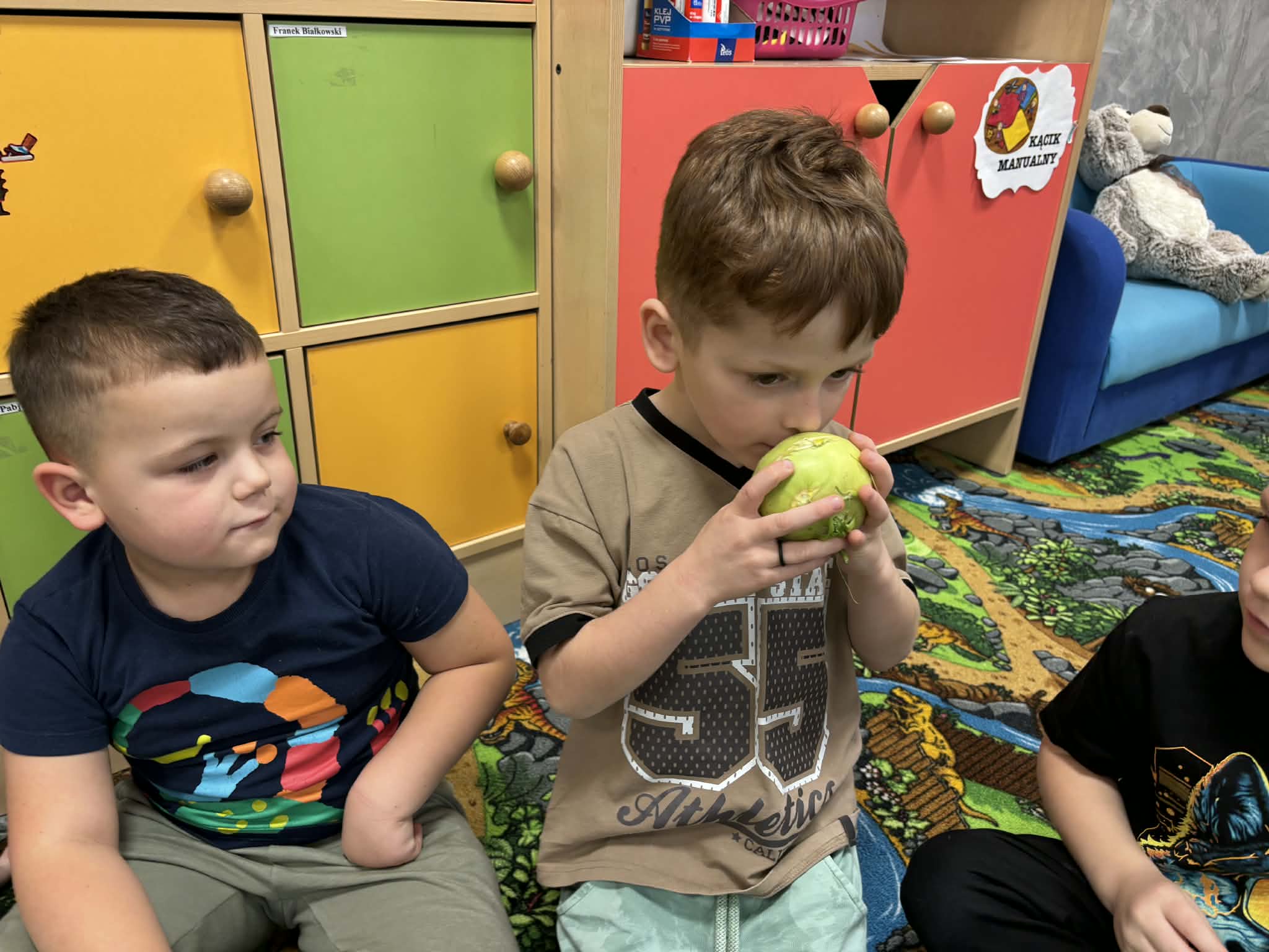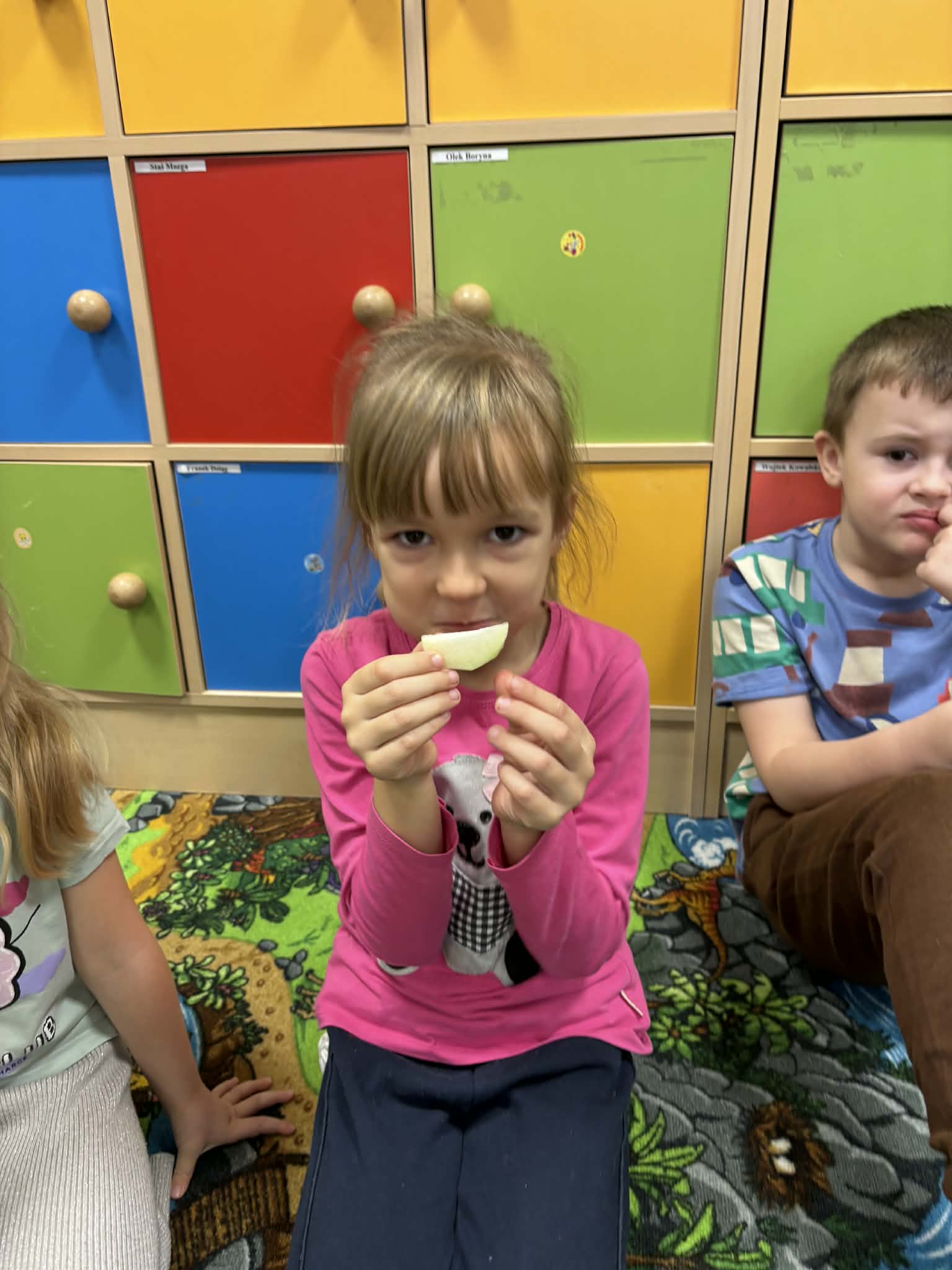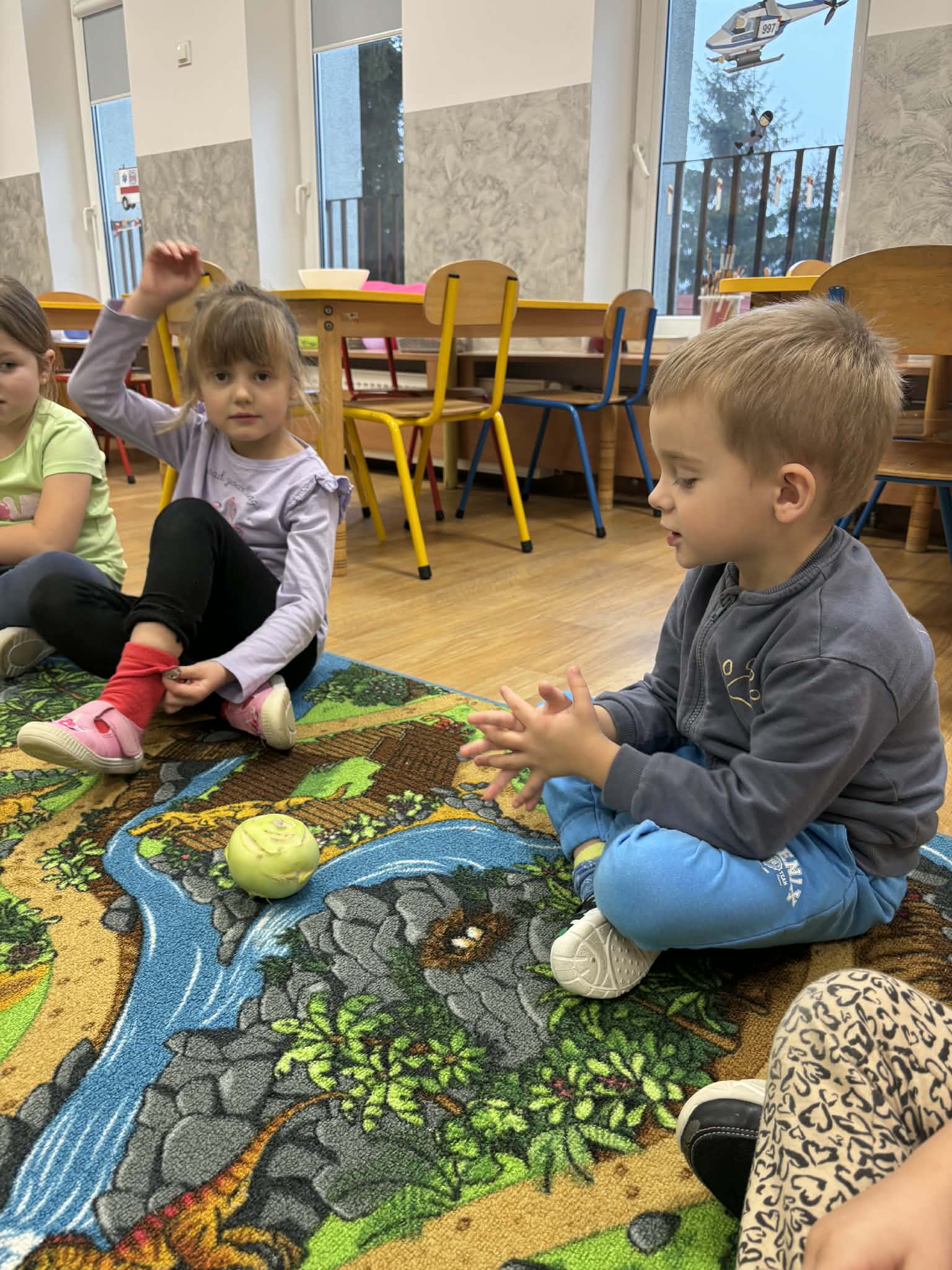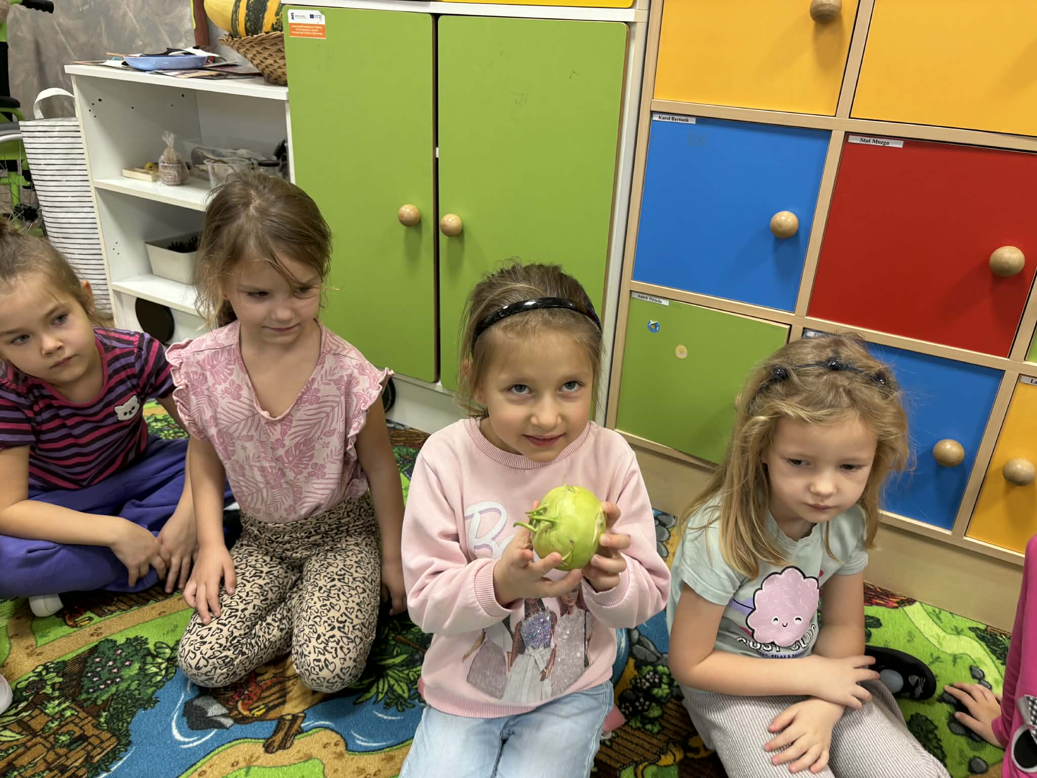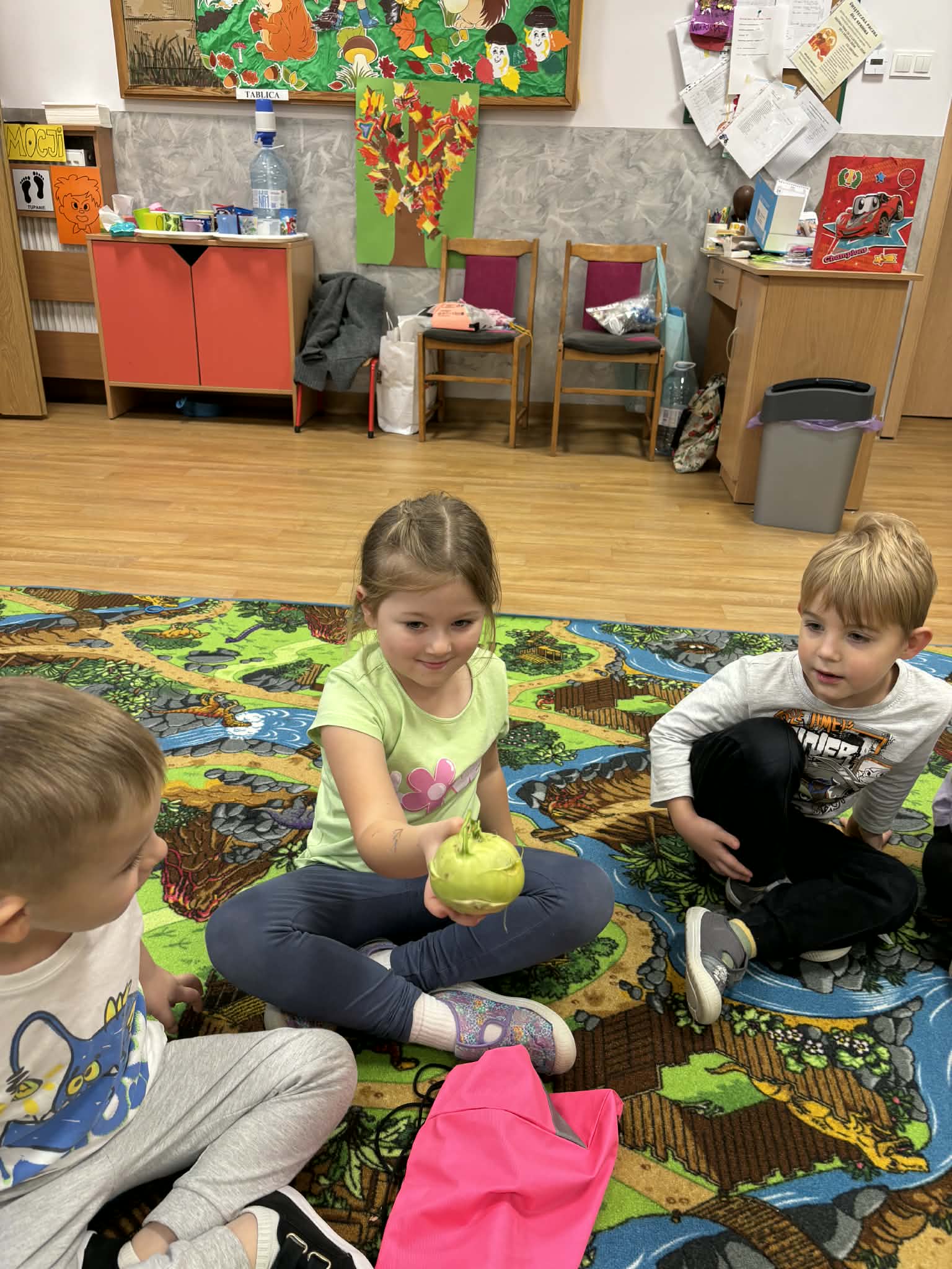 Podczas zajęć, Pszczółki szukały kolejnego składnika odżywczego, który ukrył się w małym i trochę zapomnianym warzywie. Dzieci za pomocą dotyku, smaku i zapachu, próbowały odgadnąć nazwę tej zielonej kuli. Było trudno. Podczas zabaw ruchowych, usprawniały dużą motorykę i świadomość własnego ciała. Wykonały pracę plastyczną- kalarepka, a za ogromne zaangażowanie zdobyły kolejny składnik do skarbca- wapń.