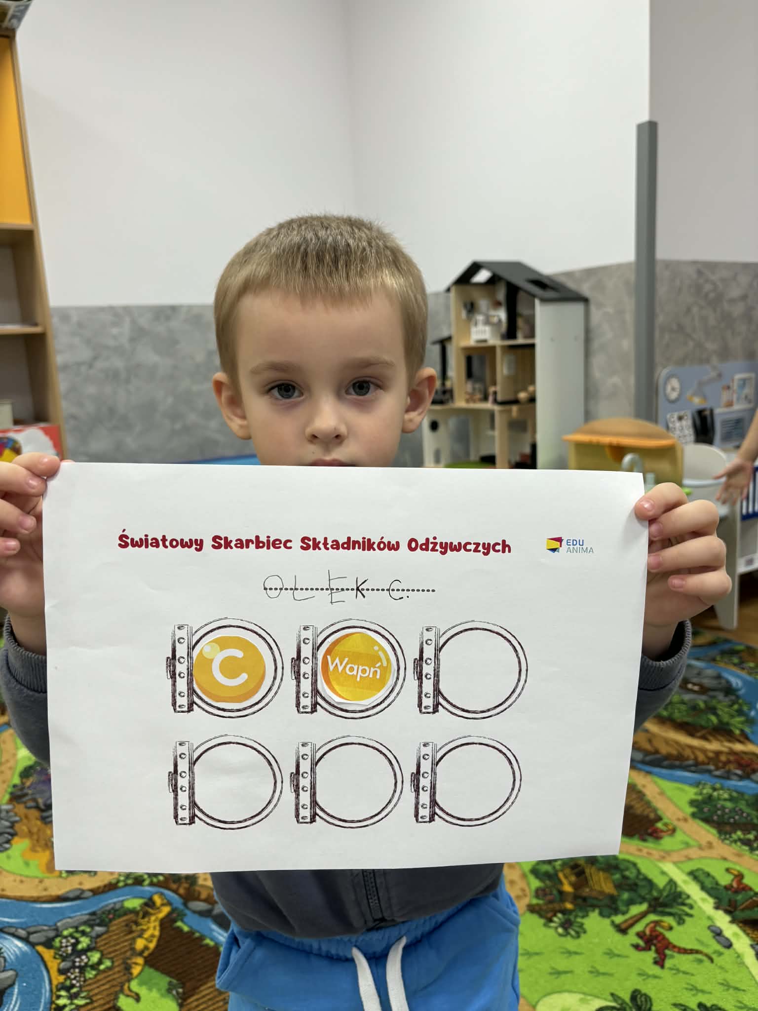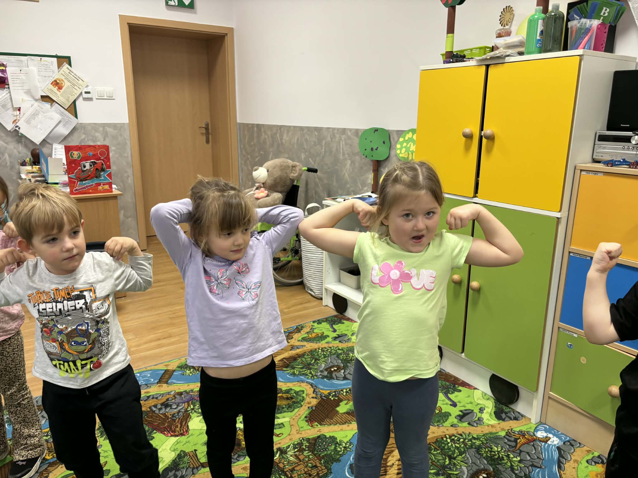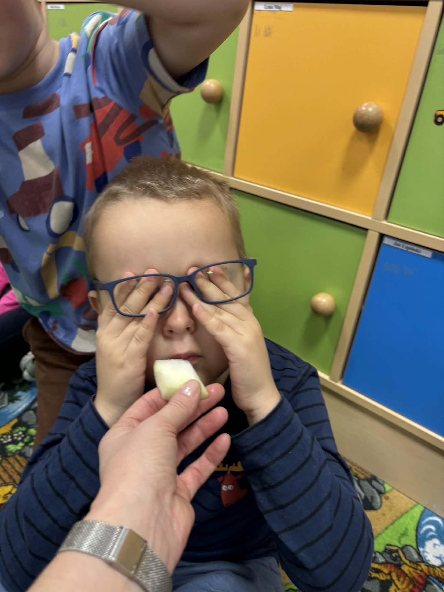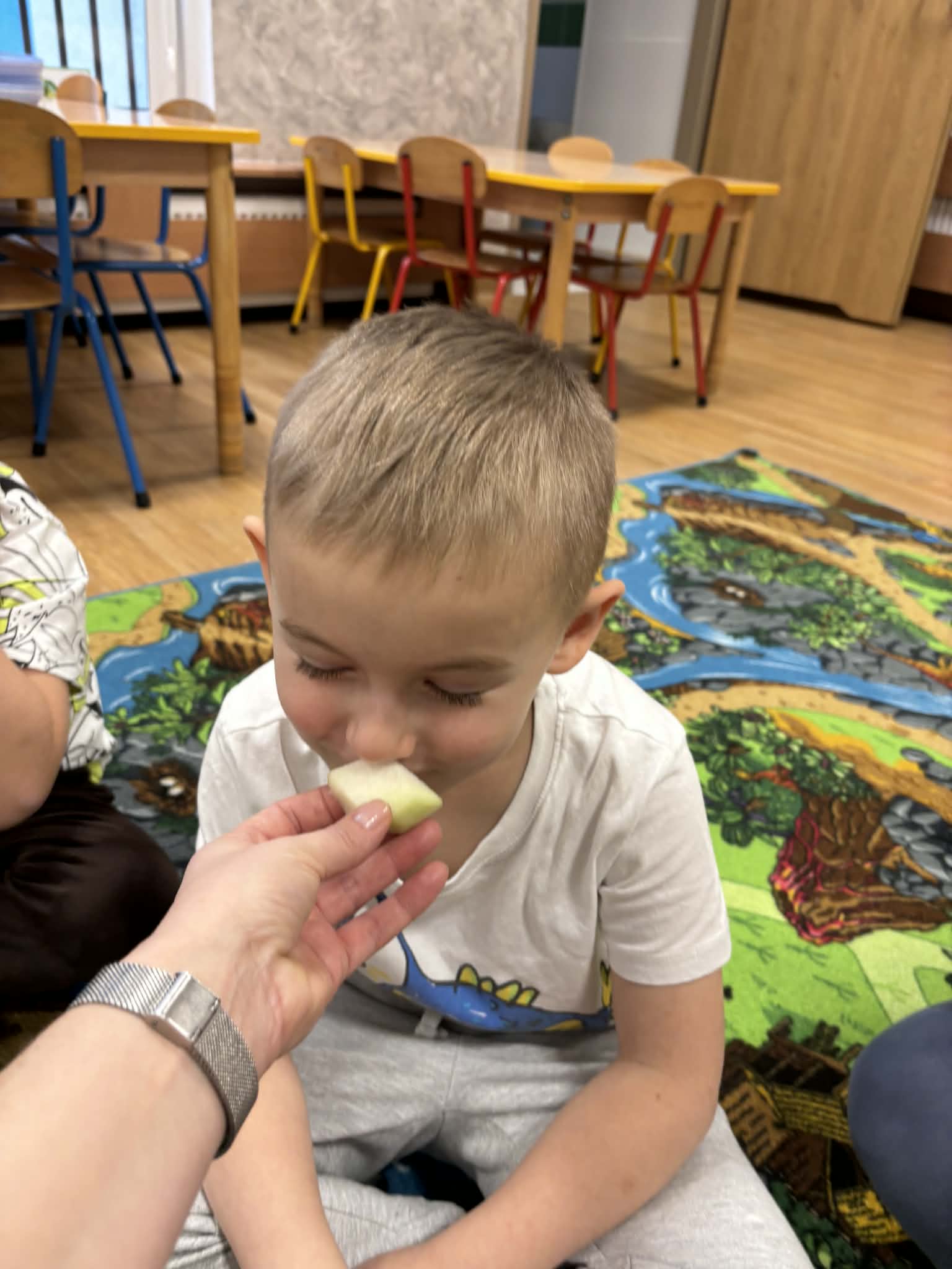 Podczas zajęć, Pszczółki szukały kolejnego składnika odżywczego, który ukrył się w małym i trochę zapomnianym warzywie. Dzieci za pomocą dotyku, smaku i zapachu, próbowały odgadnąć nazwę tej zielonej kuli. Było trudno. Podczas zabaw ruchowych, usprawniały dużą motorykę i świadomość własnego ciała. Wykonały pracę plastyczną- kalarepka, a za ogromne zaangażowanie zdobyły kolejny składnik do skarbca- wapń.
