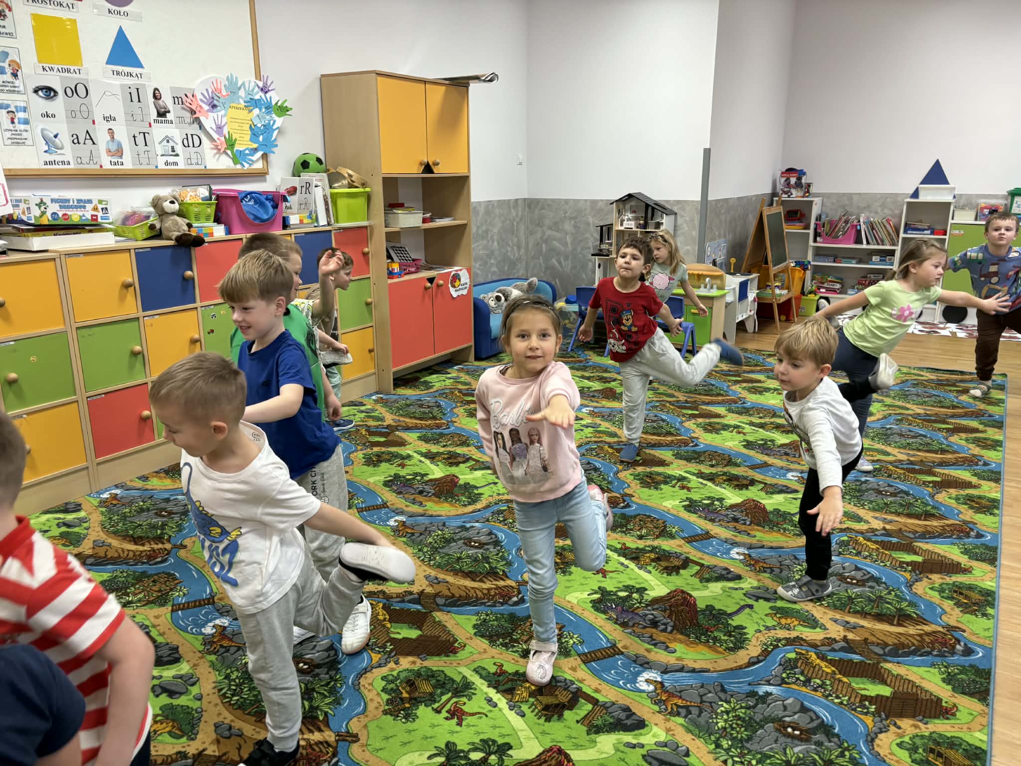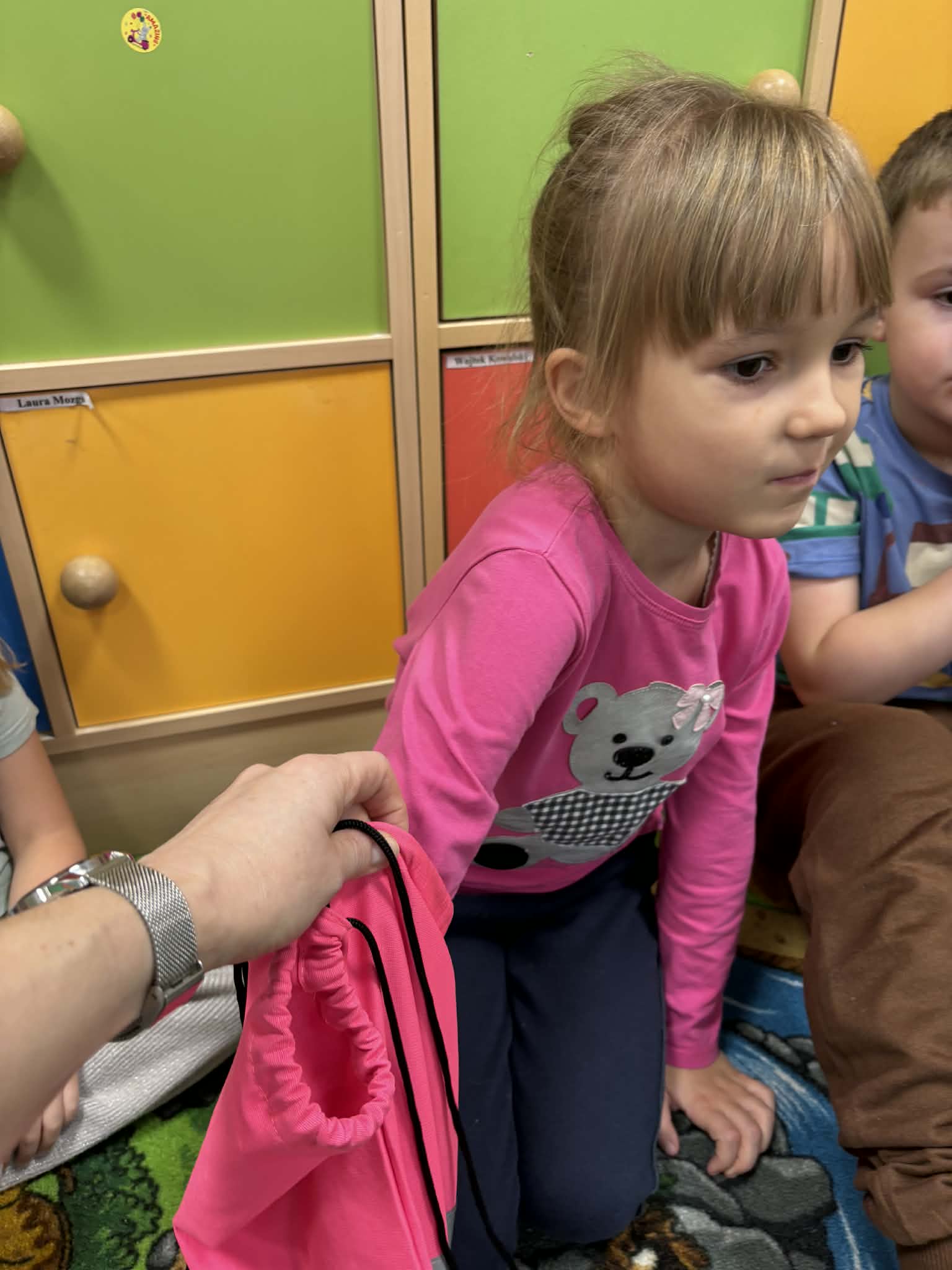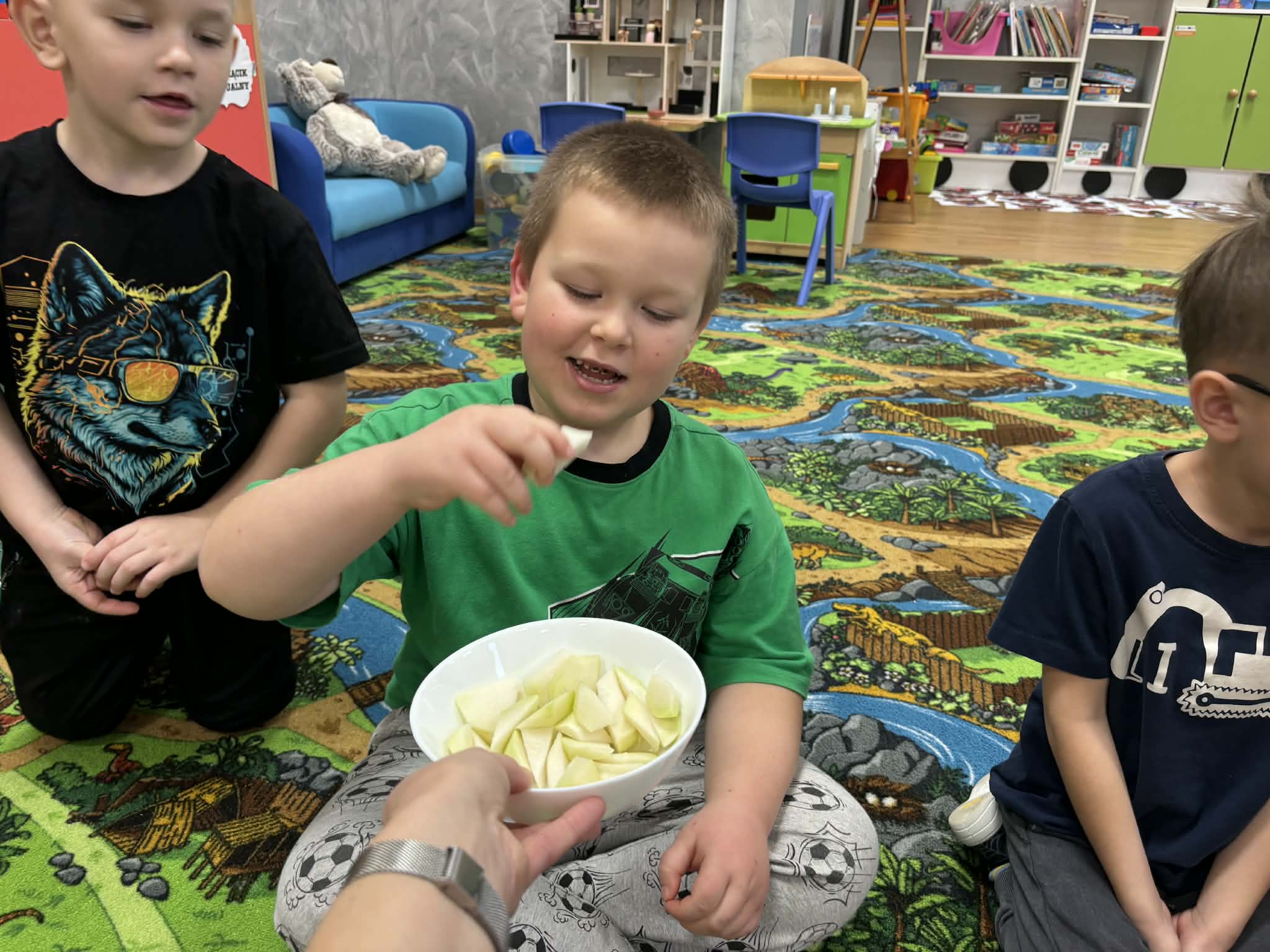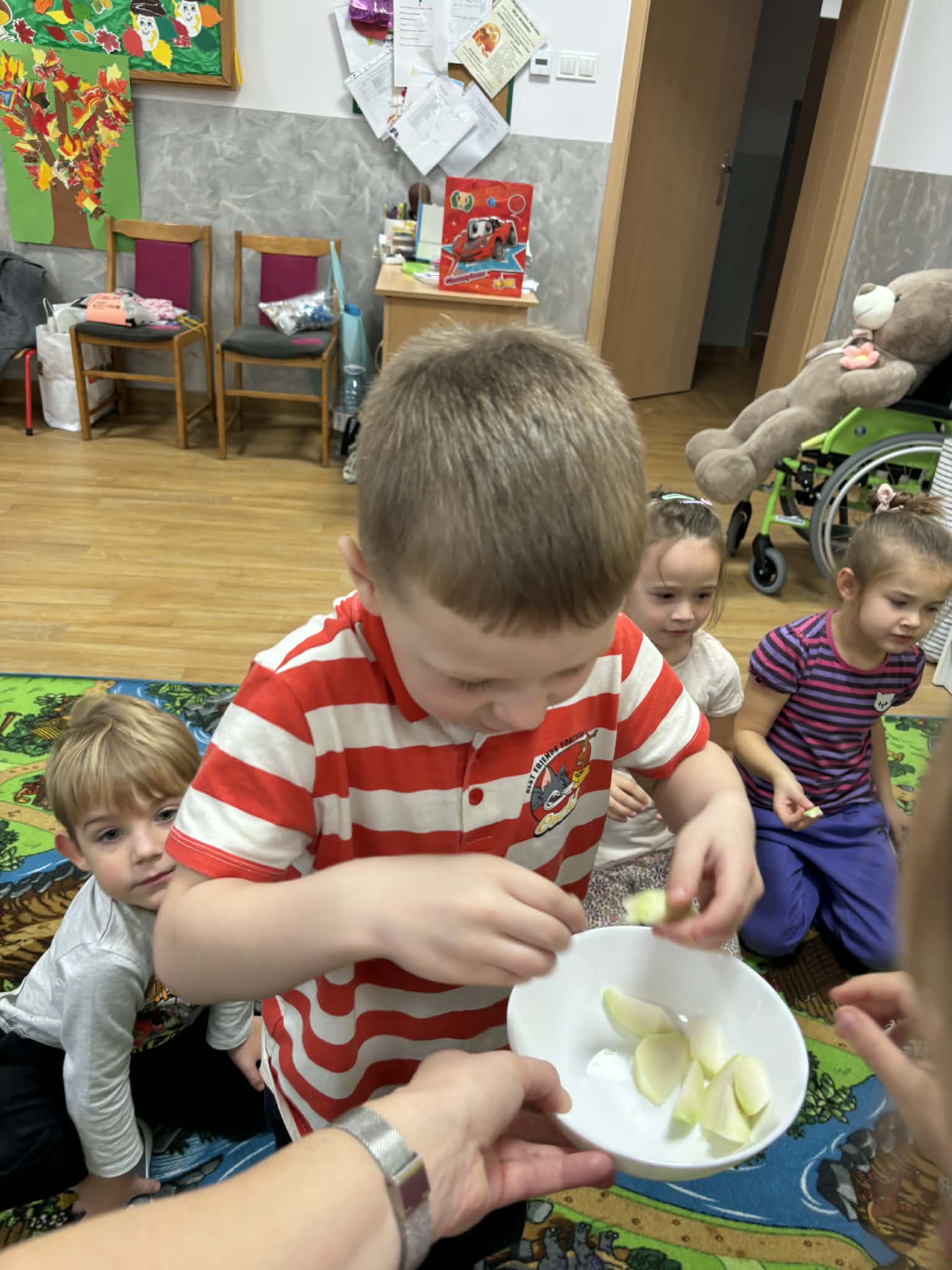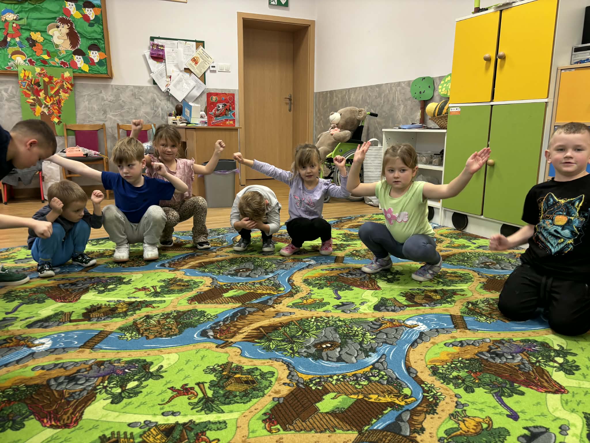 Podczas zajęć, Pszczółki szukały kolejnego składnika odżywczego, który ukrył się w małym i trochę zapomnianym warzywie. Dzieci za pomocą dotyku, smaku i zapachu, próbowały odgadnąć nazwę tej zielonej kuli. Było trudno. Podczas zabaw ruchowych, usprawniały dużą motorykę i świadomość własnego ciała. Wykonały pracę plastyczną- kalarepka, a za ogromne zaangażowanie zdobyły kolejny składnik do skarbca- wapń.