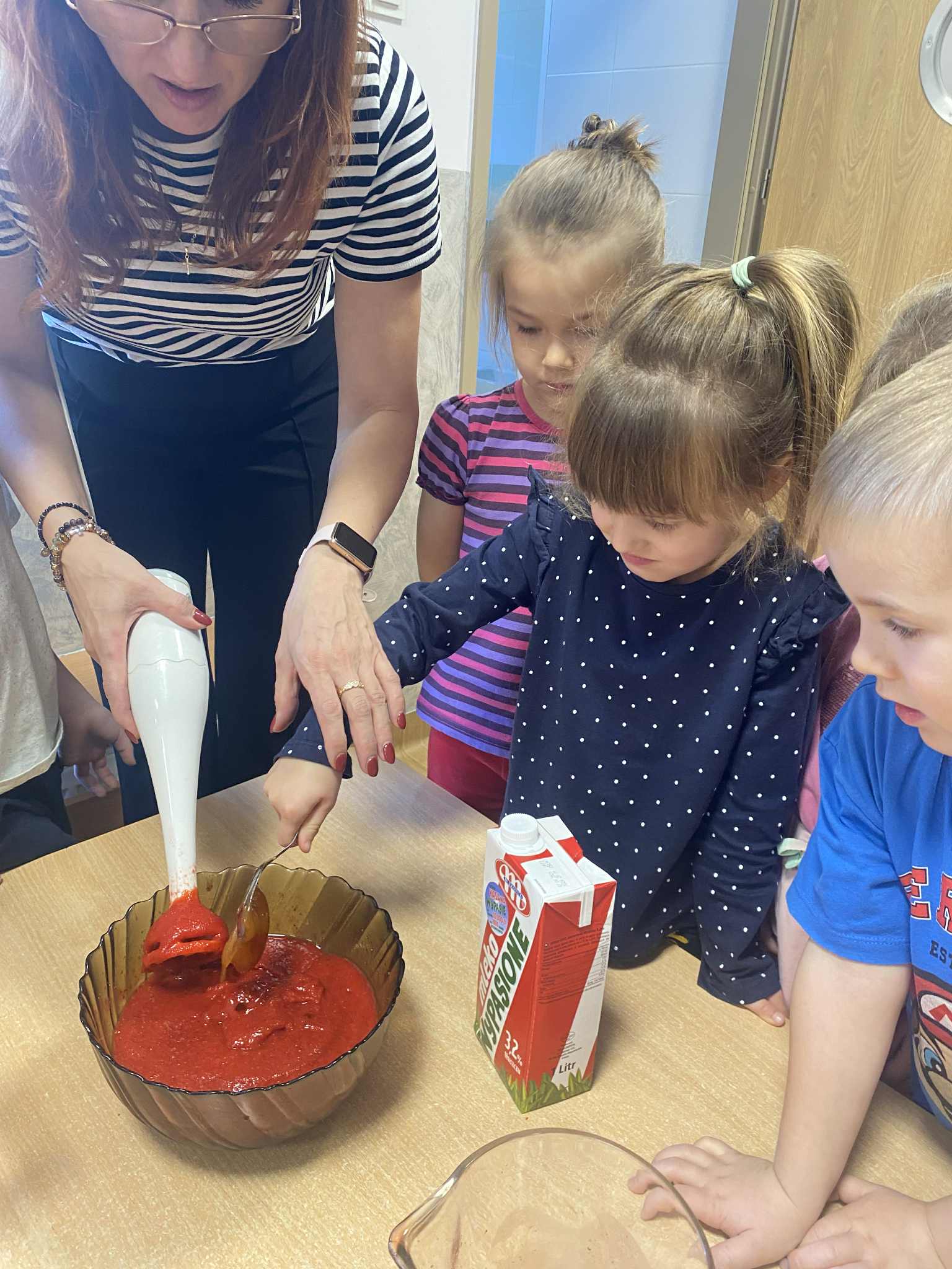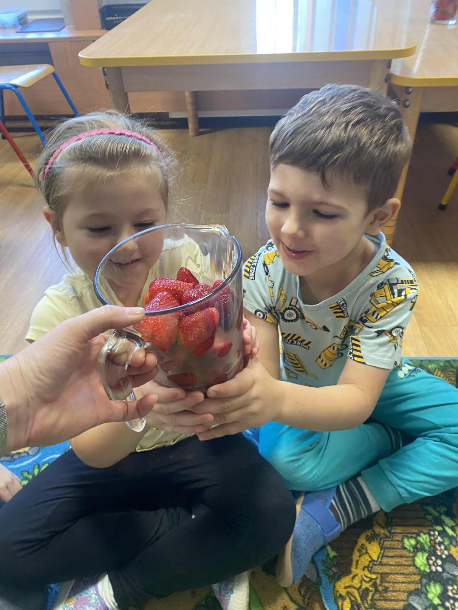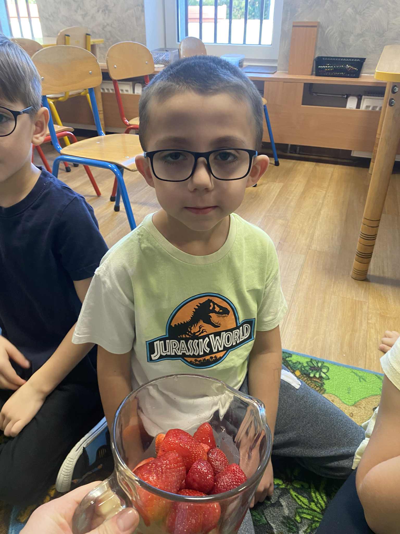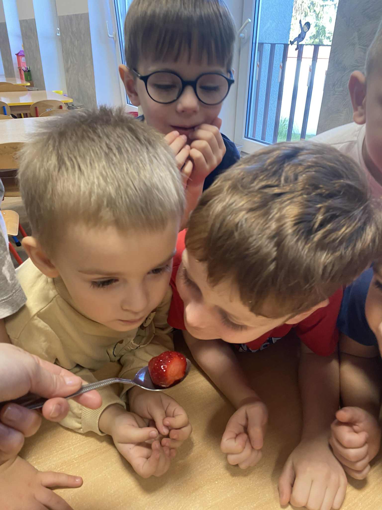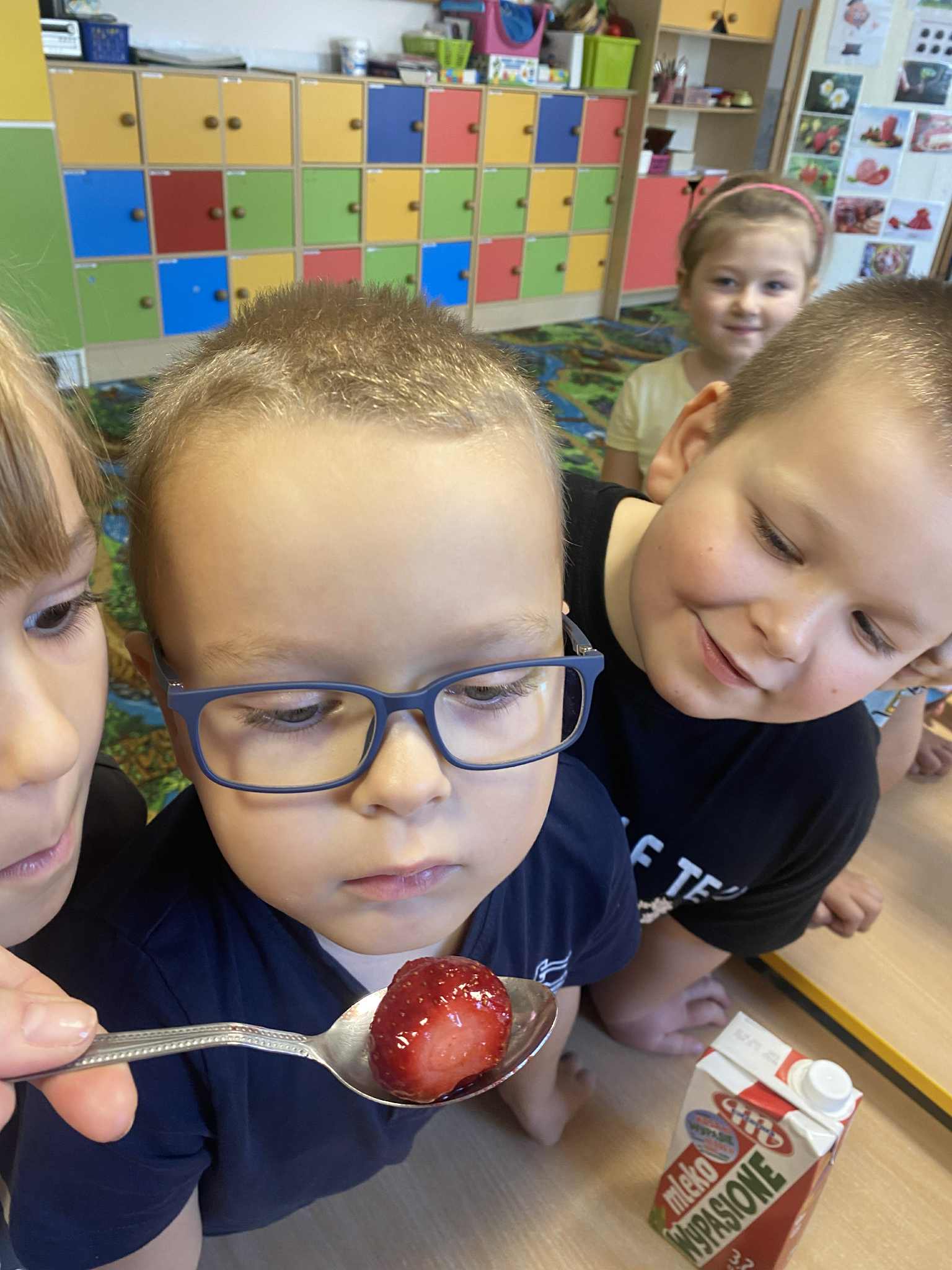 Pszczółki otrzymały od profesora Animka pierwsze zadanie do wykonania. Po wysłuchaniu piosenki i udzieleniu odpowiedzi na ,,smaczne zagadki", dzieci już wiedziały, że pierwszy owoc to truskawka i witamina C, która musi znaleźć się w skarbcu. Podczas zajęć, dzieci wysłuchały również opowiadania Karoliny Machoń pt. ,,Zdrowe ząbki Marysi" i dowiedziały się jakie zastosowanie ma ten smaczny owoc w naszym codziennym życiu. Pszczółki układały historyjkę ,,Od ziarenka do owocu" oraz wykonały pracę plastyczną. Na zakończenie zadania przygotowały koktajl truskawkowy, którym chętnie częstowały panie pracujące w przedszkolu. Czekamy na kolejne zadania.