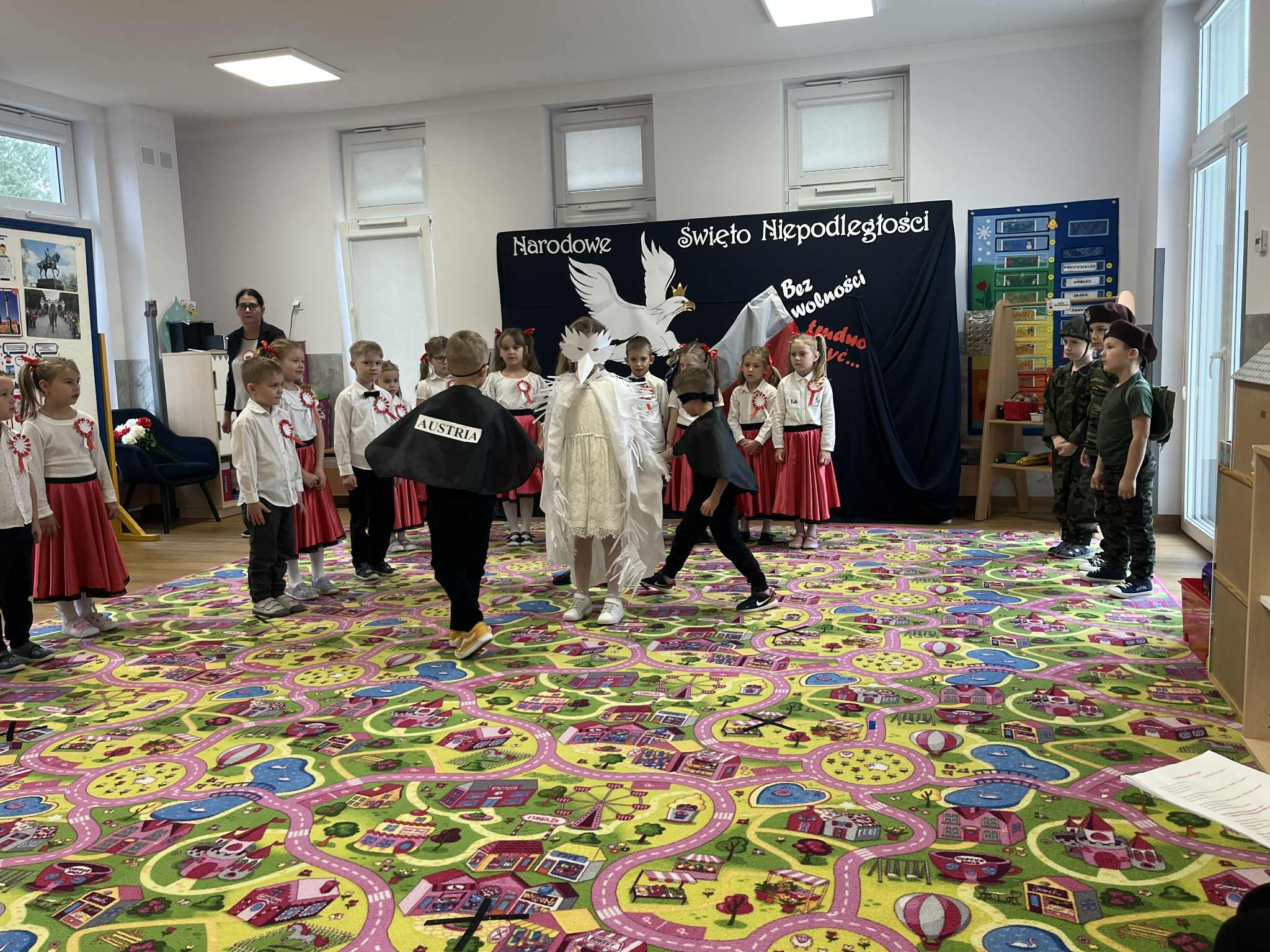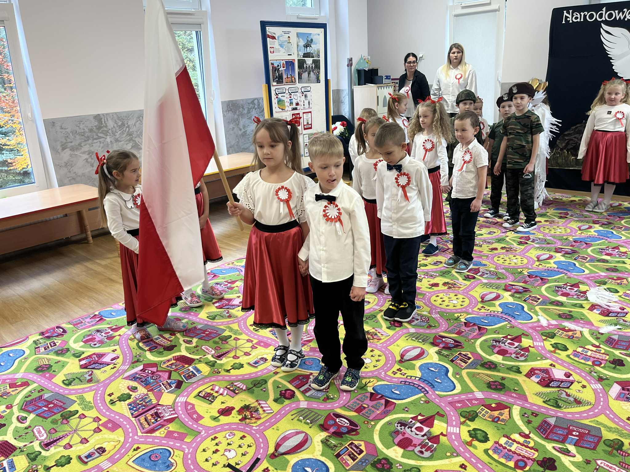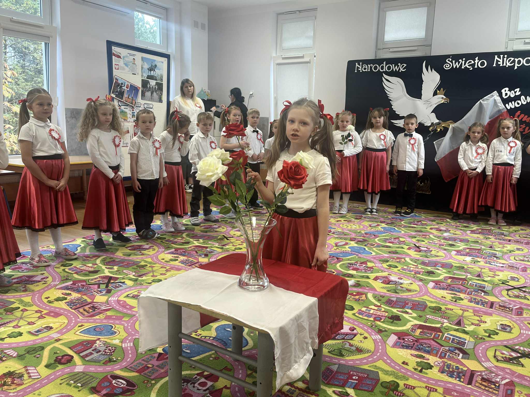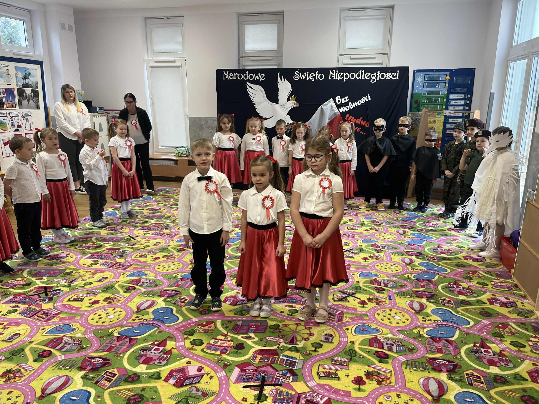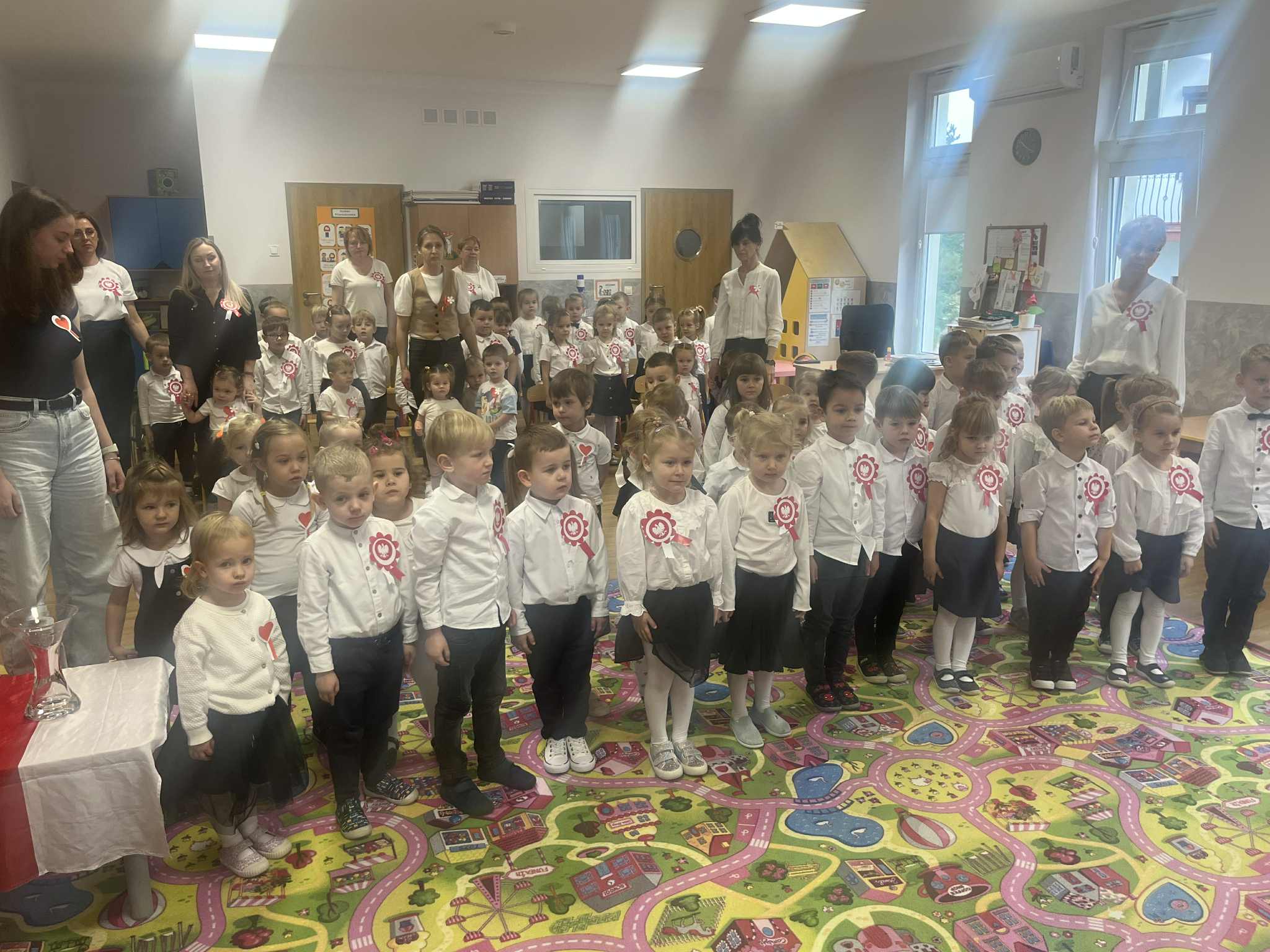W piątek, 7 listopada, w naszym przedszkolu obchodziliśmy Dzień Niepodległości. Tego dnia każdy przedszkolak przyszedł ubrany w strój galowy oraz miał ze sobą kotylion w barwach narodowych. Wszystkie grupy spotkały się wspólnie w sali, gdzie Zerówka przygotowała wspaniały występ artystyczny z okazji tego wyjątkowego święta. Dzieci zaprezentowały piękne wiersze i piosenki patriotyczne, przypominając wszystkim, jak ważna jest miłość do ojczyzny.