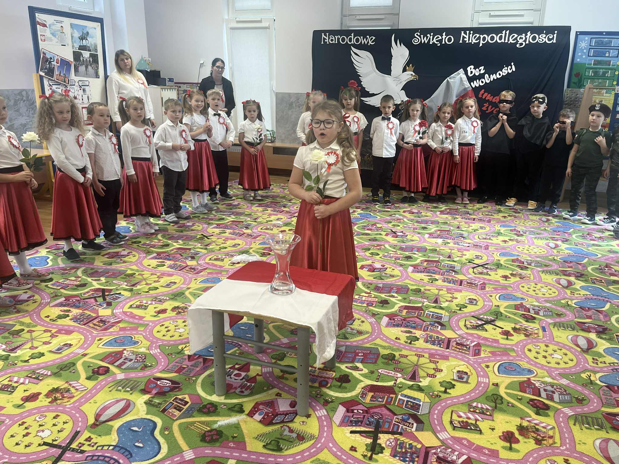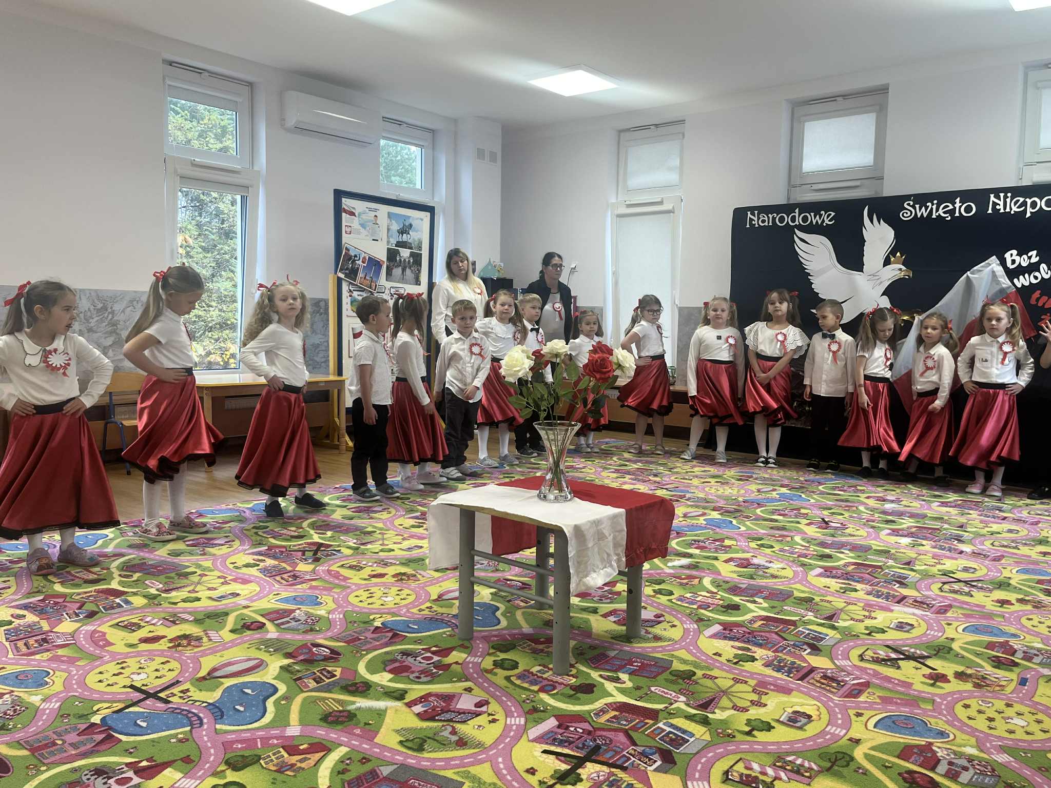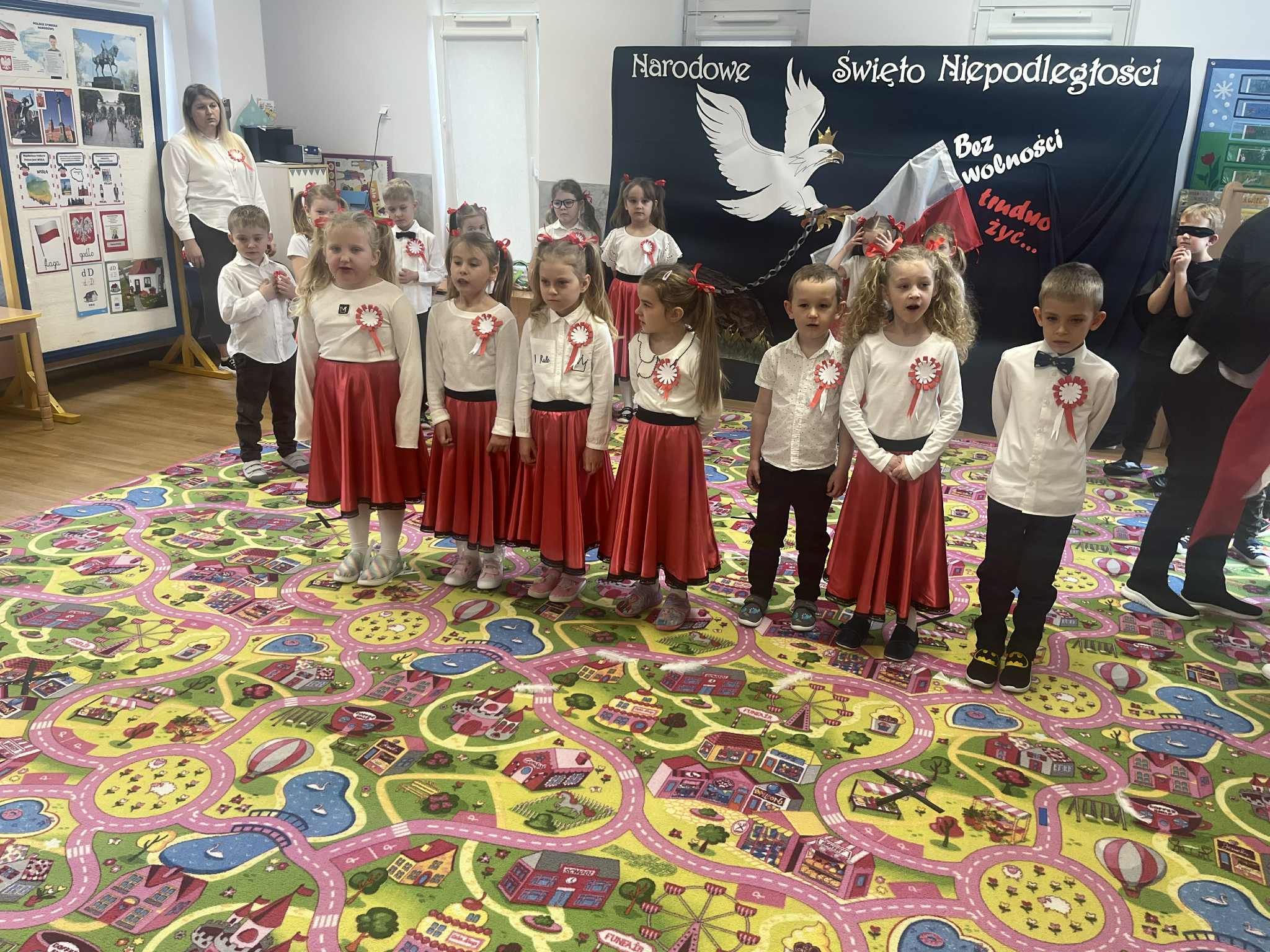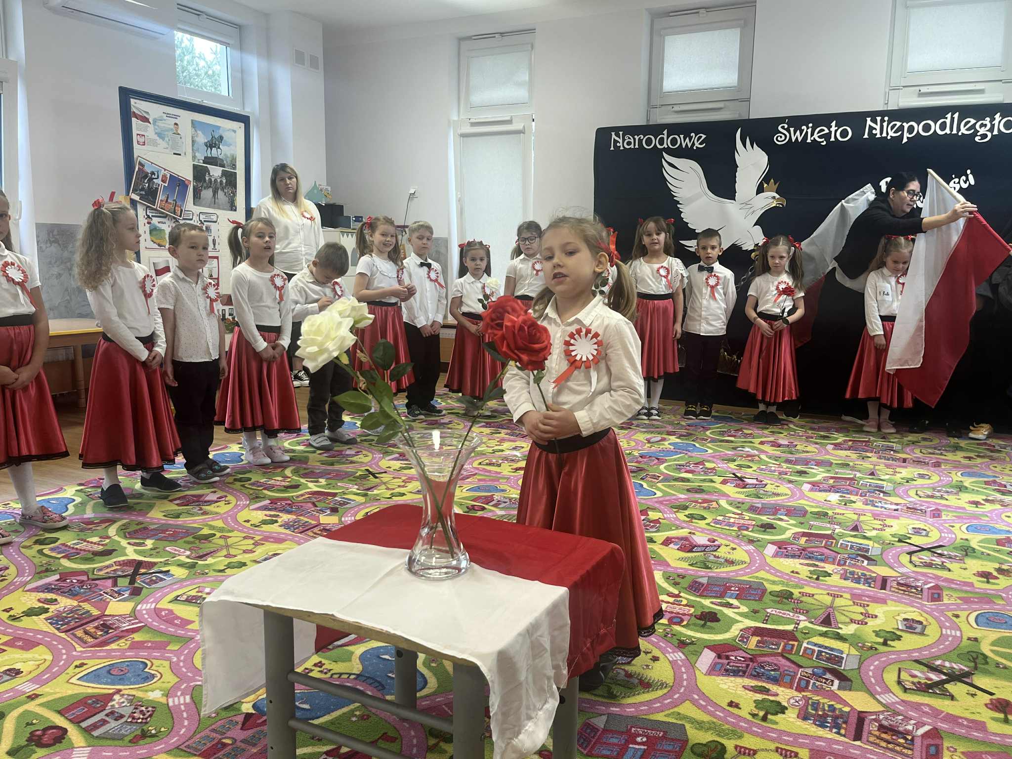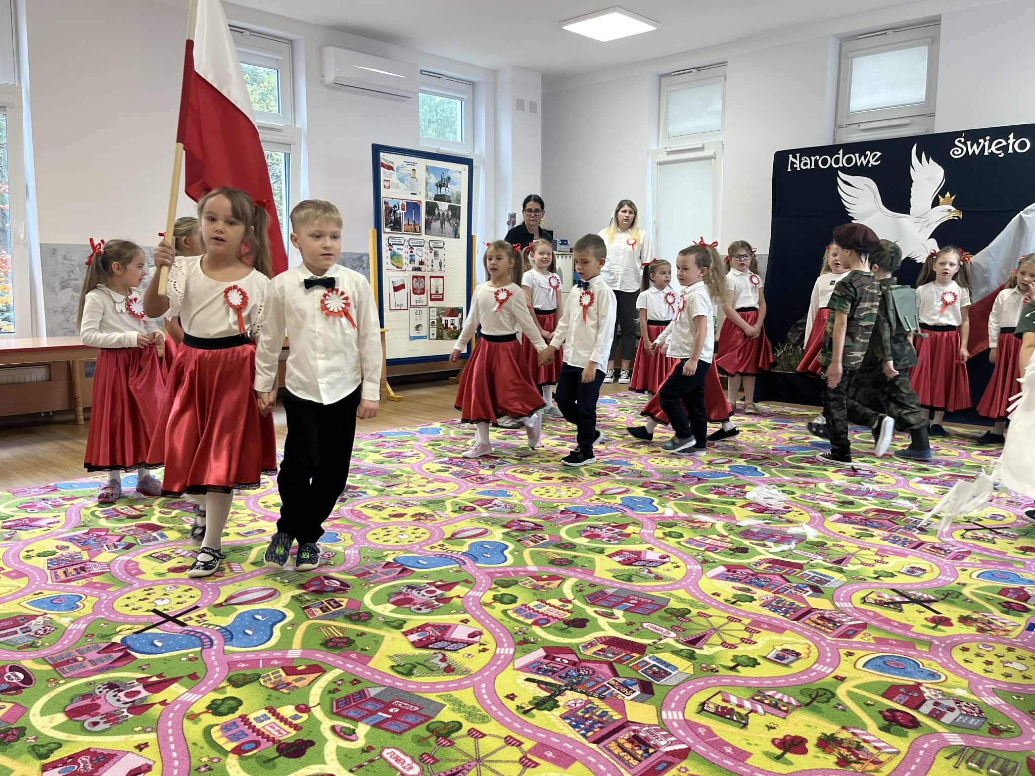 W piątek, 7 listopada, w naszym przedszkolu obchodziliśmy Dzień Niepodległości. Tego dnia każdy przedszkolak przyszedł ubrany w strój galowy oraz miał ze sobą kotylion w barwach narodowych. Wszystkie grupy spotkały się wspólnie w sali, gdzie Zerówka przygotowała wspaniały występ artystyczny z okazji tego wyjątkowego święta. Dzieci zaprezentowały piękne wiersze i piosenki patriotyczne, przypominając wszystkim, jak ważna jest miłość do ojczyzny.