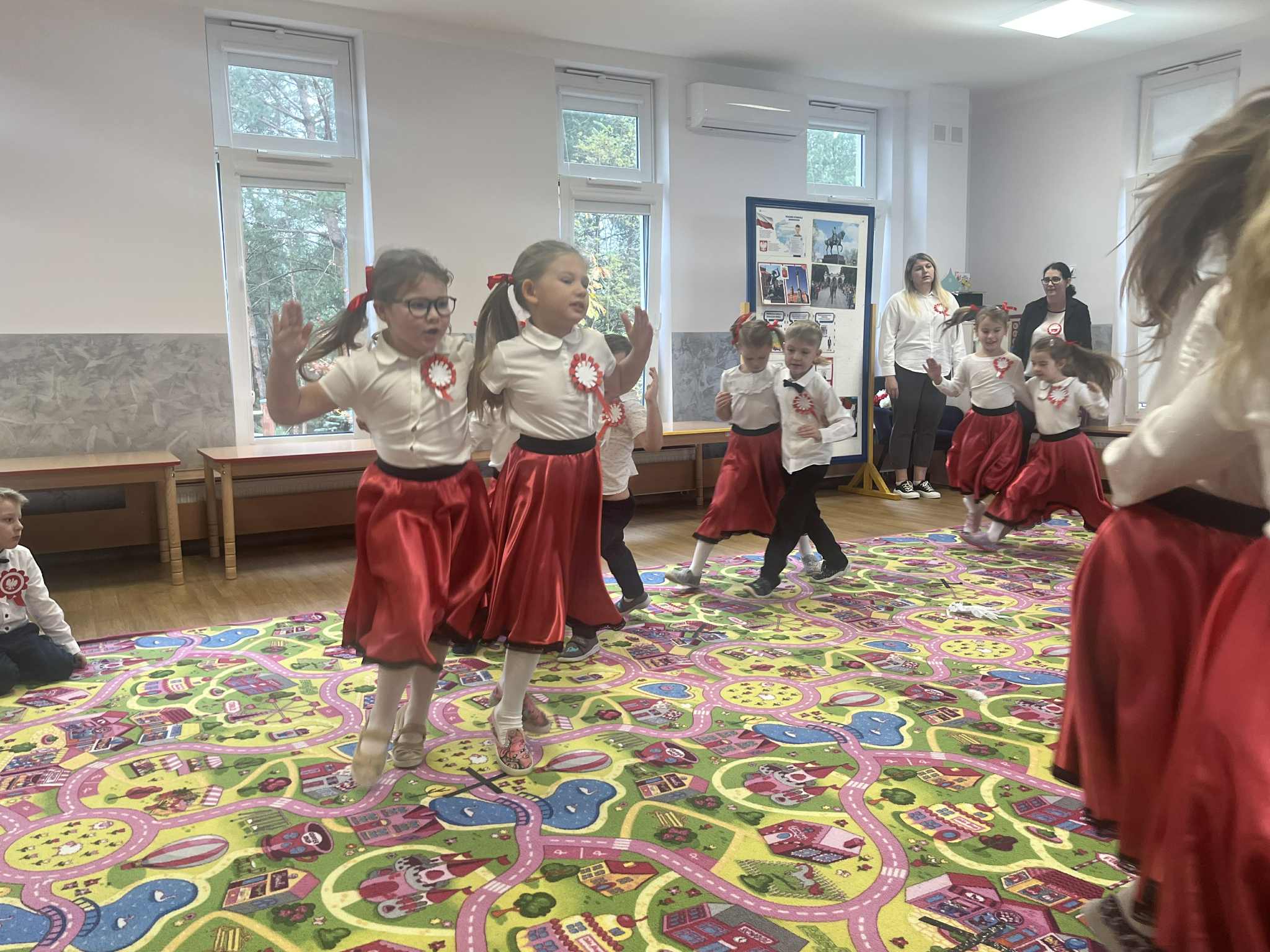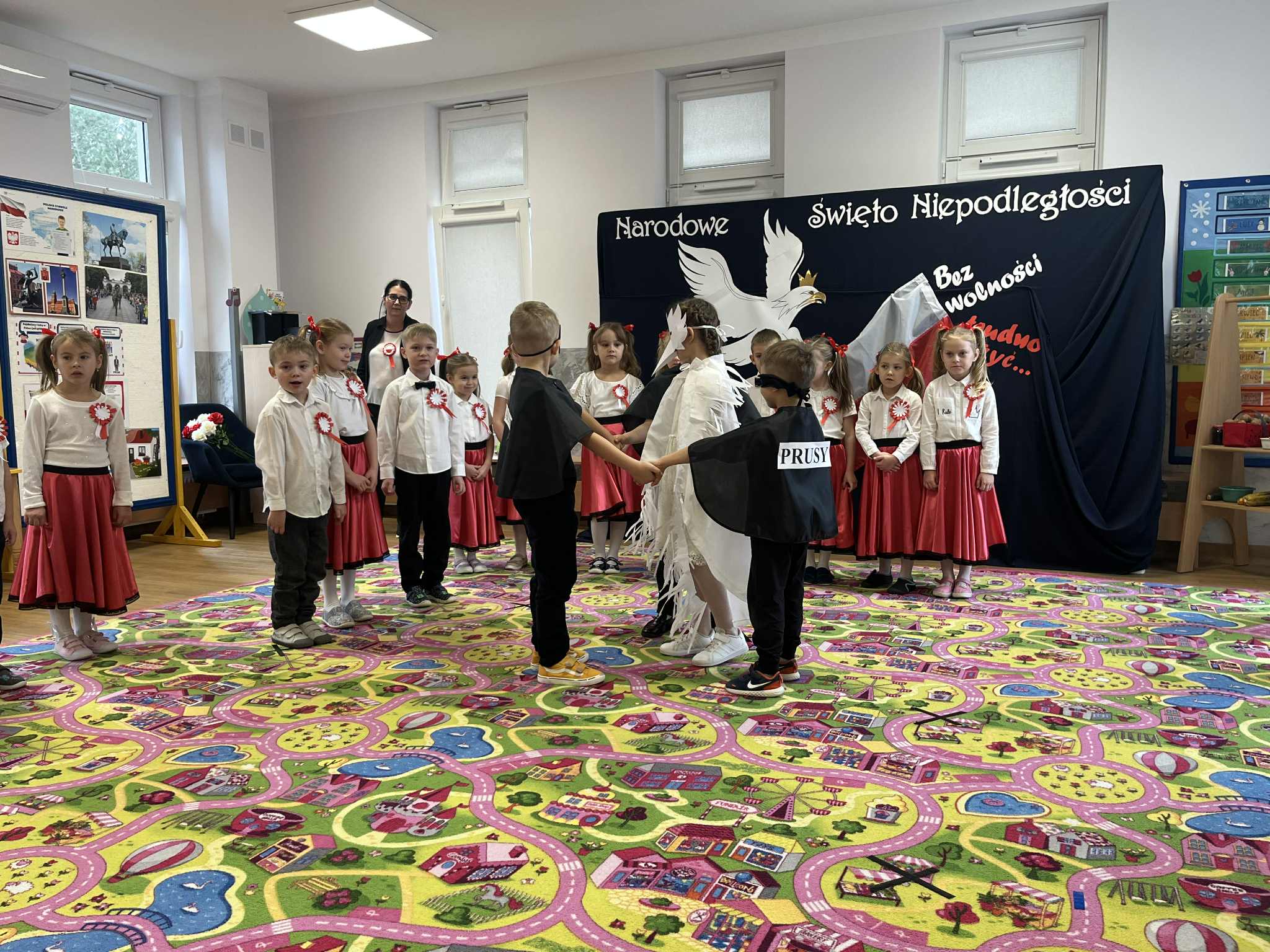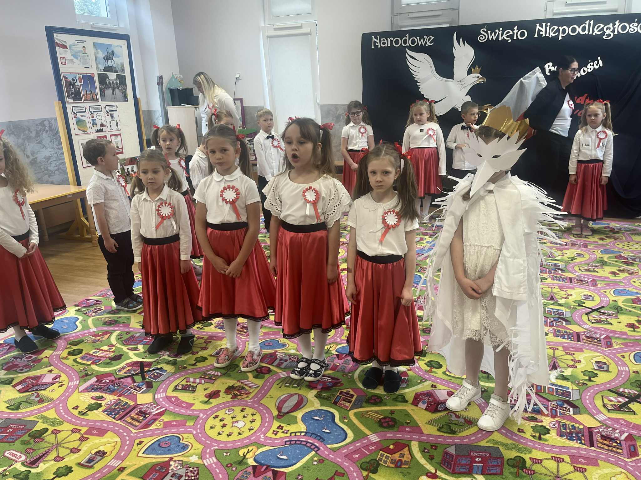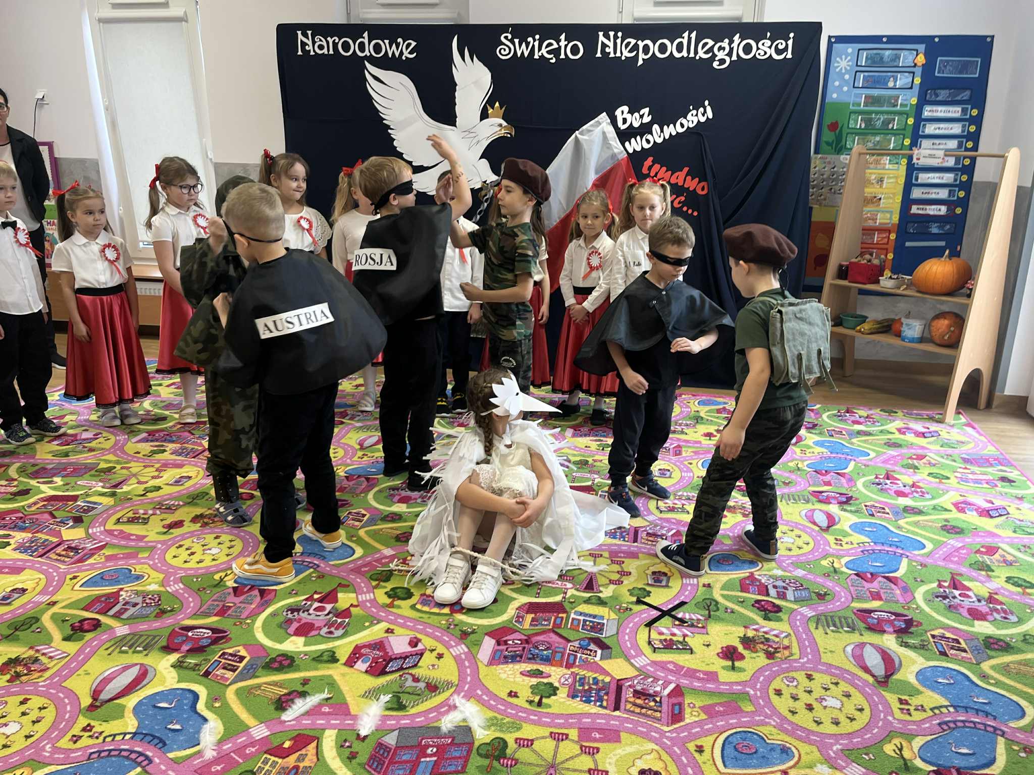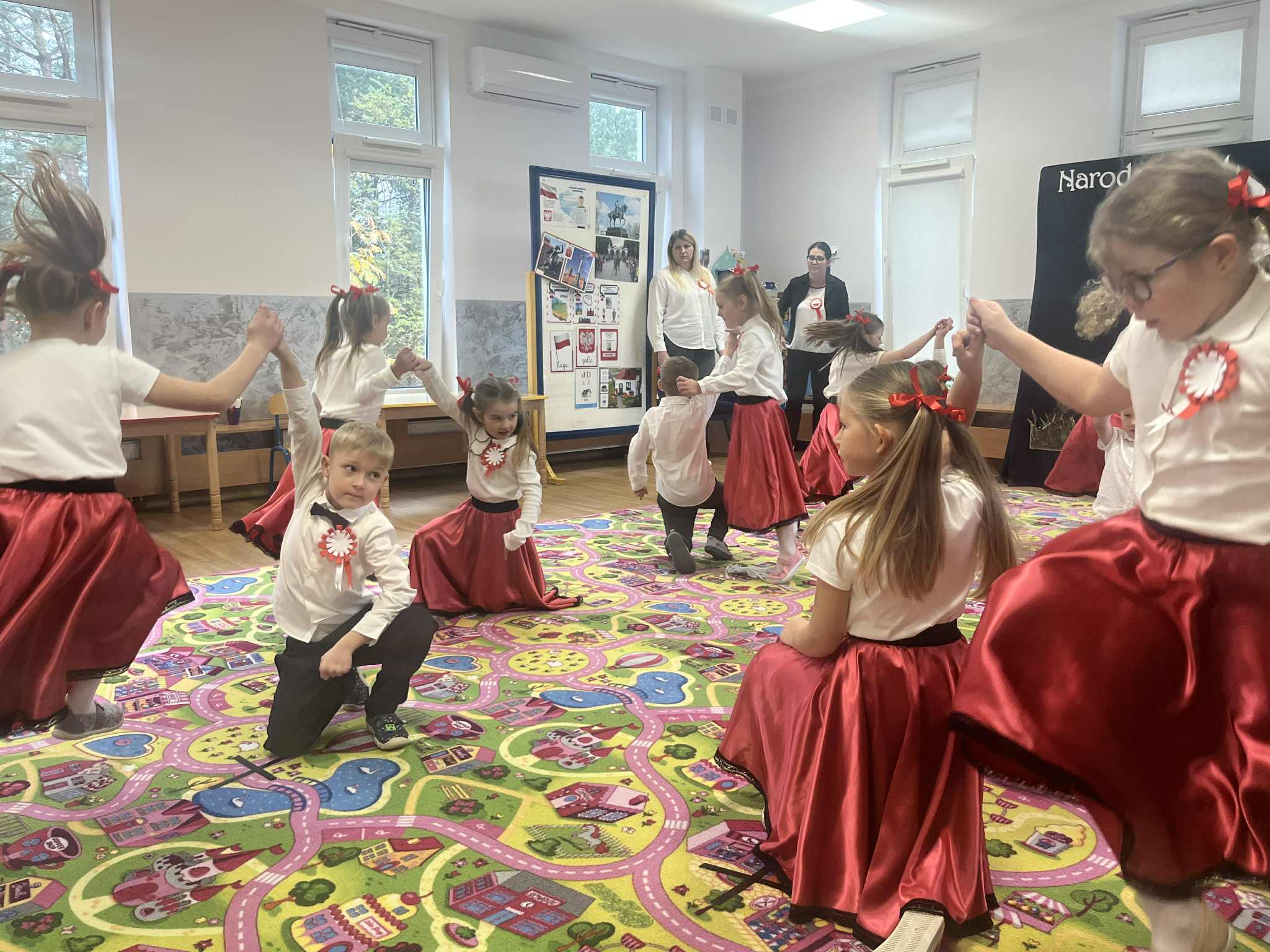 W piątek, 7 listopada, w naszym przedszkolu obchodziliśmy Dzień Niepodległości. Tego dnia każdy przedszkolak przyszedł ubrany w strój galowy oraz miał ze sobą kotylion w barwach narodowych. Wszystkie grupy spotkały się wspólnie w sali, gdzie Zerówka przygotowała wspaniały występ artystyczny z okazji tego wyjątkowego święta. Dzieci zaprezentowały piękne wiersze i piosenki patriotyczne, przypominając wszystkim, jak ważna jest miłość do ojczyzny.