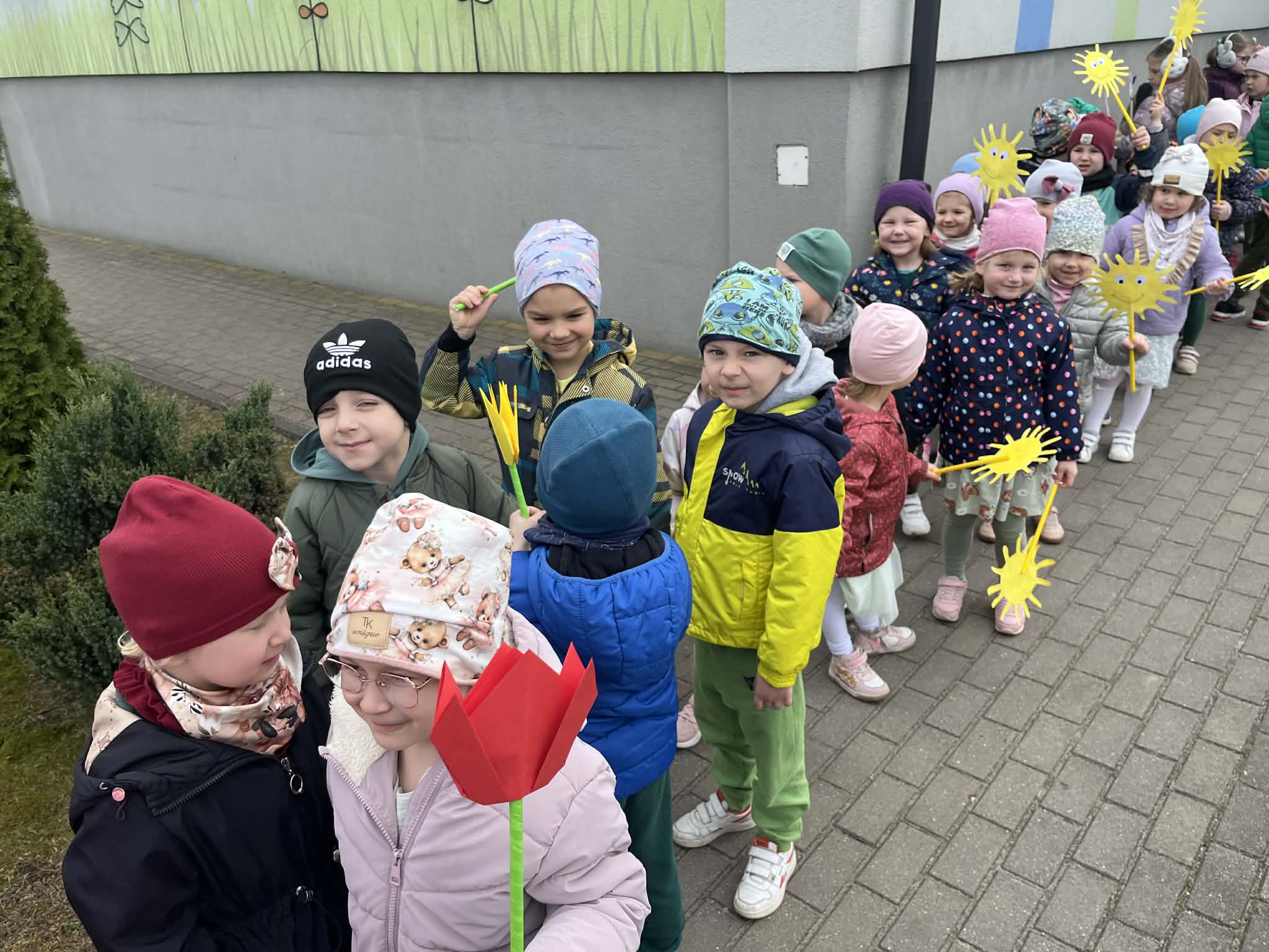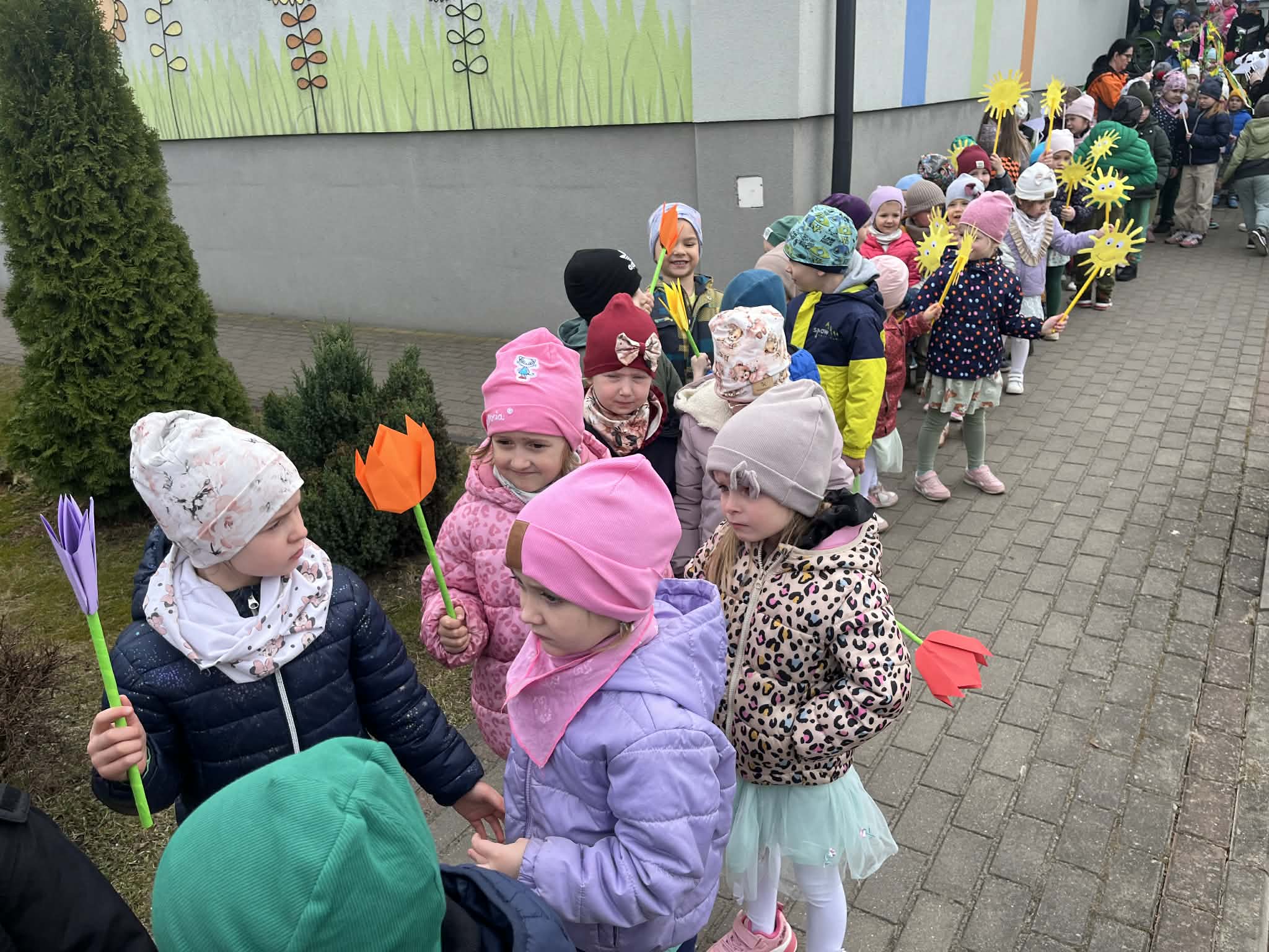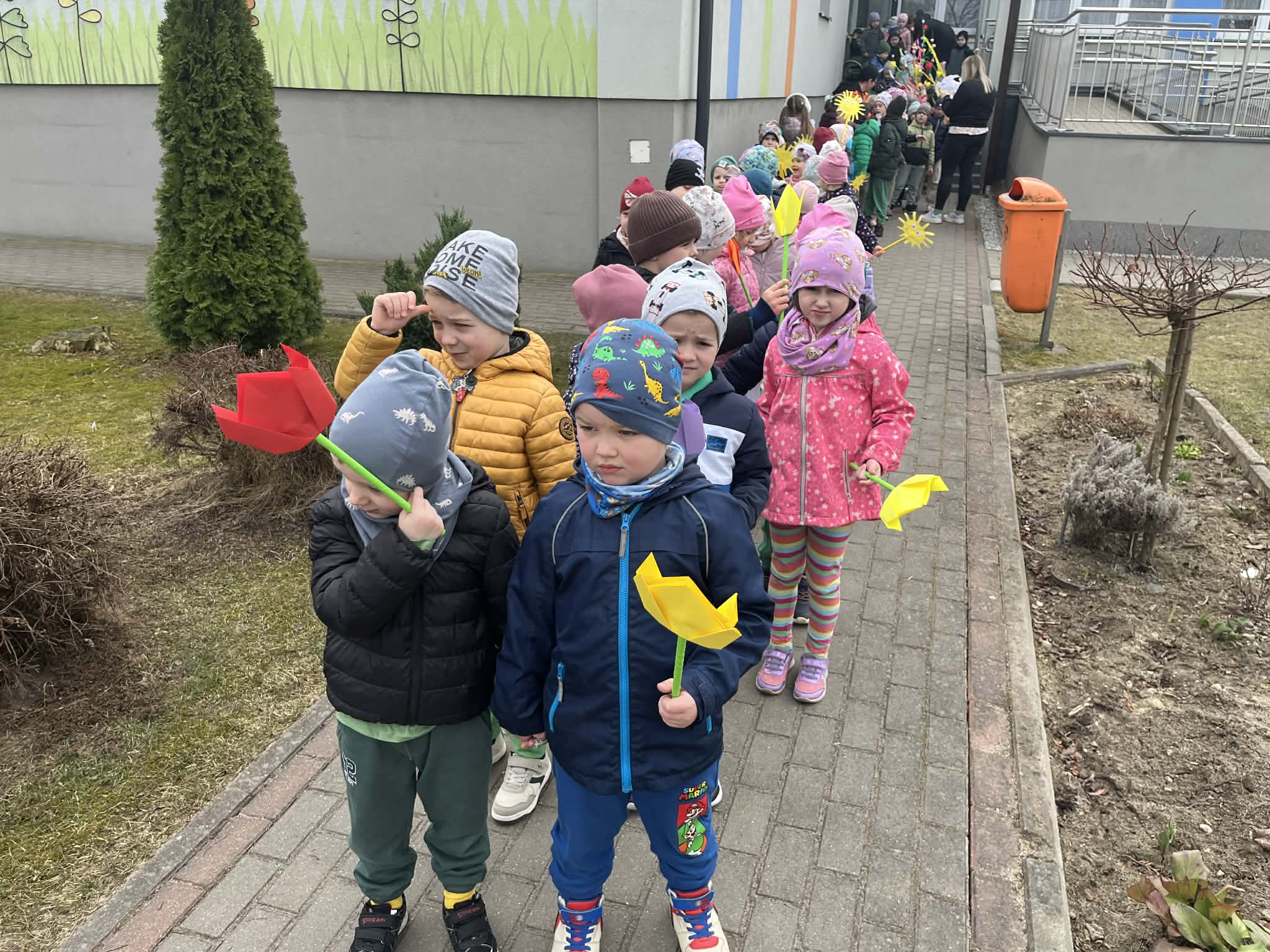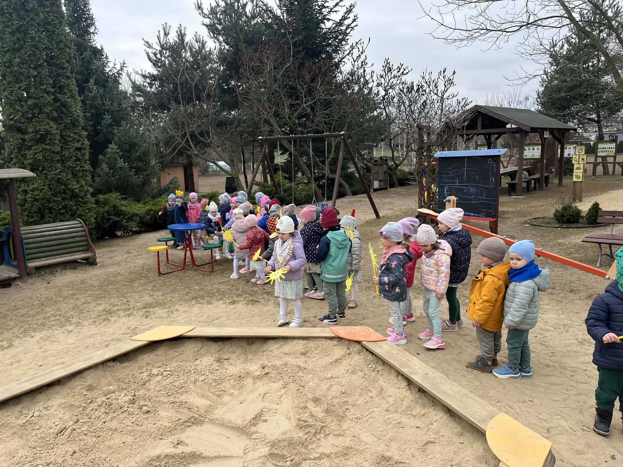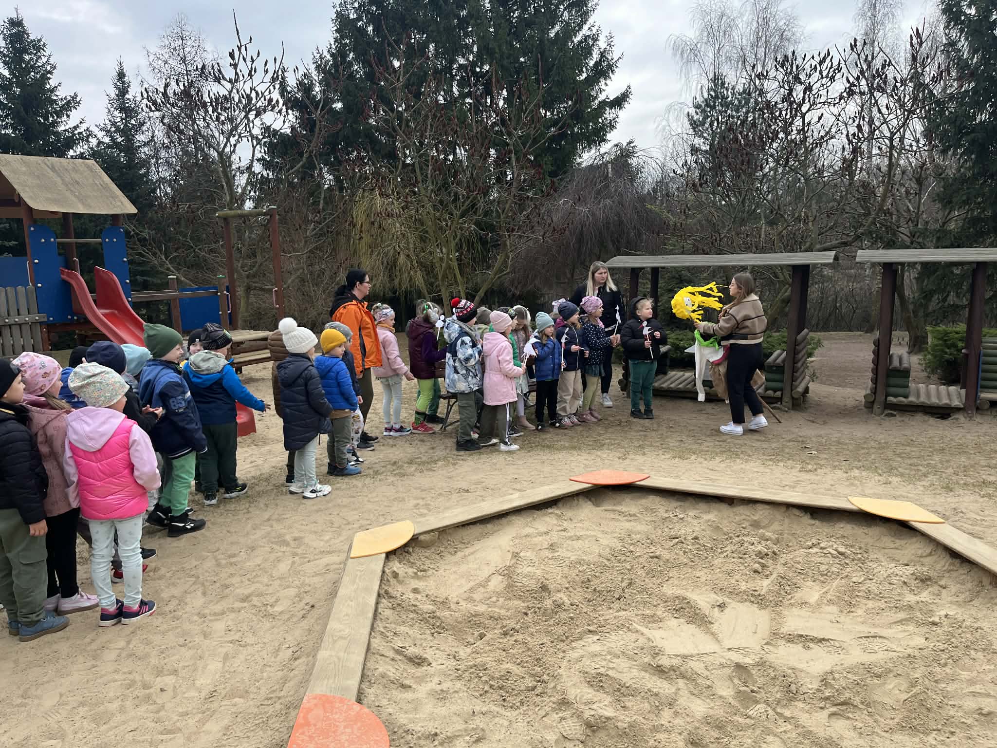 20 marca w naszym przedszkolu radośnie świętowaliśmy Pierwszy Dzień Wiosny. Tego dnia dzieci przyszły ubrane na zielono, aby podkreślić wiosenny charakter wydarzenia. Na początku dnia Pani Wiosna, przygotowała dla każdej grupy ciekawe zadania do wykonania. Dzieci z dużym zaangażowaniem brały w nich udział, wykazując się kreatywnością i współpracą. Nie zabrakło również wspólnych tańców przy wiosennych utworach, które dostarczyły wszystkim wiele radości. Następnie udaliśmy się na spacer z Marzanną i gaikiem, aby symbolicznie pożegnać zimę i powitać wiosnę. Podczas spaceru dzieci głośno wołały: „Marzanno, Marzanno, zimowa panno, ciebie żegnamy, wiosnę witamy!” Po powrocie do przedszkola udaliśmy się na plac zabaw, gdzie w pociągu pozostawiliśmy Marzannę, kończąc tym samym nasze wiosenne obchody. To był dzień pełen uśmiechu, zabawy i wspólnego świętowania!
