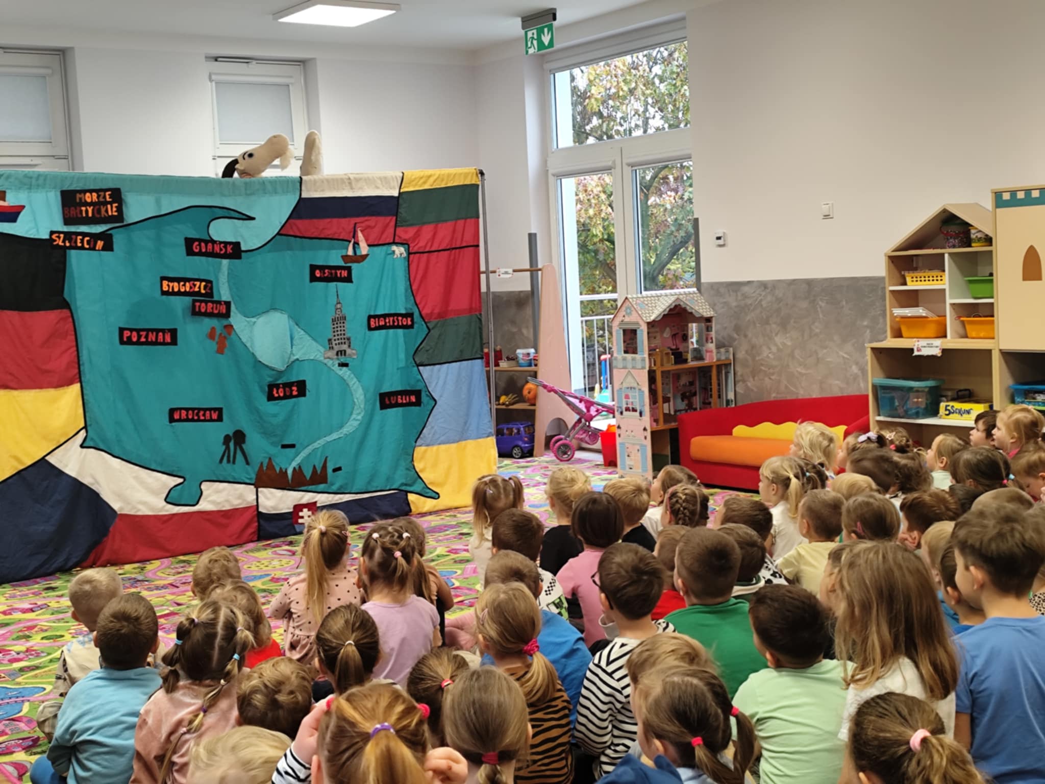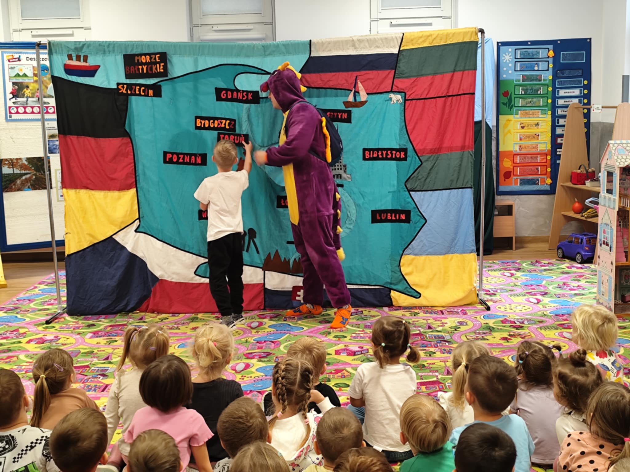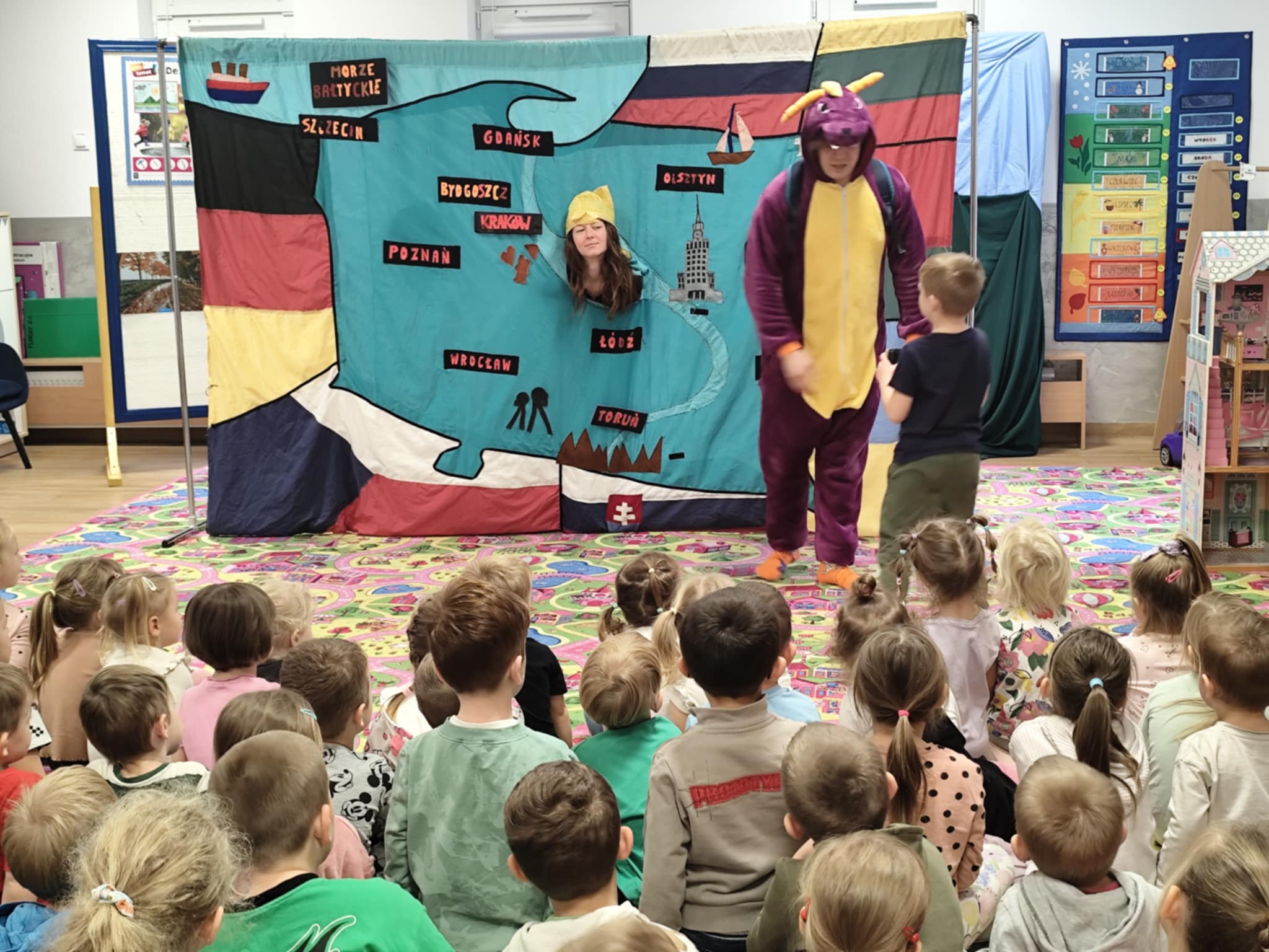 22 października nasze przedszkole odwiedził teatrzyk z przedstawieniem pt. „Po Polsce – podróże małe i duże”. Bohater spektaklu, Smok, chciał wybrać się w podróż do swojego dziadka, który mieszka w Krakowie. Niestety, ktoś pomieszał mapę Polski i pozamieniał miasta! Smok błądził więc po kraju – odwiedził Warszawę, Poznań i Toruń. W każdym z tych miejsc dowiedział się, z czego słynie dane miasto, a przy okazji świetnie się bawił. Na szczęście na końcu udało mu się dotrzeć do Krakowa.