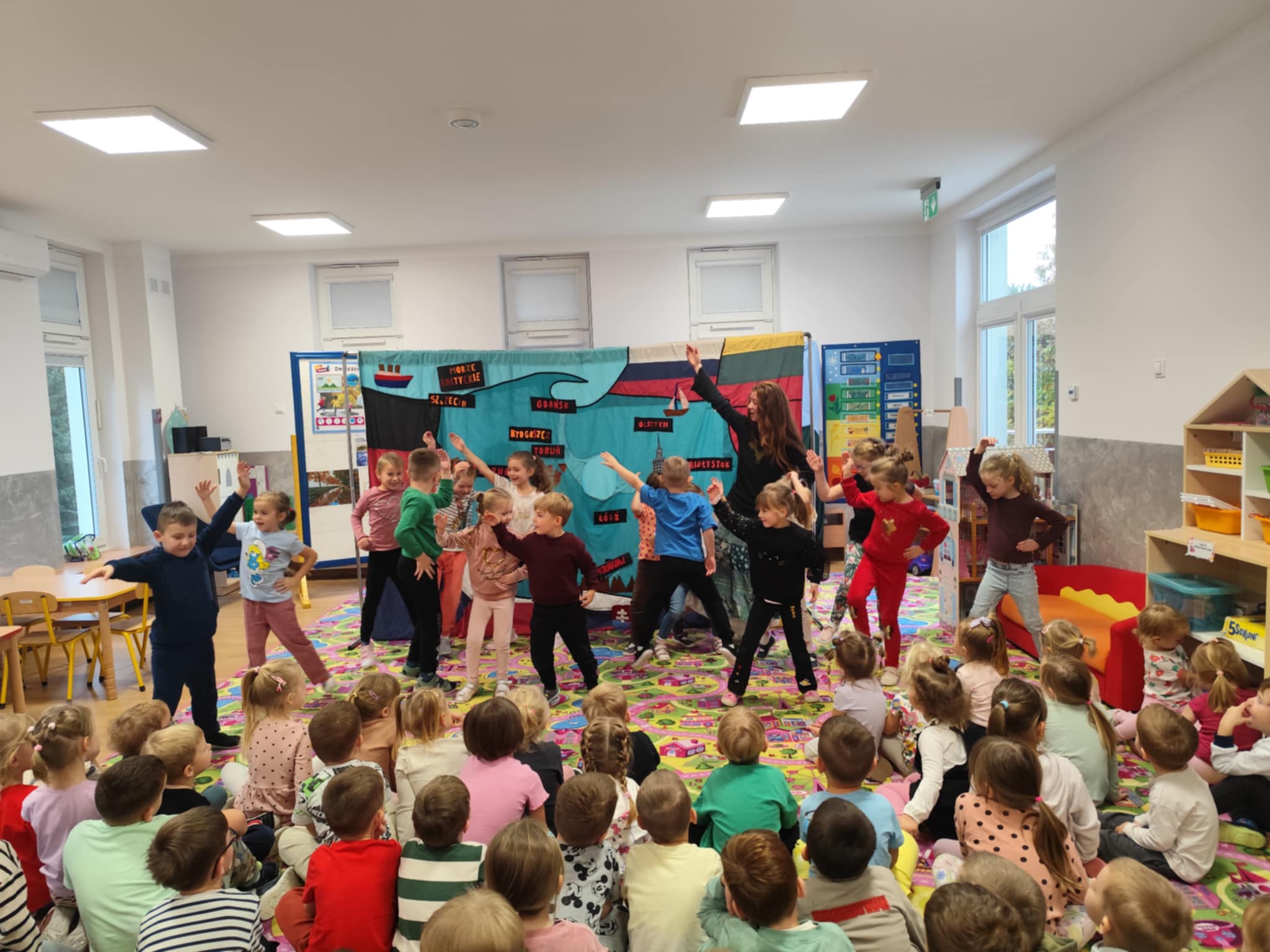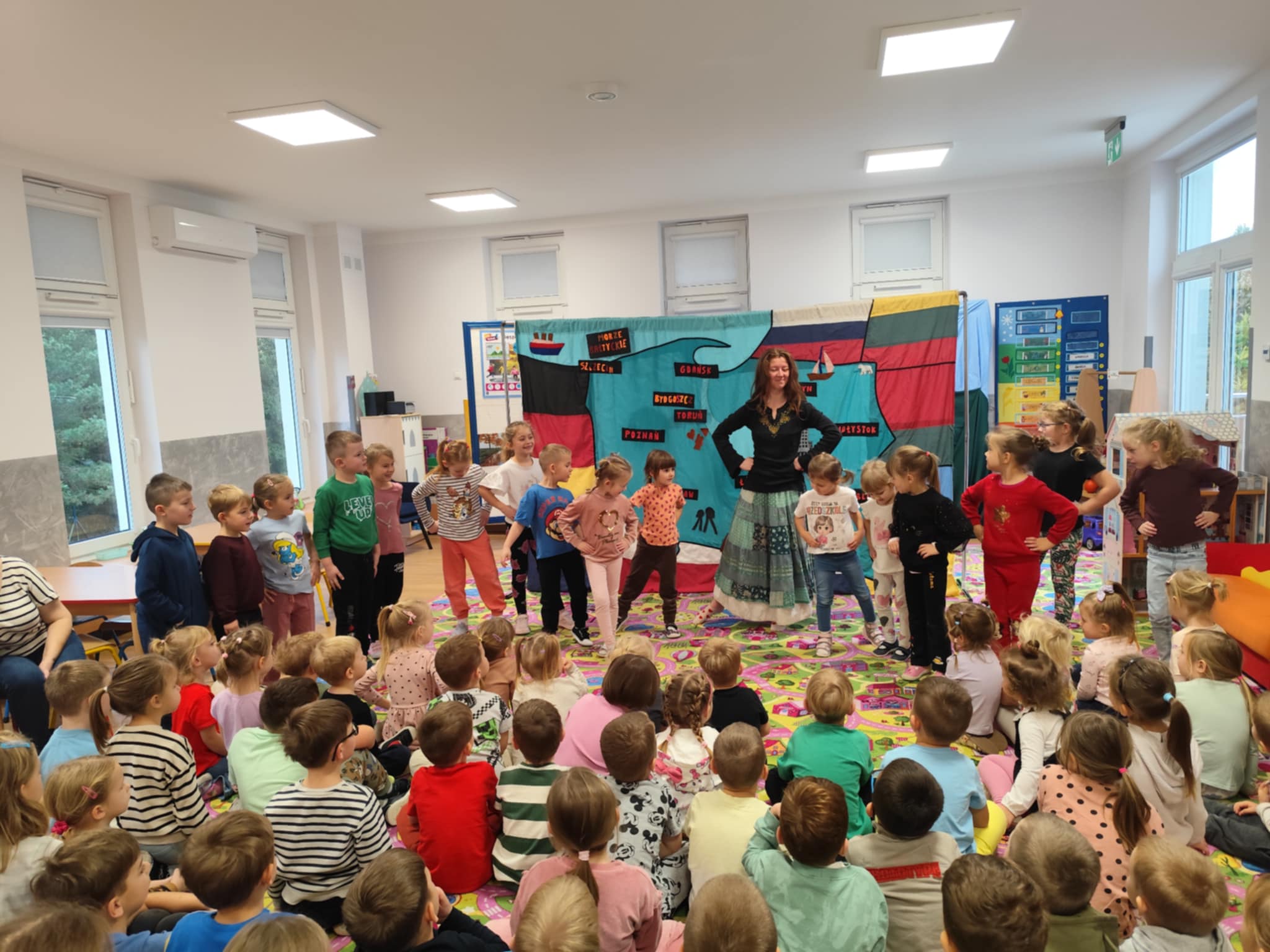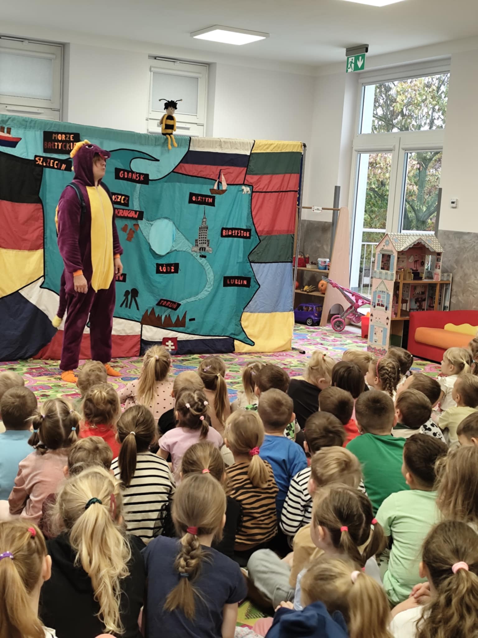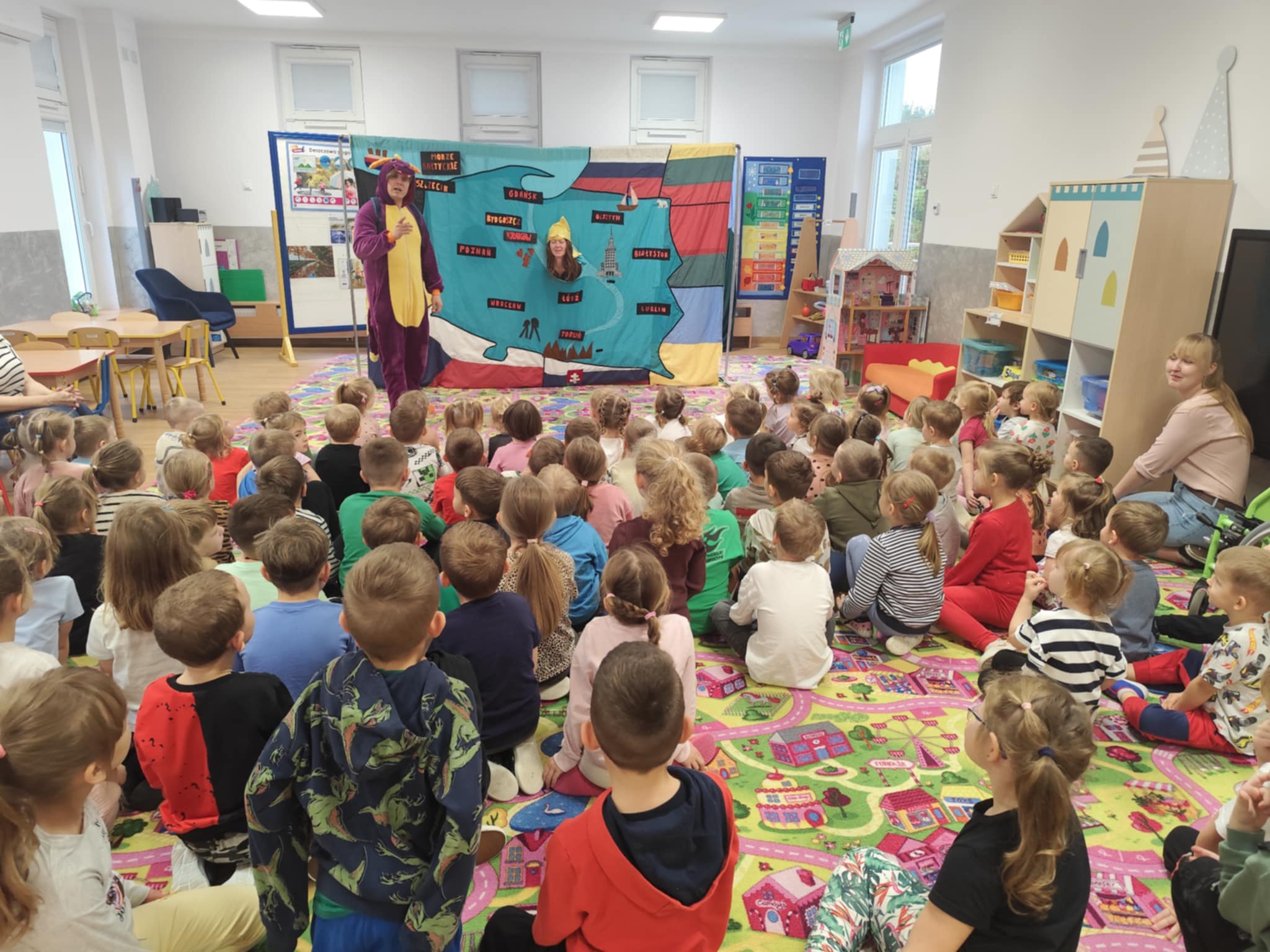 22 października nasze przedszkole odwiedził teatrzyk z przedstawieniem pt. „Po Polsce – podróże małe i duże”. Bohater spektaklu, Smok, chciał wybrać się w podróż do swojego dziadka, który mieszka w Krakowie. Niestety, ktoś pomieszał mapę Polski i pozamieniał miasta! Smok błądził więc po kraju – odwiedził Warszawę, Poznań i Toruń. W każdym z tych miejsc dowiedział się, z czego słynie dane miasto, a przy okazji świetnie się bawił. Na szczęście na końcu udało mu się dotrzeć do Krakowa.