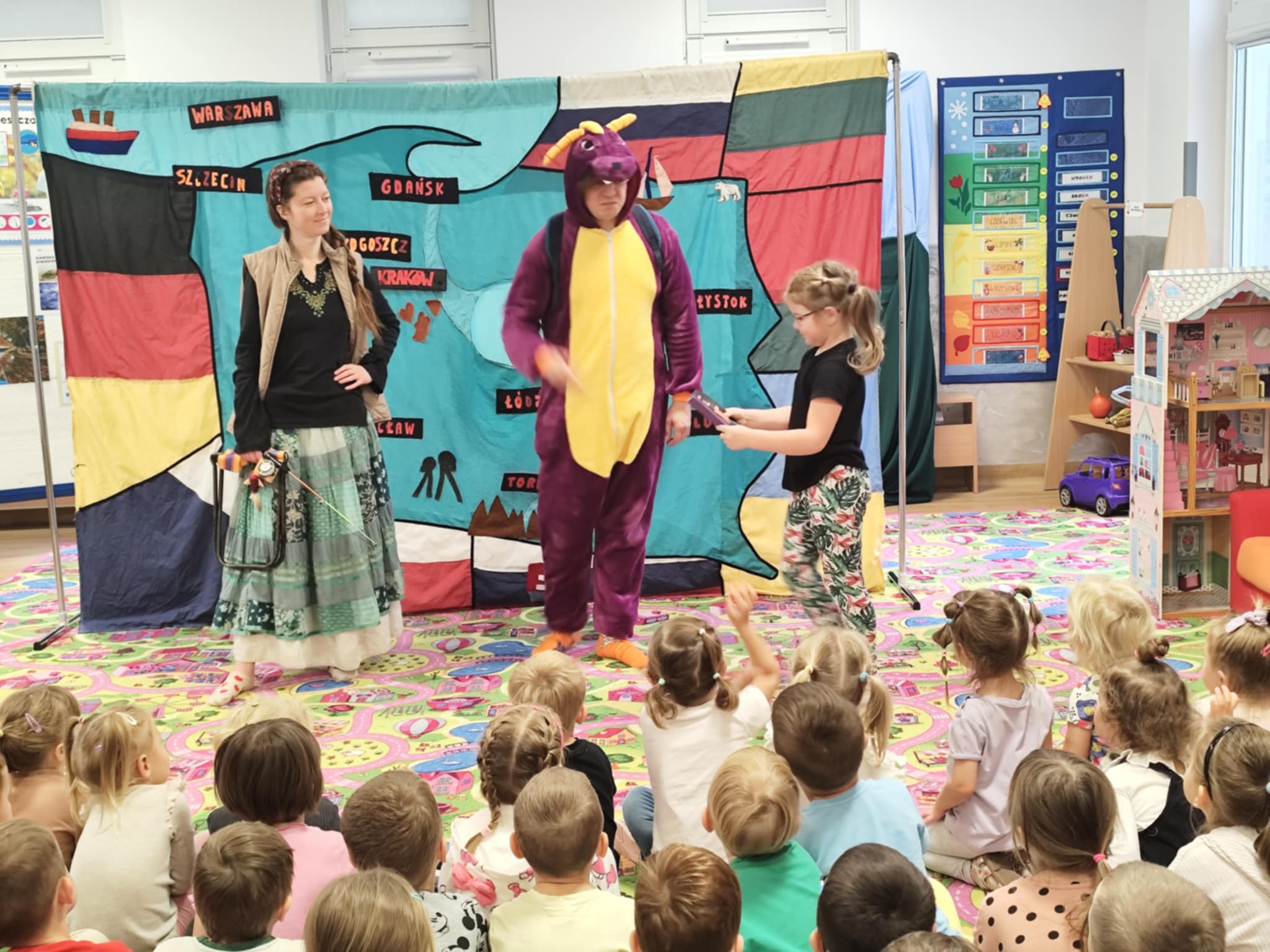 Przedstawienie było pełne humoru, ciekawostek o Polsce i radosnej muzyki. Dzieci z zainteresowaniem śledziły przygody Smoka i aktywnie uczestniczyły w spektaklu.