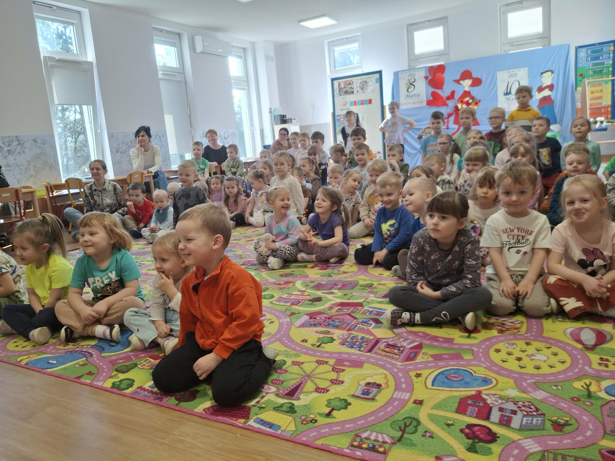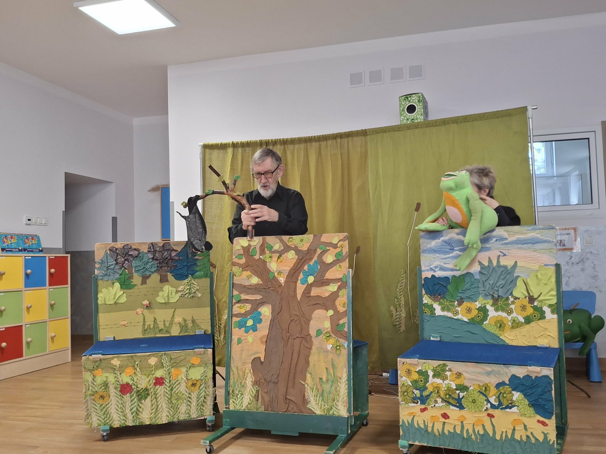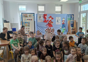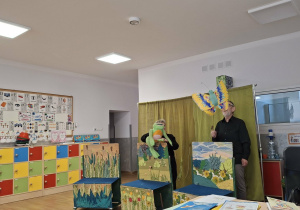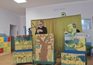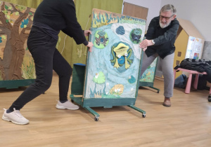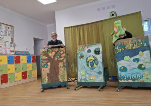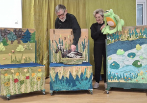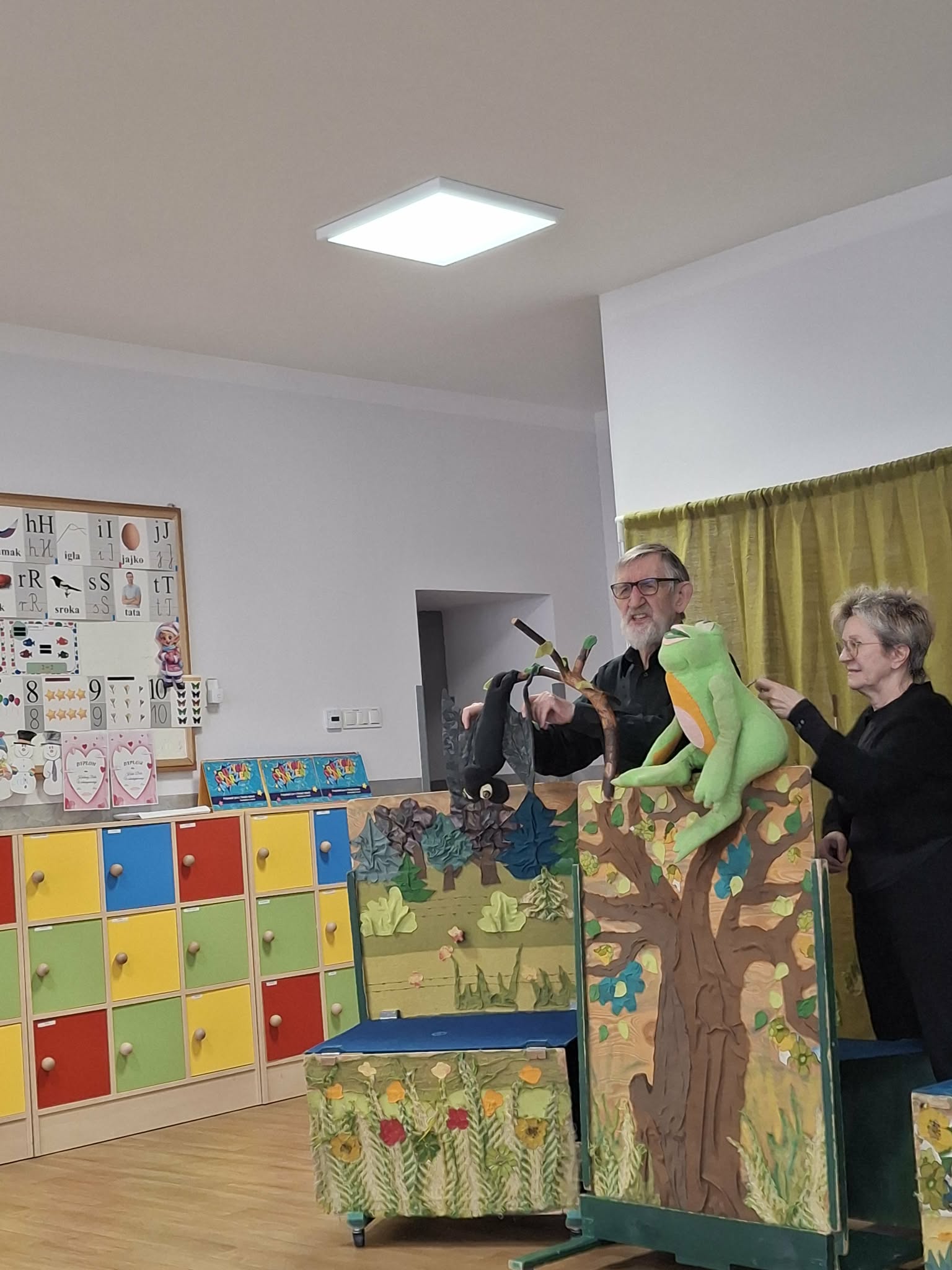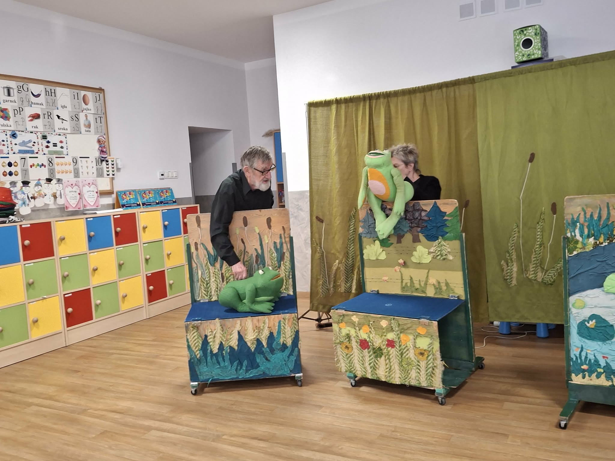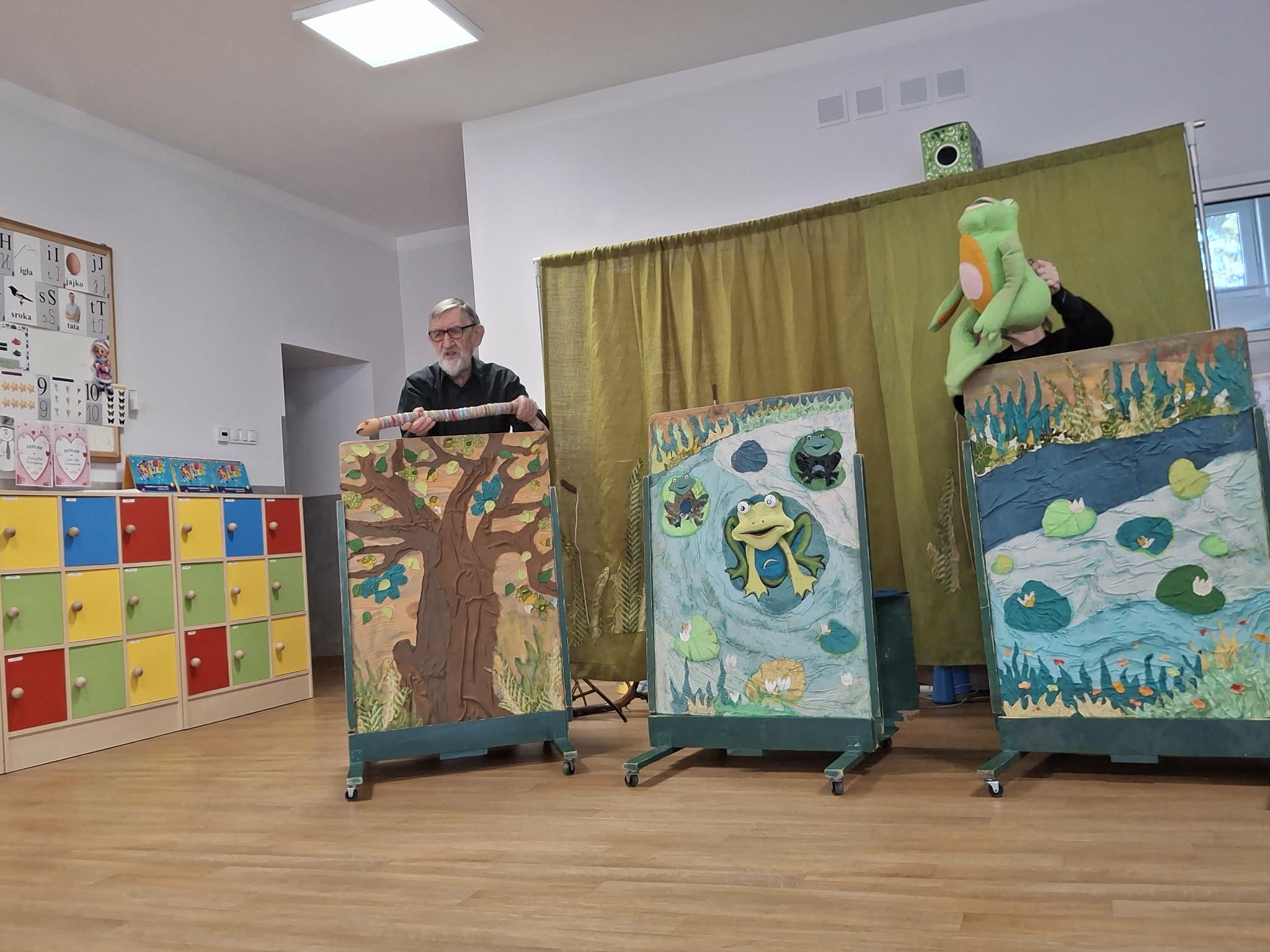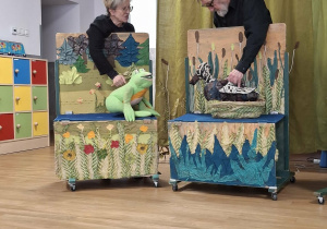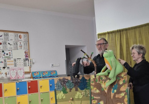 We wtorek 3 marca 2026r., do naszego przedszkola zawitał teatr "Psikus" z Łodzi z przedstawieniem "Skrzydlate marzenia". Głównym bohaterem była żabka – marzycielka, która zazdroszcząc umiejętności wszystkim latającym stworzeniom, zapragnęła pewnego dnia wznieść się w niebo. Od spotkanych na swojej drodze zwierzątek i będąc wobec nich niegrzeczna, chciała bardzo za wszelką cenę zdobyć cudowną receptę na latanie. Wreszcie natrafiła na przebiegłego bociana, który przedstawił się jej jako wybitny nauczyciel fruwania. Nie mając pojęcia o niecnych zamiarach ptaka, zgodziła się odnaleźć jego okulary w zamian za udzielenie jej lekcji unoszenia się w powietrze. Dzięki pomocy sióstr oraz najbliższych przyjaciół na szczęście udało się jej uniknąć bocianiego dzioba i zrozumiała, że „żaba zawsze będzie żabą, a bocian bocianem”. Na koniec mali widzowie usłyszeli morał radosnego przedstawienia „Myśl o wielkich czynach, próbuj! Może się udadzą. Ale zawsze tych posłuchaj, którzy dobrze radzą”.
