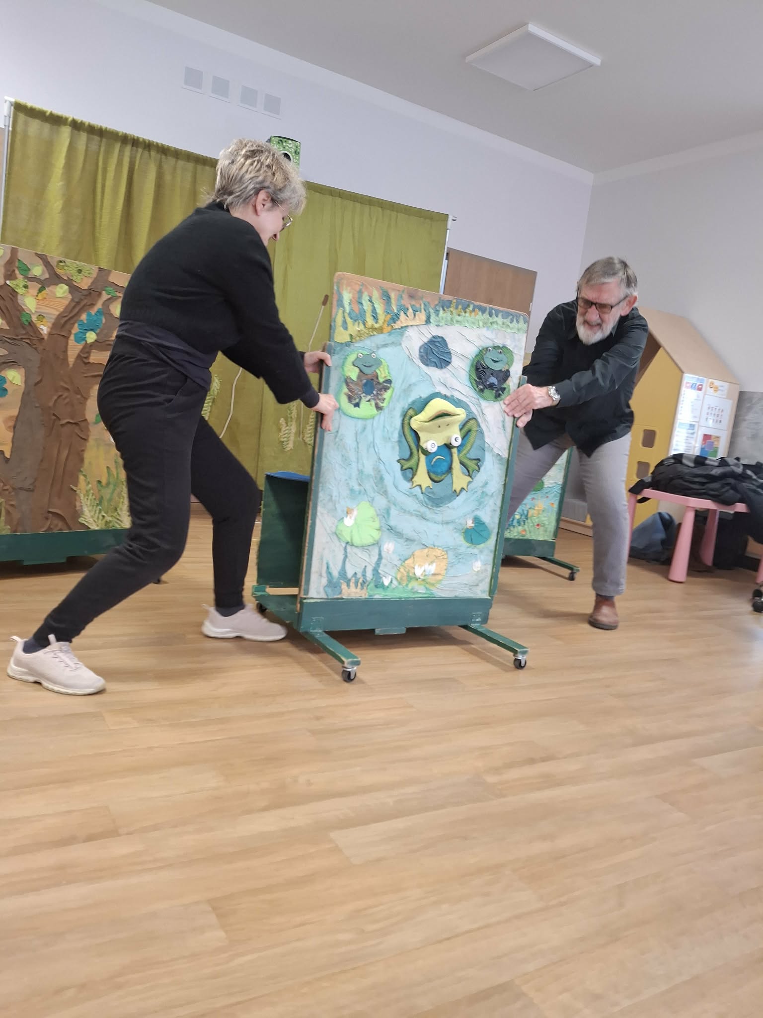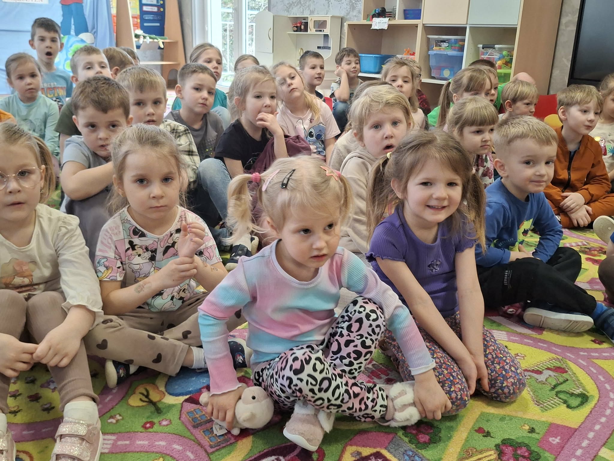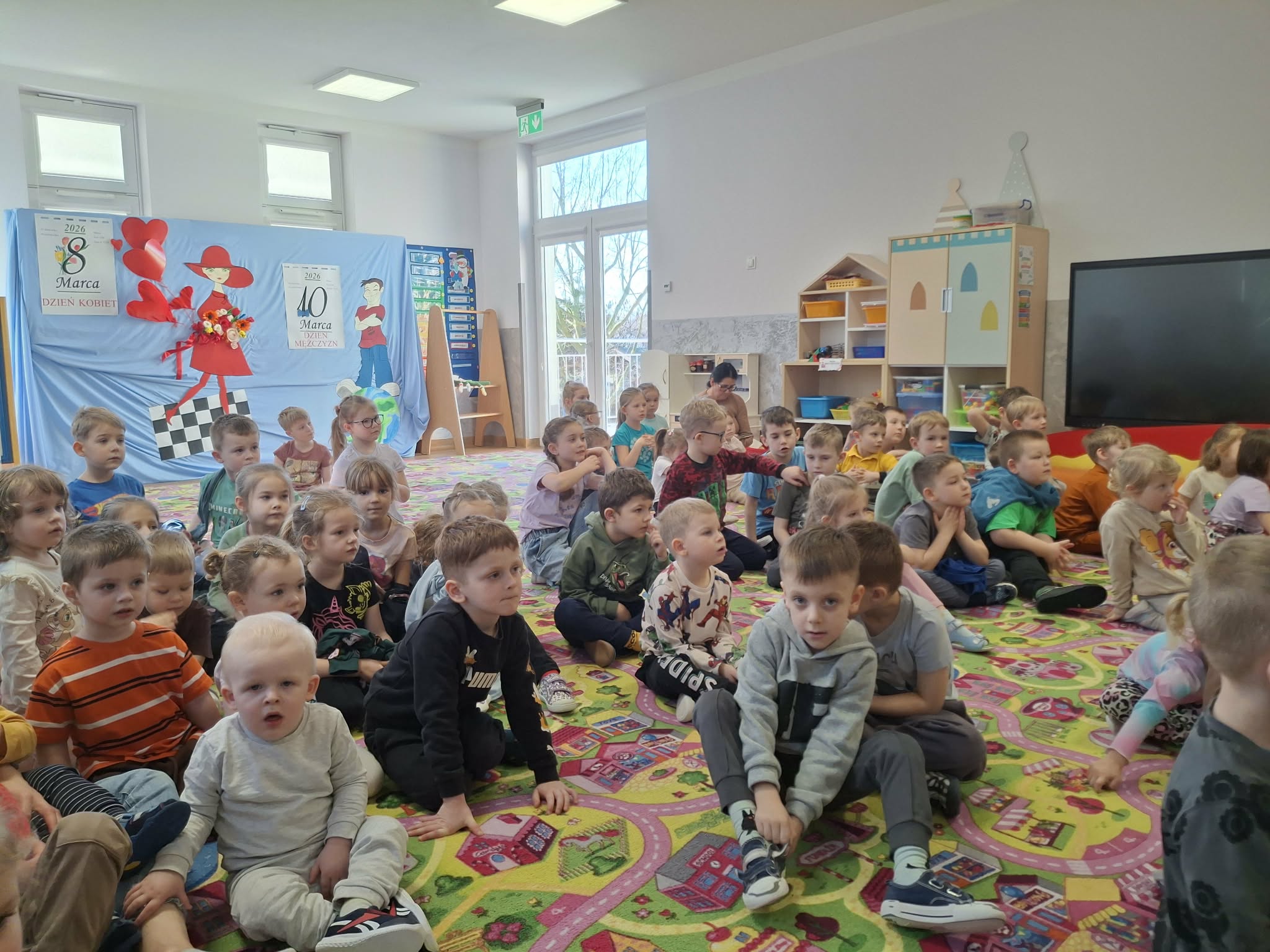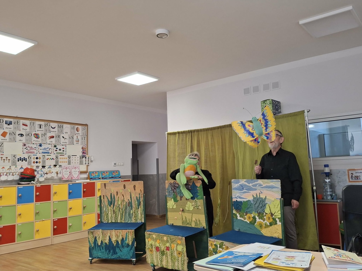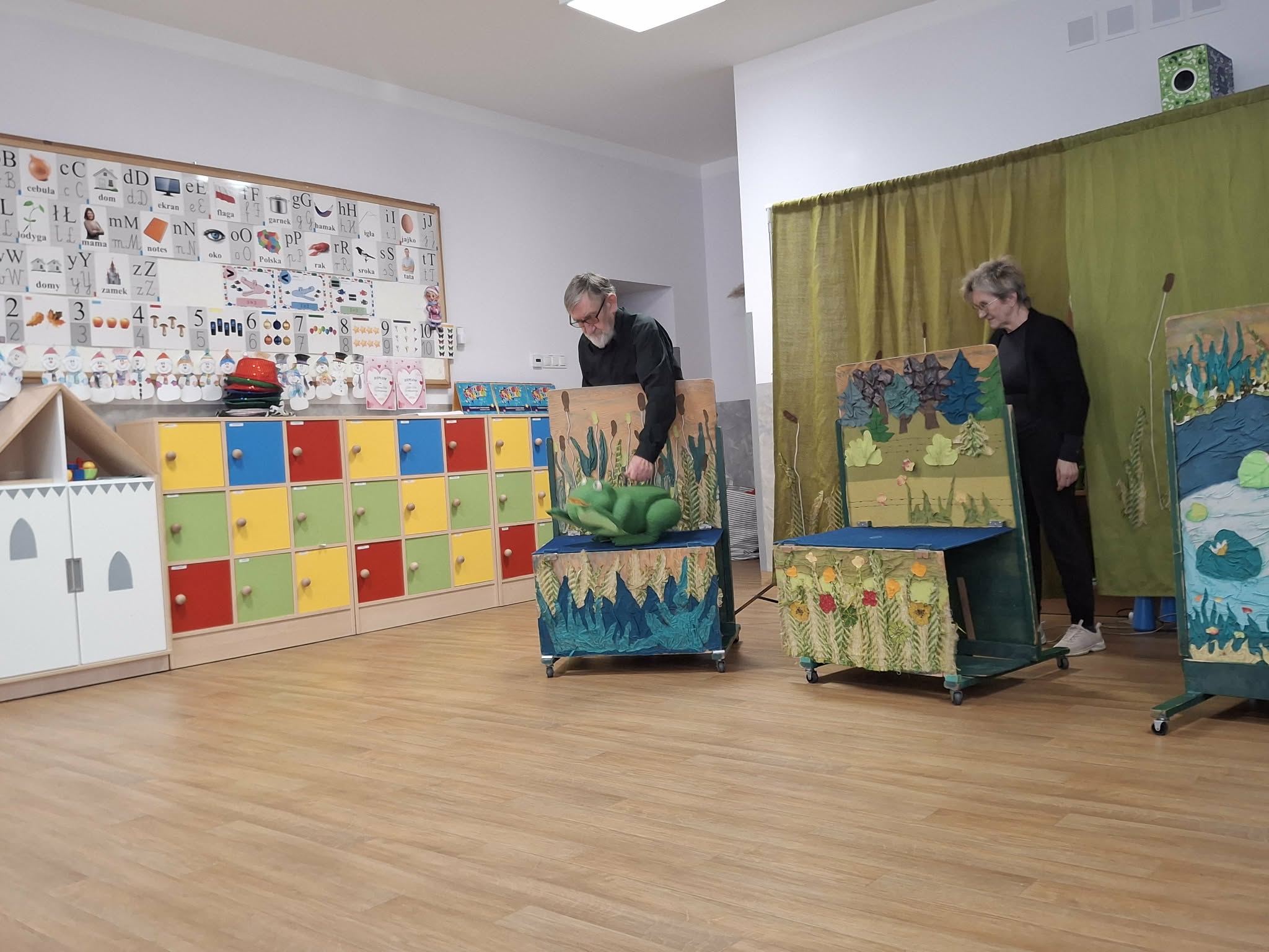 We wtorek 3 marca 2026r., do naszego przedszkola zawitał teatr "Psikus" z Łodzi z przedstawieniem "Skrzydlate marzenia". Głównym bohaterem była żabka – marzycielka, która zazdroszcząc umiejętności wszystkim latającym stworzeniom, zapragnęła pewnego dnia wznieść się w niebo. Od spotkanych na swojej drodze zwierzątek i będąc wobec nich niegrzeczna, chciała bardzo za wszelką cenę zdobyć cudowną receptę na latanie. Wreszcie natrafiła na przebiegłego bociana, który przedstawił się jej jako wybitny nauczyciel fruwania. Nie mając pojęcia o niecnych zamiarach ptaka, zgodziła się odnaleźć jego okulary w zamian za udzielenie jej lekcji unoszenia się w powietrze. Dzięki pomocy sióstr oraz najbliższych przyjaciół na szczęście udało się jej uniknąć bocianiego dzioba i zrozumiała, że „żaba zawsze będzie żabą, a bocian bocianem”. Na koniec mali widzowie usłyszeli morał radosnego przedstawienia „Myśl o wielkich czynach, próbuj! Może się udadzą. Ale zawsze tych posłuchaj, którzy dobrze radzą”.