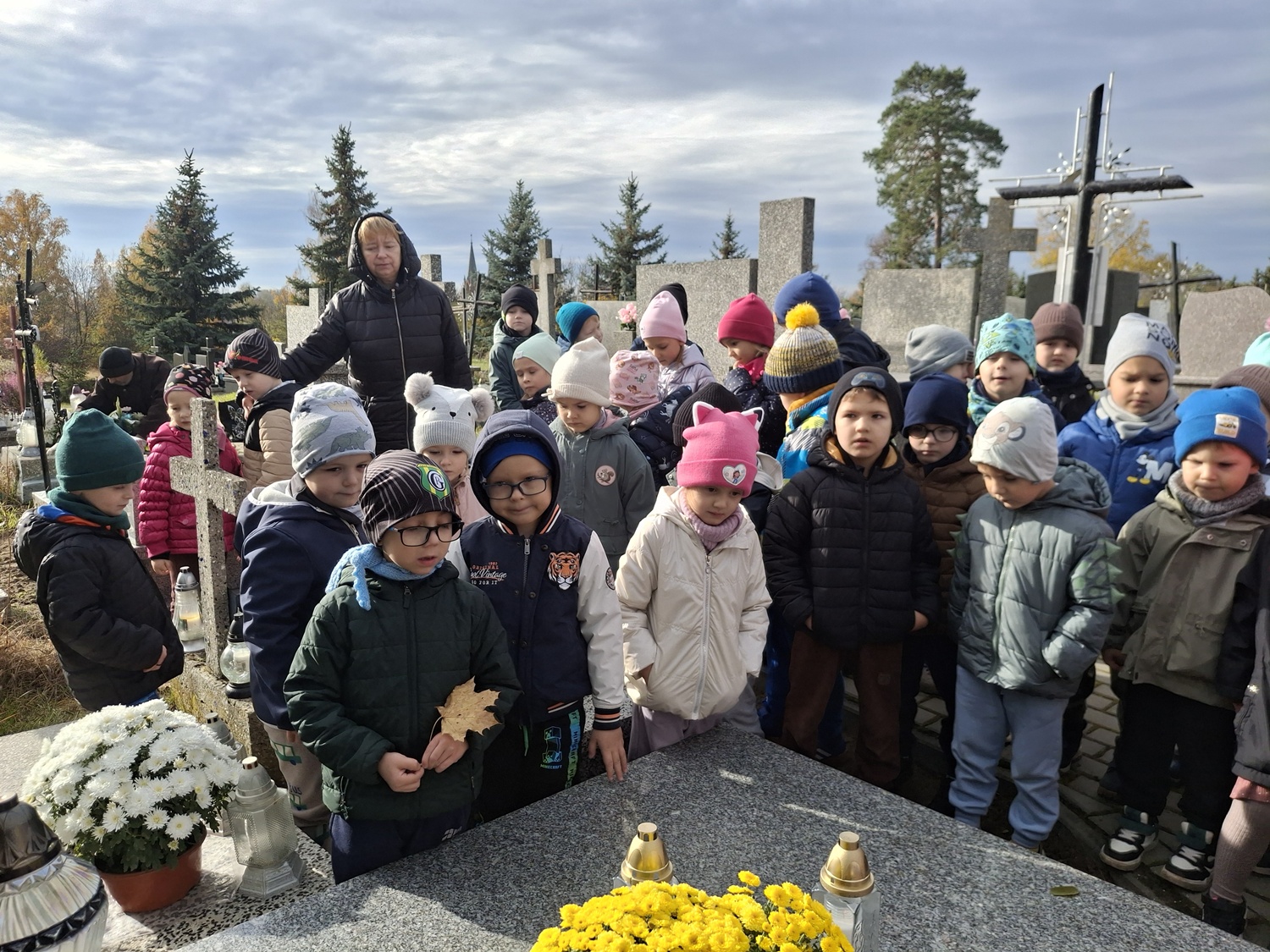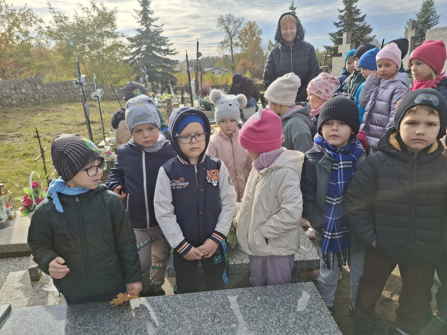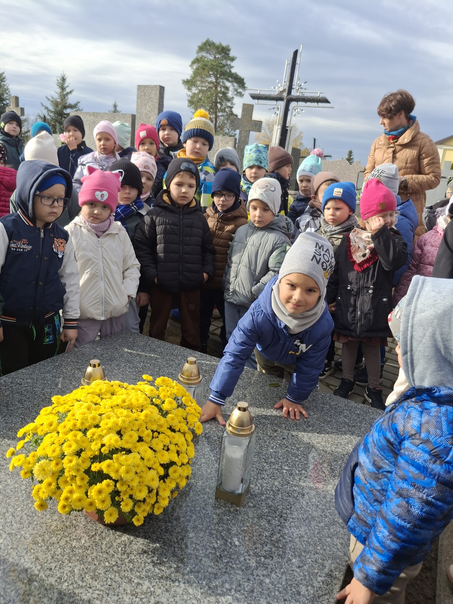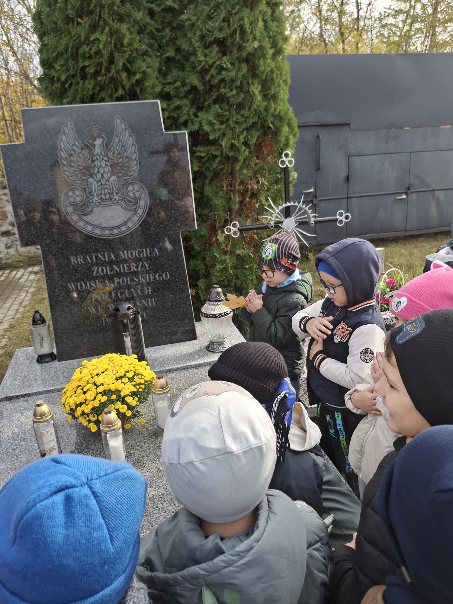 Jedną z ważniejszych lekcji wychowania patriotycznego w przedszkolu był spacer pod pomnik Tadeusza Kościuszki i pobliski cmentarz, by złożyć kwiaty i zapalić znicze na Grobie Nieznanego Żołnierza. Przedszkolaki minutą ciszy oddały cześć żołnierzom polskim poległym za naszą Ojczyznę. Dzieci dbały również o właściwe zachowanie się na cmentarzu, by nie zakłócać spokoju osób odwiedzających to miejsce.