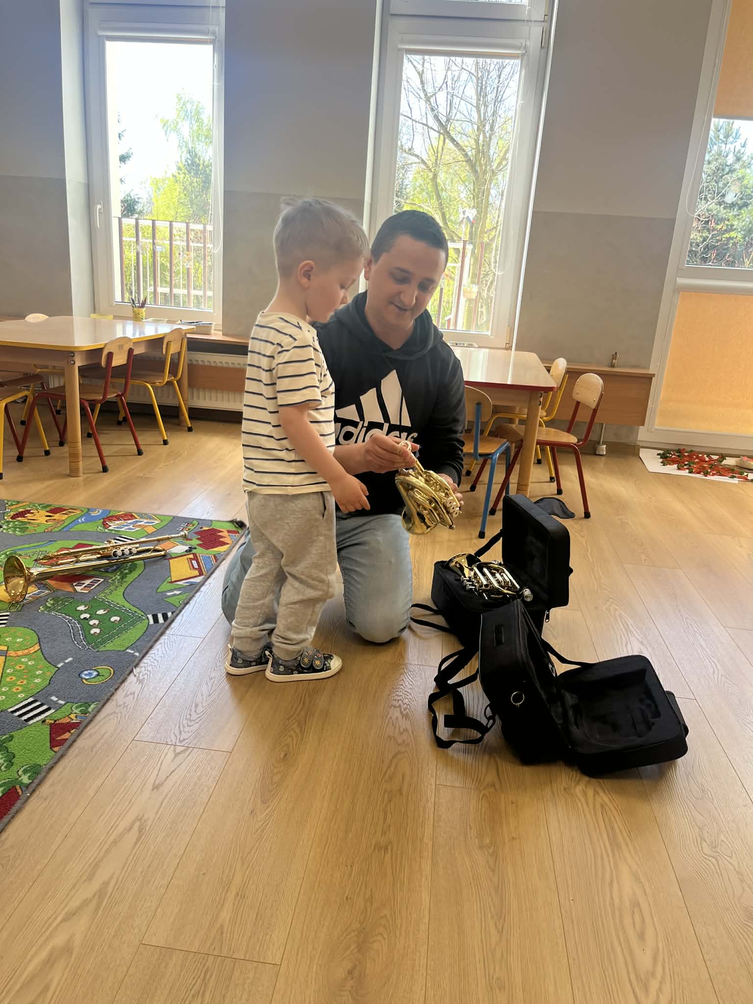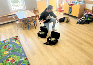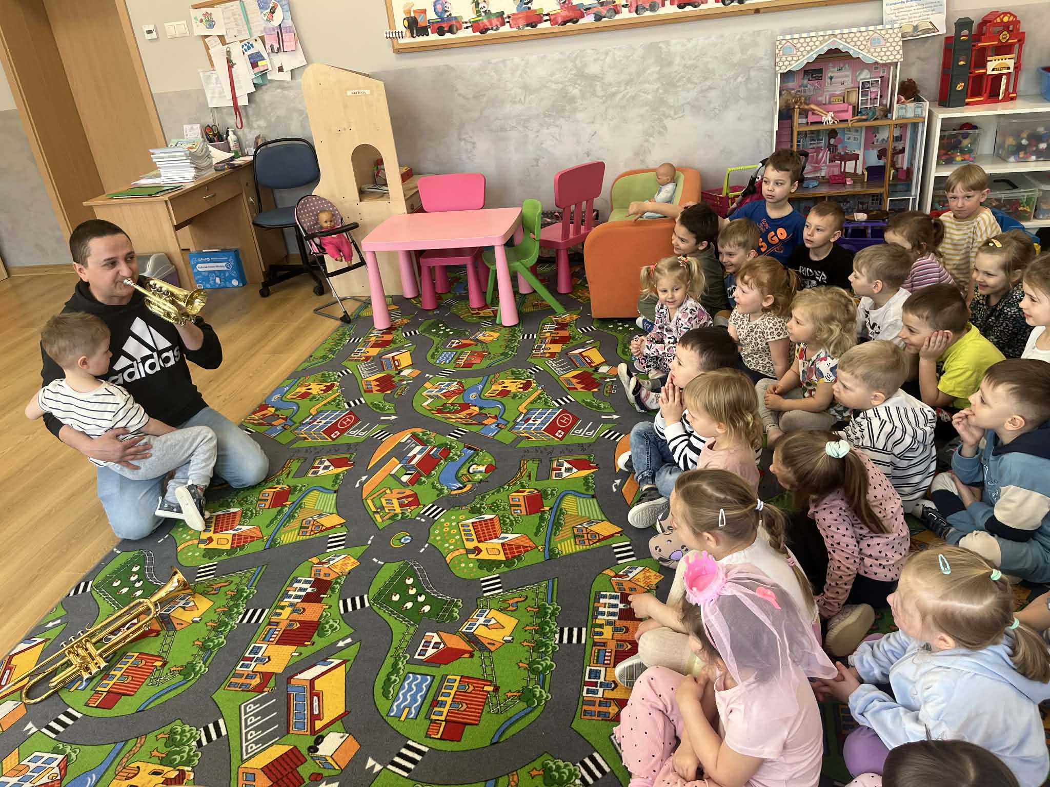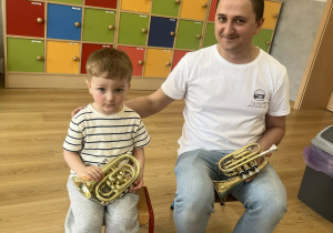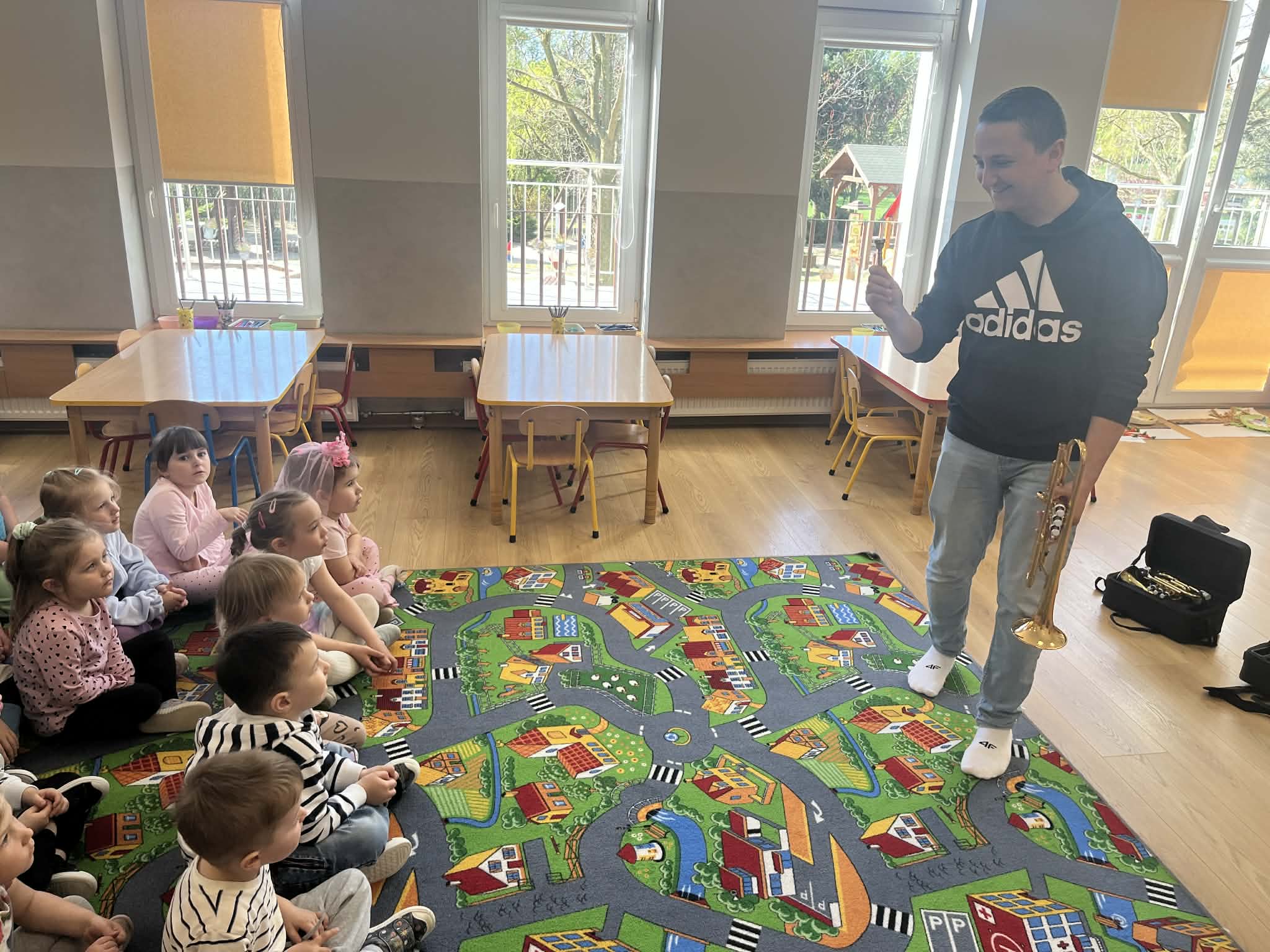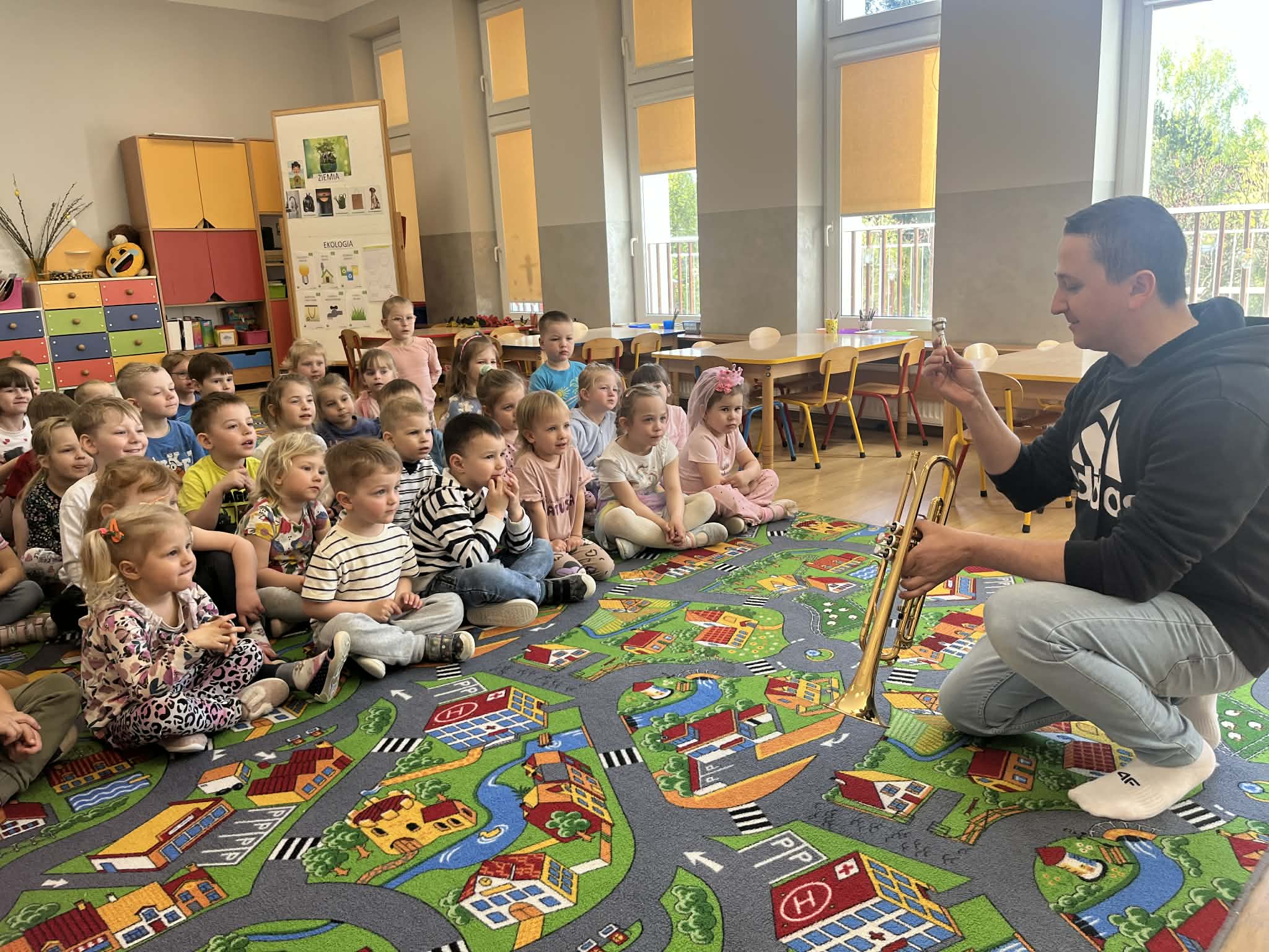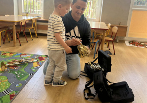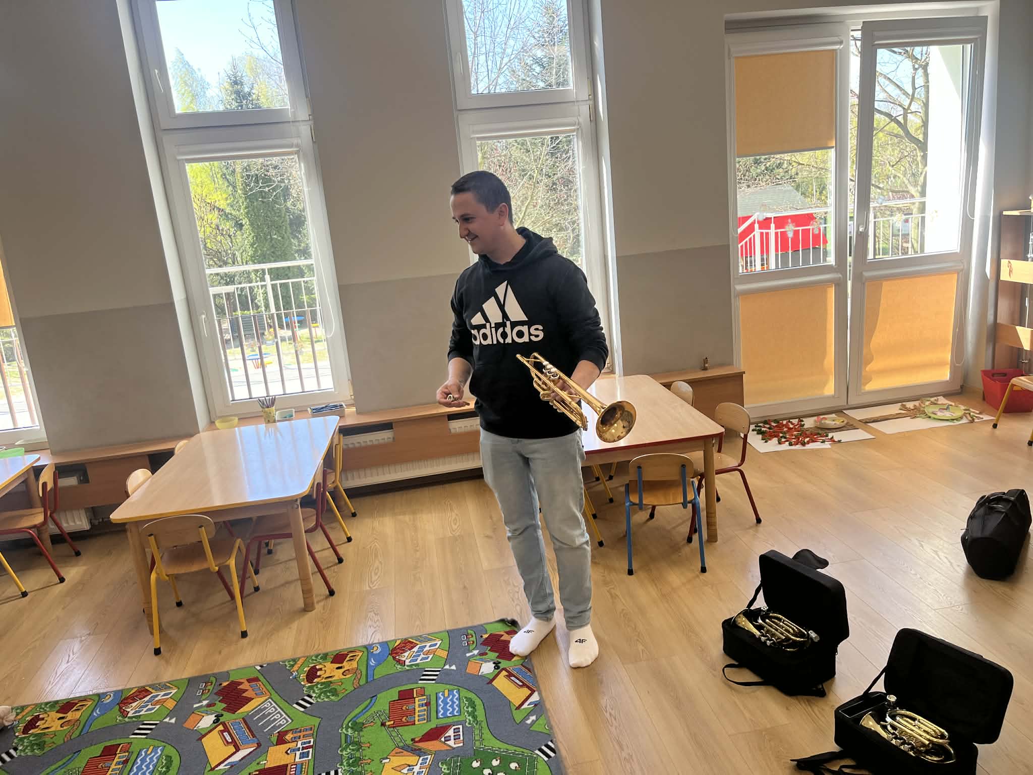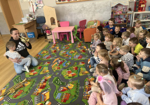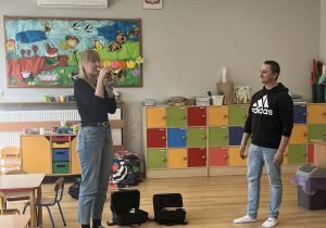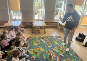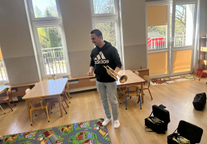 23 kwietnia nasze przedszkole odwiedził wyjątkowy gość – muzyk Marcin Zarzycki, prywatnie tata Remka z grupy „Krasnale”. Celem spotkania było przybliżenie dzieciom zawodu muzyka w ramach realizowanego projektu „Poznajemy zawody naszych rodziców”. Pan Marcin opowiedział o swojej pracy oraz zaprezentował instrument, na którym gra – trąbkę. Dzieci miały okazję nie tylko posłuchać ciekawych informacji, ale również z bliska obejrzeć instrument, co wzbudziło duże zainteresowanie i radość. Na zakończenie spotkania nasz gość wręczył dzieciom słodki poczęstunek, co było miłym akcentem kończącym wizytę. Serdecznie dziękujemy panu Marcinowi za poświęcony czas i ciekawe spotkanie!