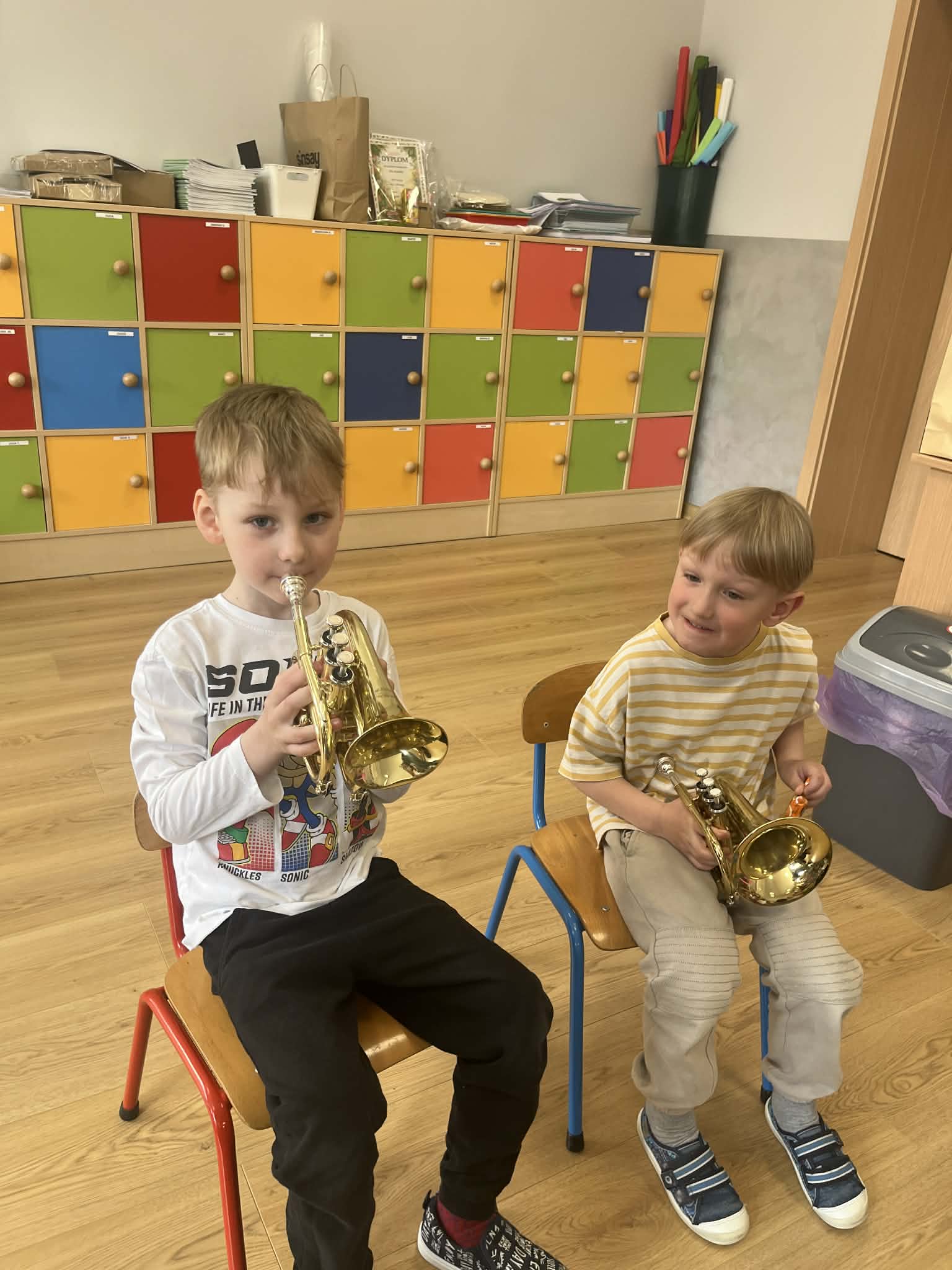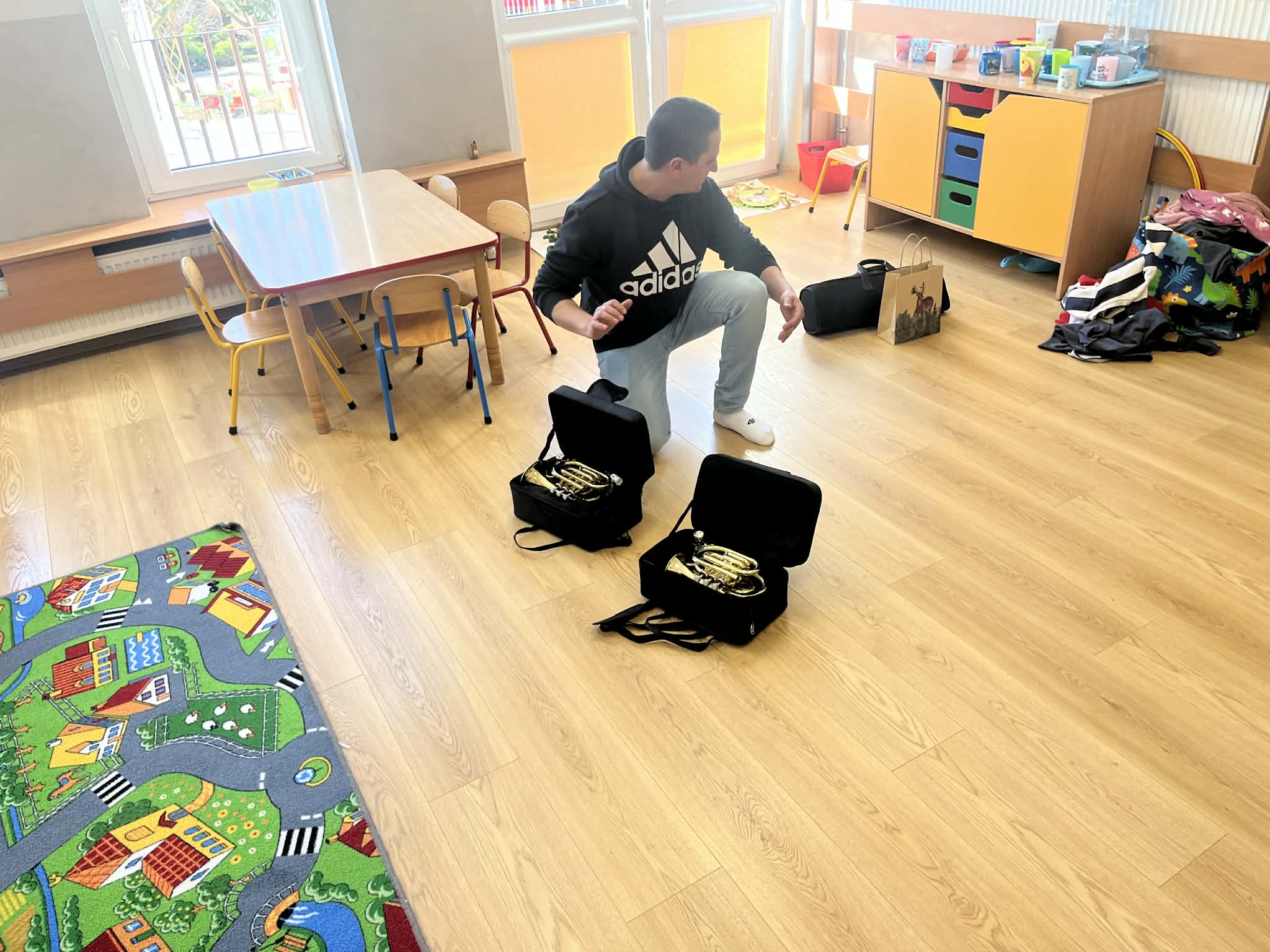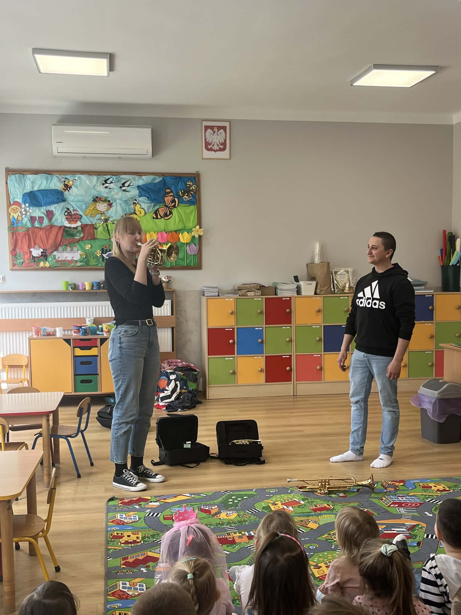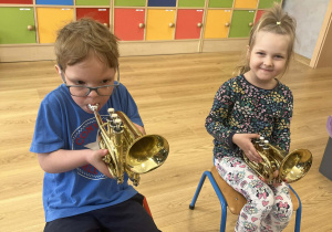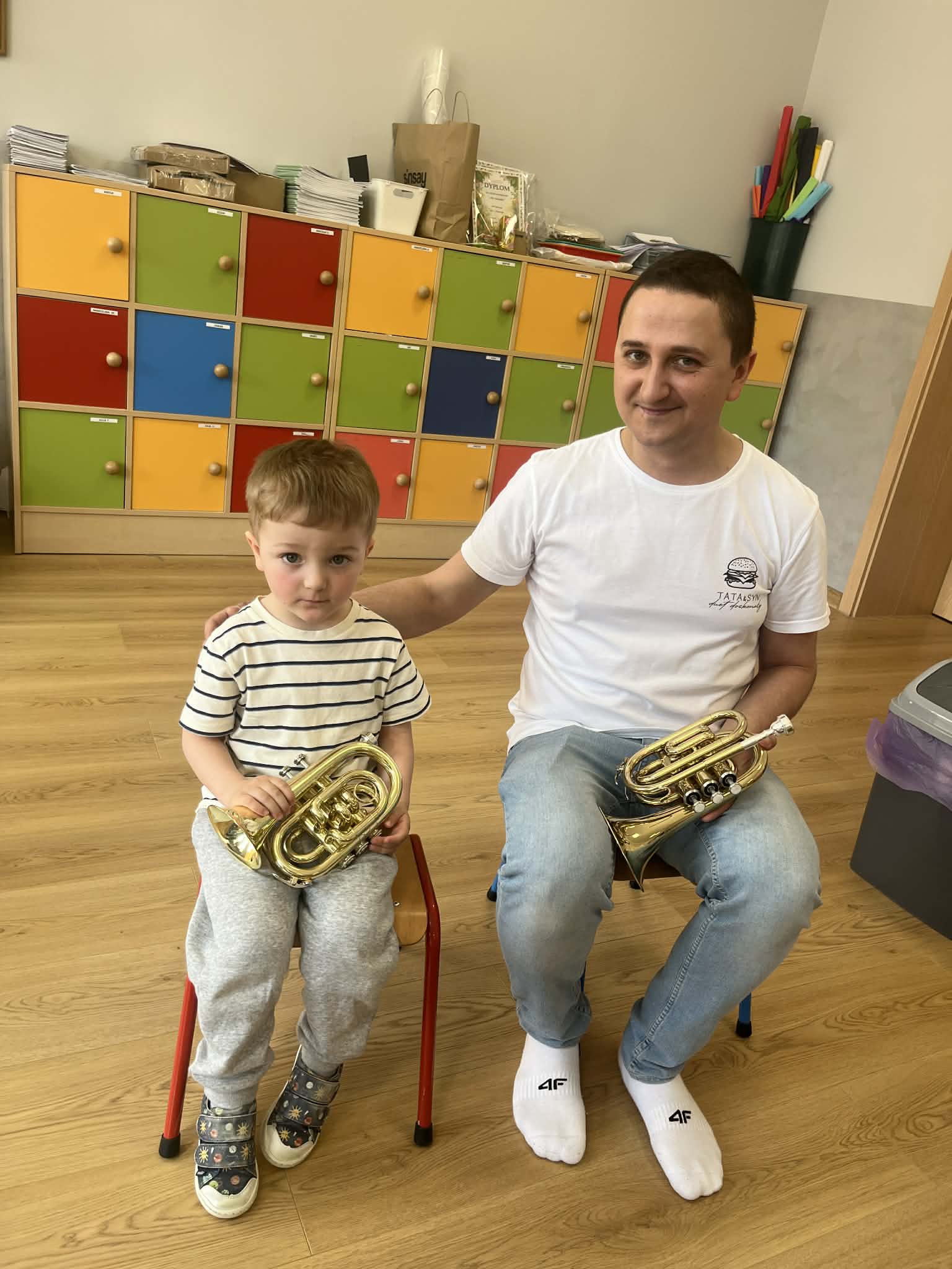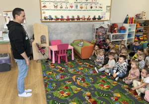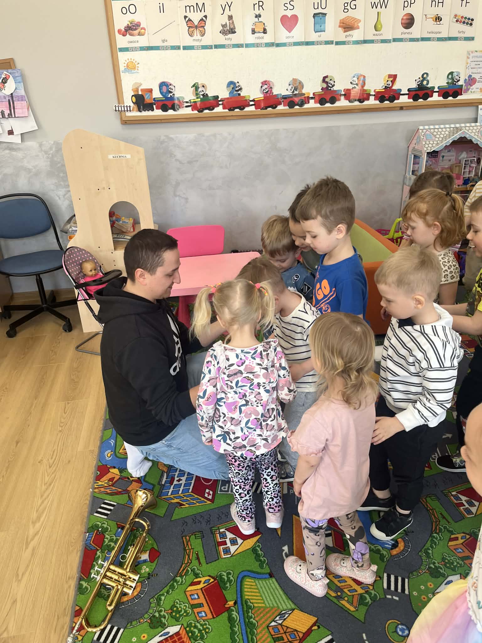 23 kwietnia nasze przedszkole odwiedził wyjątkowy gość – muzyk Marcin Zarzycki, prywatnie tata Remka z grupy „Krasnale”. Celem spotkania było przybliżenie dzieciom zawodu muzyka w ramach realizowanego projektu „Poznajemy zawody naszych rodziców”. Pan Marcin opowiedział o swojej pracy oraz zaprezentował instrument, na którym gra – trąbkę. Dzieci miały okazję nie tylko posłuchać ciekawych informacji, ale również z bliska obejrzeć instrument, co wzbudziło duże zainteresowanie i radość. Na zakończenie spotkania nasz gość wręczył dzieciom słodki poczęstunek, co było miłym akcentem kończącym wizytę. Serdecznie dziękujemy panu Marcinowi za poświęcony czas i ciekawe spotkanie!