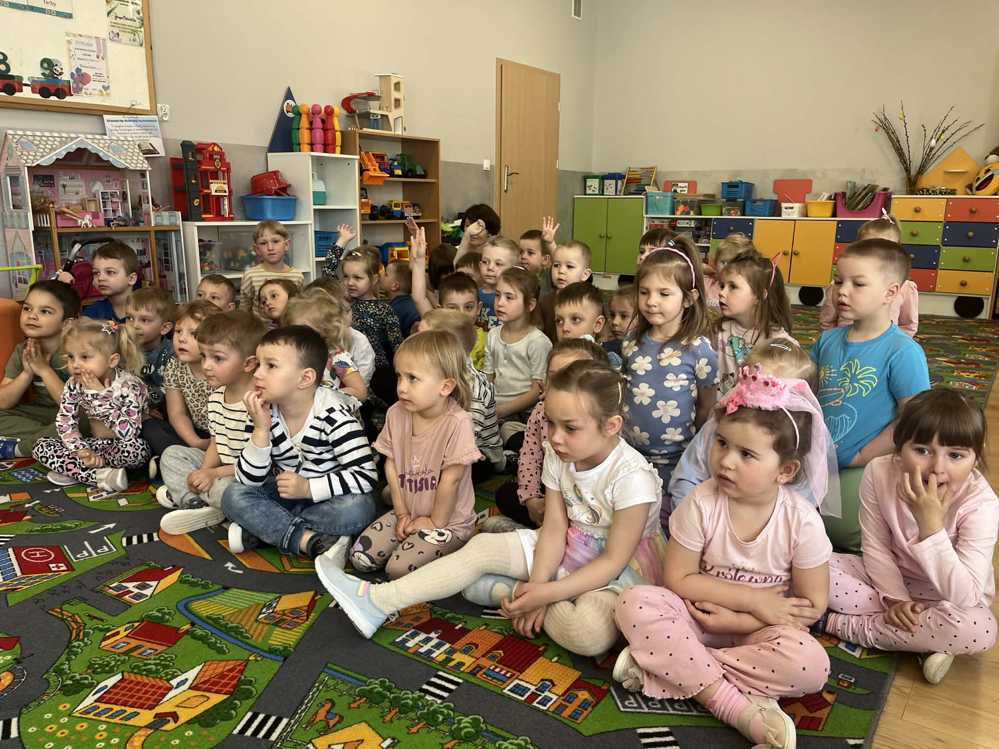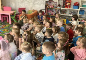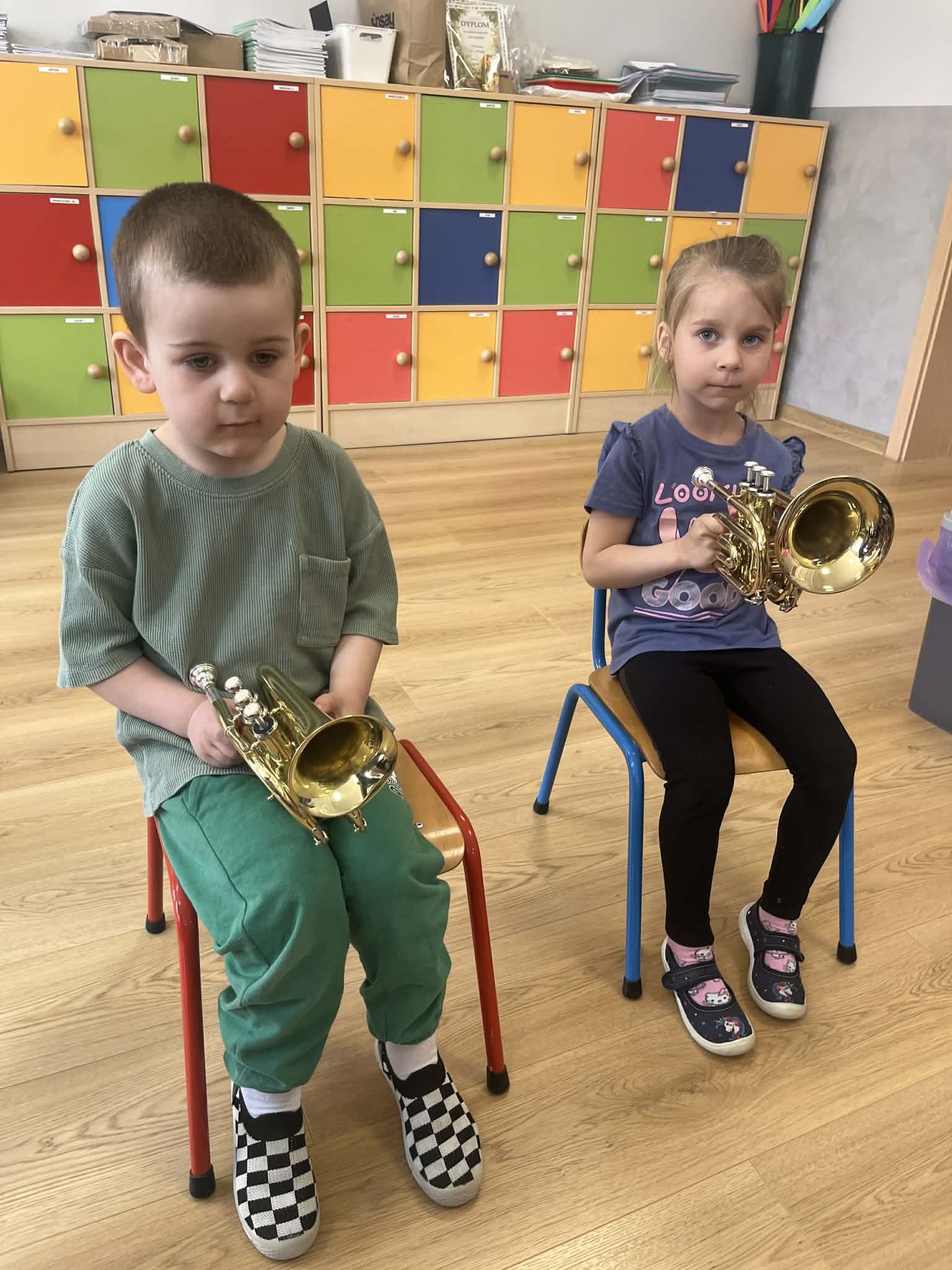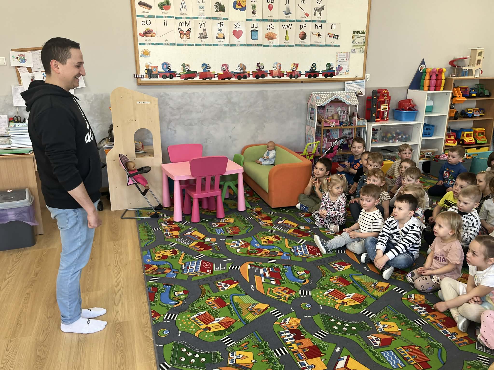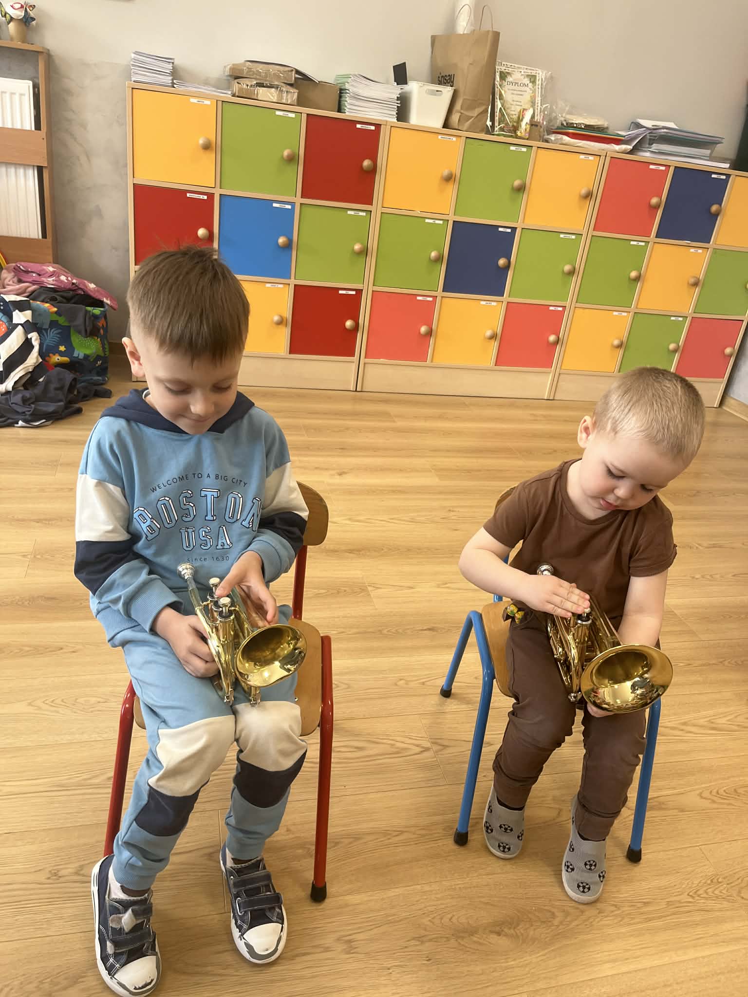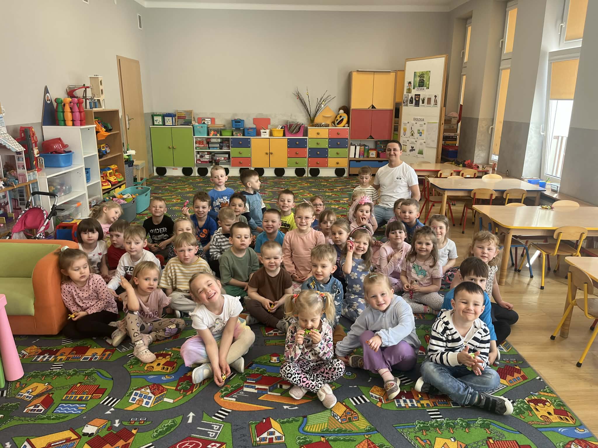 23 kwietnia nasze przedszkole odwiedził wyjątkowy gość – muzyk Marcin Zarzycki, prywatnie tata Remka z grupy „Krasnale”. Celem spotkania było przybliżenie dzieciom zawodu muzyka w ramach realizowanego projektu „Poznajemy zawody naszych rodziców”. Pan Marcin opowiedział o swojej pracy oraz zaprezentował instrument, na którym gra – trąbkę. Dzieci miały okazję nie tylko posłuchać ciekawych informacji, ale również z bliska obejrzeć instrument, co wzbudziło duże zainteresowanie i radość. Na zakończenie spotkania nasz gość wręczył dzieciom słodki poczęstunek, co było miłym akcentem kończącym wizytę. Serdecznie dziękujemy panu Marcinowi za poświęcony czas i ciekawe spotkanie!