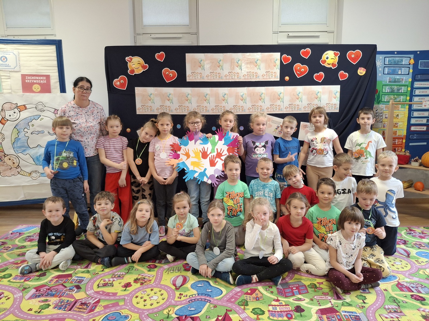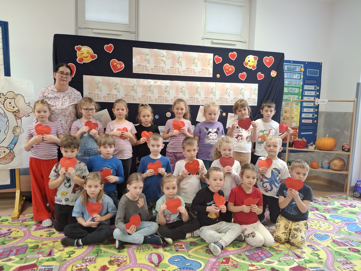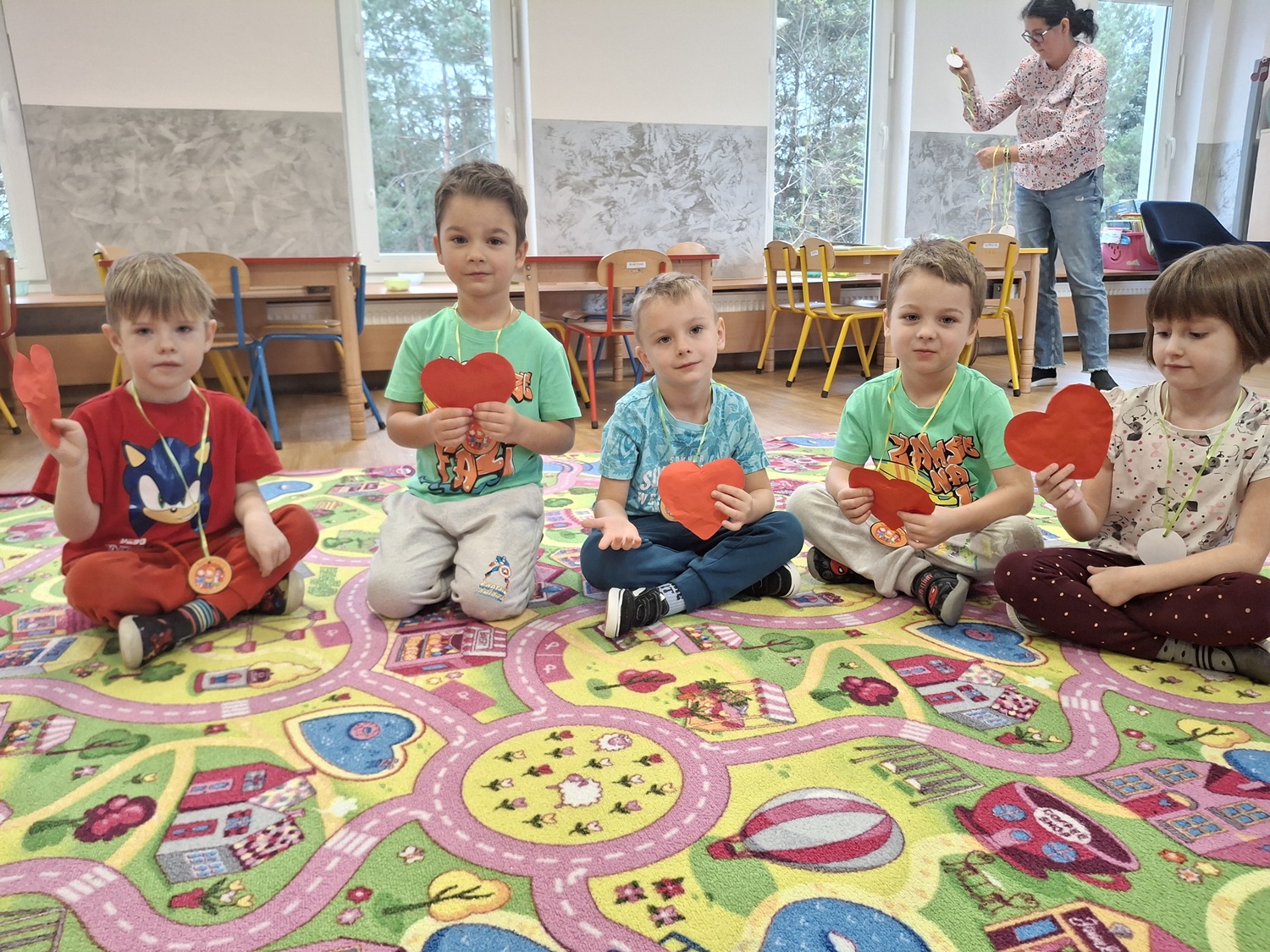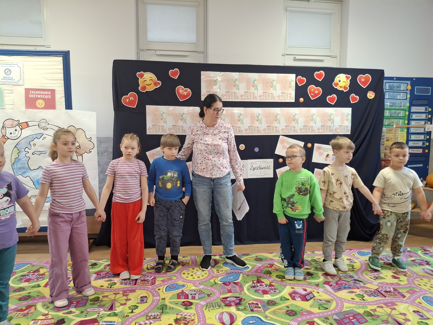 21.11.2025 w przedszkolu obchodzono Światowy Dzień Życzliwości i Pozdrowień. Celem zajęć było kształtowanie postawy życzliwości, uprzejmości i szacunku wobec innych. Dzieci rozmawiały o dobrych uczynkach, słuchały wiersza „Dzień życzliwości” Jolanty Wybieralskiej - „Dzień życzliwości” i uczestniczyły w zabawach muzyczno-ruchowych oraz ćwiczeniach pokazujących, jak pomagać innym. Przedszkolaki uczyły się rozpoznawać zachowania życzliwe i nieżyczliwe, rozwiązywały zagadki o „magicznych słowach” oraz wspólnie stworzyły „Dekalog przyjaźni”. Na zakończenie dzieci przygotowały serca dla przyjaciół i otrzymały „ordery życzliwości”.