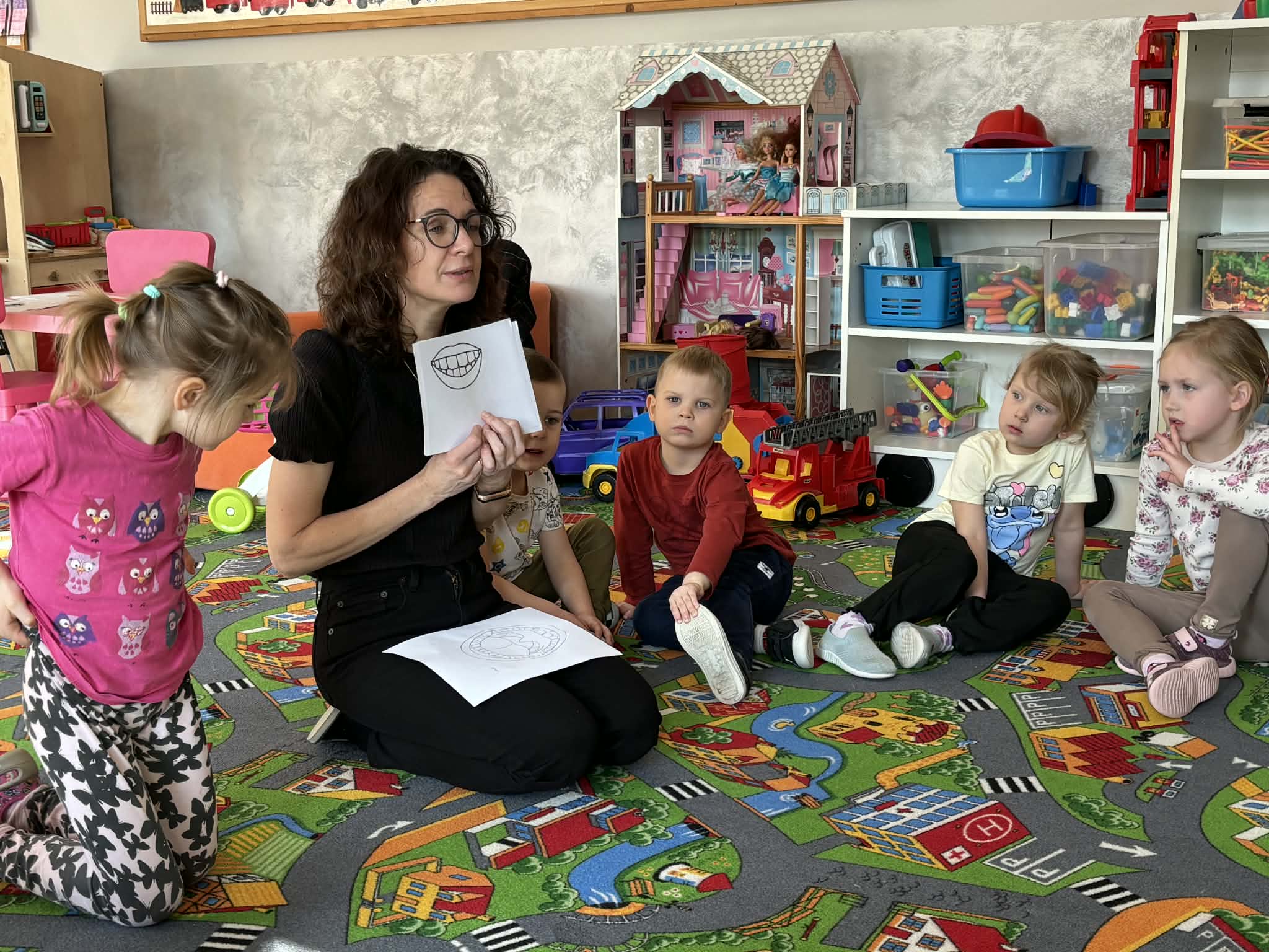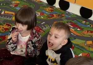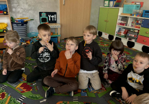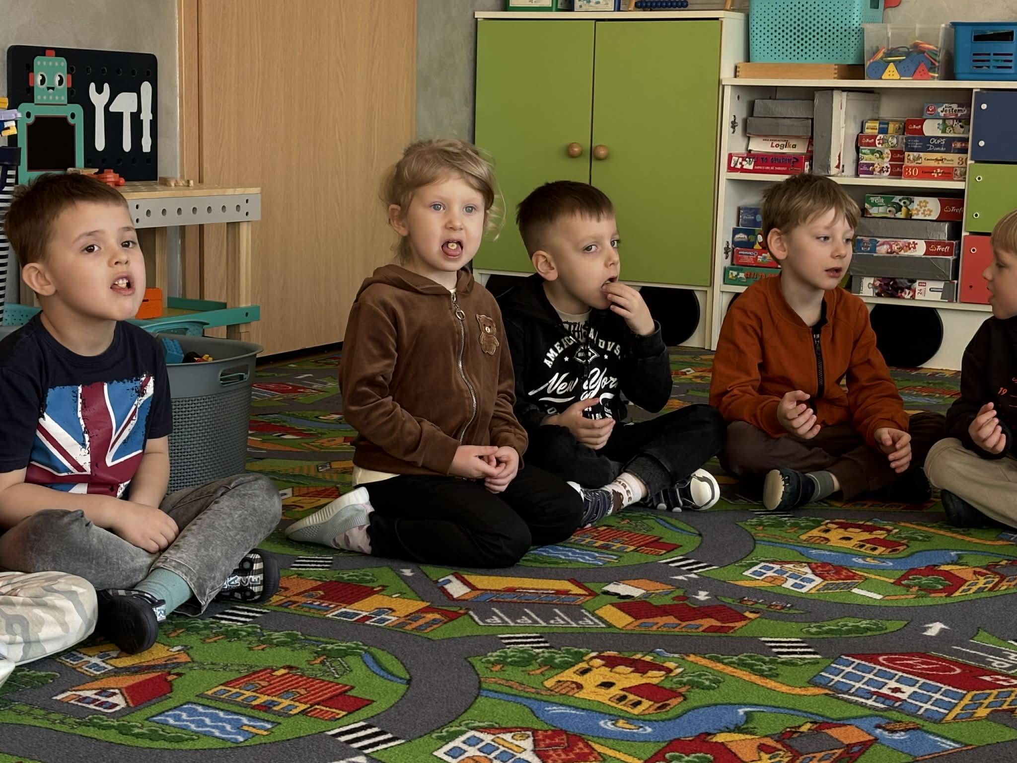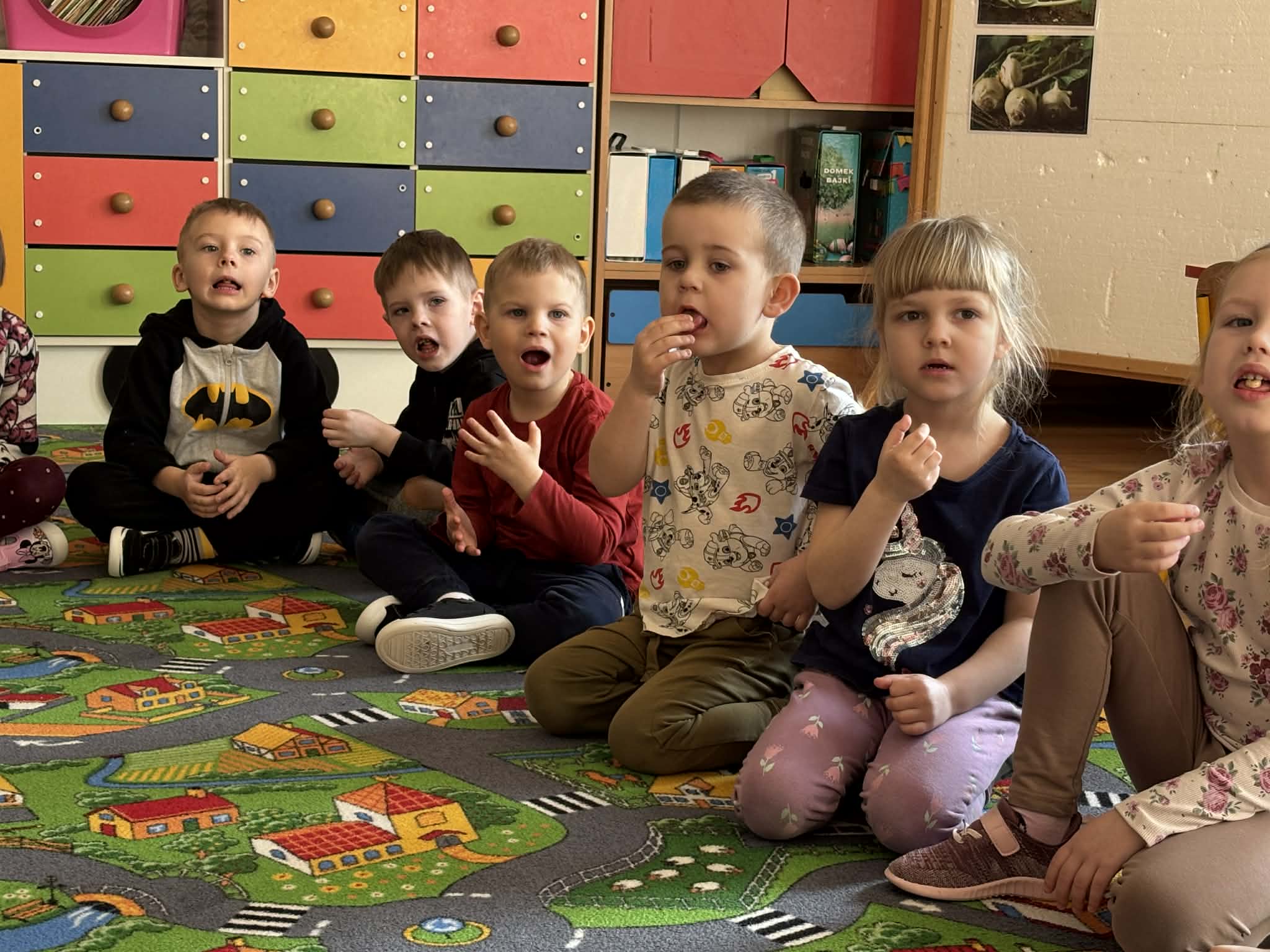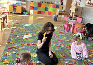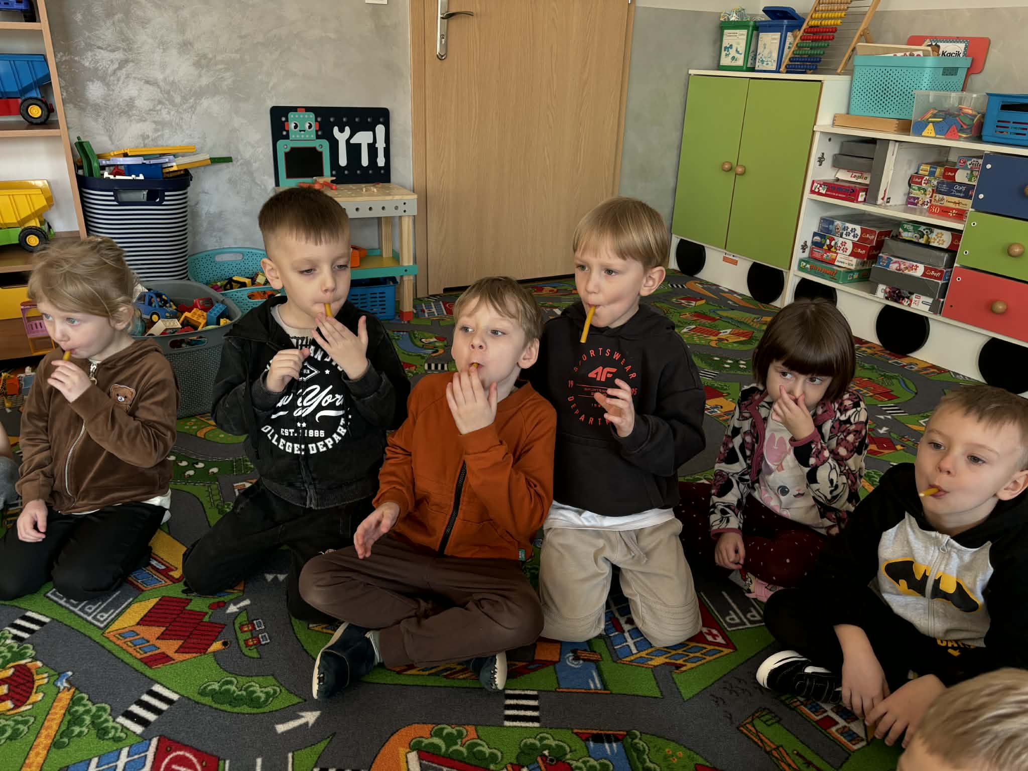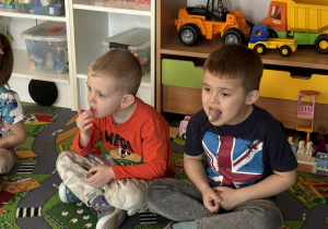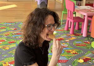Pani Magdalena Wolska, nasz przedszkolny logopeda, poprowadziła zajęcia profilaktyczne, które miały zachęcić dzieci do codziennych ćwiczeń. Zabawy, które zaproponowała dzieciom nie tylko były smaczne, ale również uświadomiły jaki wpływ ma prawidłowe gryzienie na rozwój naszej mowy. Nie zabrakło zabaw ruchowych, które są nieodzownym elementem rozwoju.