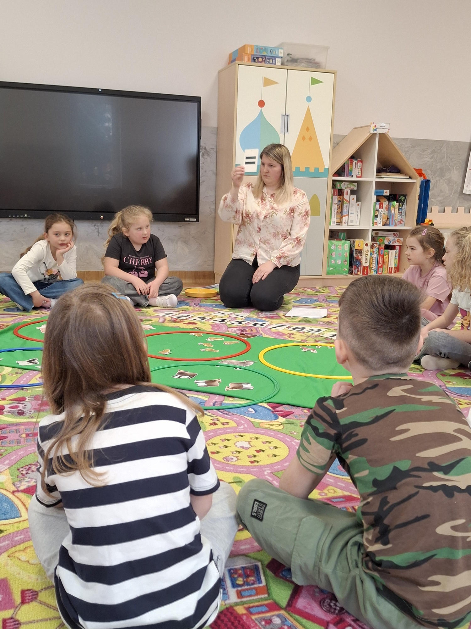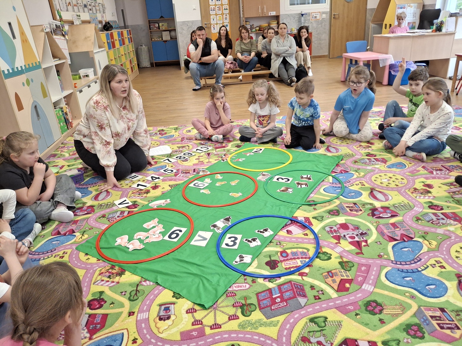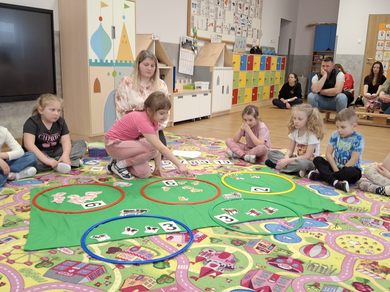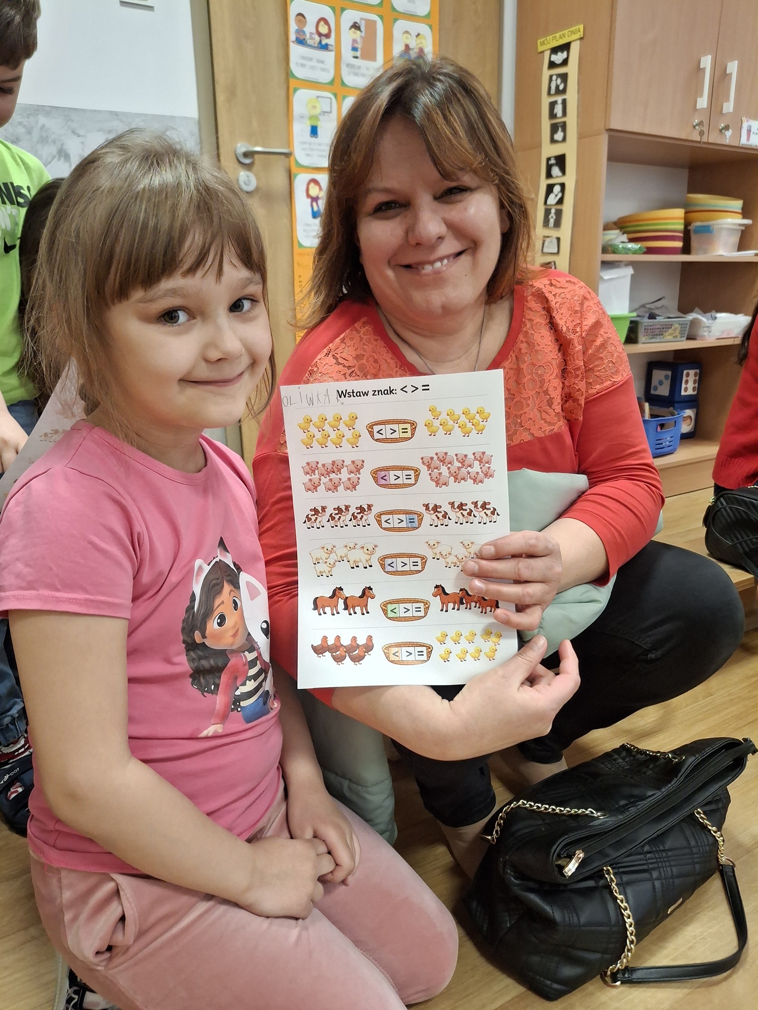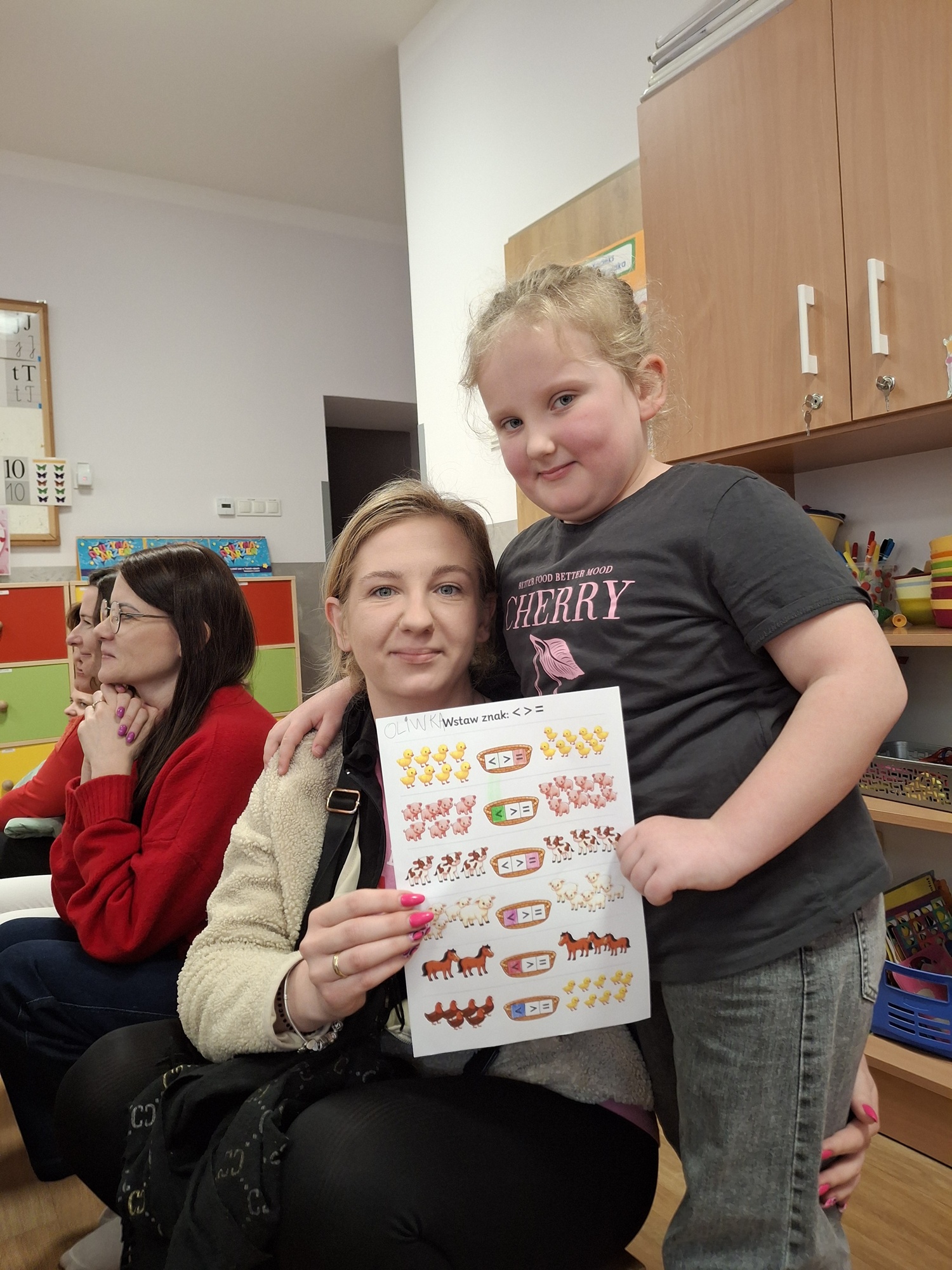 26 marca 2026r., w grupie 6- letniej odbyło się zajęcie otwarte dla rodziców, które poprowadziła pani Patrycja Kwiatkowska. Rodzice mieli możliwość obserwowania aktywności swoich pociech podczas zajęć, koncentracji uwagi oraz zasobu wiadomości i umiejętności. Temat zajęcia to: „Znajdź mamę i jej dziecko”. Przedszkolaki rozpoznawały głosy wydawane przez niektóre zwierzęta, dopasowywały zwierzątka młode do ich mama; utrwalały cyfry, porównywały liczebność zbiorów z zastosowaniem znaków >,<, =. Uczestniczyły w zabawie ruchowej i wykonywały zadania na karcie pracy. Dzieci chętnie brały udział w zajęciach, poprawnie wykonywały zadania. Obecność naszych gości wspaniale motywowała przedszkolaków do współpracy, zajęcia przebiegły w miłej i serdecznej atmosferze. Serdecznie dziękujemy rodzicom za przybycie.