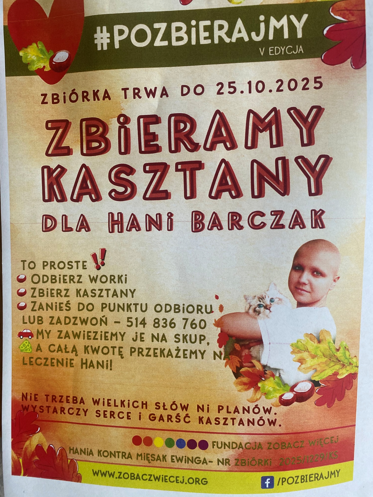 Wszyscy chętni, którzy chcą wesprzeć leczenie Hani Barczak mogą przynieść zebrane kasztany do przedszkola, a my przekażemy je dalej. Z góry dziękujemy.